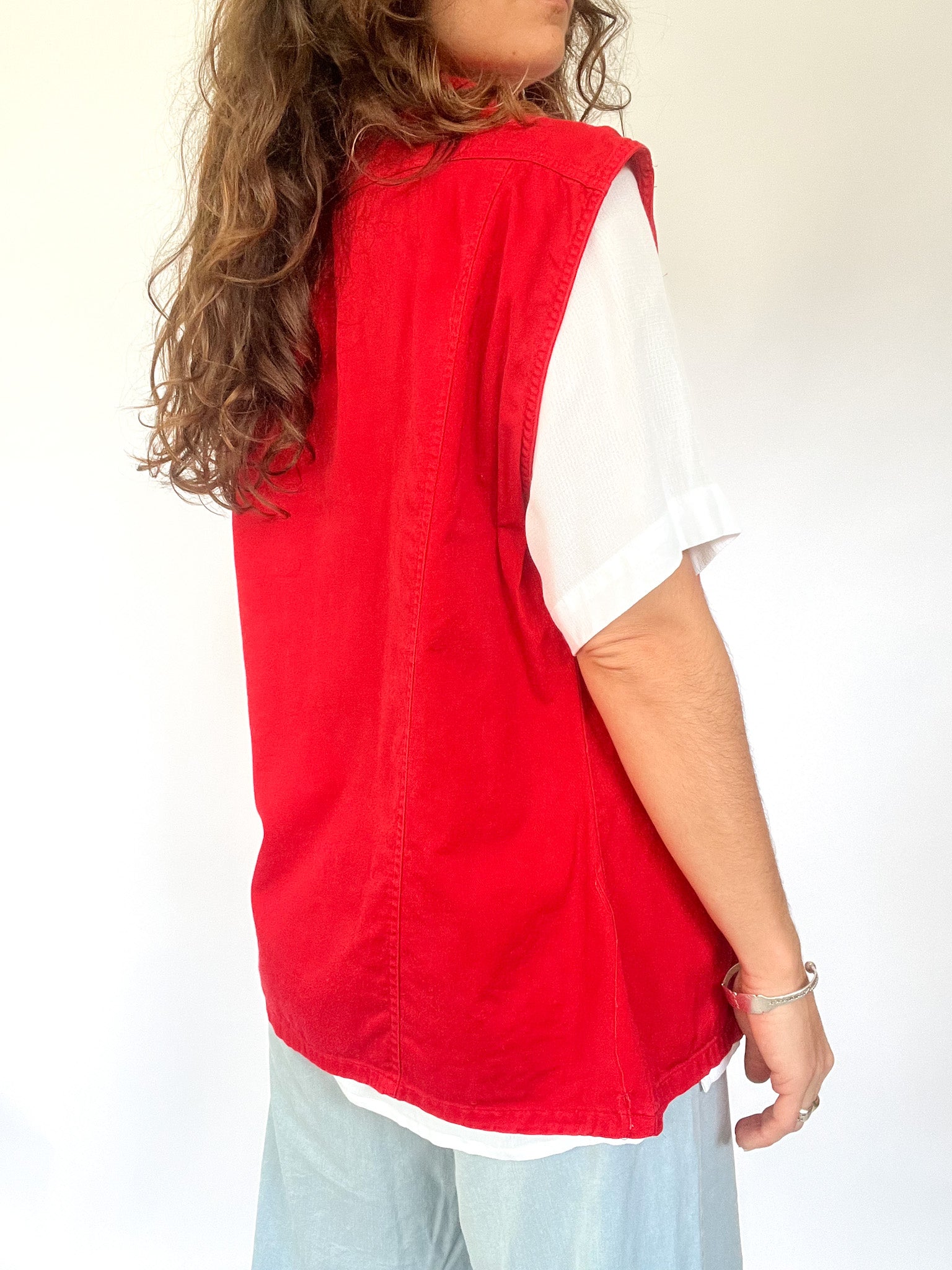 Bold, structured, and full of energy. This vibrant vintage red shirt is made to stand out. With its sleeveless cut, silver snap buttons and utility-style chest pockets, it brings a powerful mix of masculine edge and feminine confidence. Worn on its own or layered over a crisp shirt, it offers endless styling possibilities for summer. A true statement piece that speaks to the Skorpiones Vintage woman: unapologetic, strong, and effortlessly cool.
