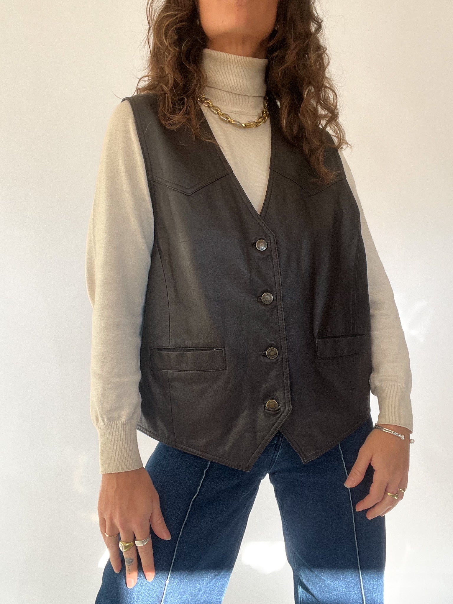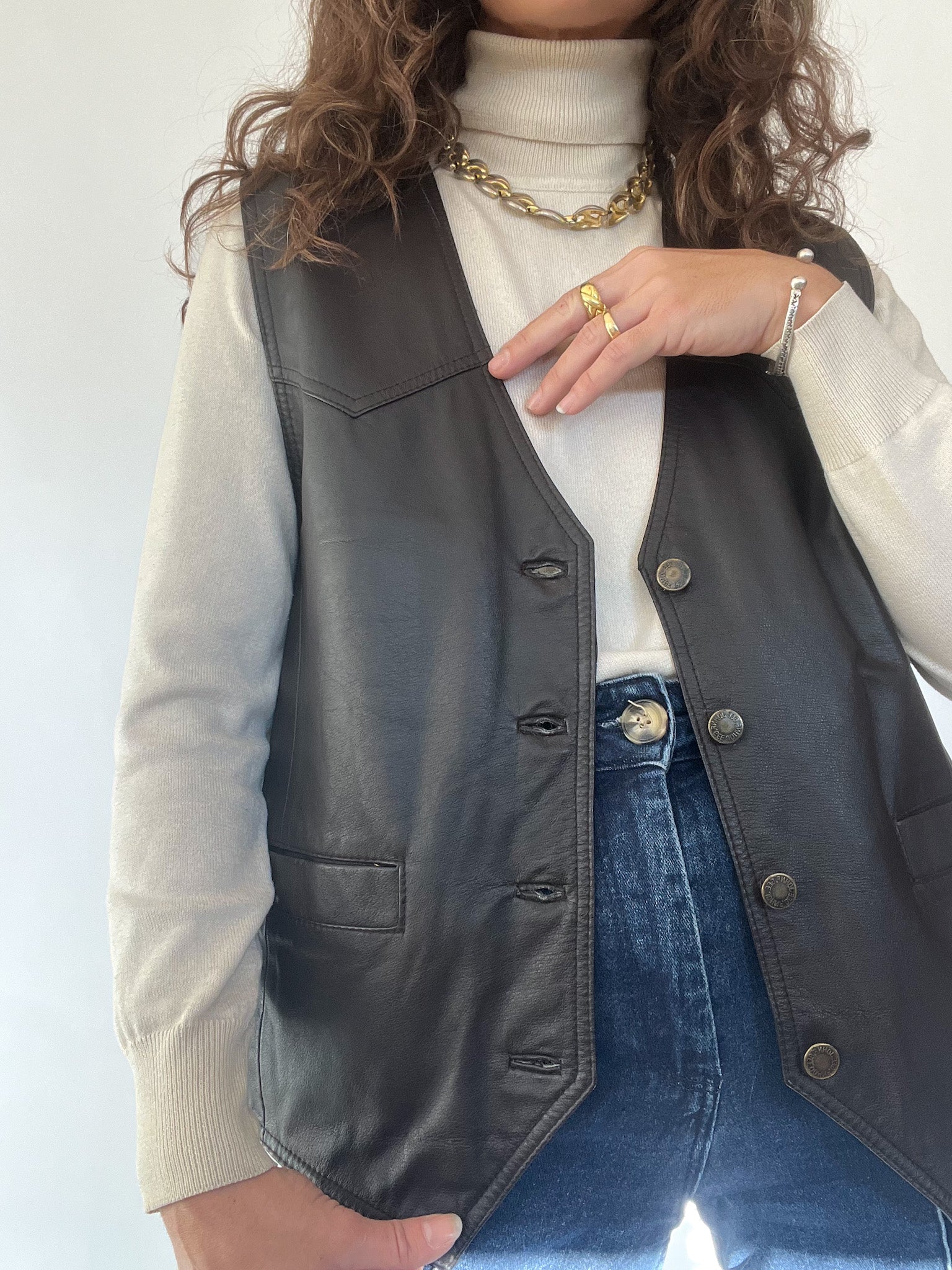 Add a touch of classic sophistication to your wardrobe with this vintage leather vest. Crafted in a deep charcoal hue, this sleeveless piece boasts a structured design with sharp edges for a tailored look. Featuring a button-front closure and two discreet front pockets, this versatile vest can be layered over turtlenecks or blouses for an elevated outfit.