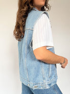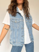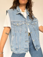 A true nod to 90s cool, this vintage light blue denim vest brings effortless attitude to any outfit. With its structured cut and classic faded wash, it’s made to layer—over a crisp shirt, a fitted turtleneck, or even a dress. It features two flap chest pockets, front button closure, and side welt pockets for a casual utilitarian feel. A timeless essential with a rebellious edge.