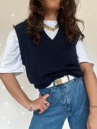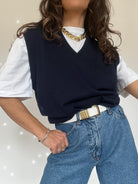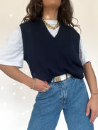 A timeless essential for layering, this vintage sleeveless knit vest made in Italy in deep navy is all about understated elegance. Featuring a classic V-neckline, a relaxed fit, and finely ribbed edges, it offers a structured yet effortless silhouette. Its versatile design makes it easy to pair with a crisp white tee or a sleek blouse for a polished, vintage-inspired look.