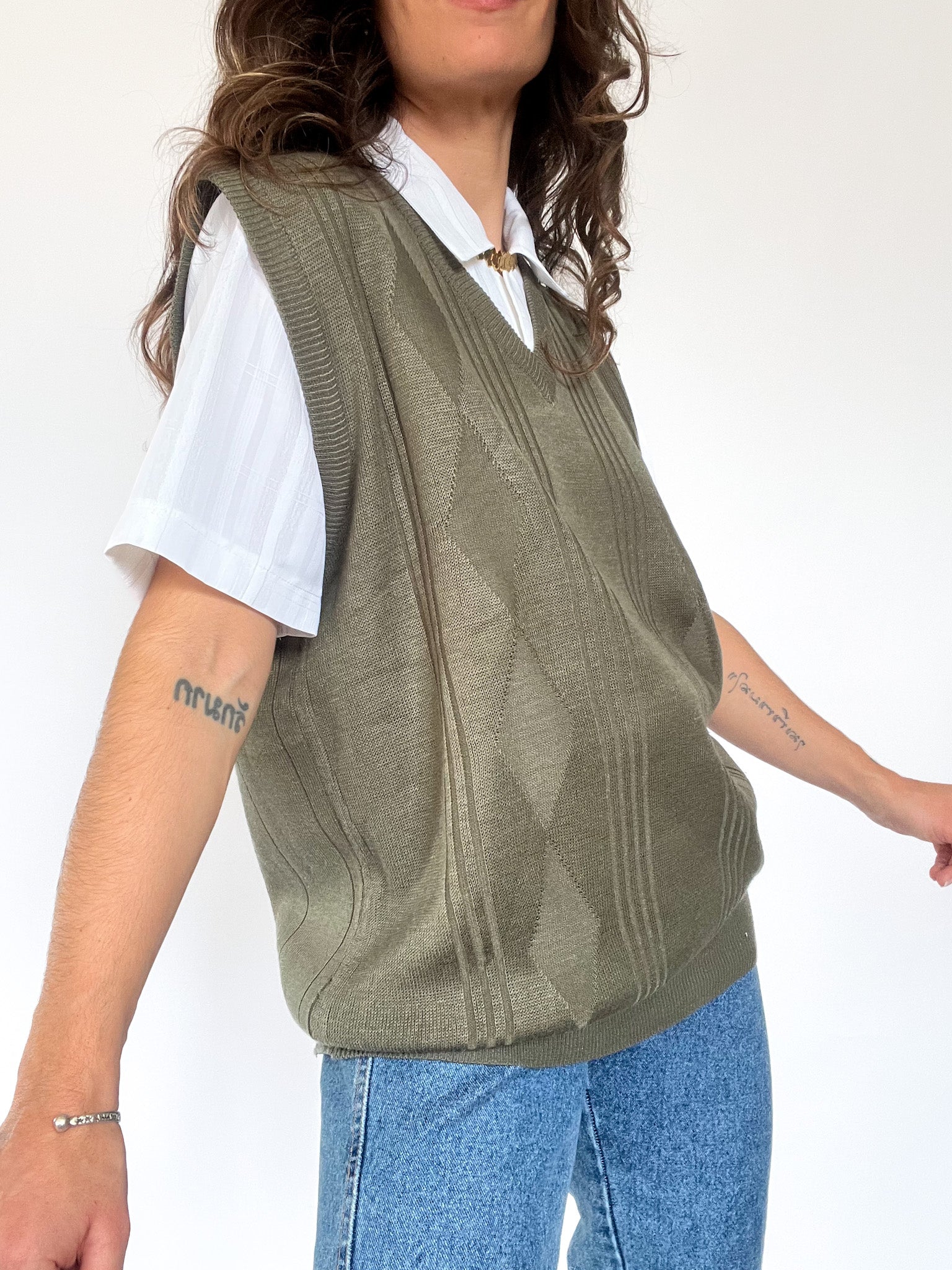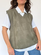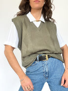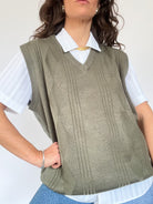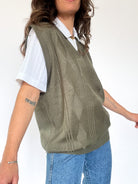 Timeless with a twist, this vintage olive green knit vest brings subtle sophistication to your everyday style. Featuring a V-neckline and textured diamond knit pattern, it blends classic preppy charm with a relaxed silhouette. Wear it layered over a crisp shirt or solo for a more effortless vibe—either way, it’s a piece that lets your style speak with quiet confidence.