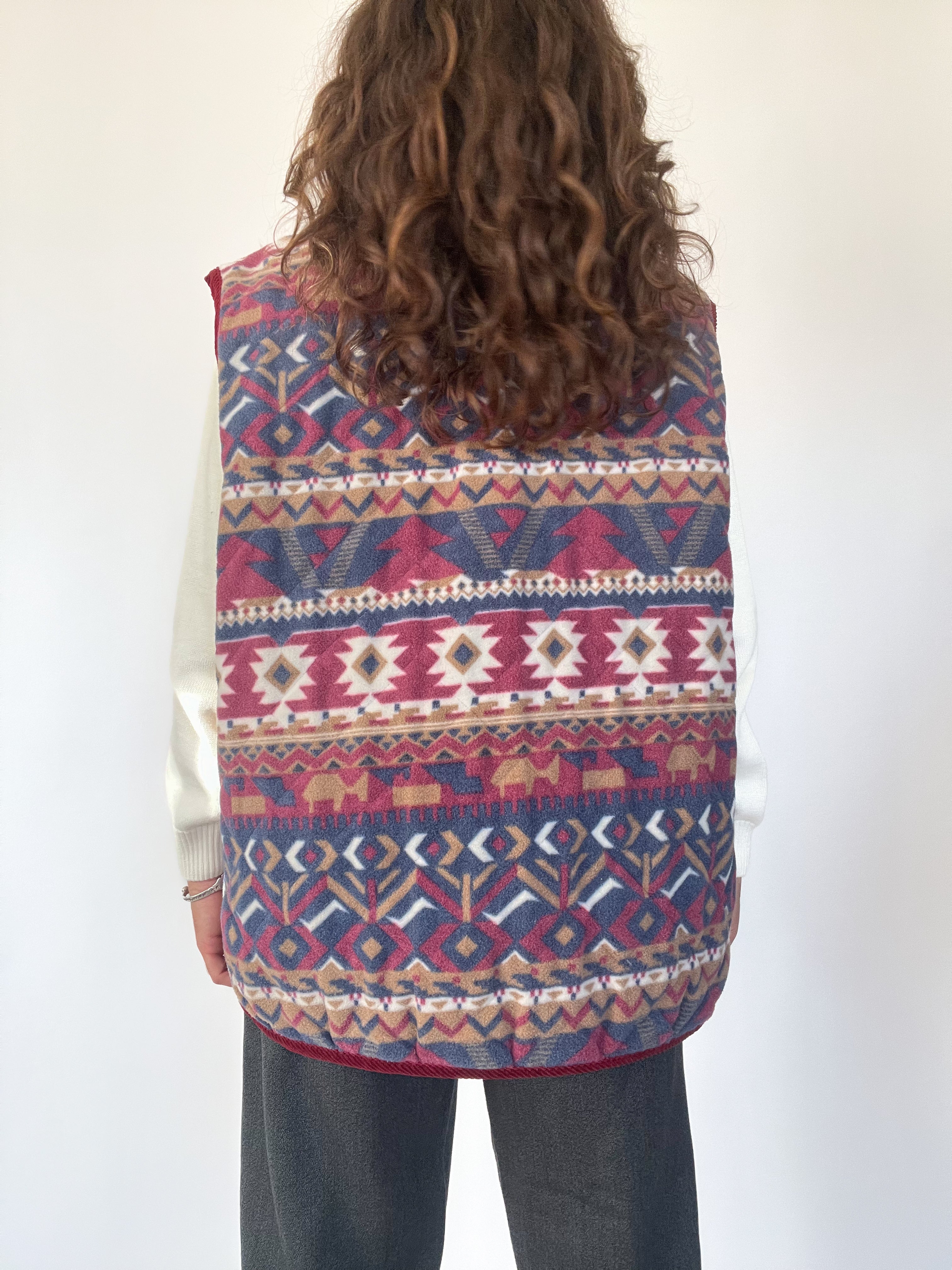 Add a cozy, retro touch to your wardrobe with this vintage vest made in Italy, featuring an intricate geometric pattern in rich, earthy tones. Perfect for layering, this vest brings both warmth and style to any outfit, making it an ideal piece for cooler days. The bold colors and unique design capture a true vintage spirit.