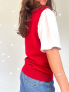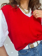 A statement vintage piece that blends comfort and style with a bold, striking hue. This vibrant red sleeveless knit vest made in Italy features a V-neckline and a textured cable knit pattern, adding dimension to its timeless silhouette. Designed for layering, it pairs effortlessly with a crisp white tee or a structured blouse for a sophisticated contrast.