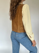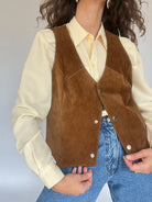 This brown suede vest captures the bohemian style of the 70s with a modern twist. Its sleeveless cut and silver snap buttons make it both practical and elegant. Wear it over a flowy blouse or a basic tee for a laid-back, authentic look. Perfect for adding texture and depth to any outfit, this piece is a must-have in any vintage wardrobe.