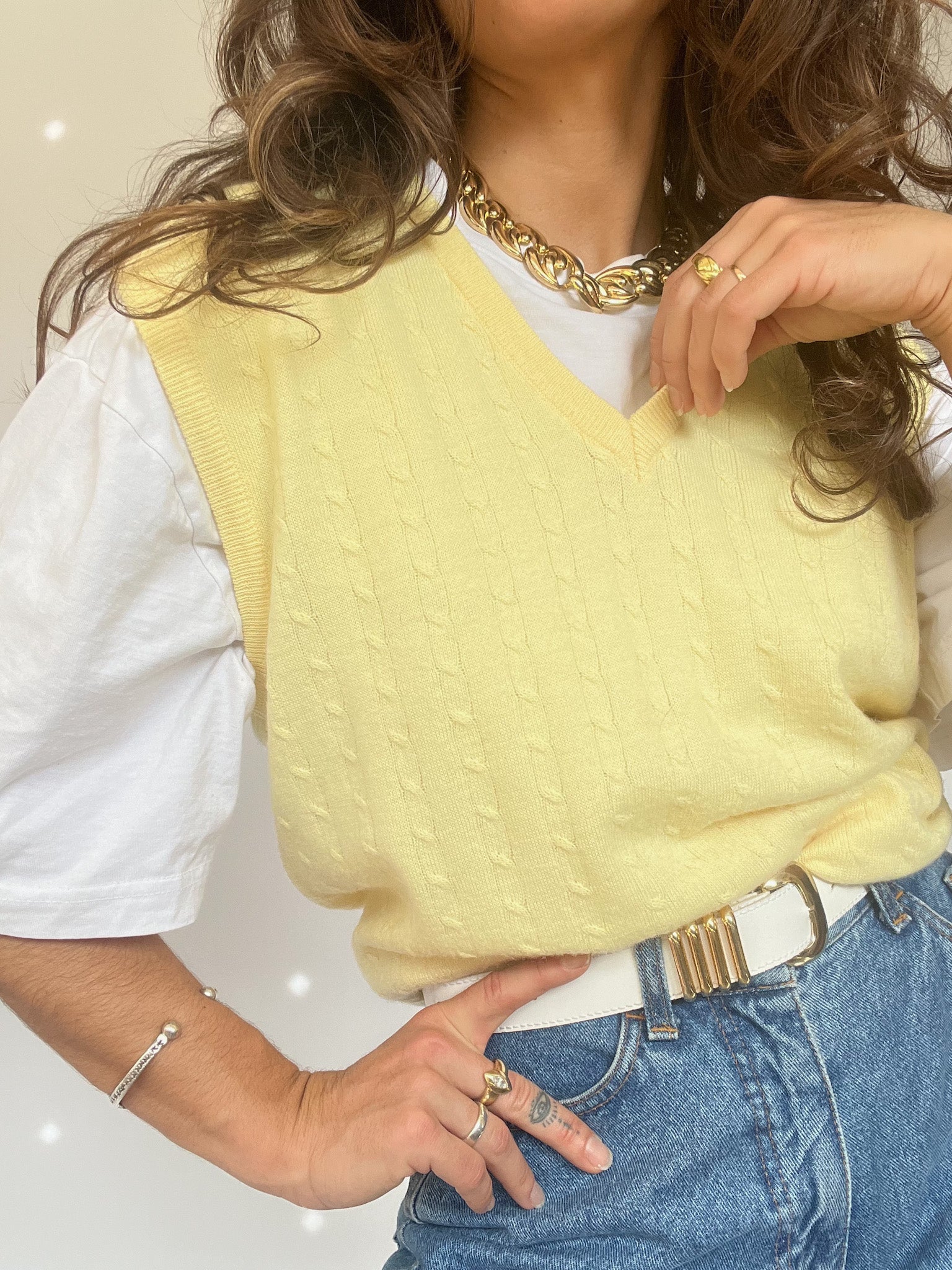 A charming vintage knit vest in a soft pastel yellow shade, bringing a fresh, preppy touch to any wardrobe. The fine cable knit pattern adds a subtle texture, while the V-neckline enhances its versatility. Layer it over a crisp white shirt for an effortlessly chic, retro-inspired look.