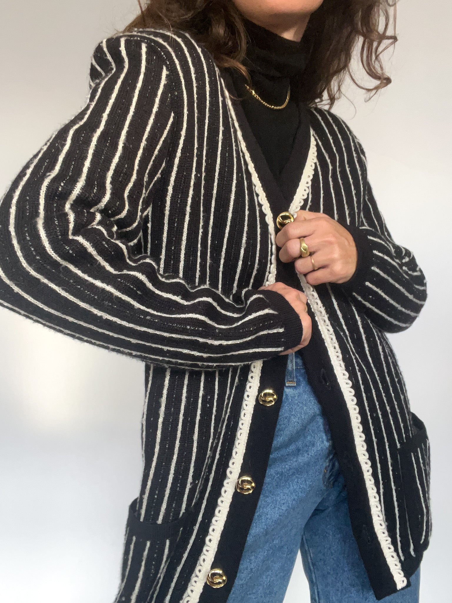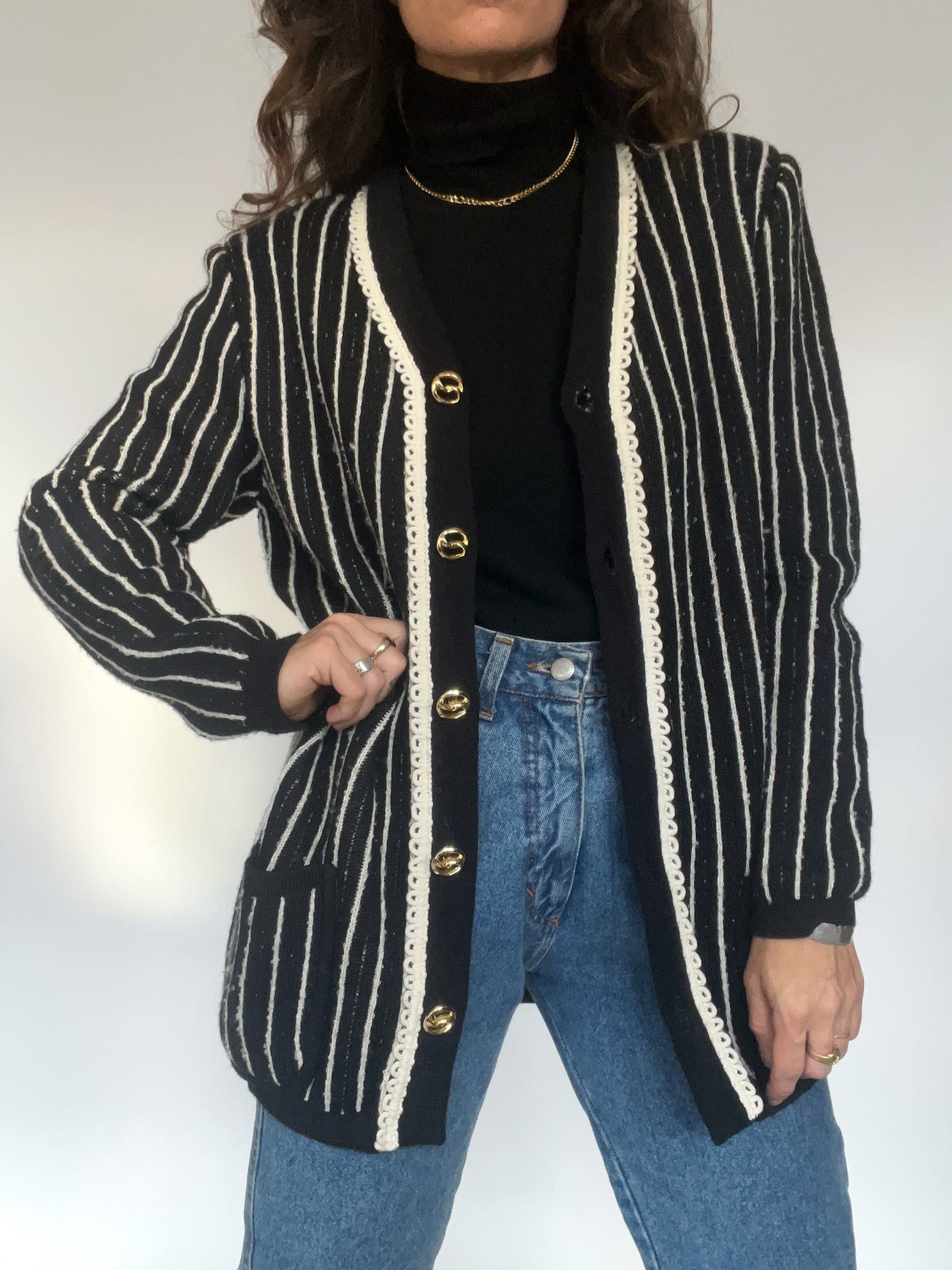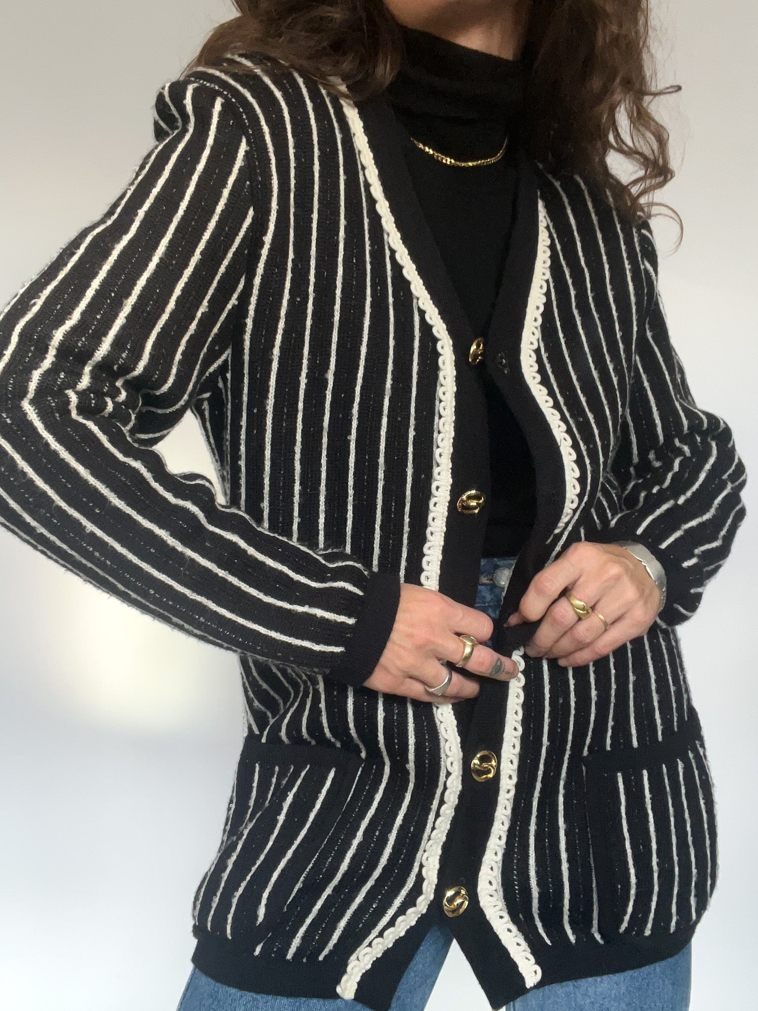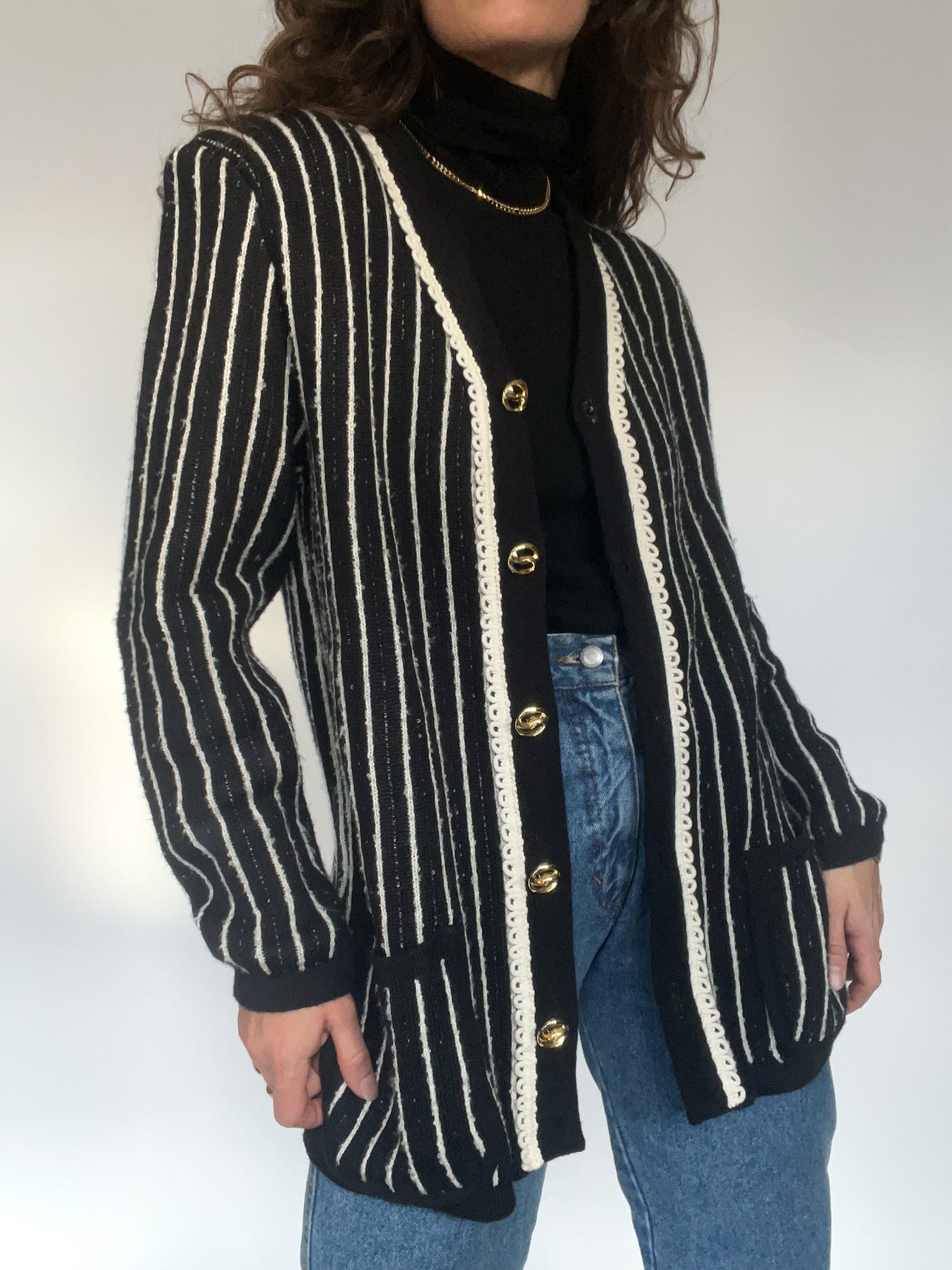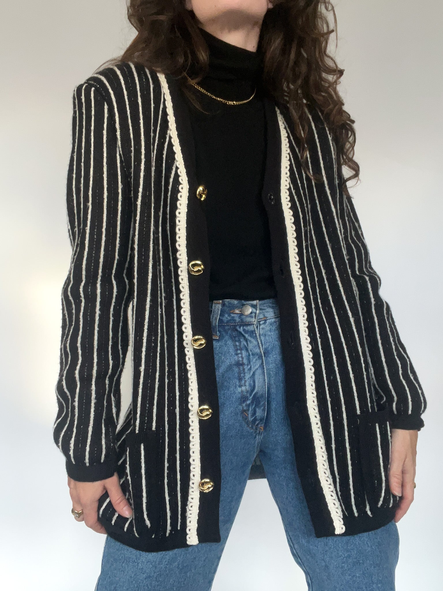 Vintage 80’s Black & Cream Striped Italian Knit Cardigan