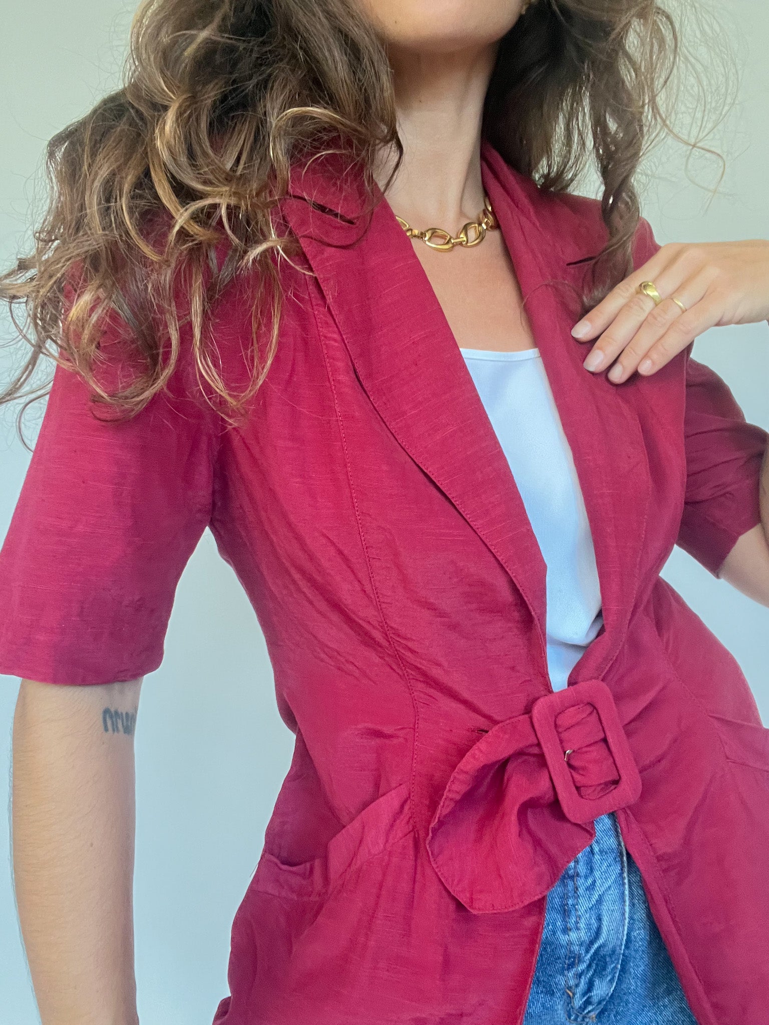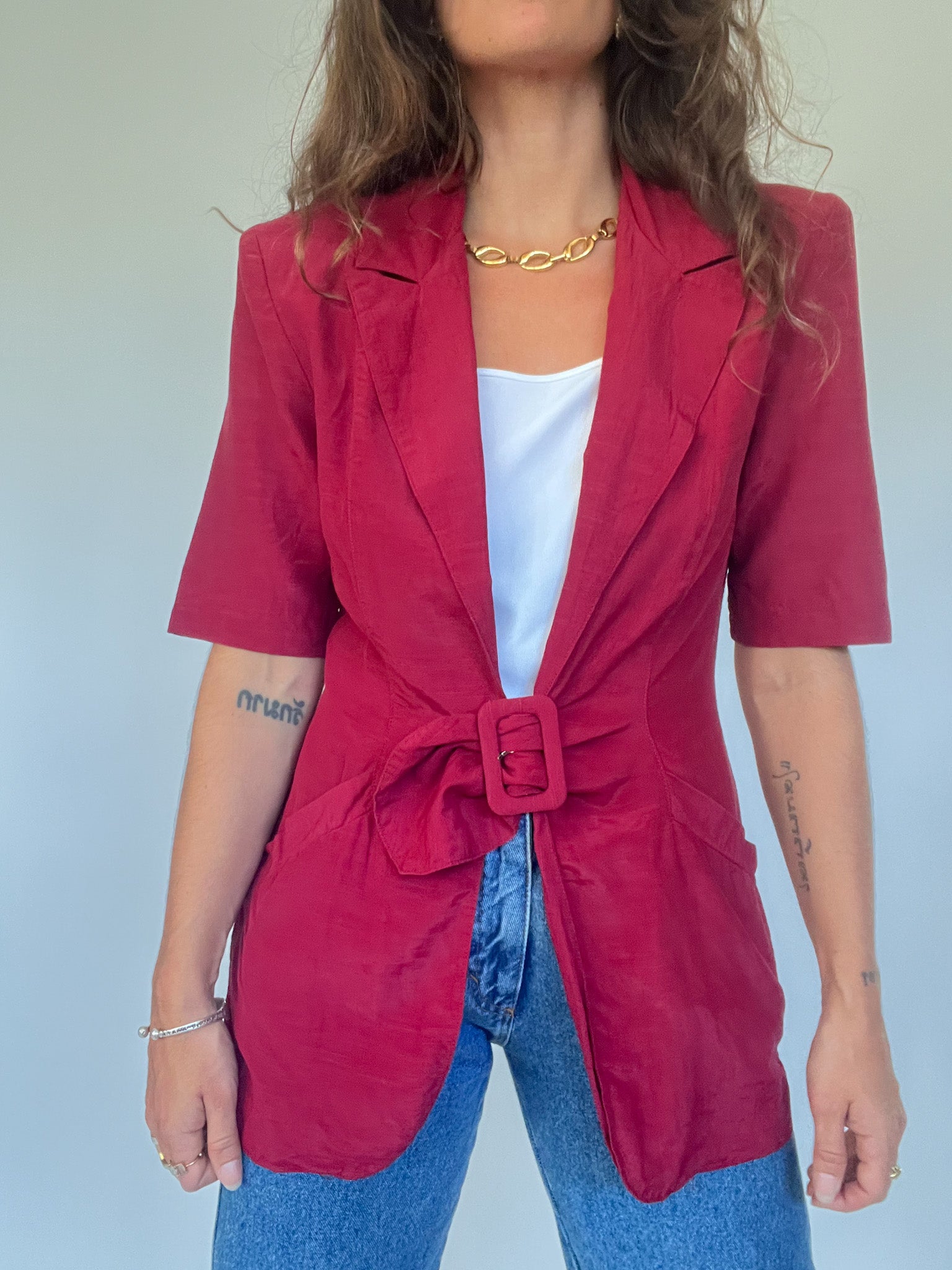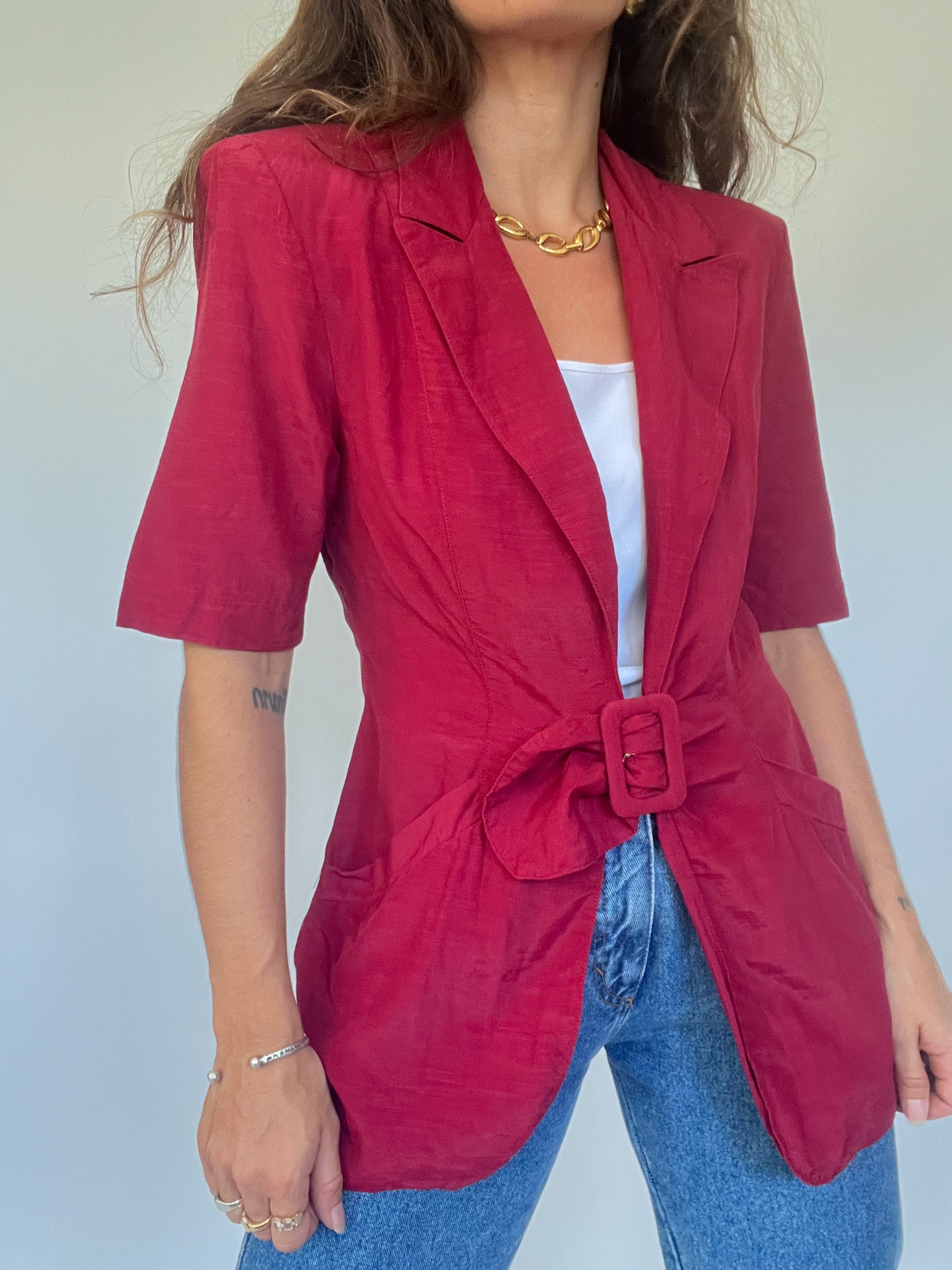 Vintage 90’s Burgundy Belted Linen-Feel Blazer