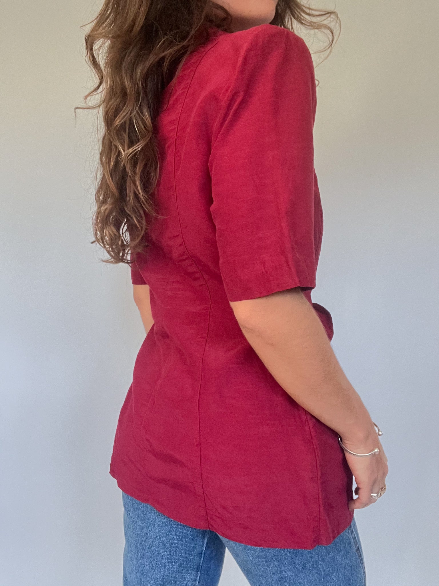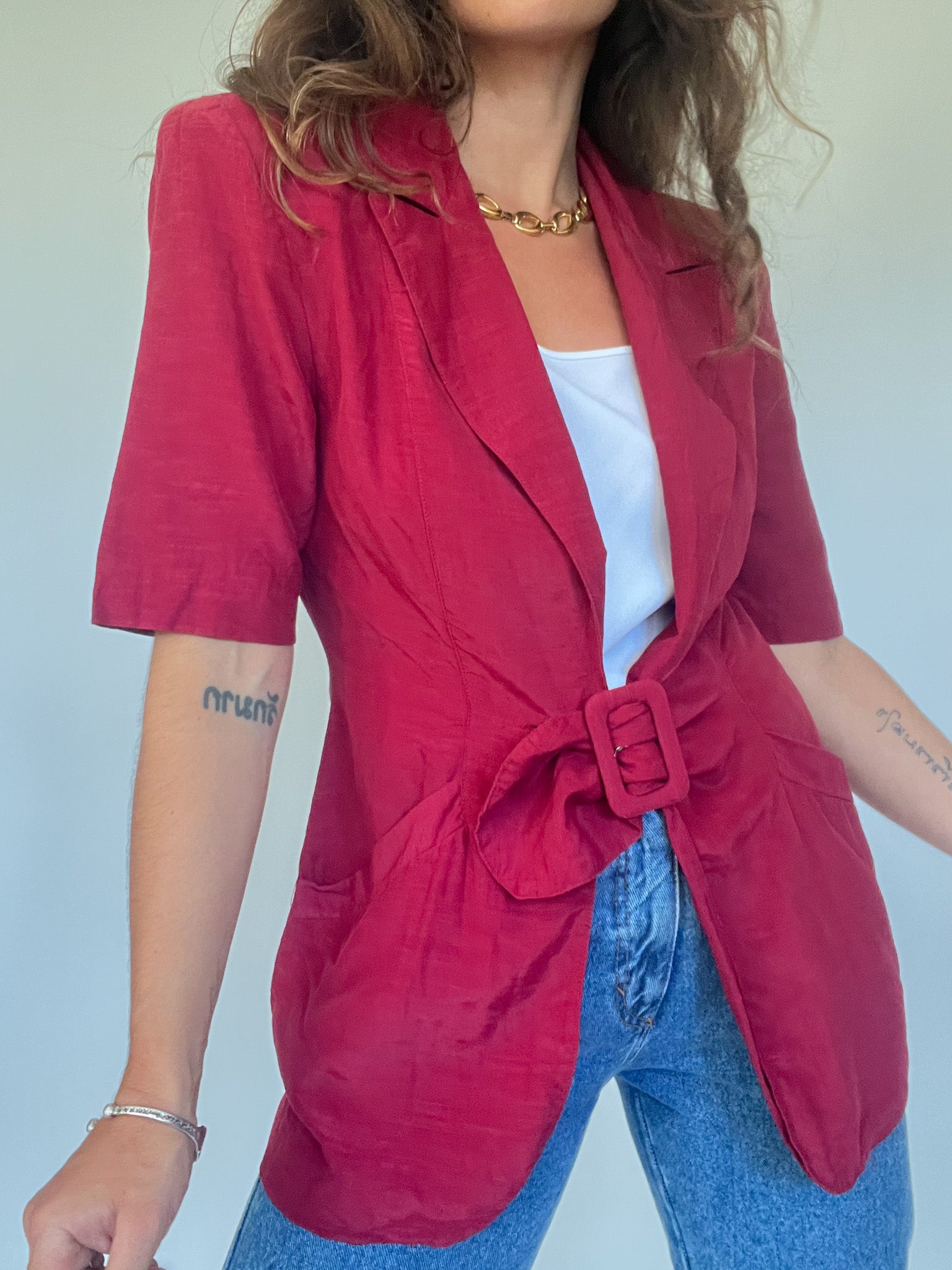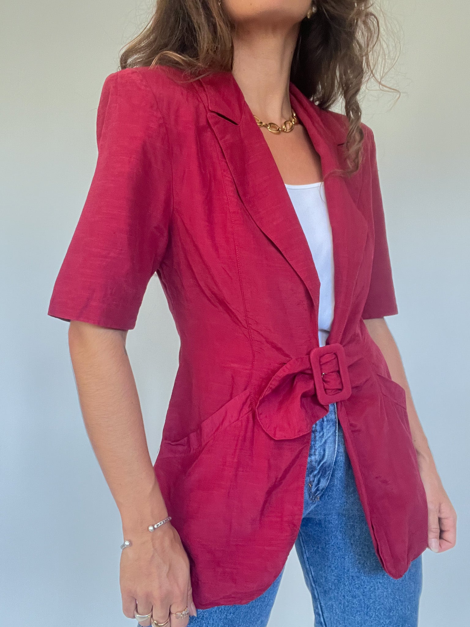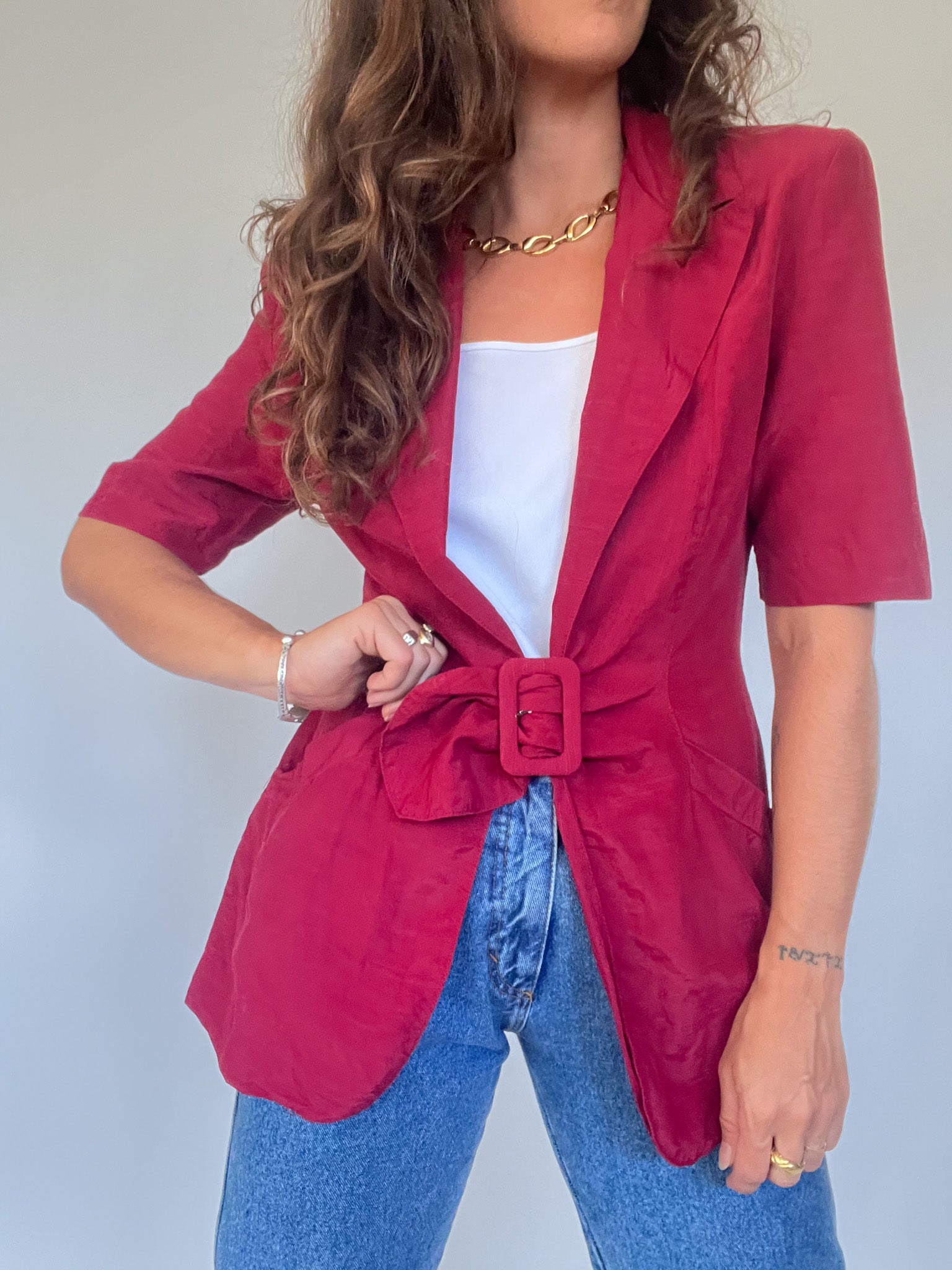 Vintage 90’s Burgundy Belted Linen-Feel Blazer
