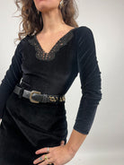 This elegant vintage bodysuit is crafted from plush black velvet, exuding sophistication and timeless charm. The highlight of the piece is its deep V-neckline adorned with intricate lace detailing, adding a delicate and feminine touch. With its sleek silhouette and long sleeves, this bodysuit is perfect for creating a polished look, whether paired with high-waisted skirts or tailored trousers.