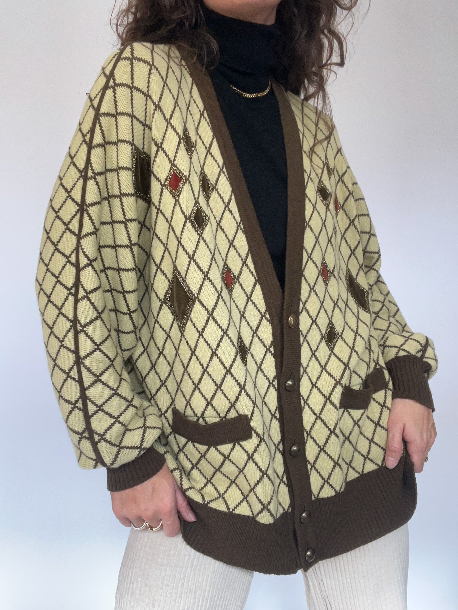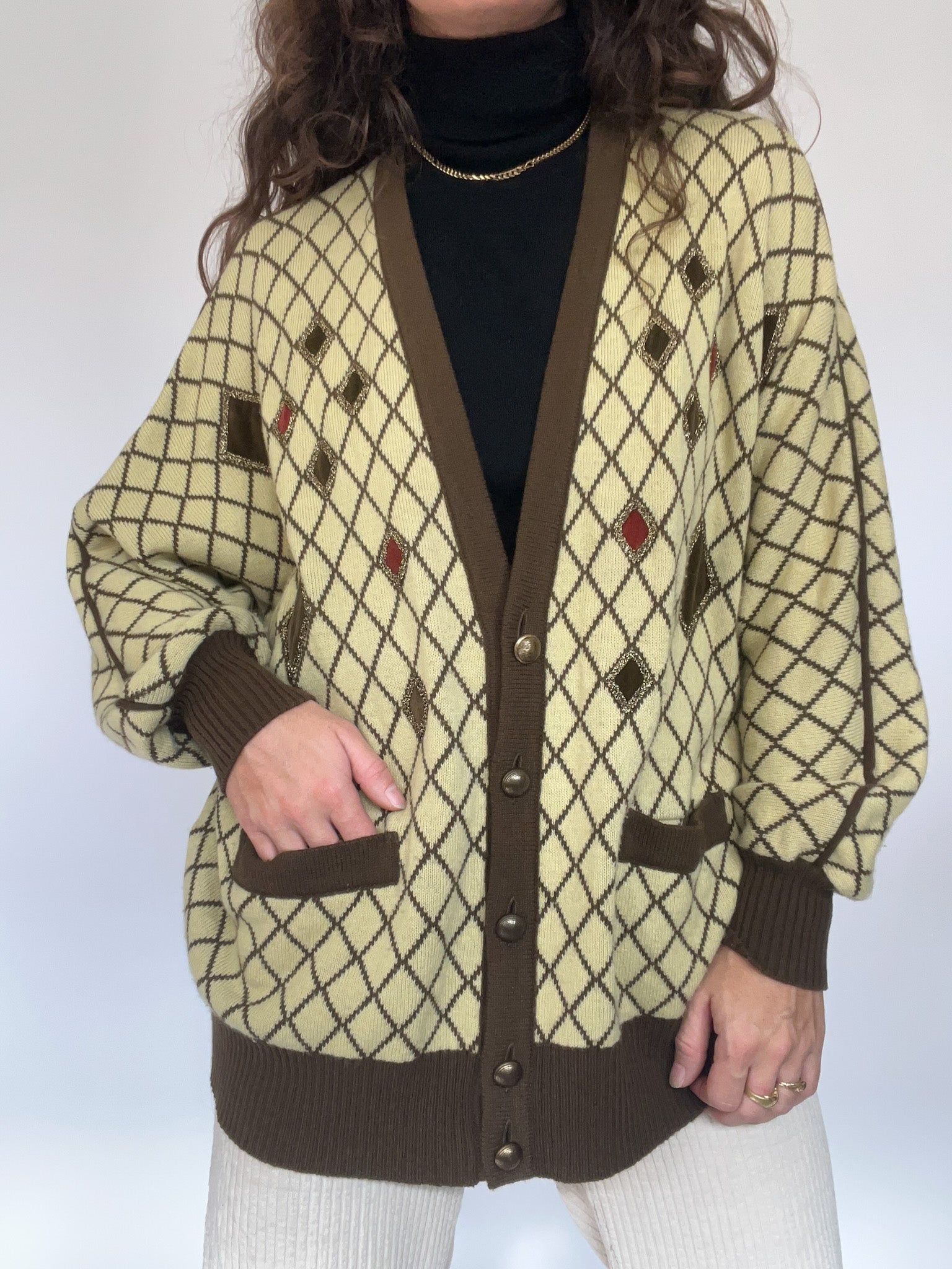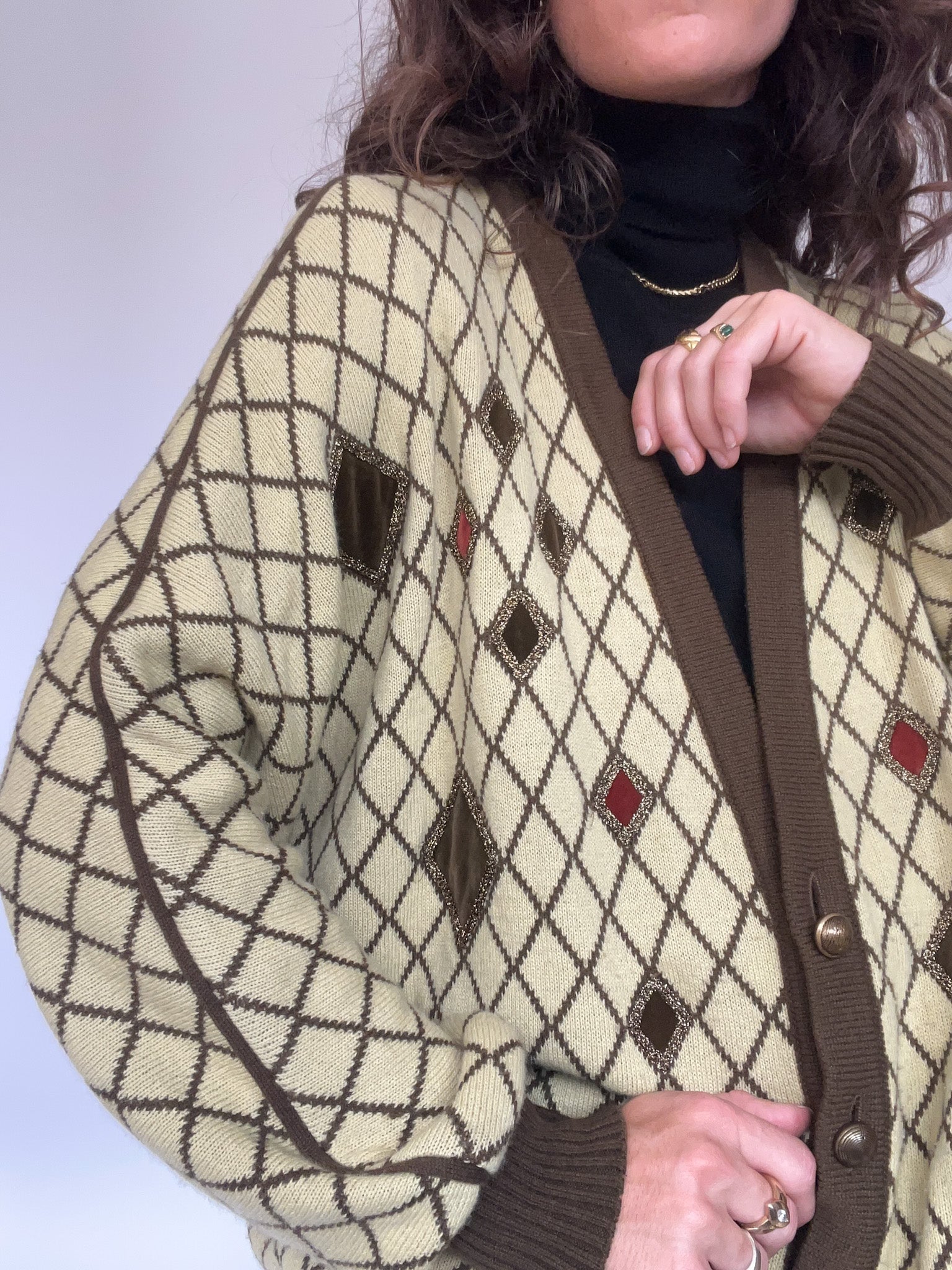Vintage 80’s Brown & Cream Argyle Wool Blend Cardigan