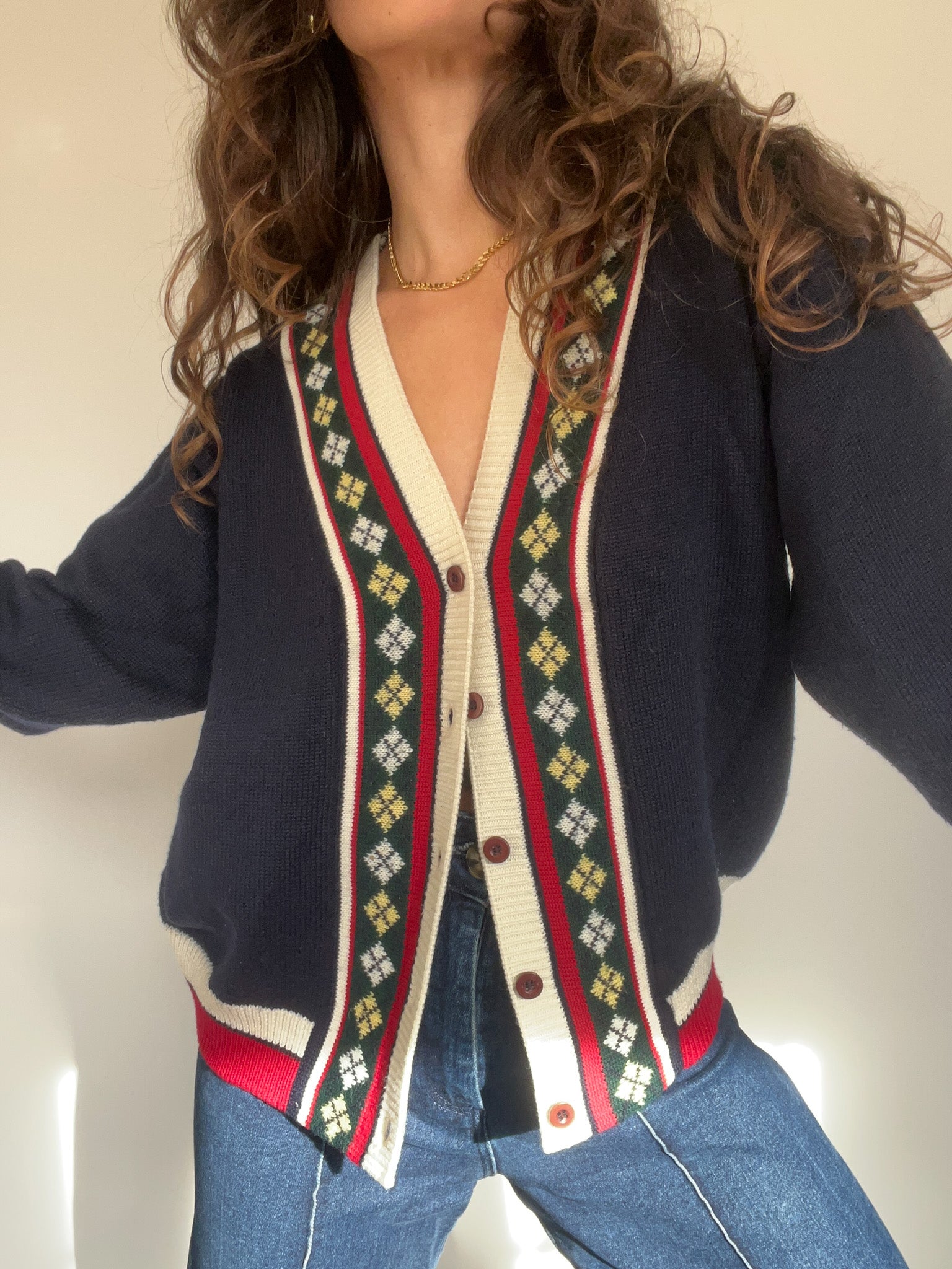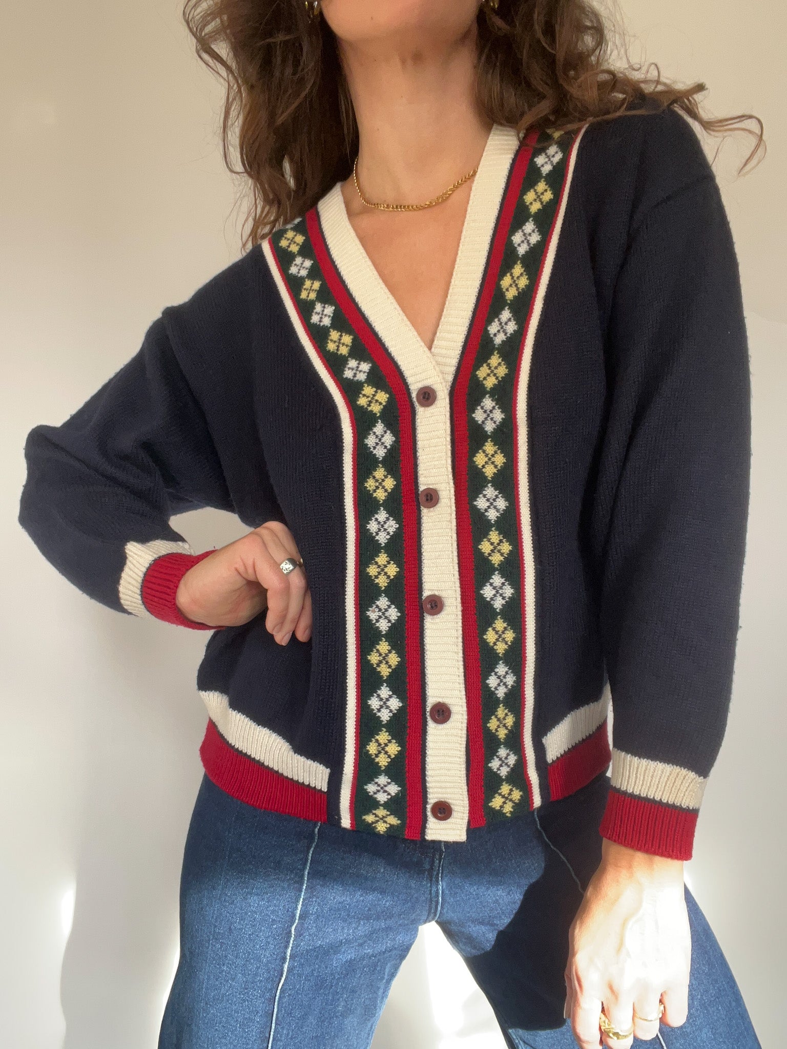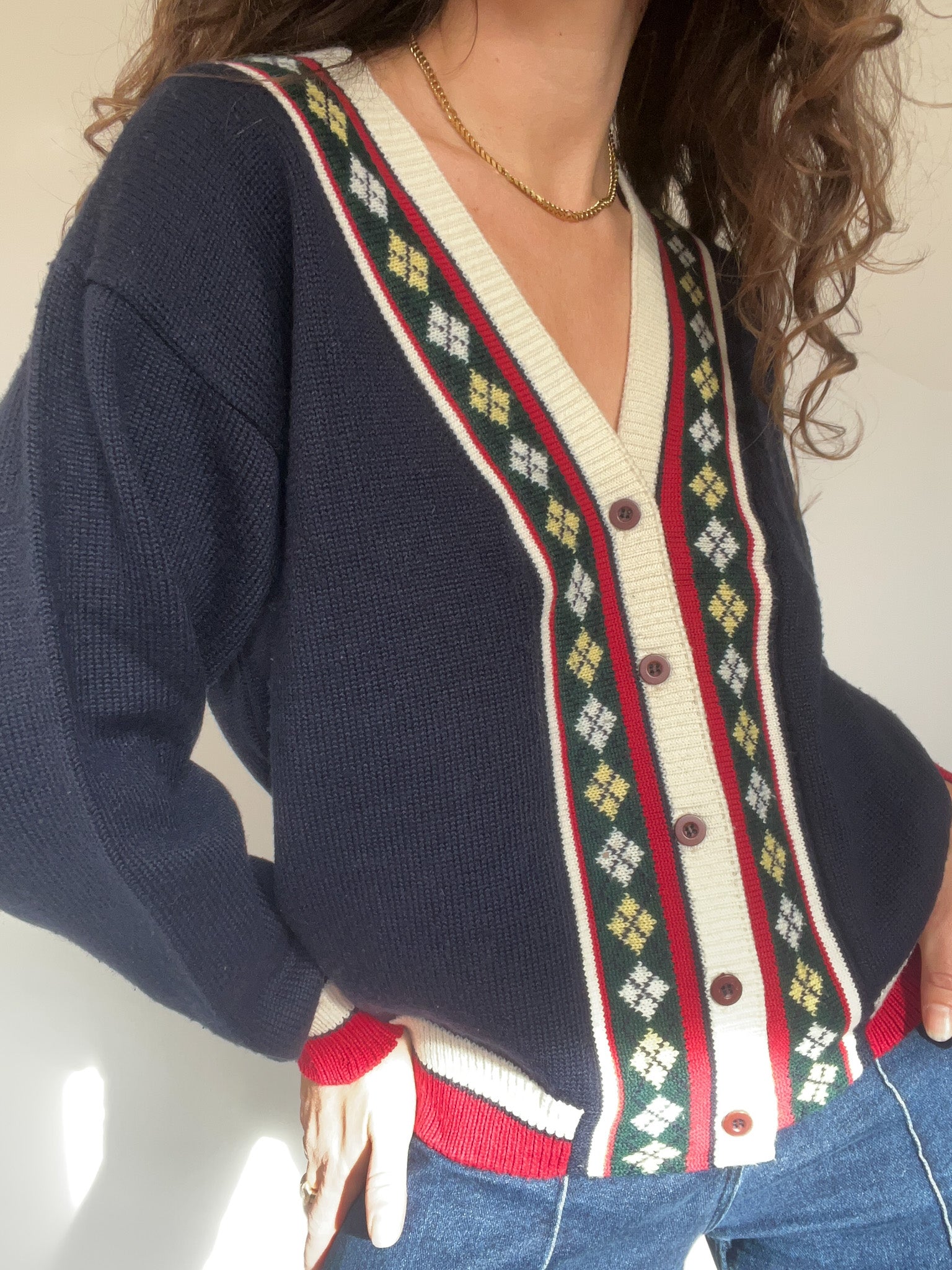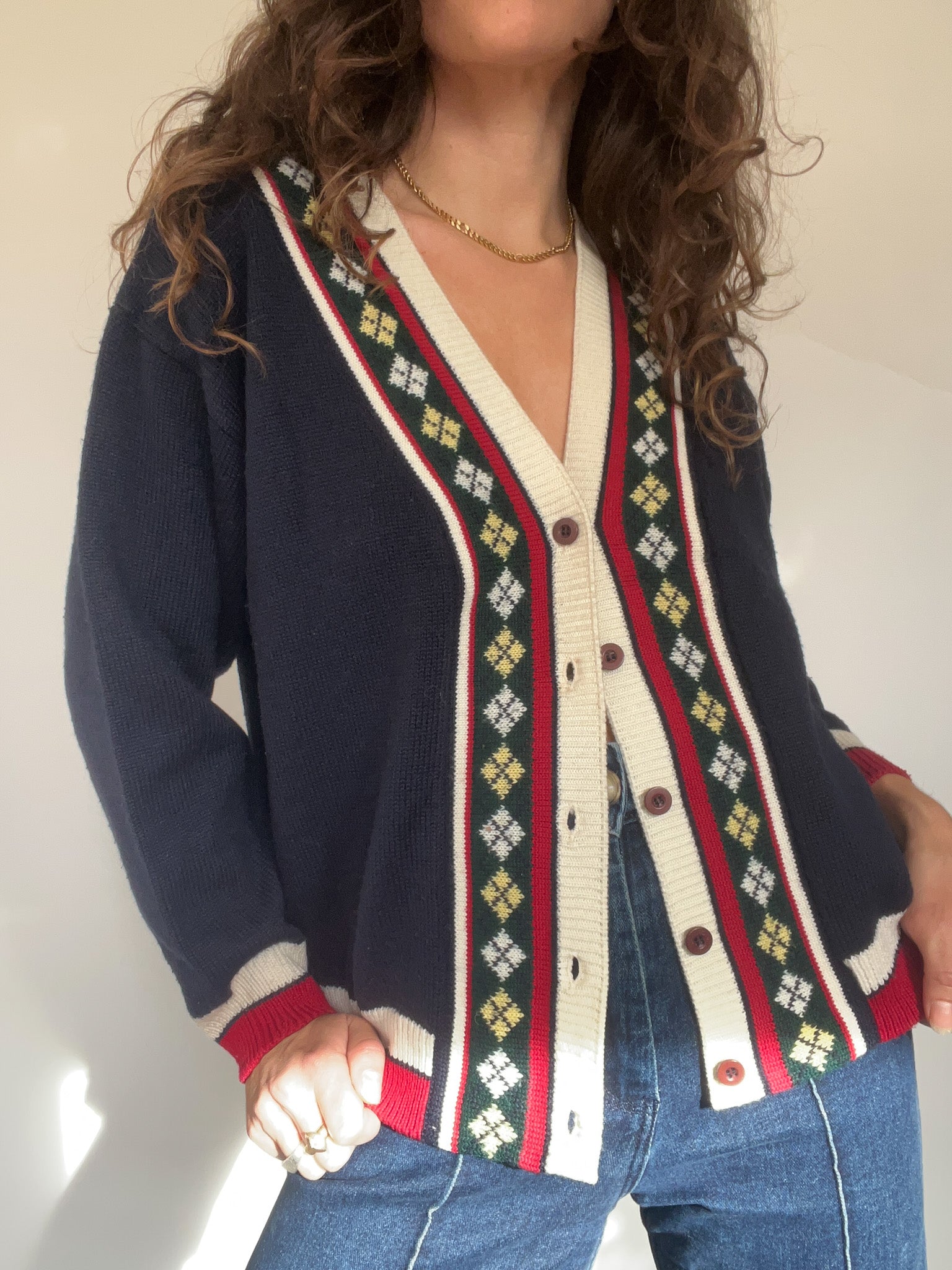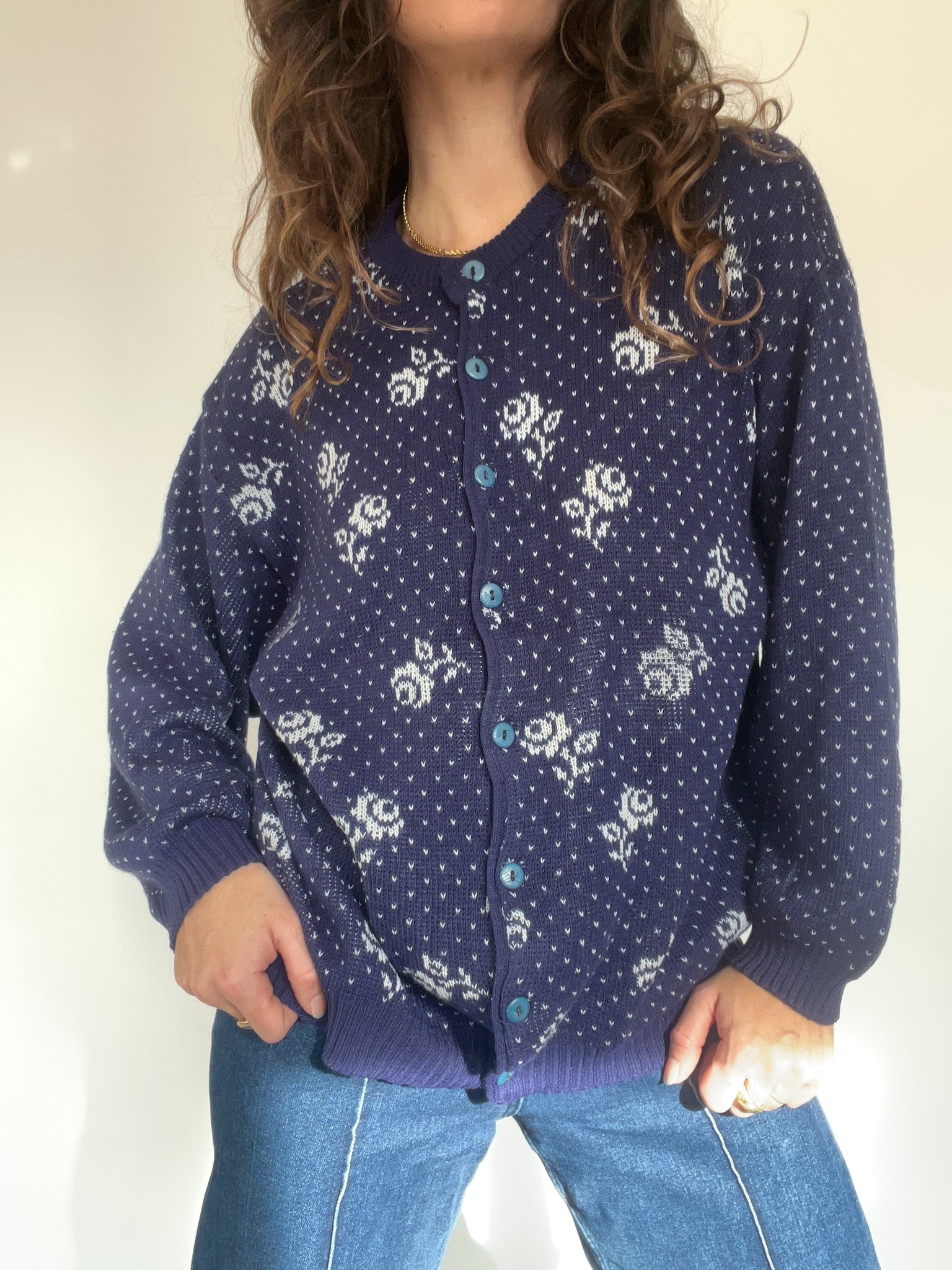 Vintage 80’s Blue & Beige Patterned Knit Cardigan