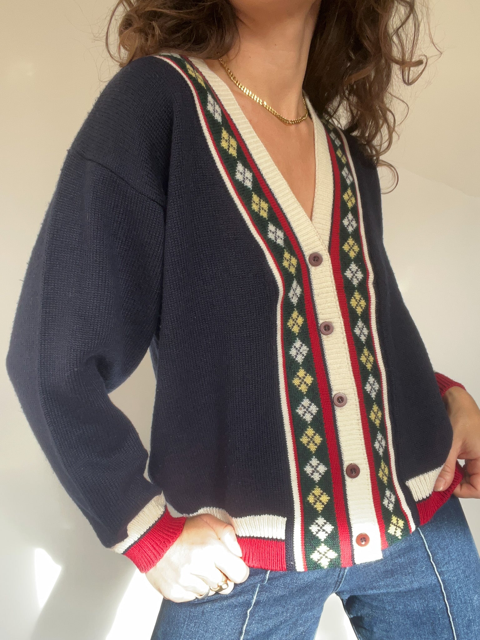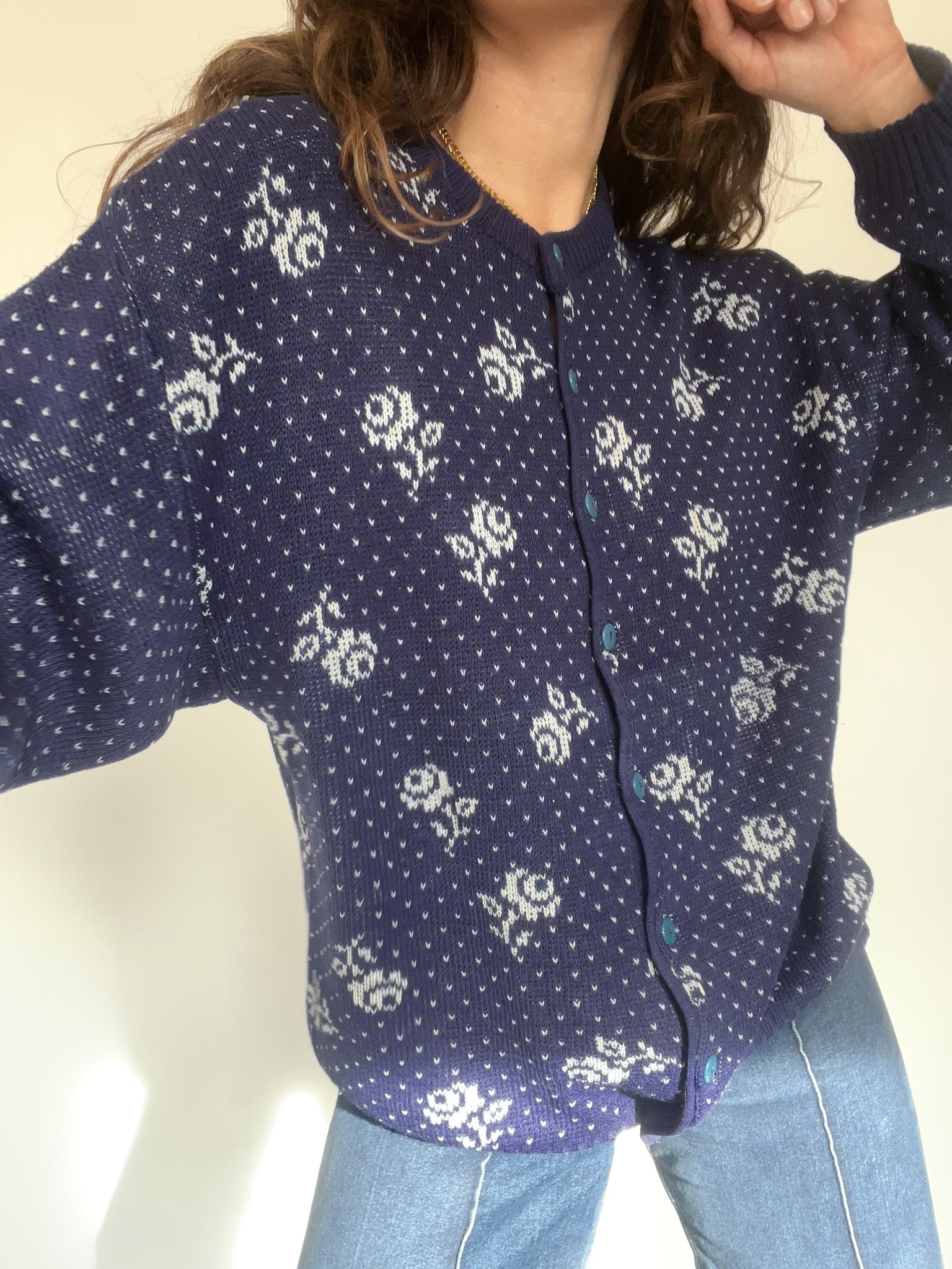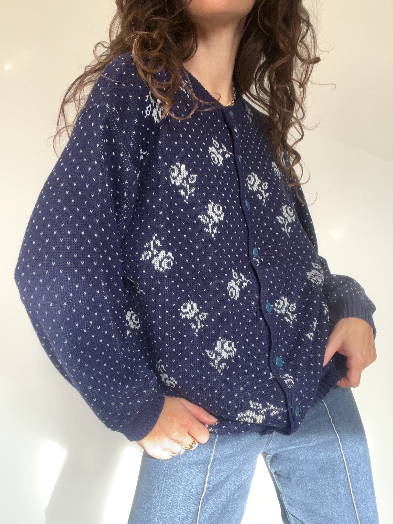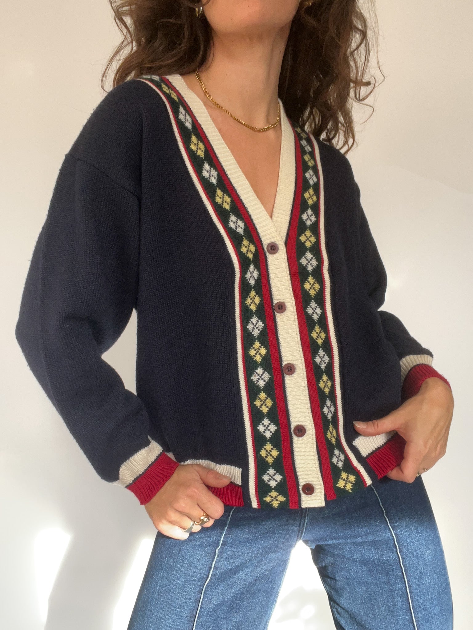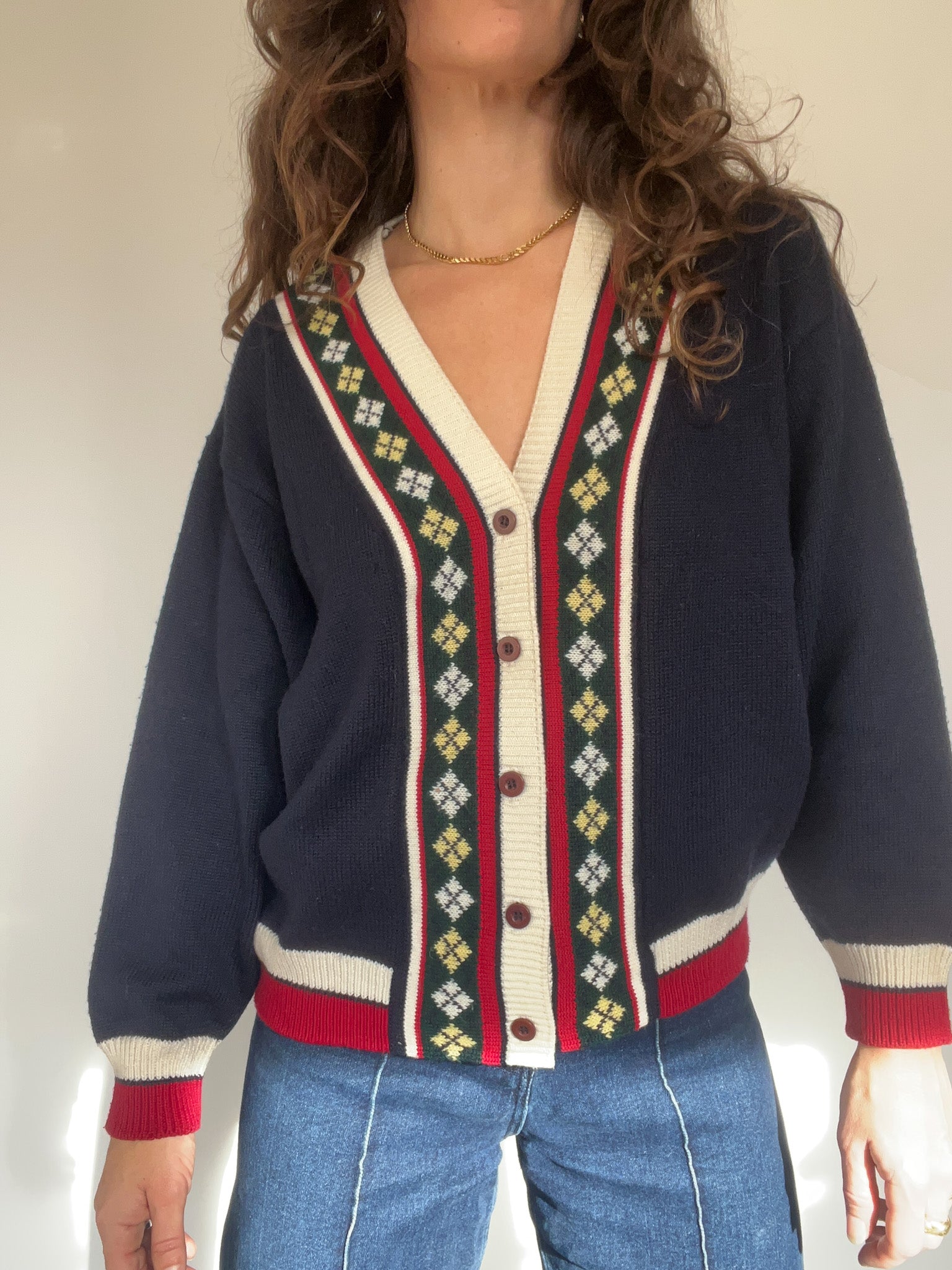 Vintage 80’s Blue & Beige Patterned Knit Cardigan