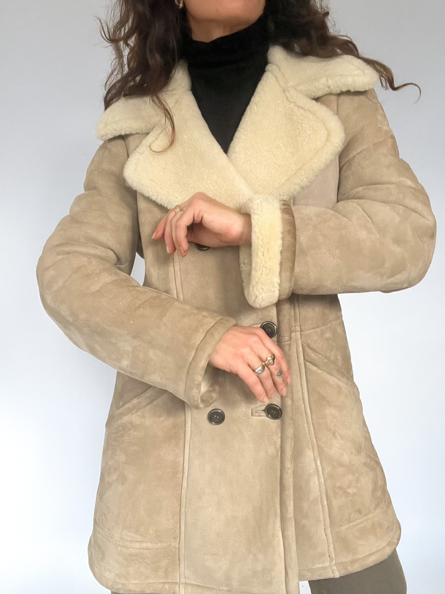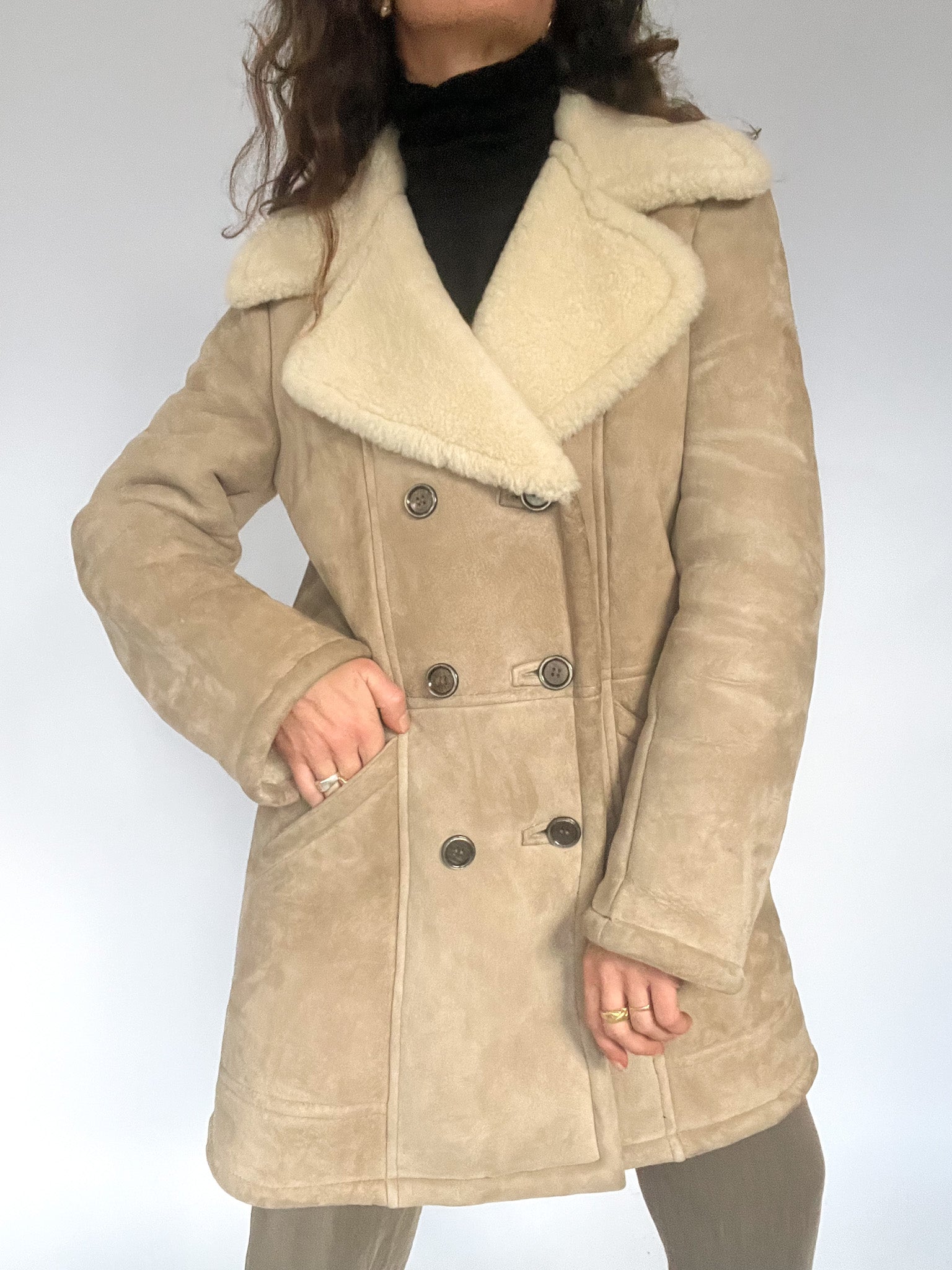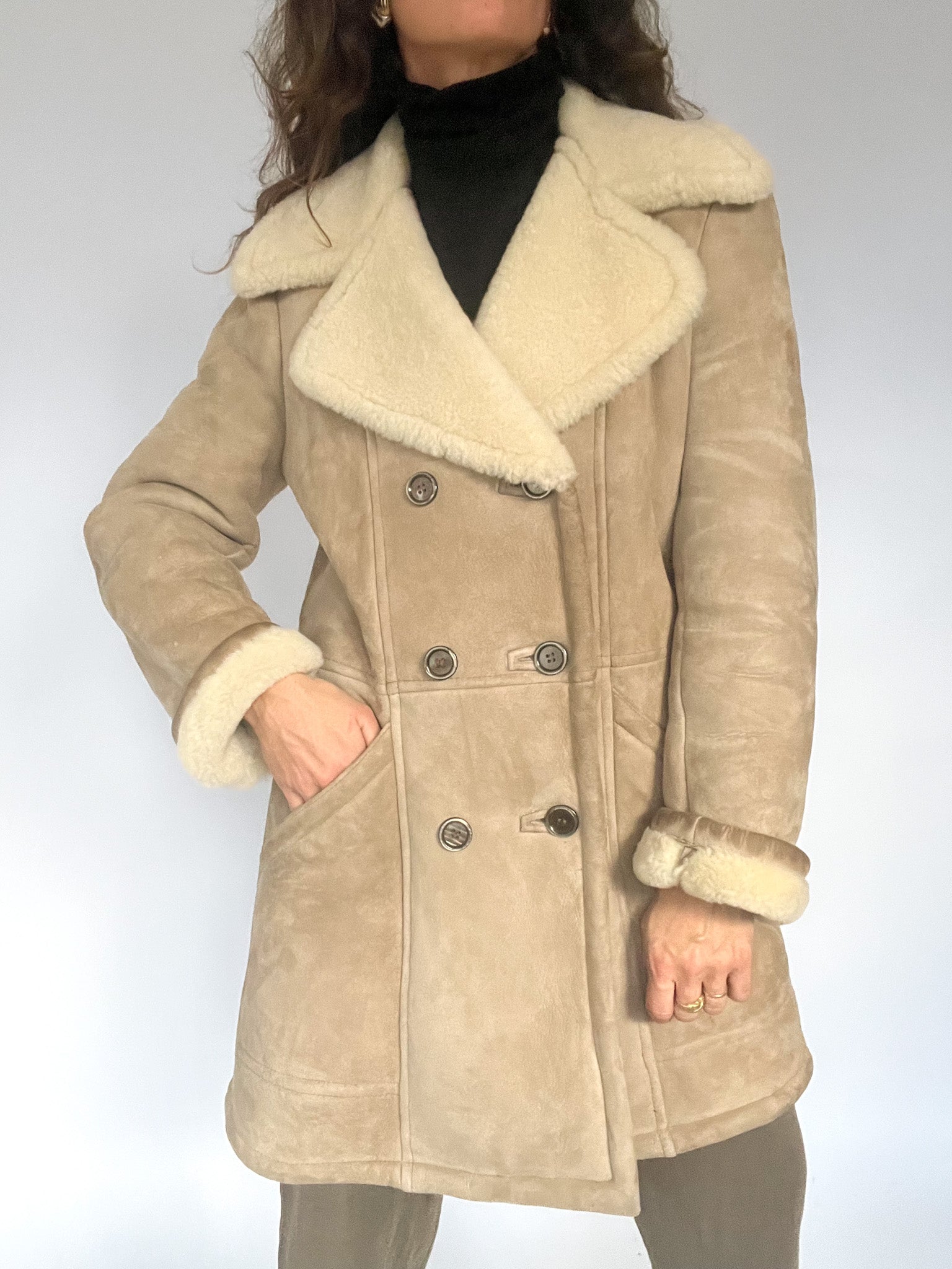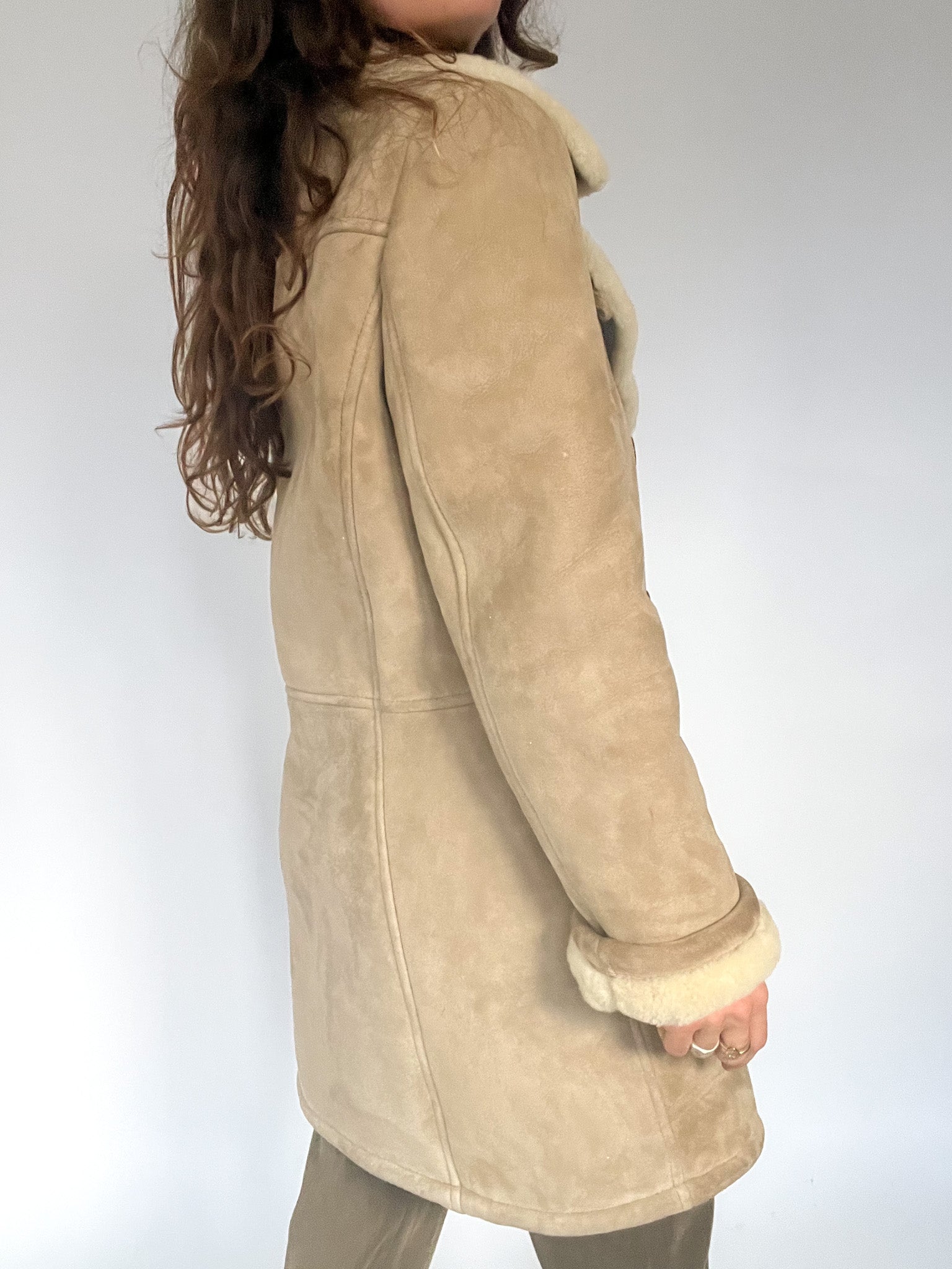 Vintage 90’s Beige Faux Fur Coat with Gold Statement Buttons