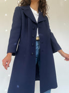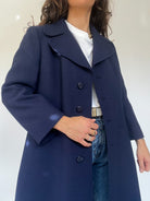 Timeless elegance meets impeccable tailoring in this vintage navy wool coat. Designed with a structured A-line silhouette, it offers a refined and sophisticated look that effortlessly complements both casual and formal outfits. The wide notched lapels add a touch of vintage charm, while the covered buttons and clean lines enhance its sleek aesthetic. A true wardrobe essential, perfect for embracing colder days with style and grace.