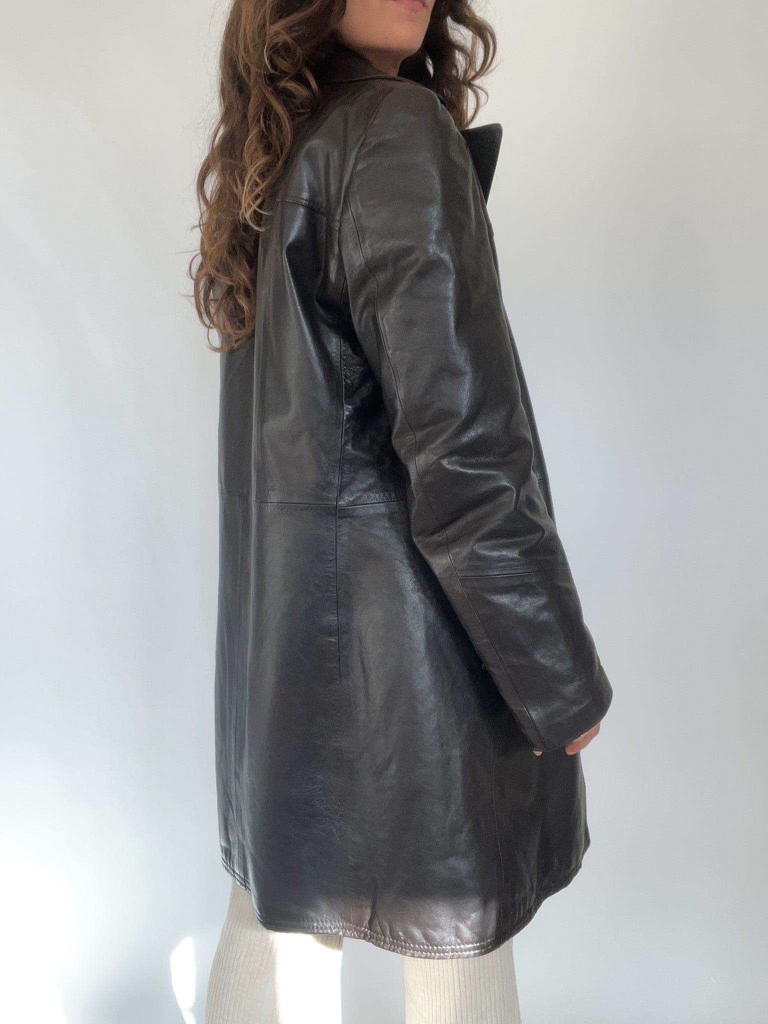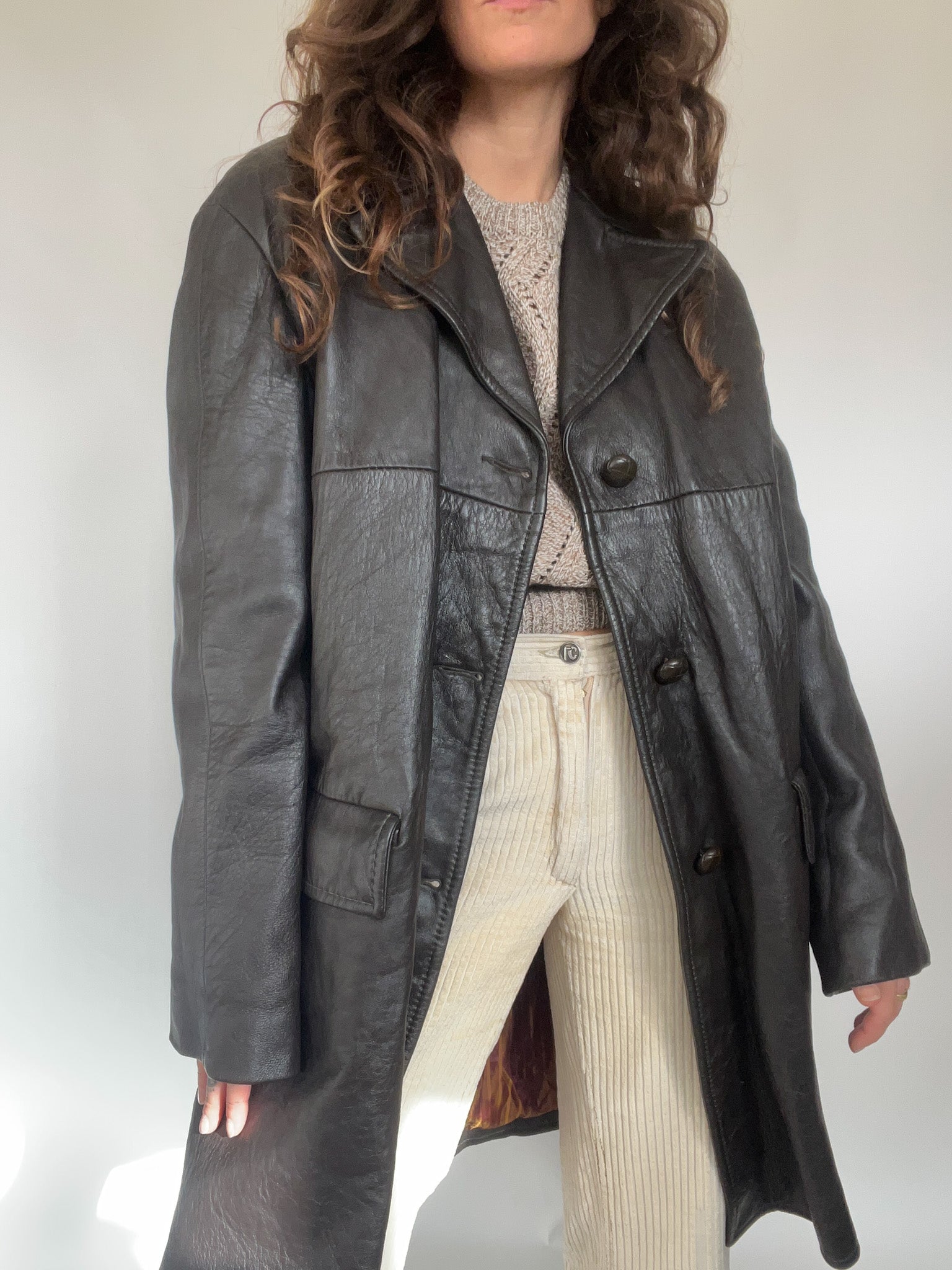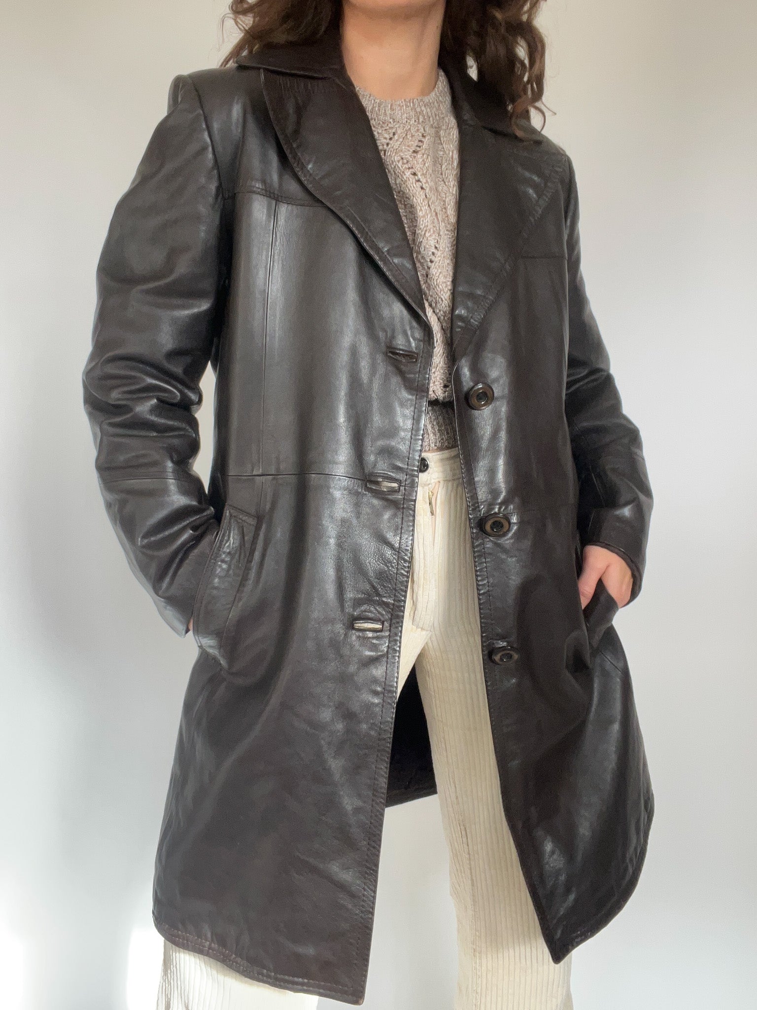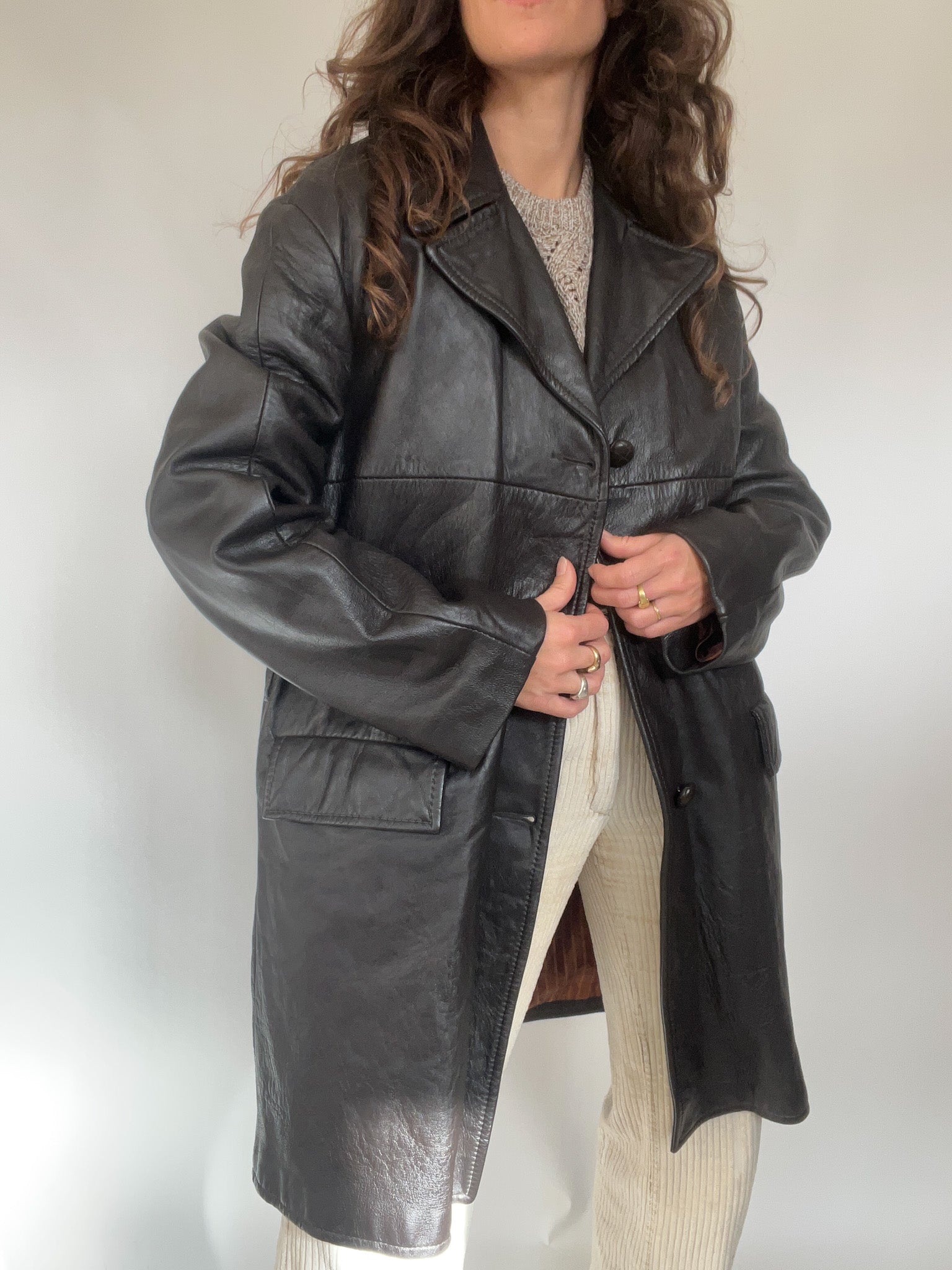 Vintage 80’s Dark Brown Long Leather Coat with Interior Lining