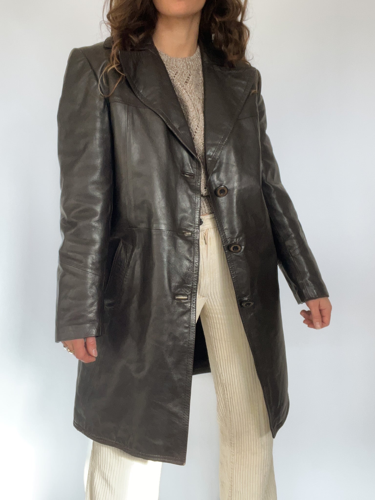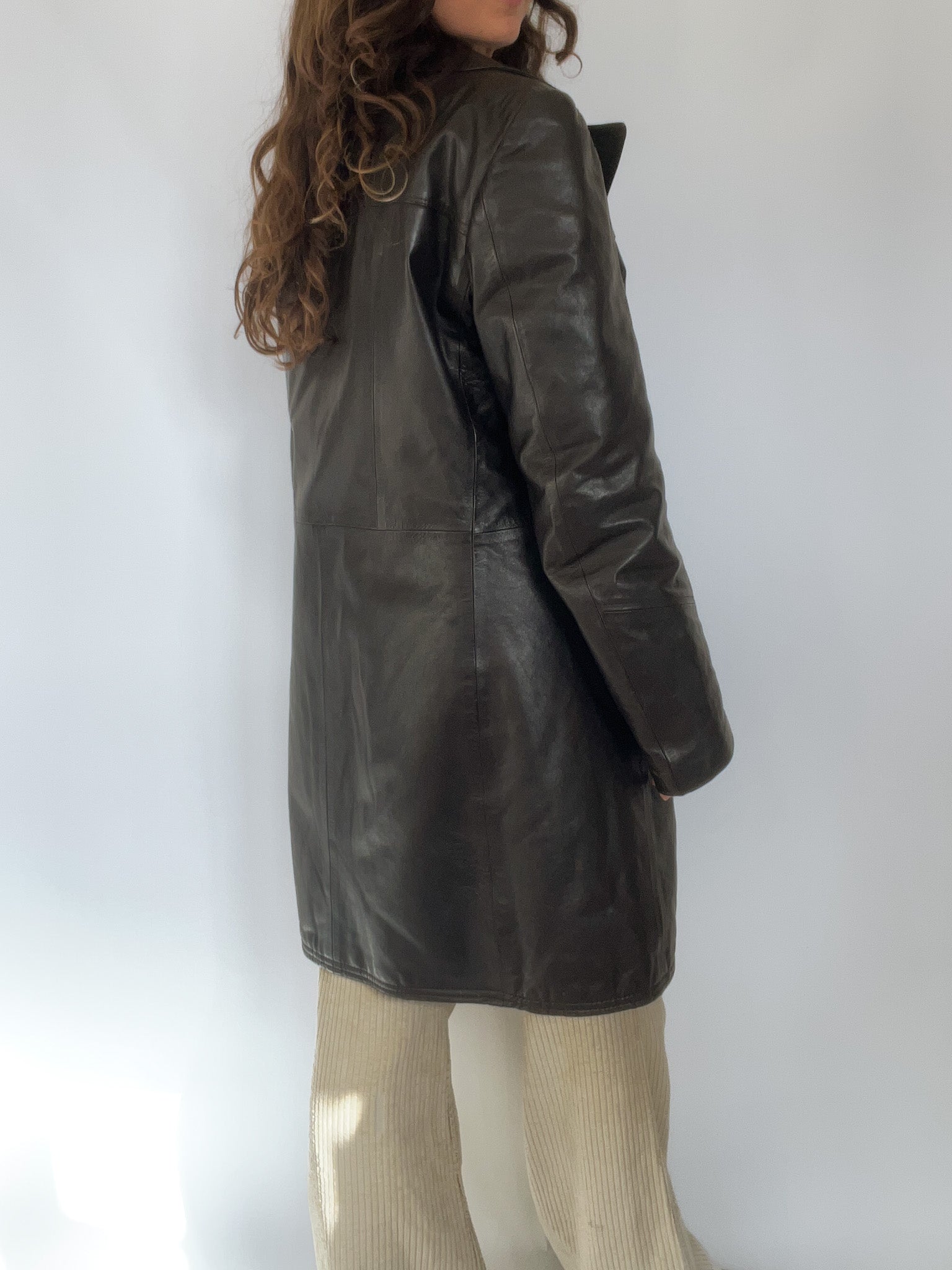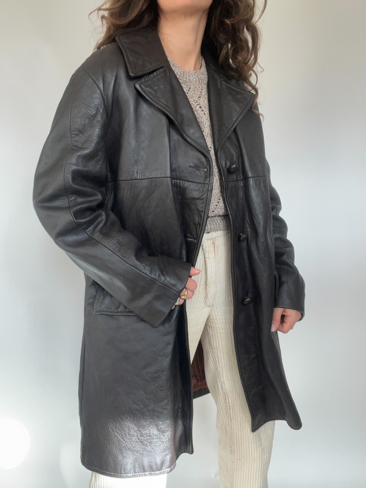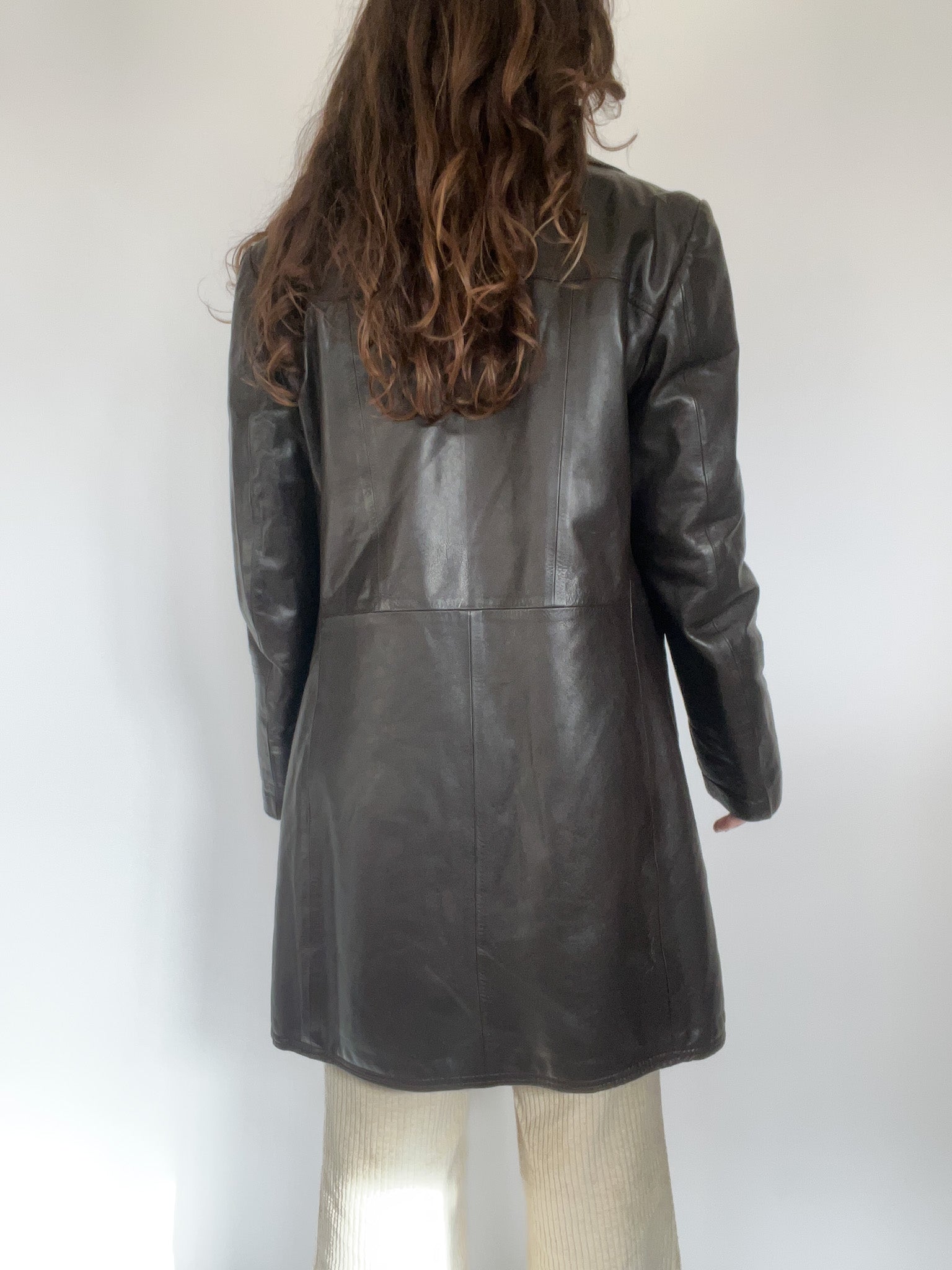 Vintage 80’s Dark Brown Long Leather Coat with Interior Lining