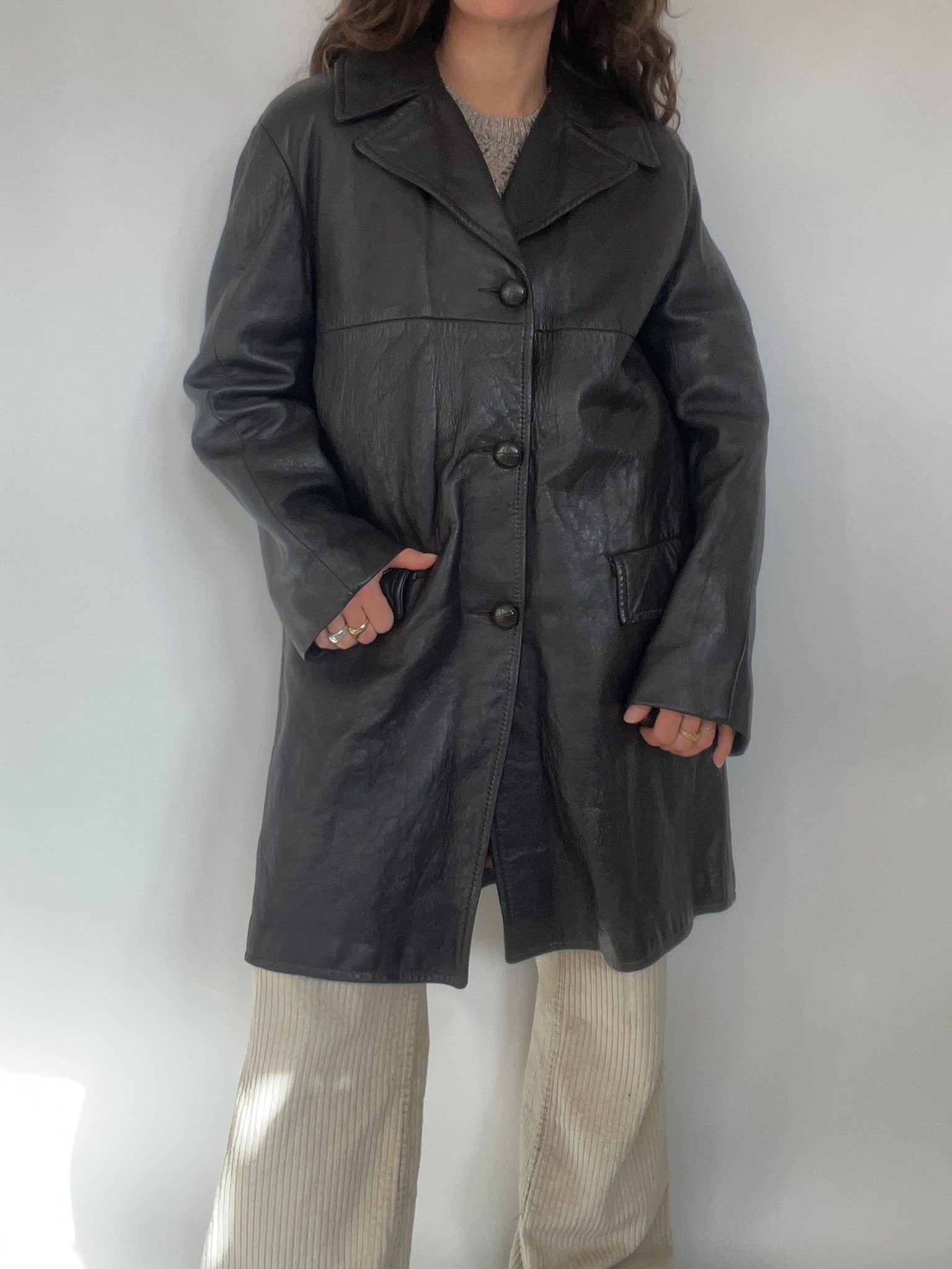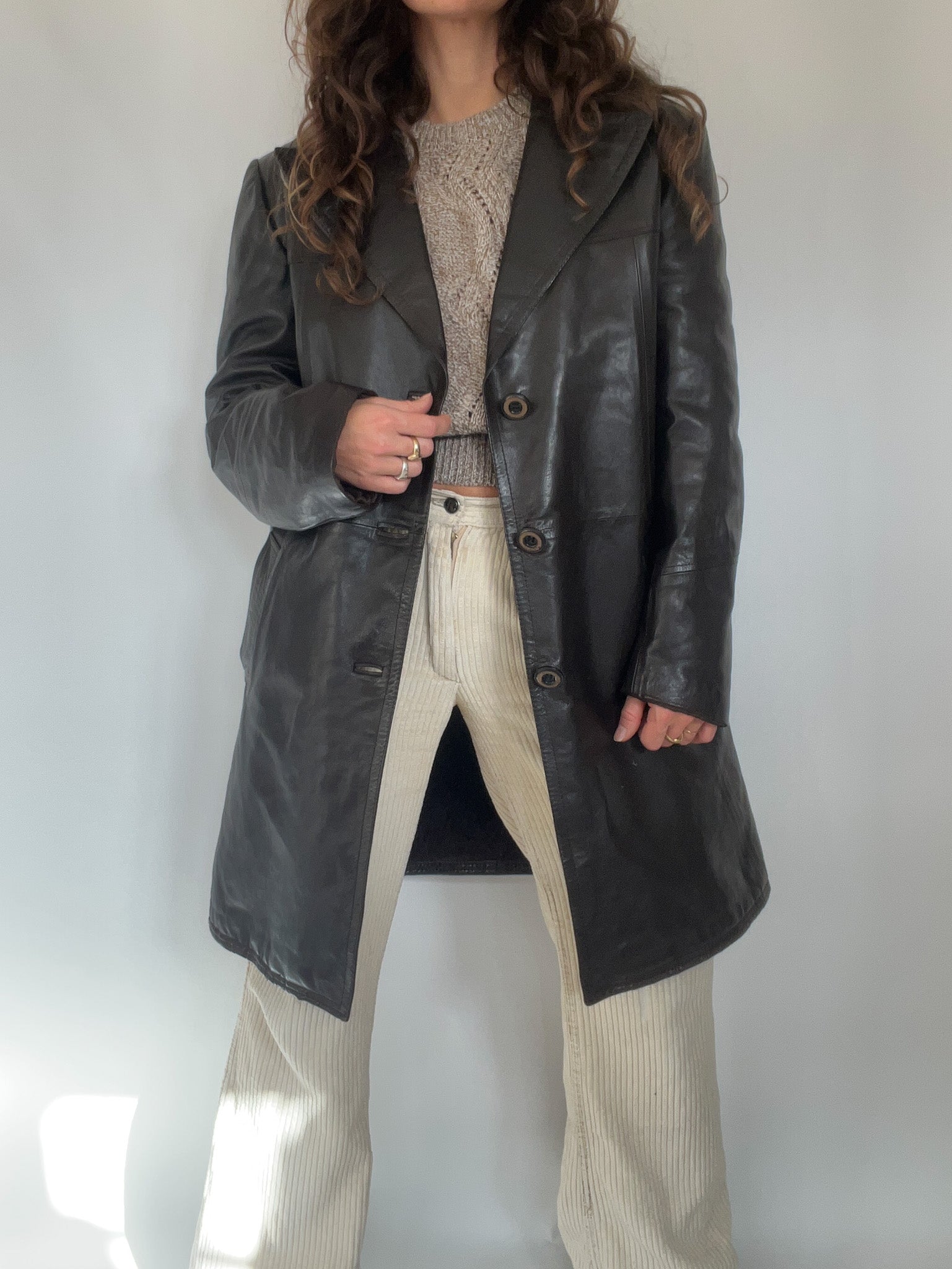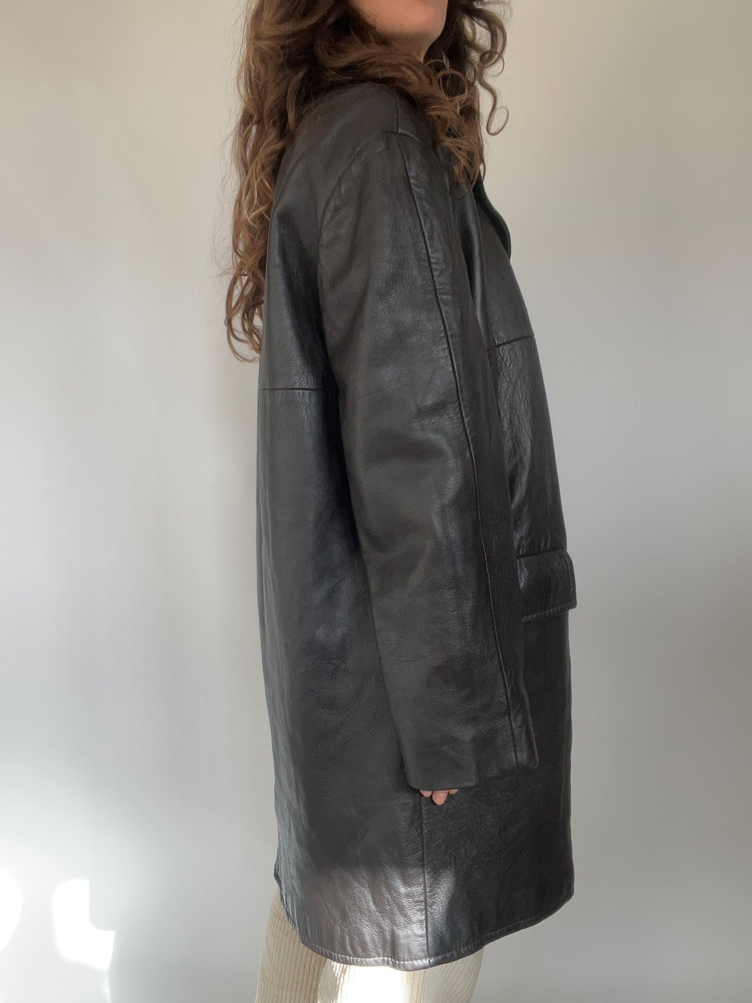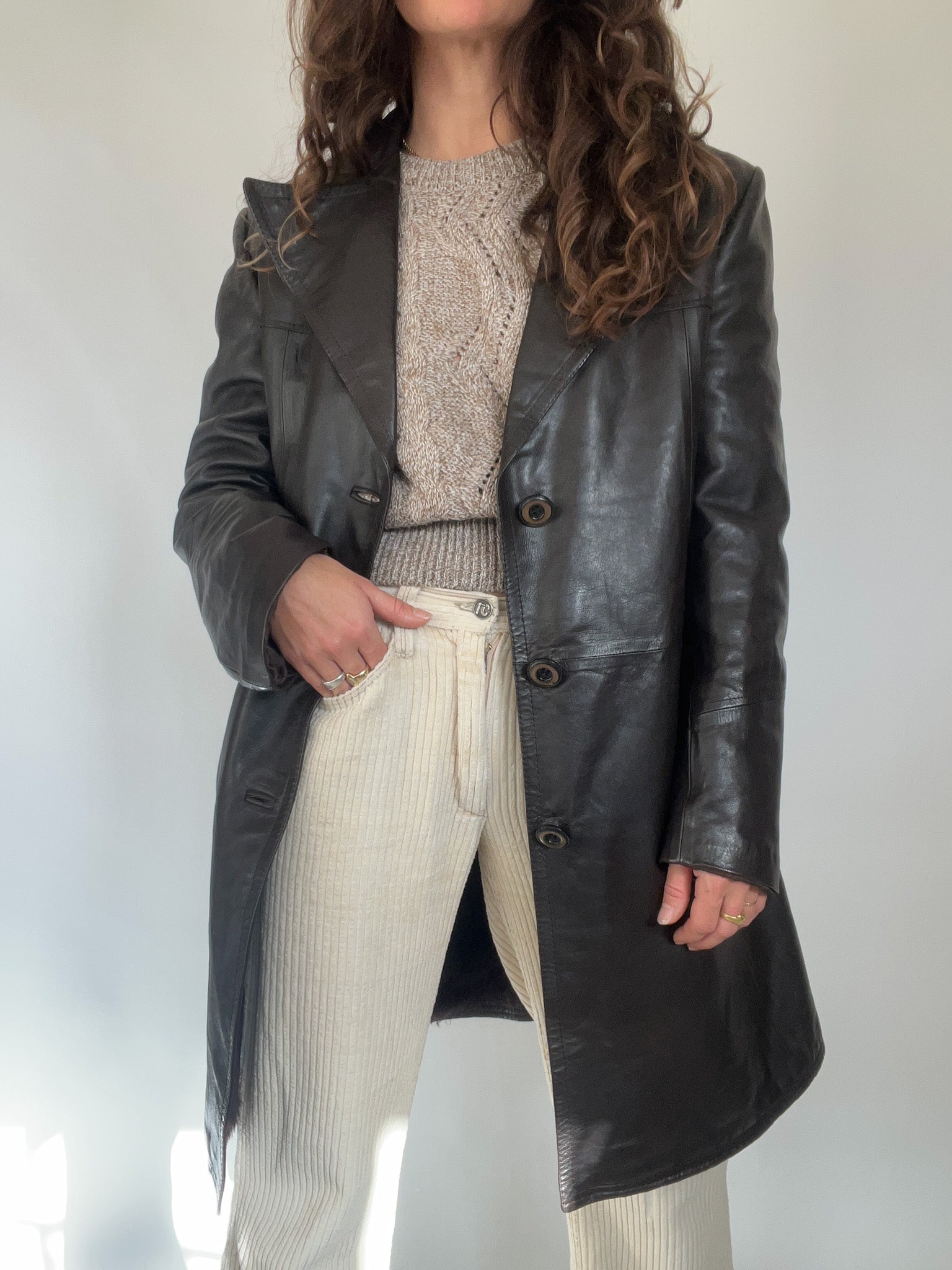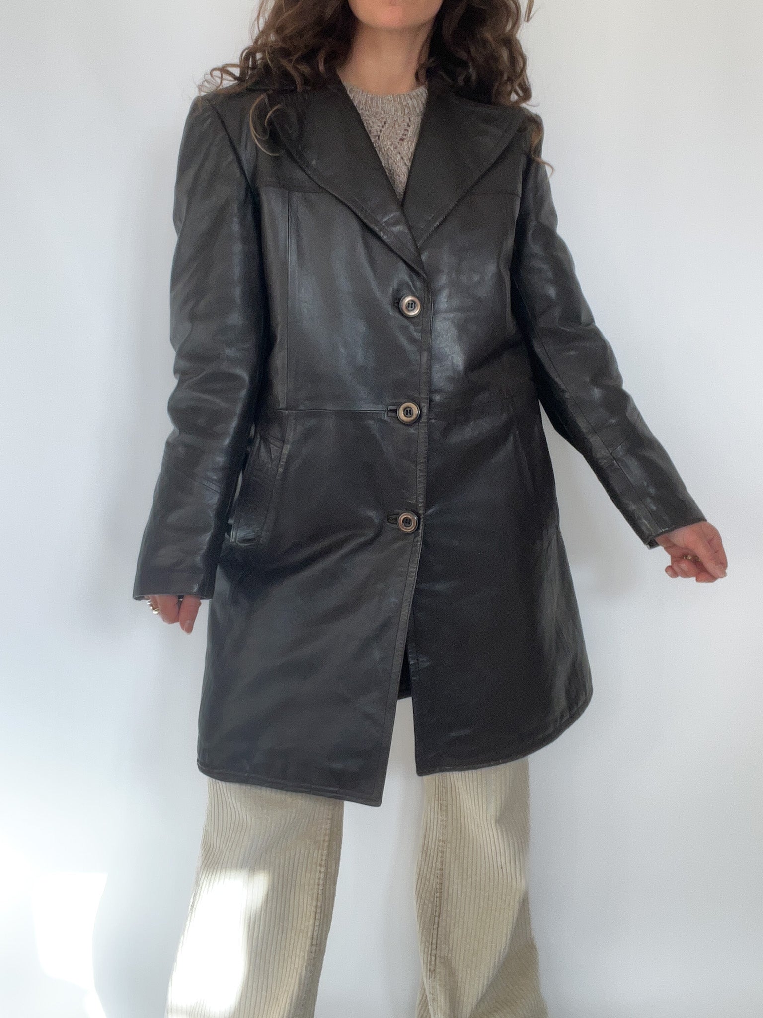 Vintage 80’s Dark Brown Long Leather Coat with Interior Lining