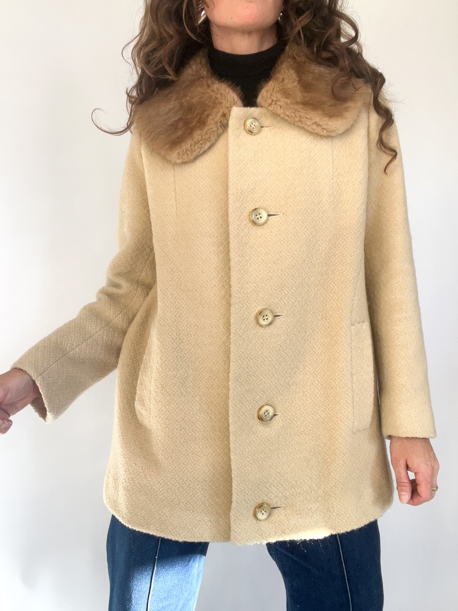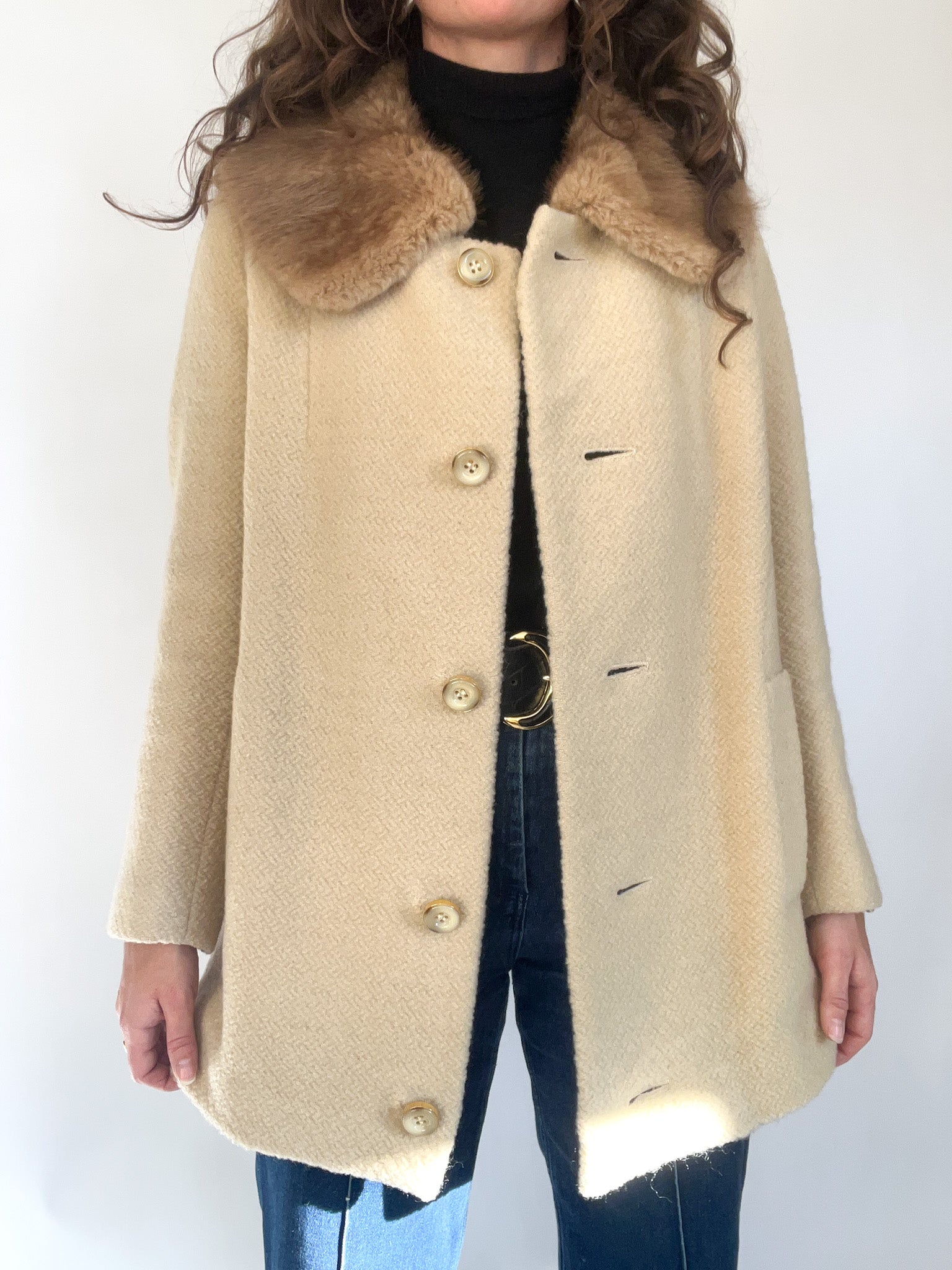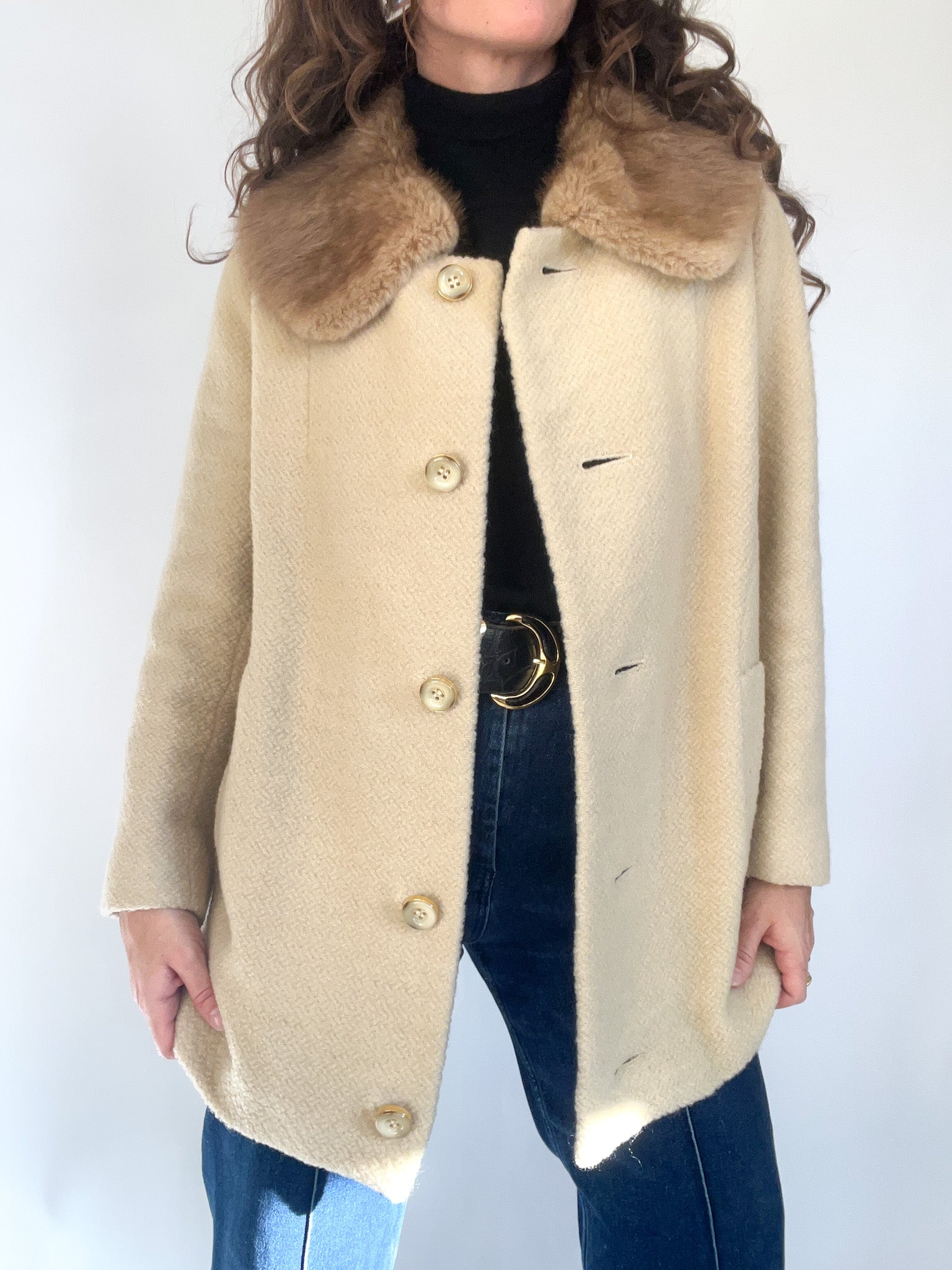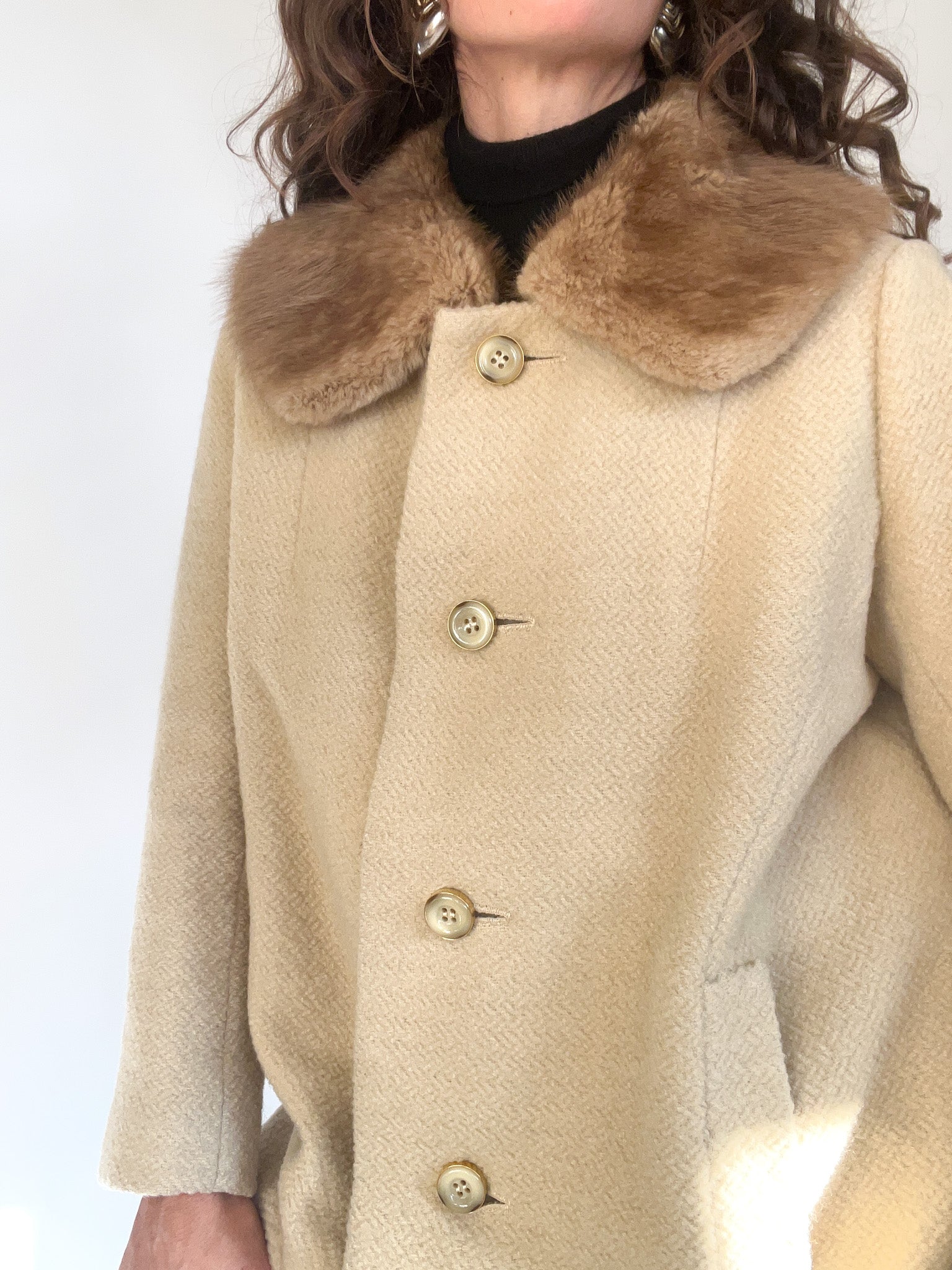 Vintage 60’s Cream Wool Coat with Faux Fur Collar
