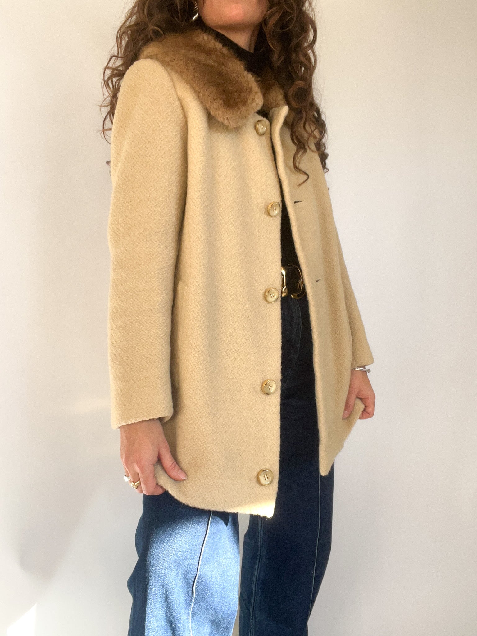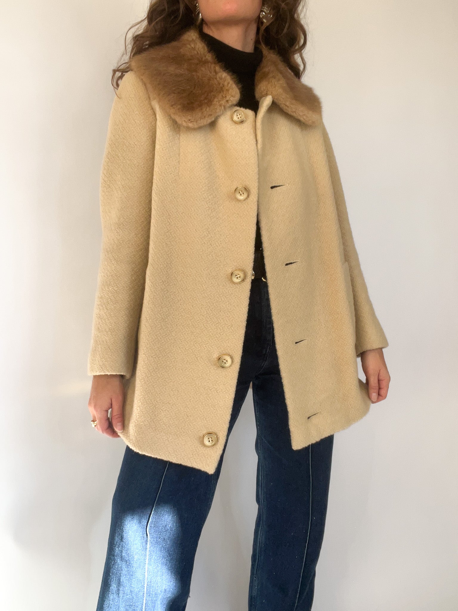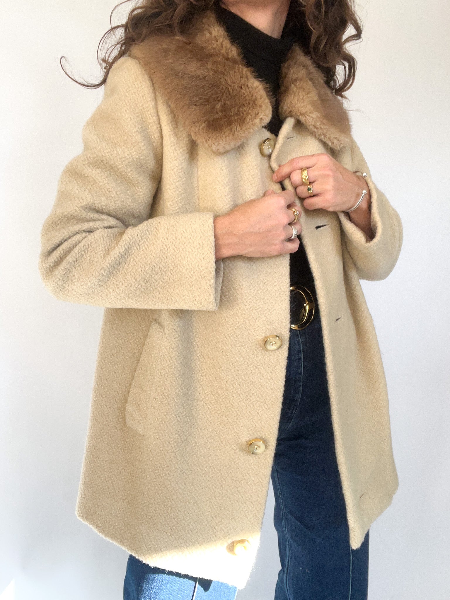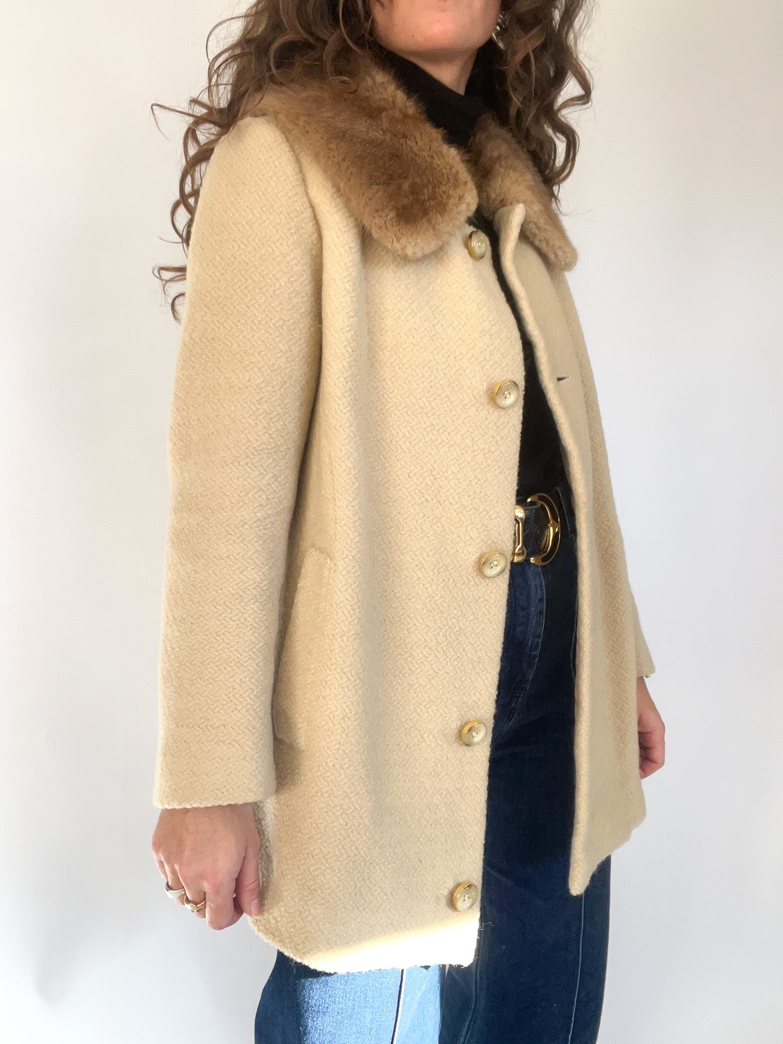 Vintage 60’s Cream Wool Coat with Faux Fur Collar