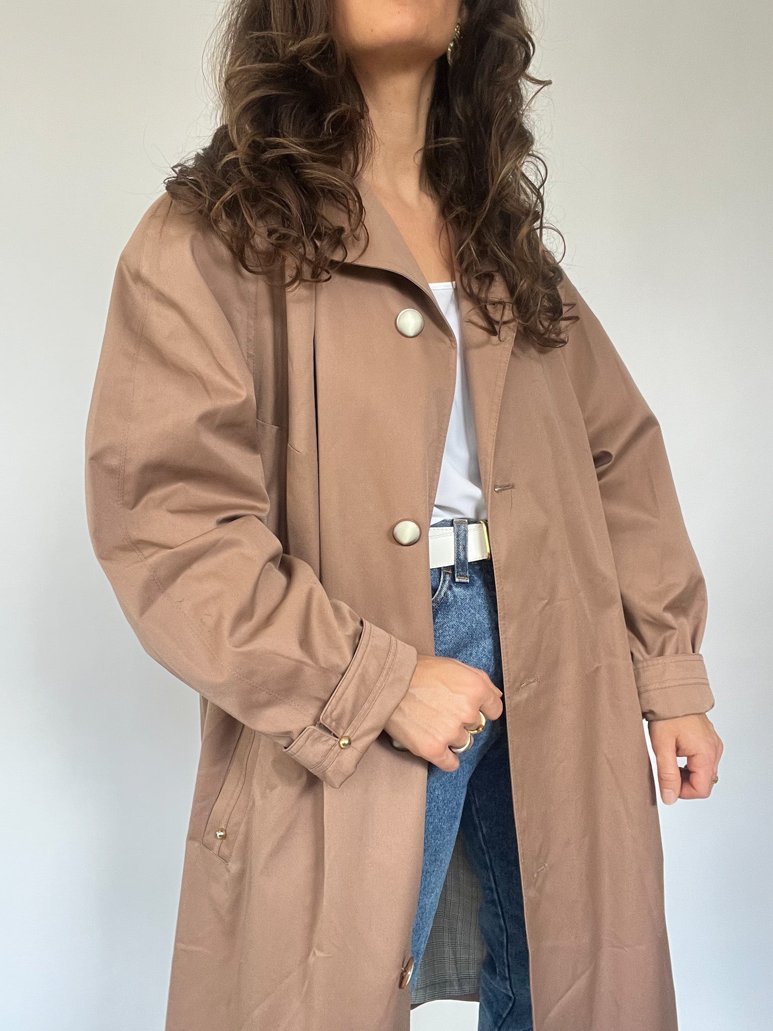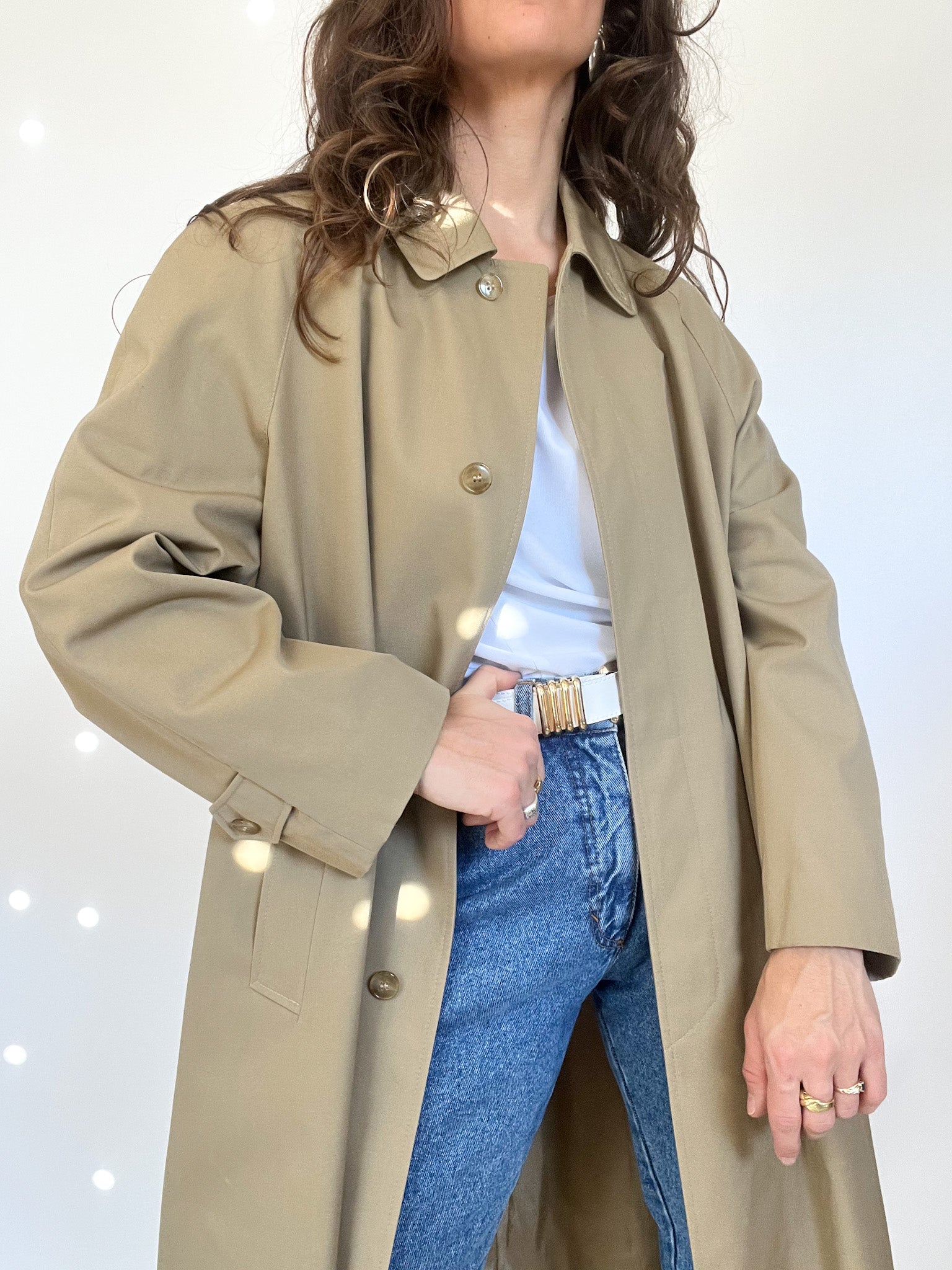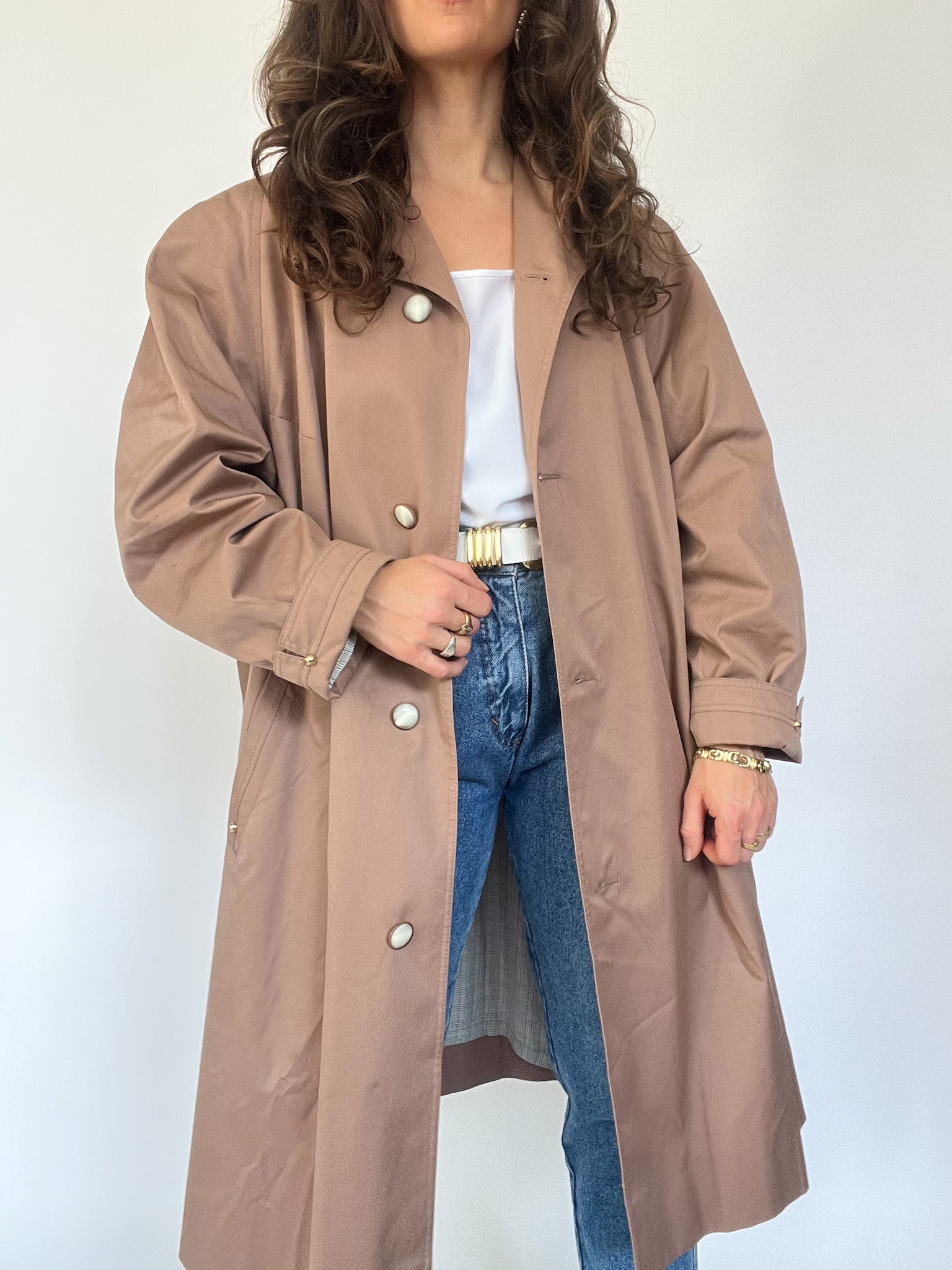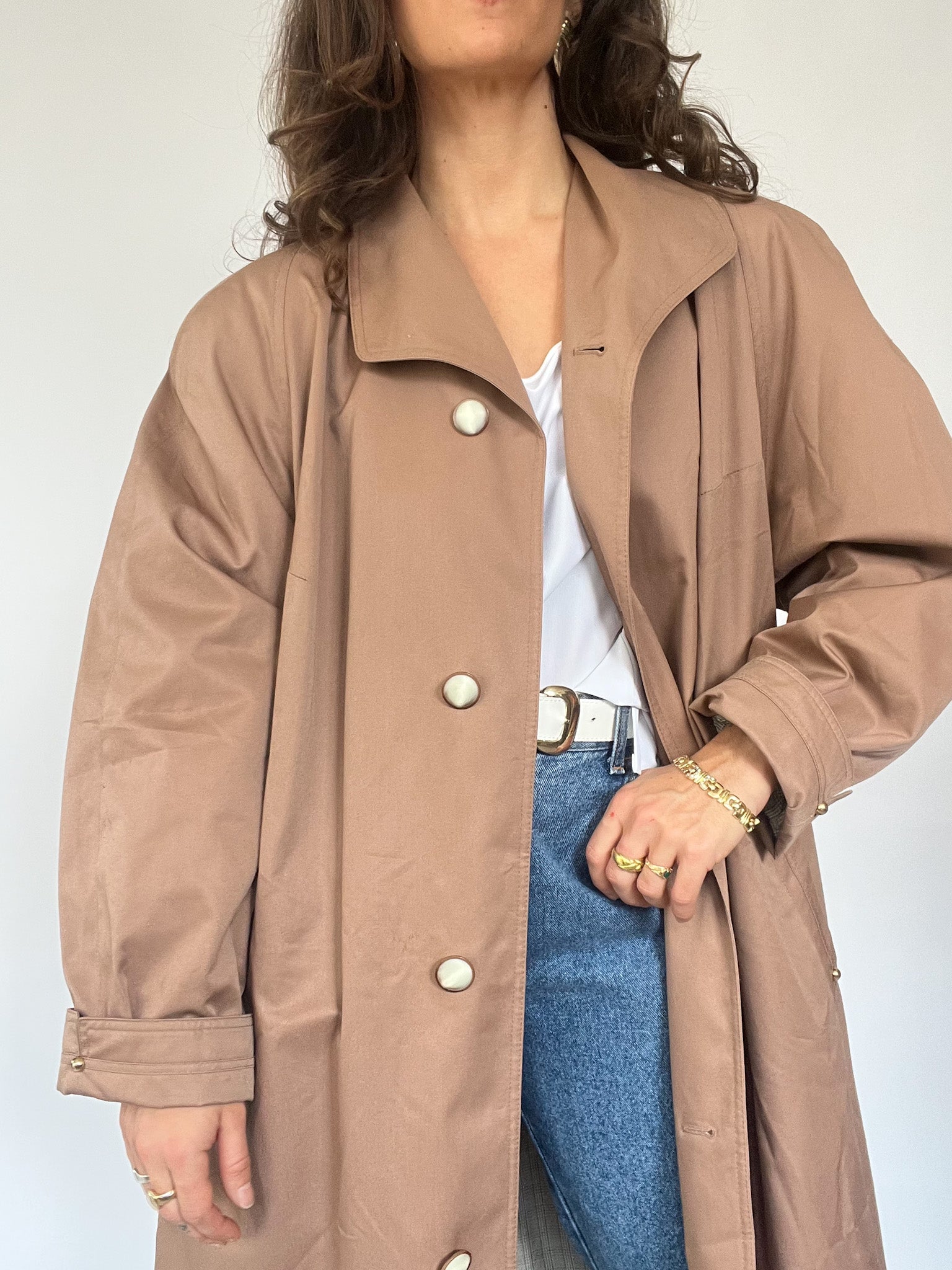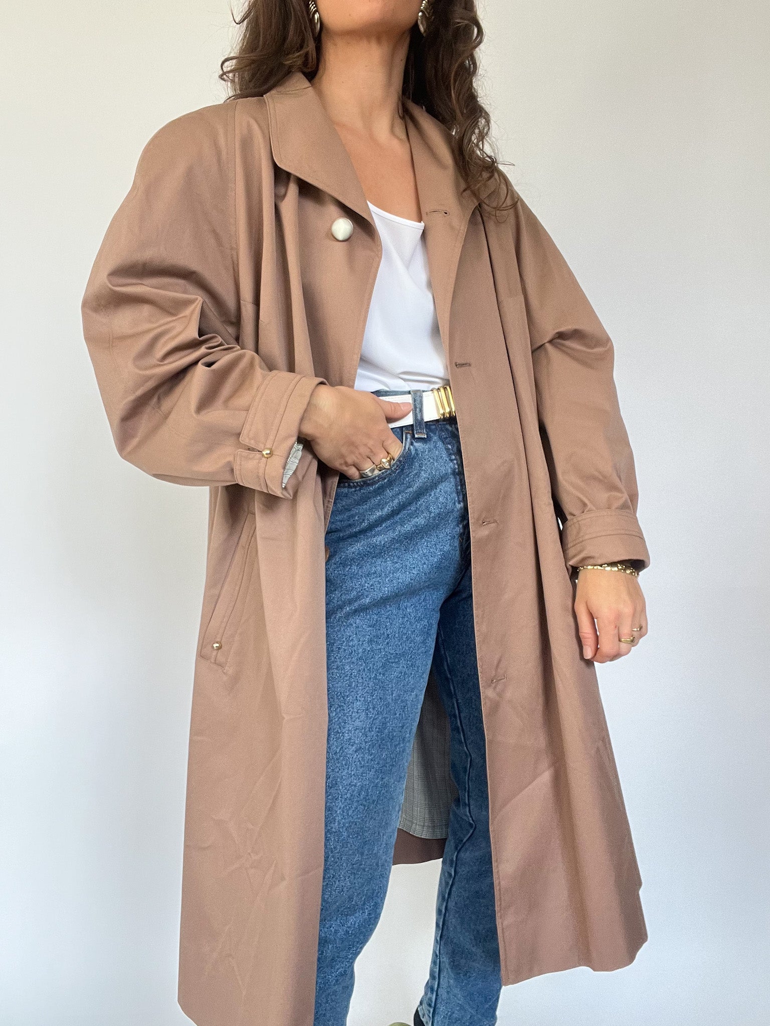 Vintage Taupe Belted Coat with Faux Fur Collar
