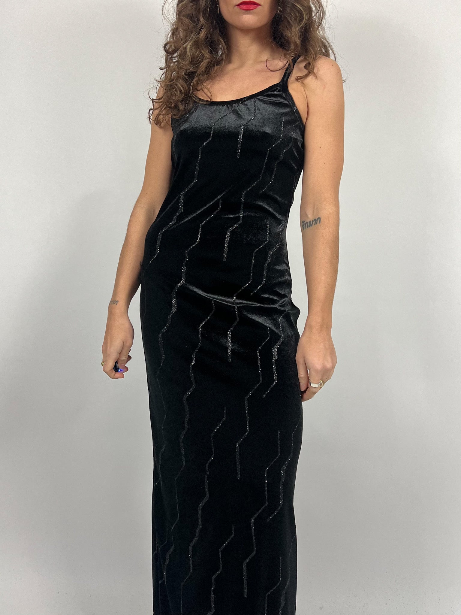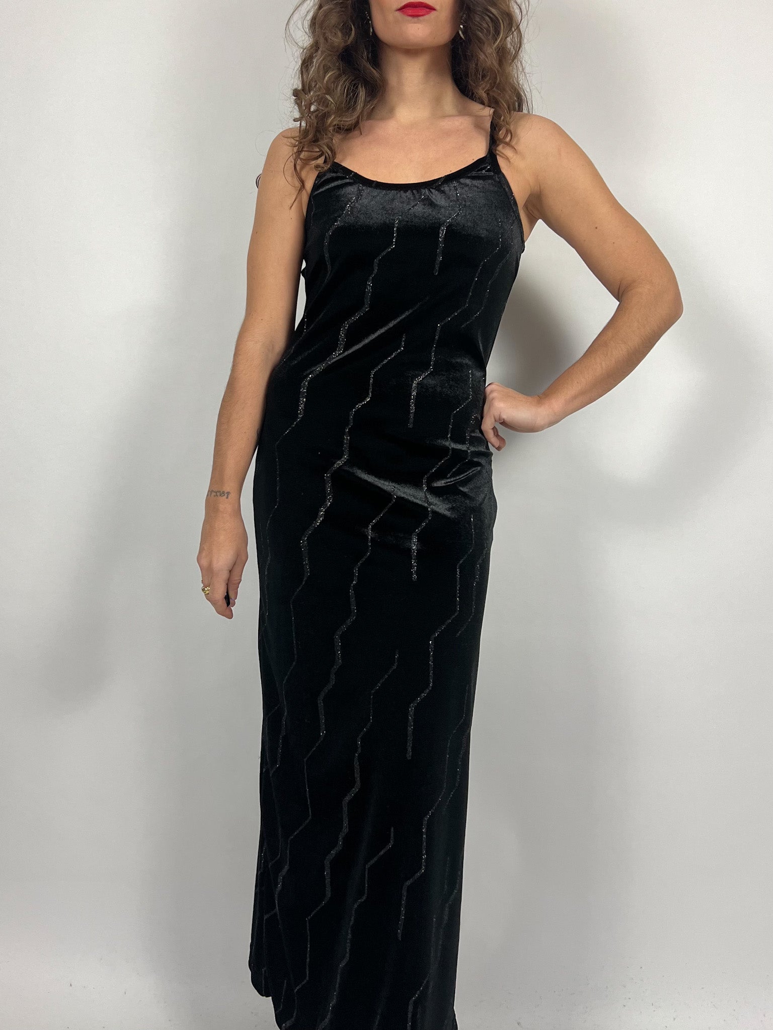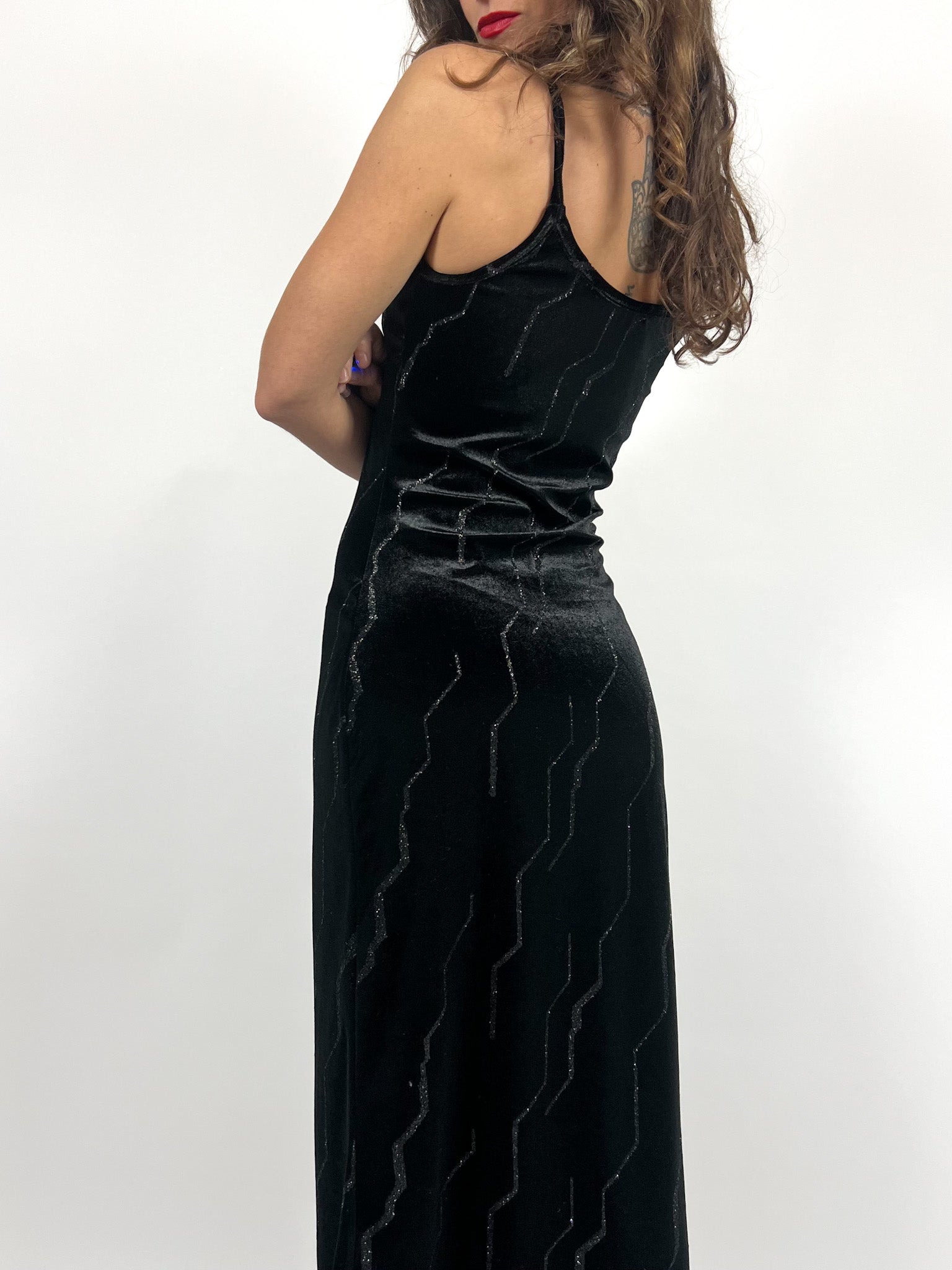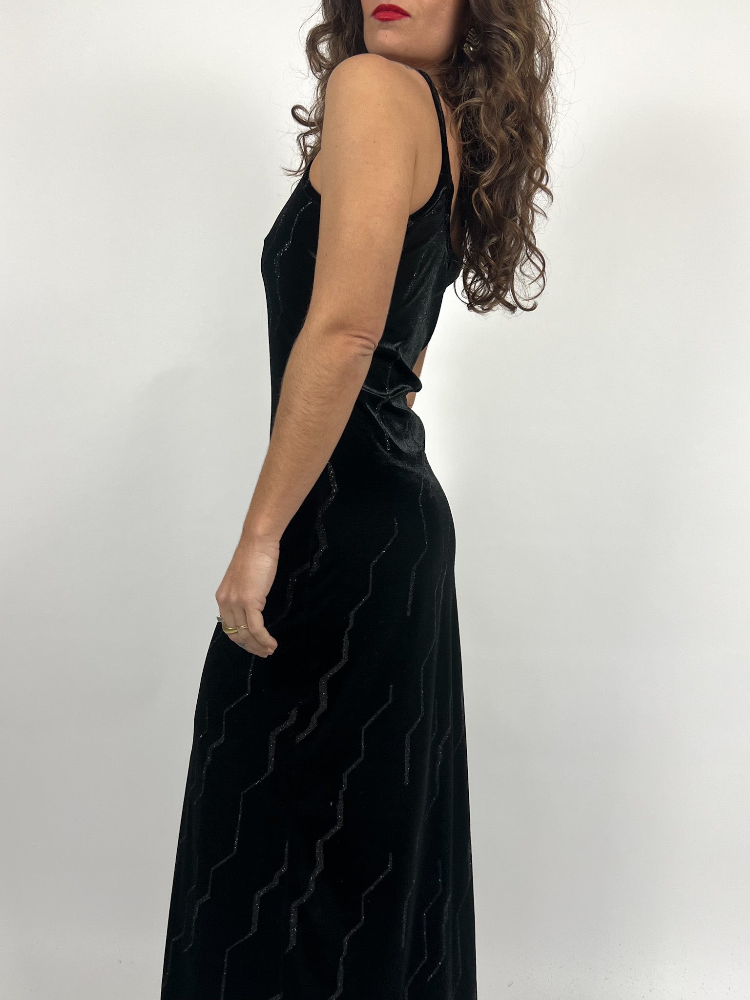 Vintage 90’s Black Velvet Studded Evening Dress with Pearls Neckline