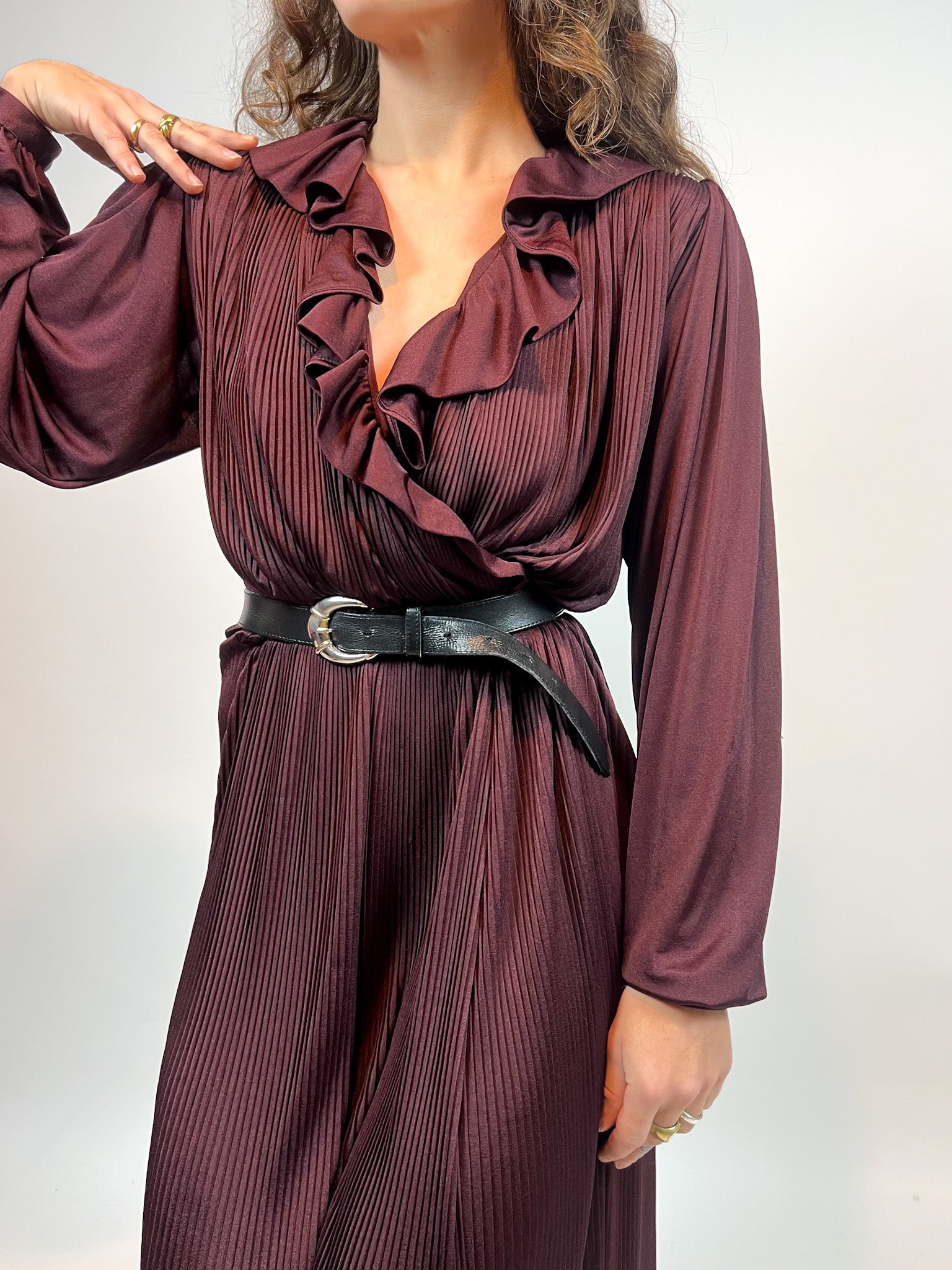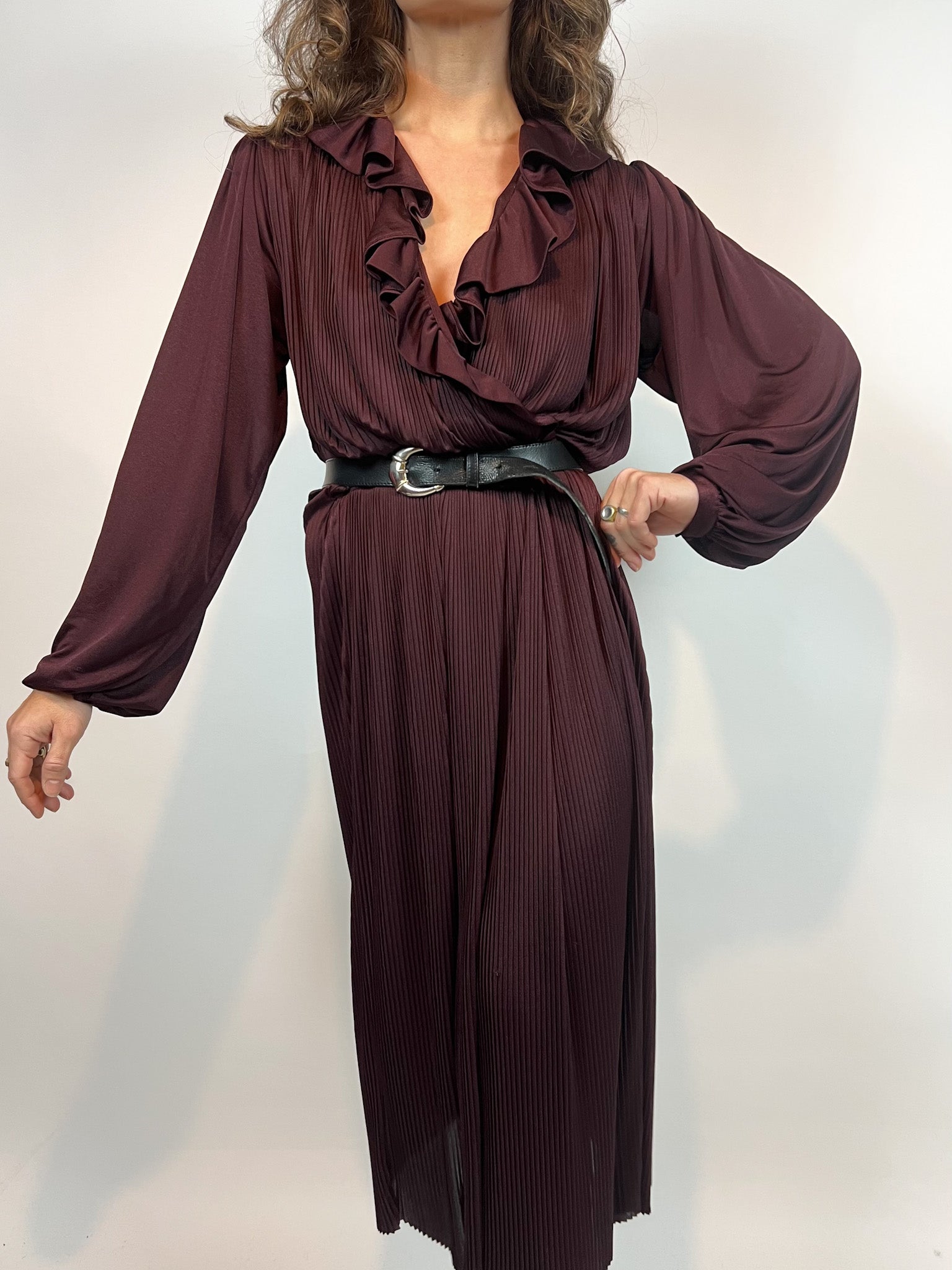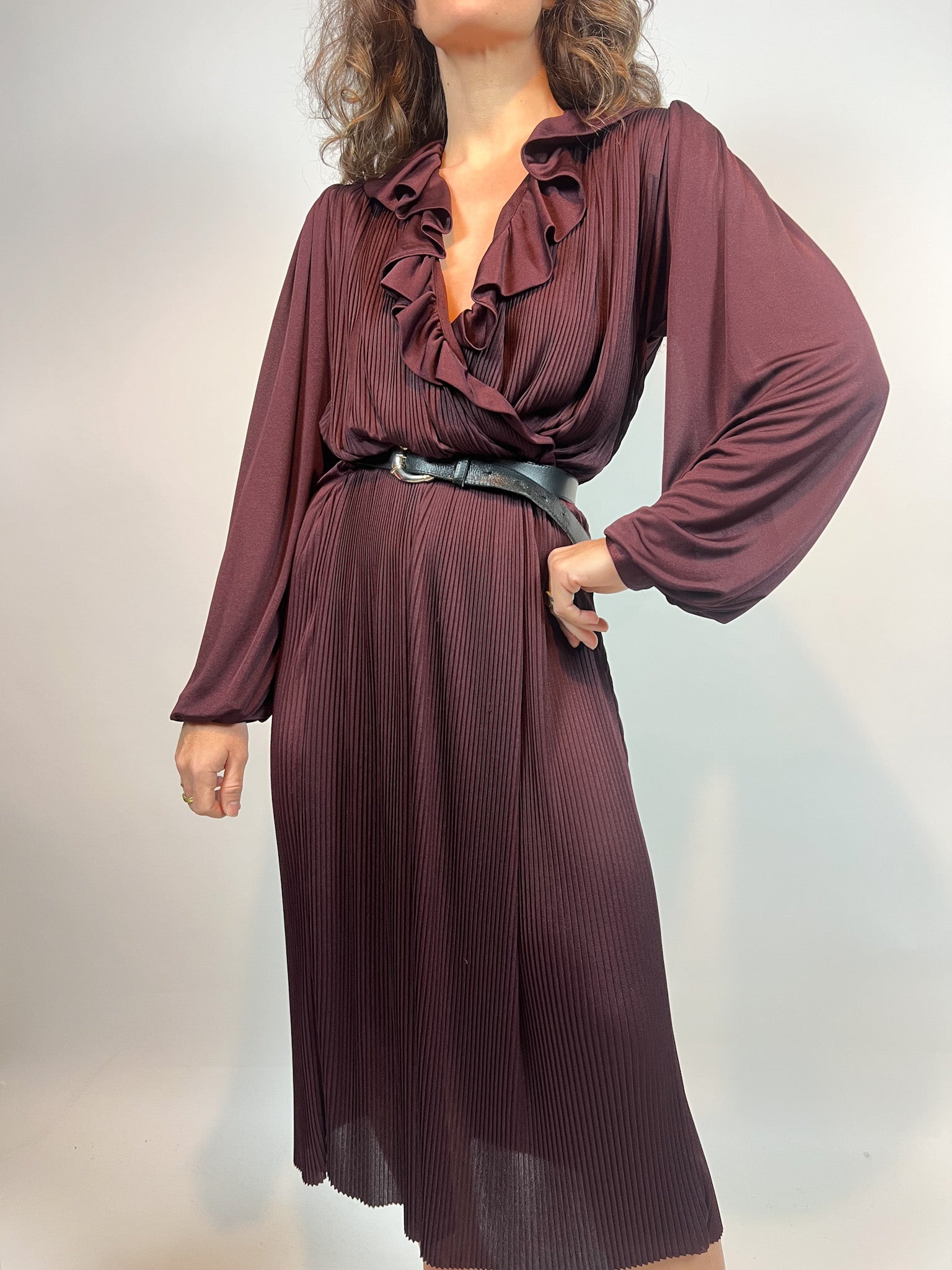 Vintage Burgundy Pleated Dress with Ruffled Neckline