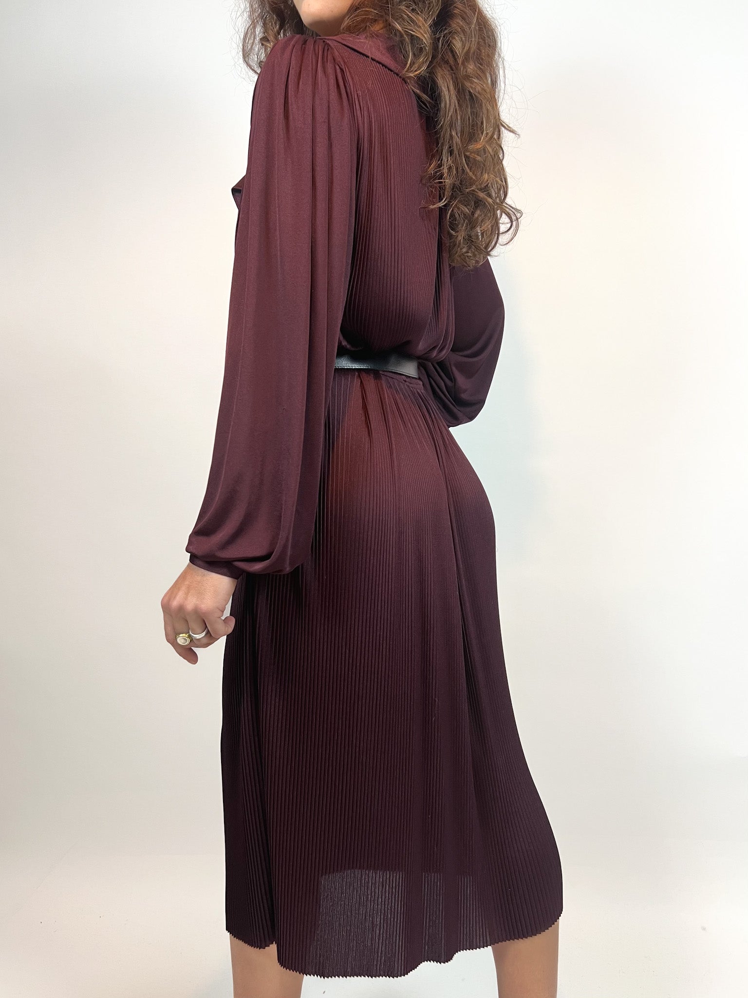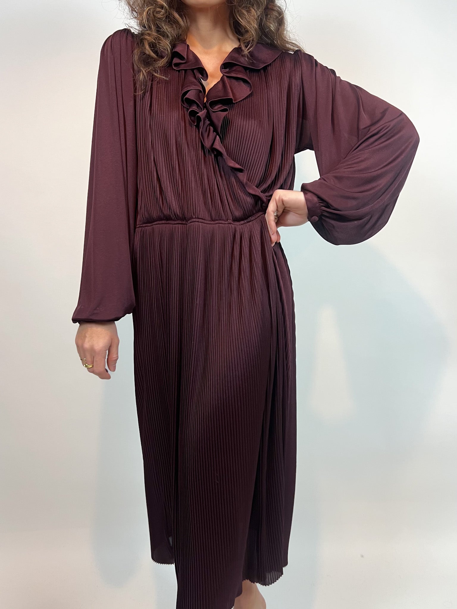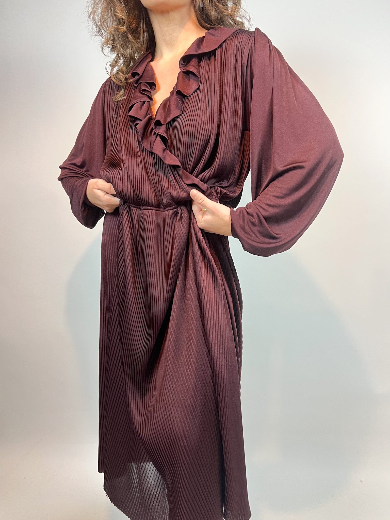 Vintage Burgundy Pleated Dress with Ruffled Neckline