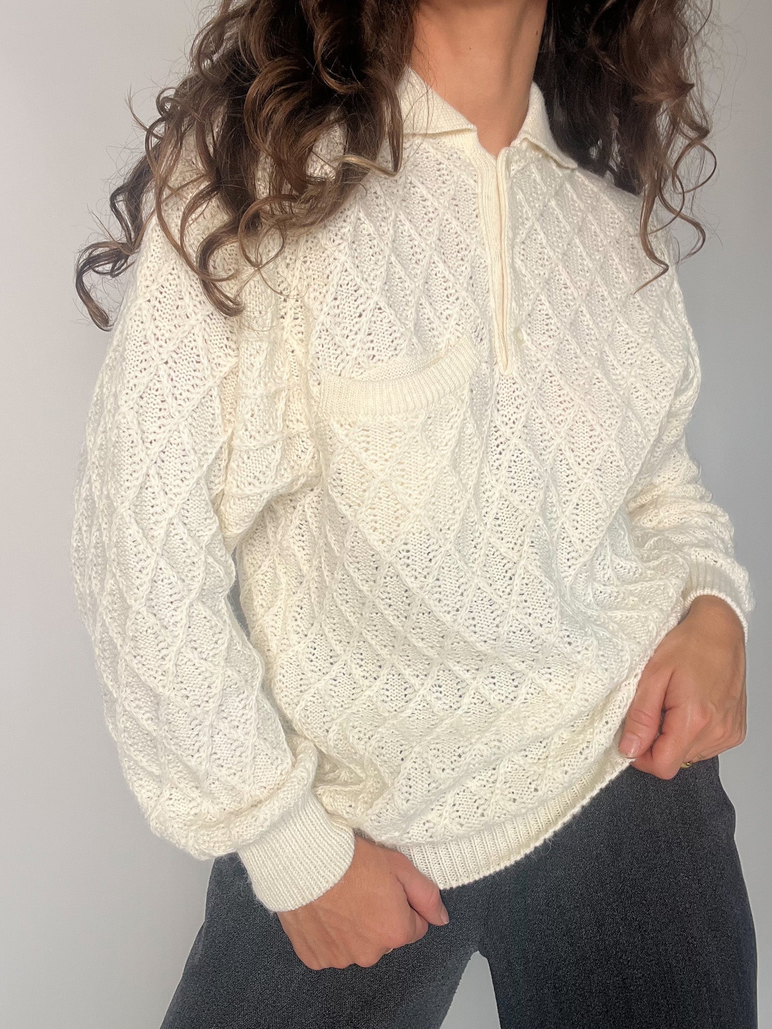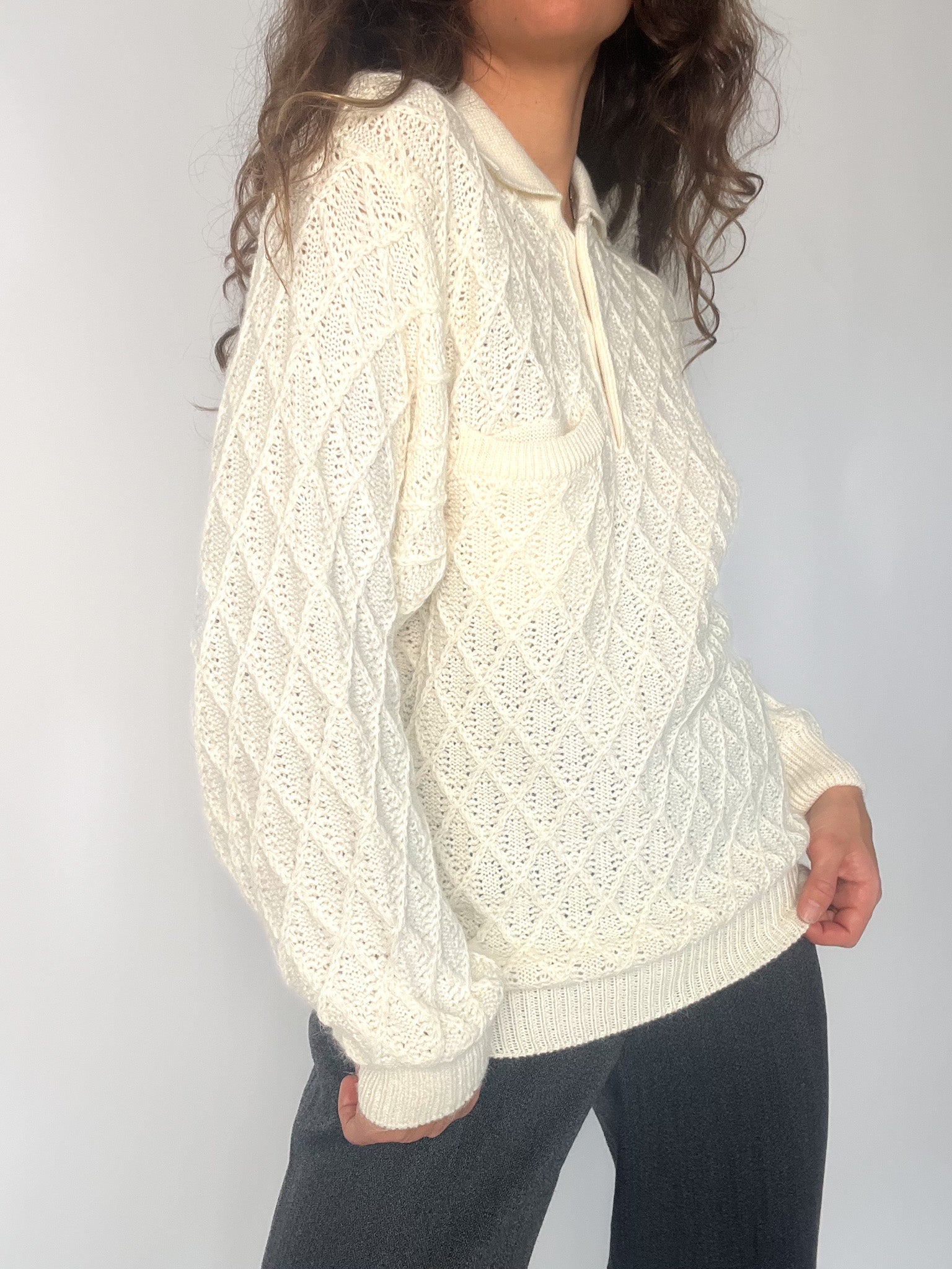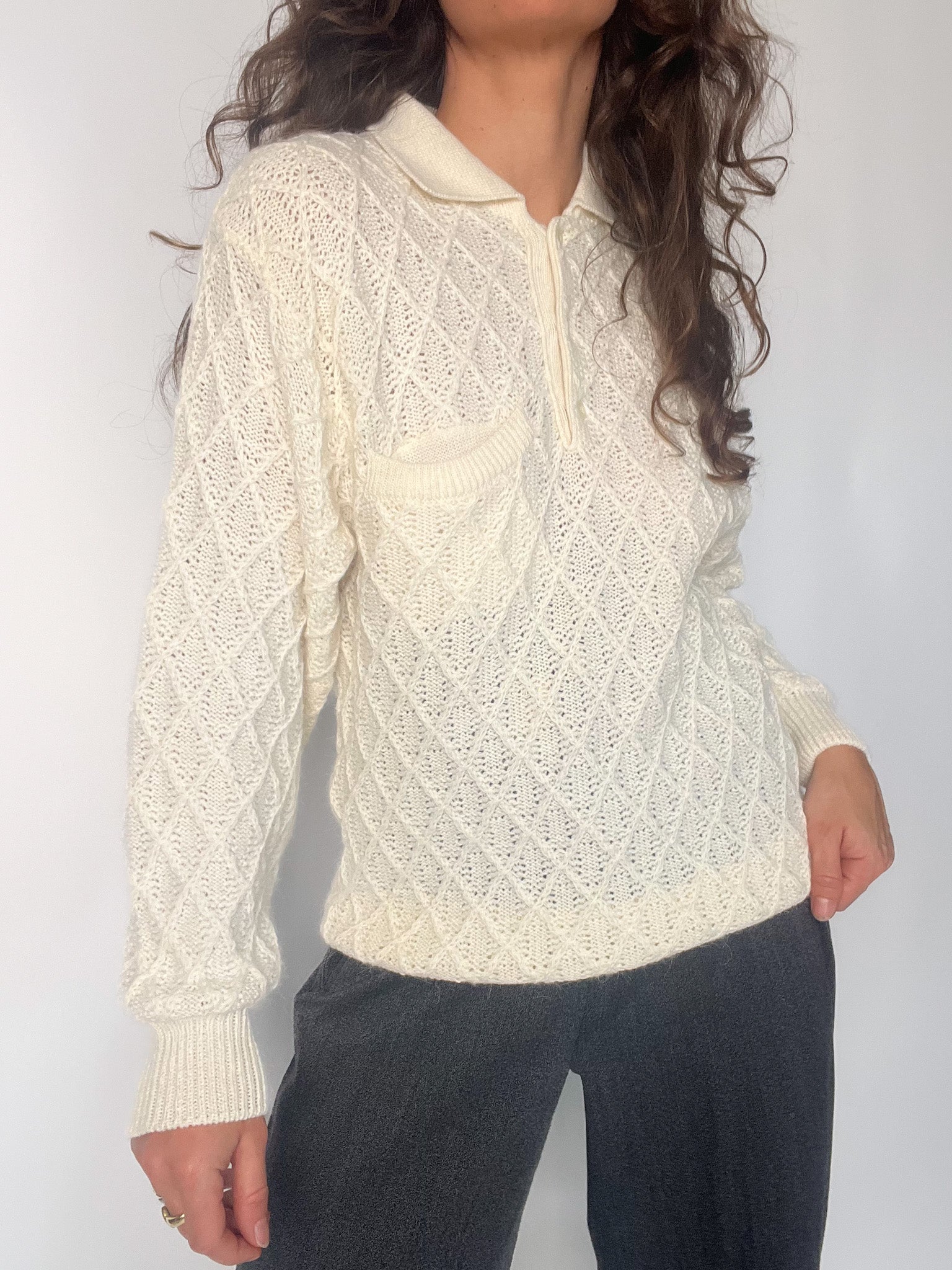 Vintage 80’s Cream Hand-Knitted Wool Polo Sweater