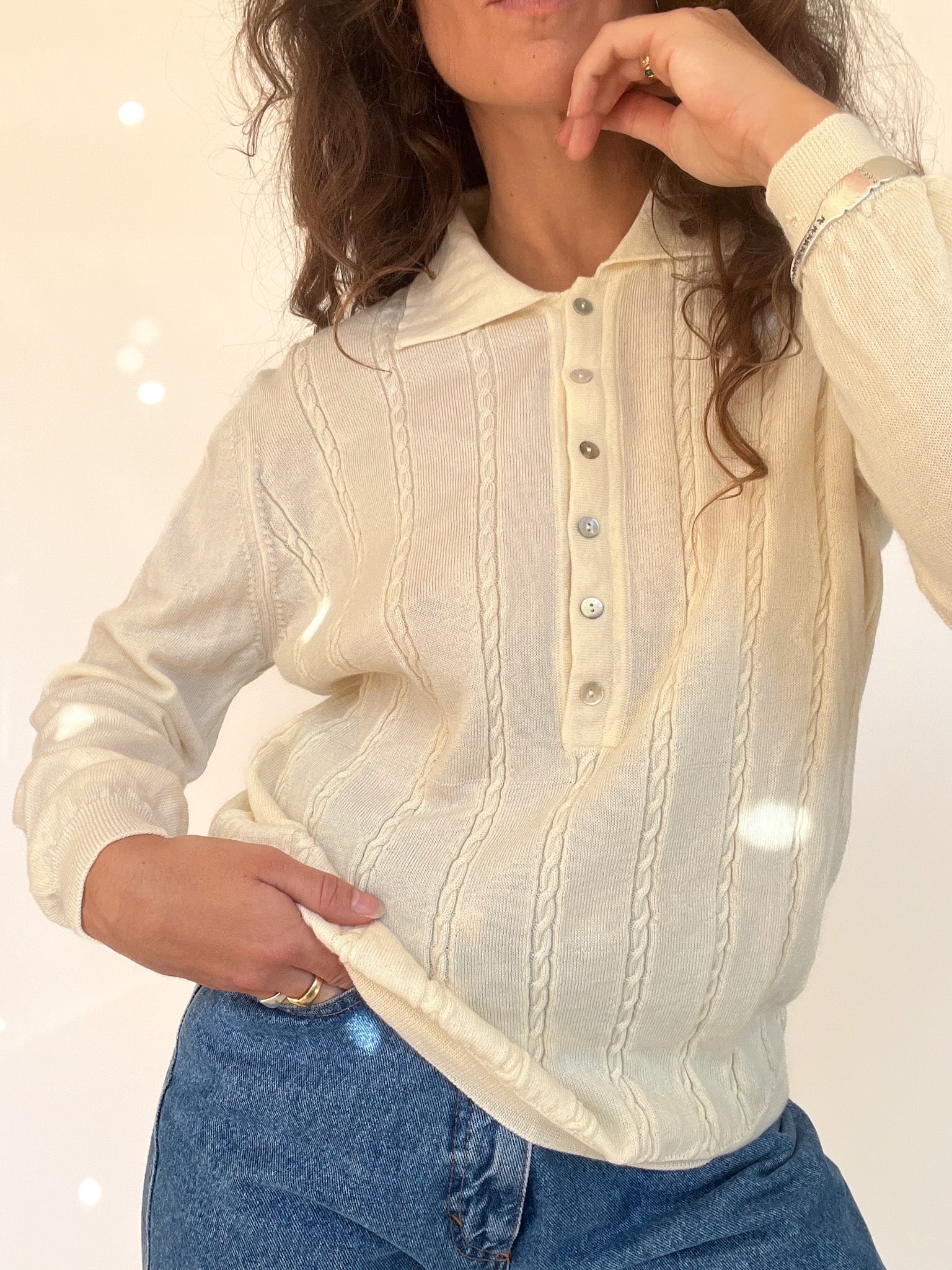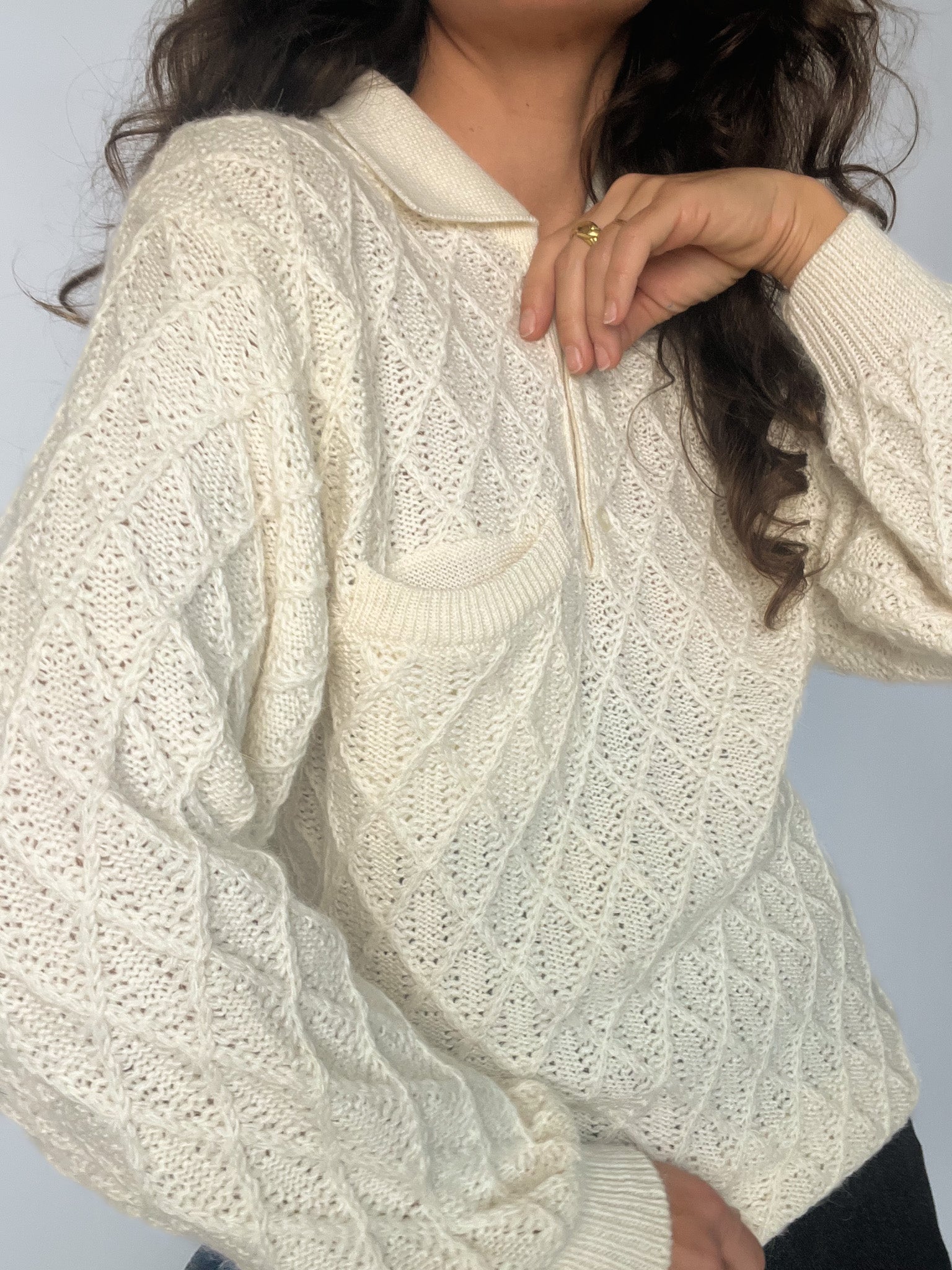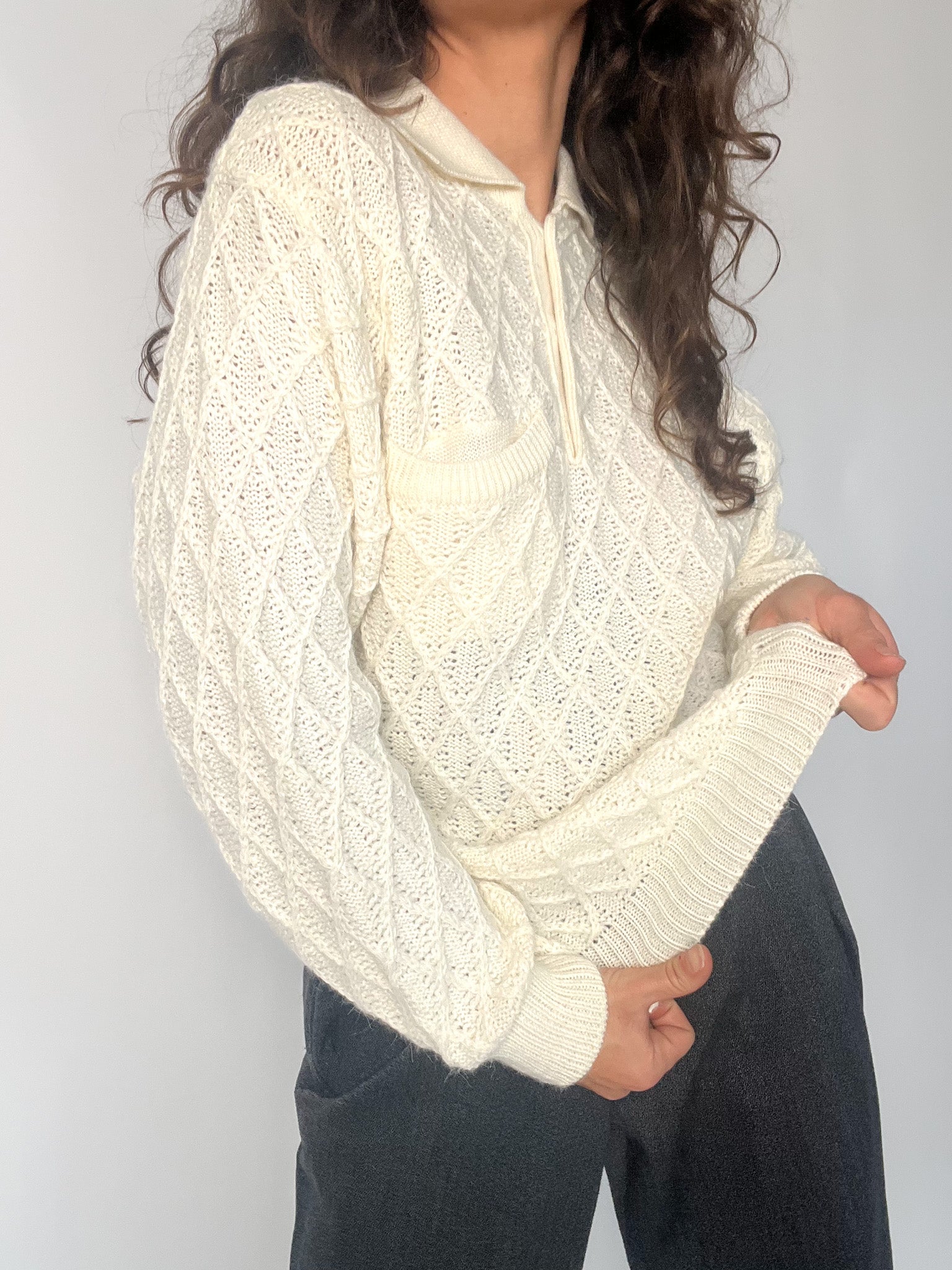 Vintage 80’s Cream Hand-Knitted Wool Polo Sweater