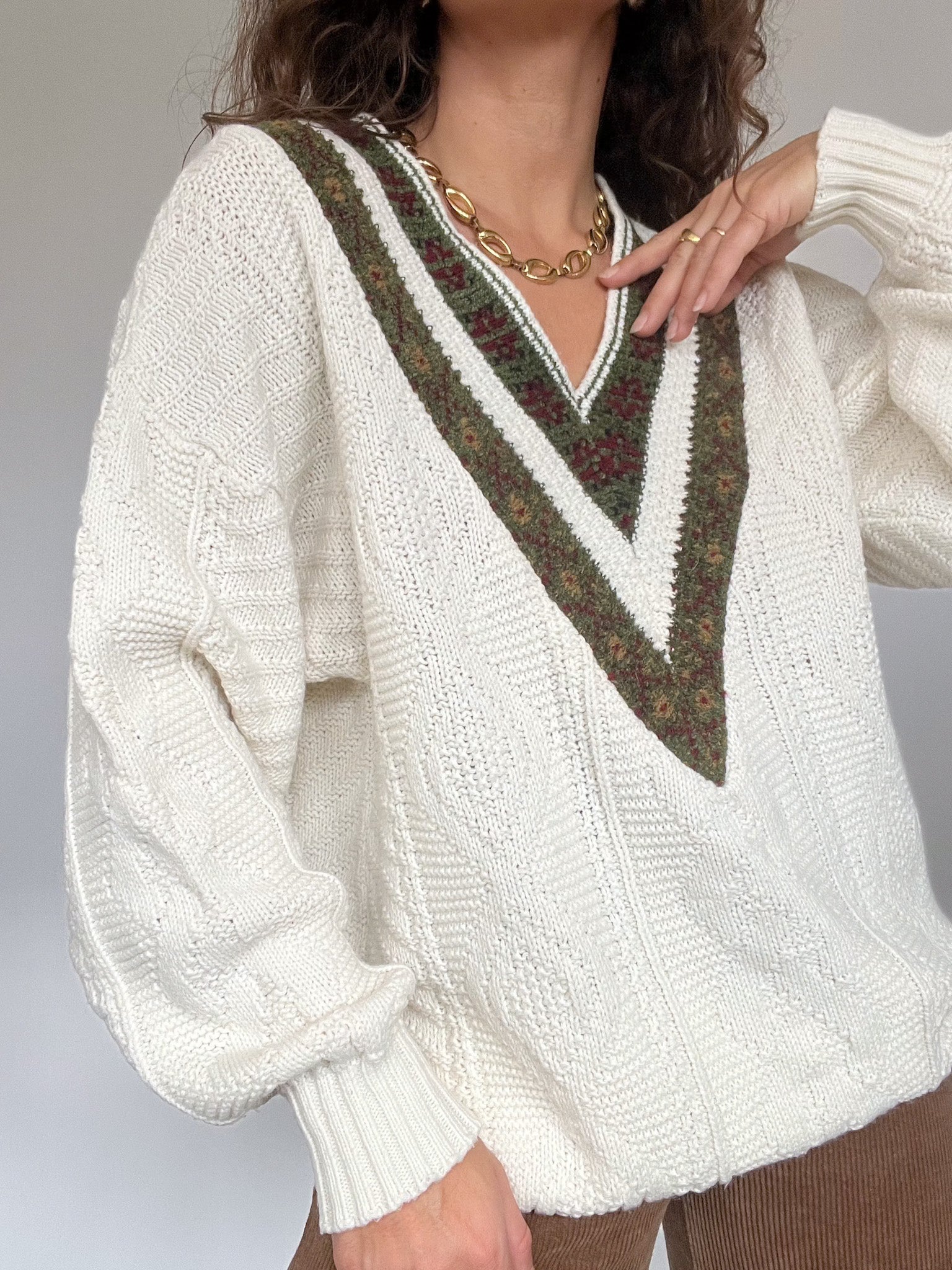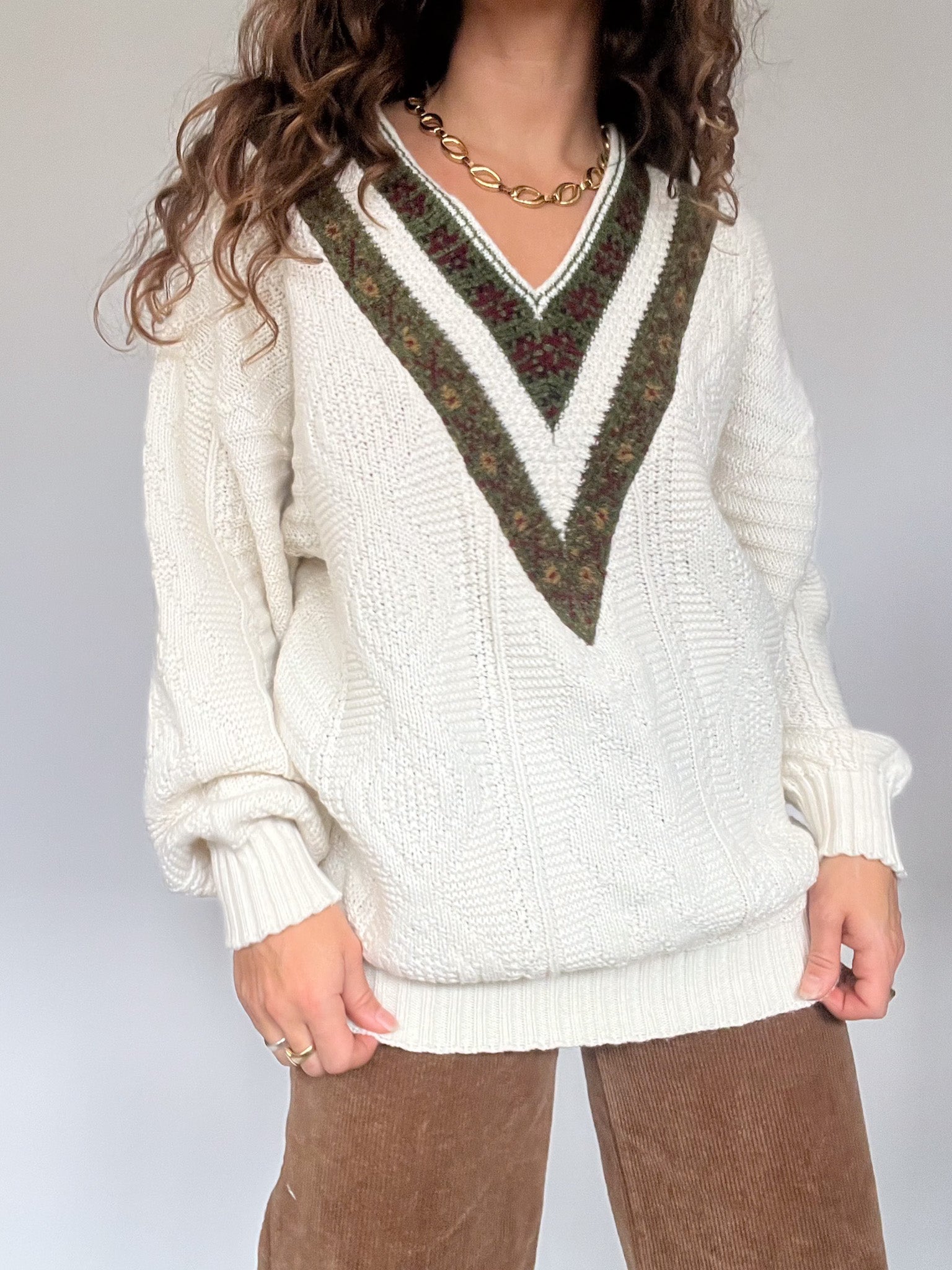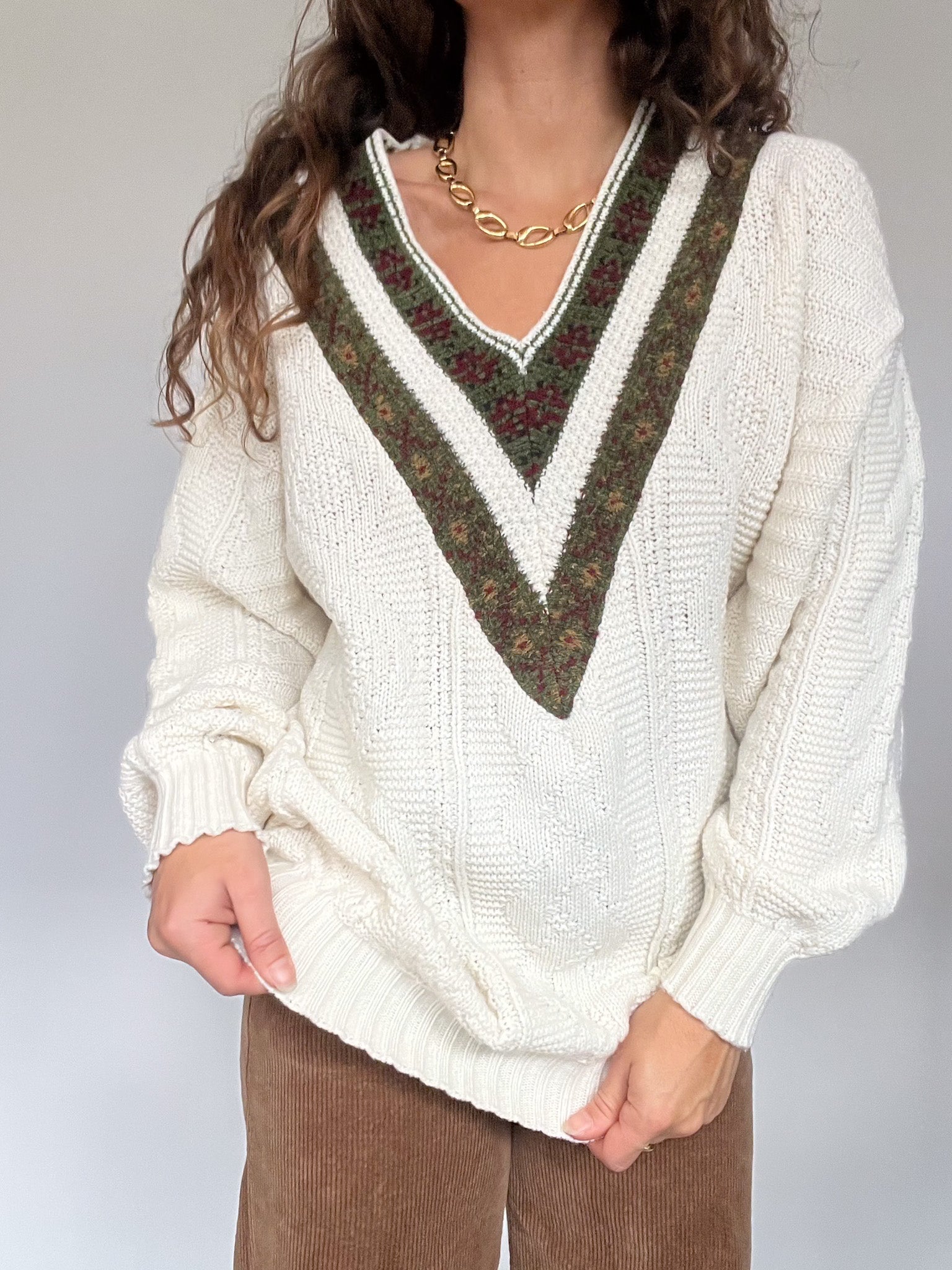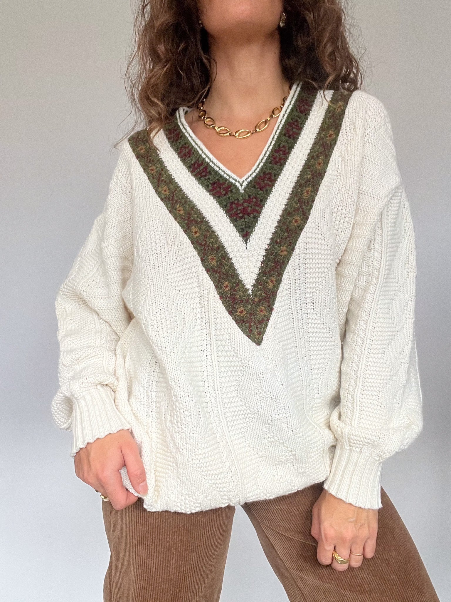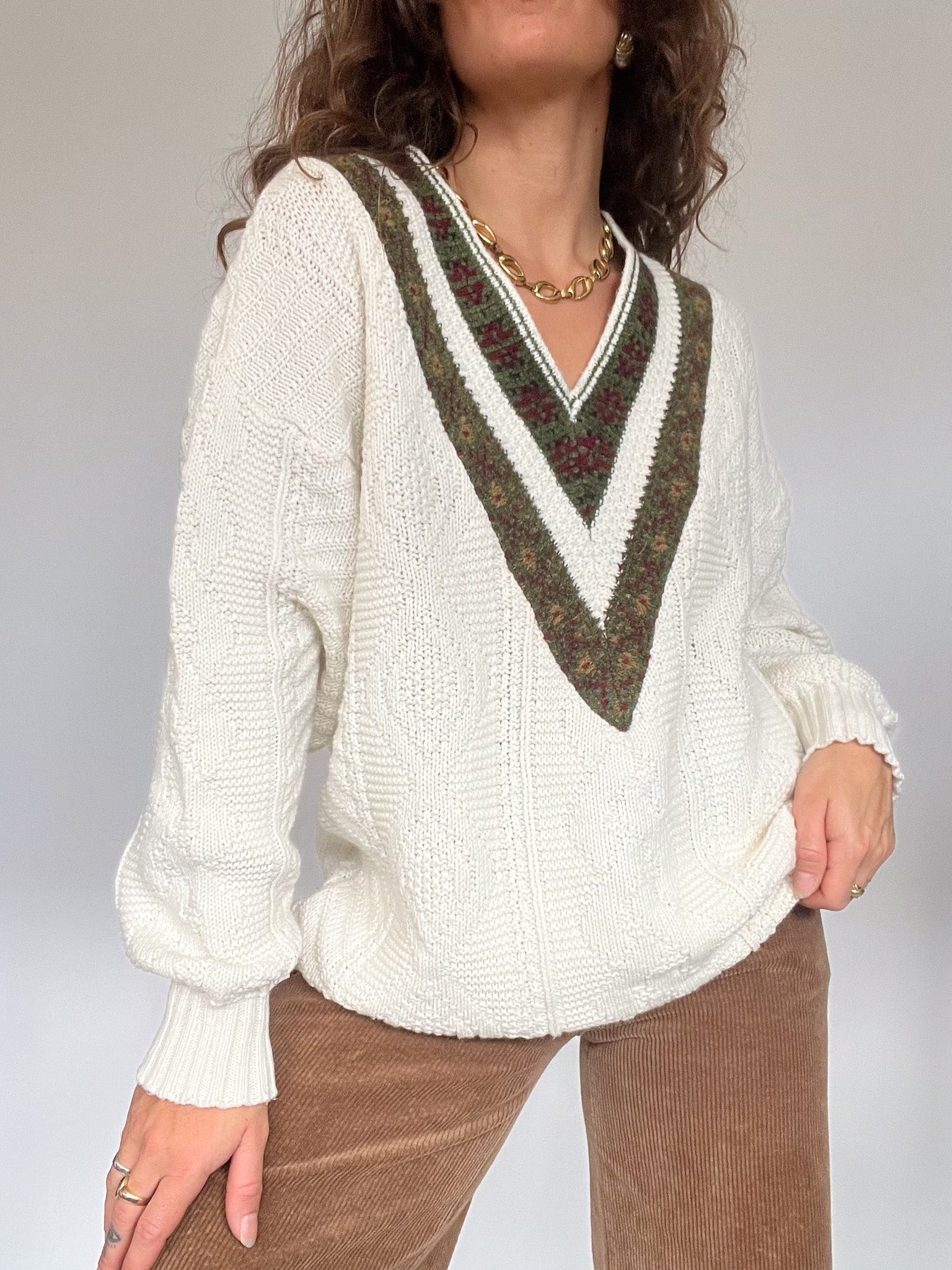 Vintage 80’s Cream Cable Knit Sweater with Embroidered V-Neck