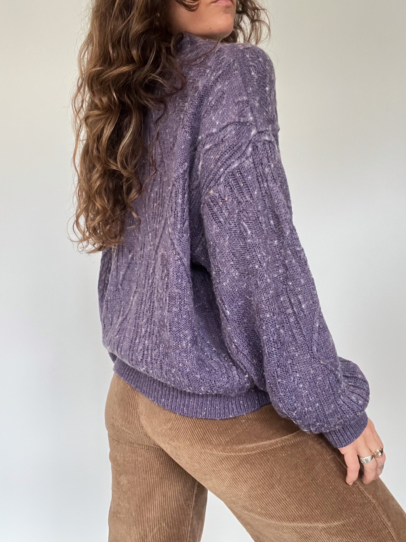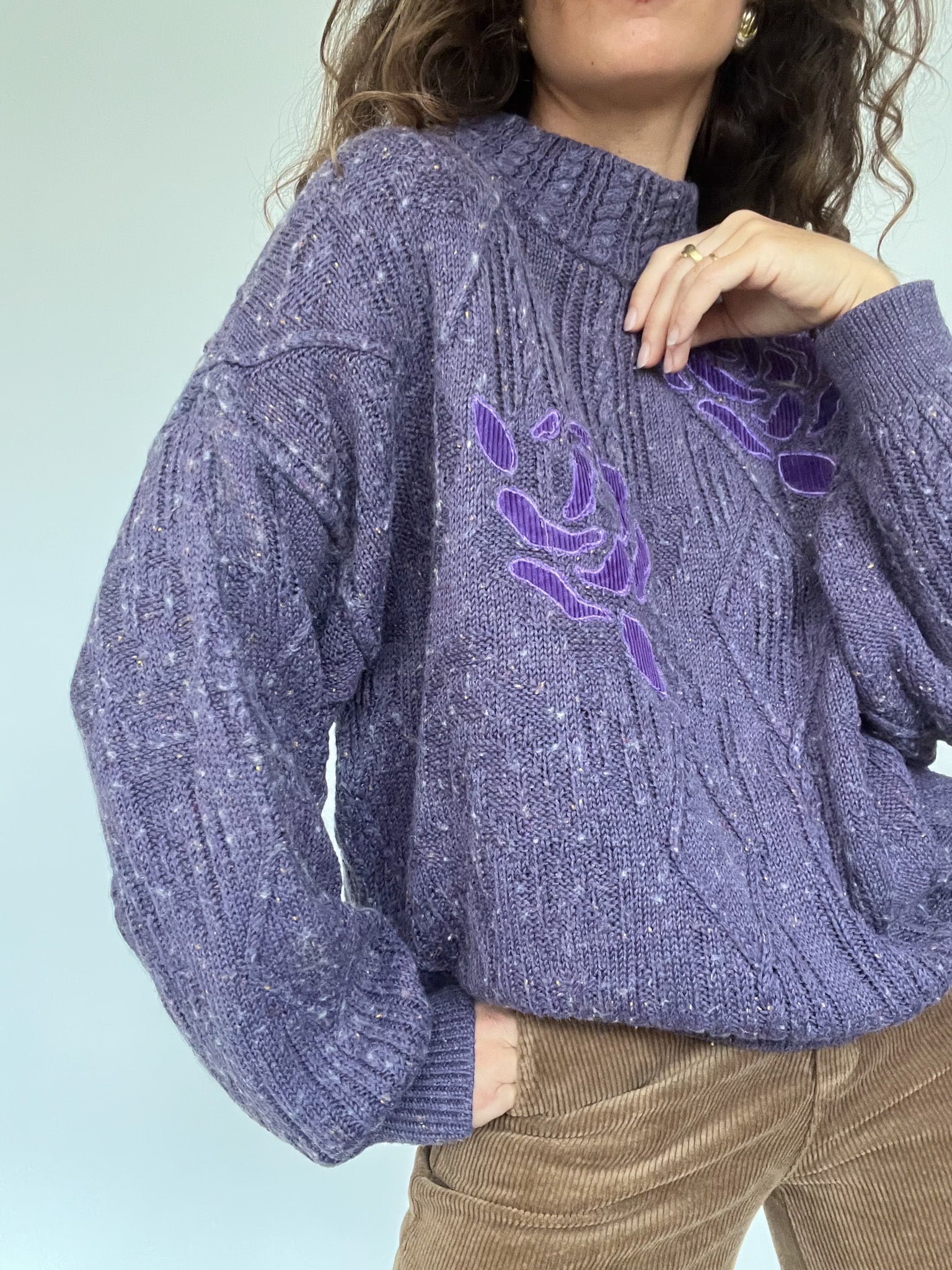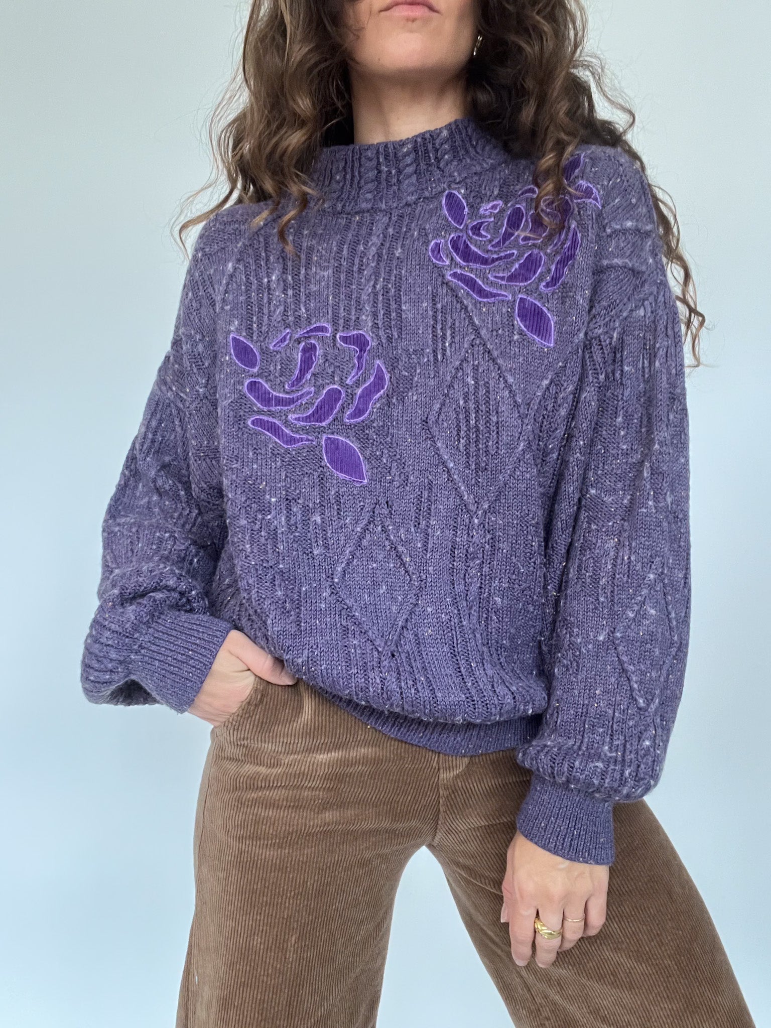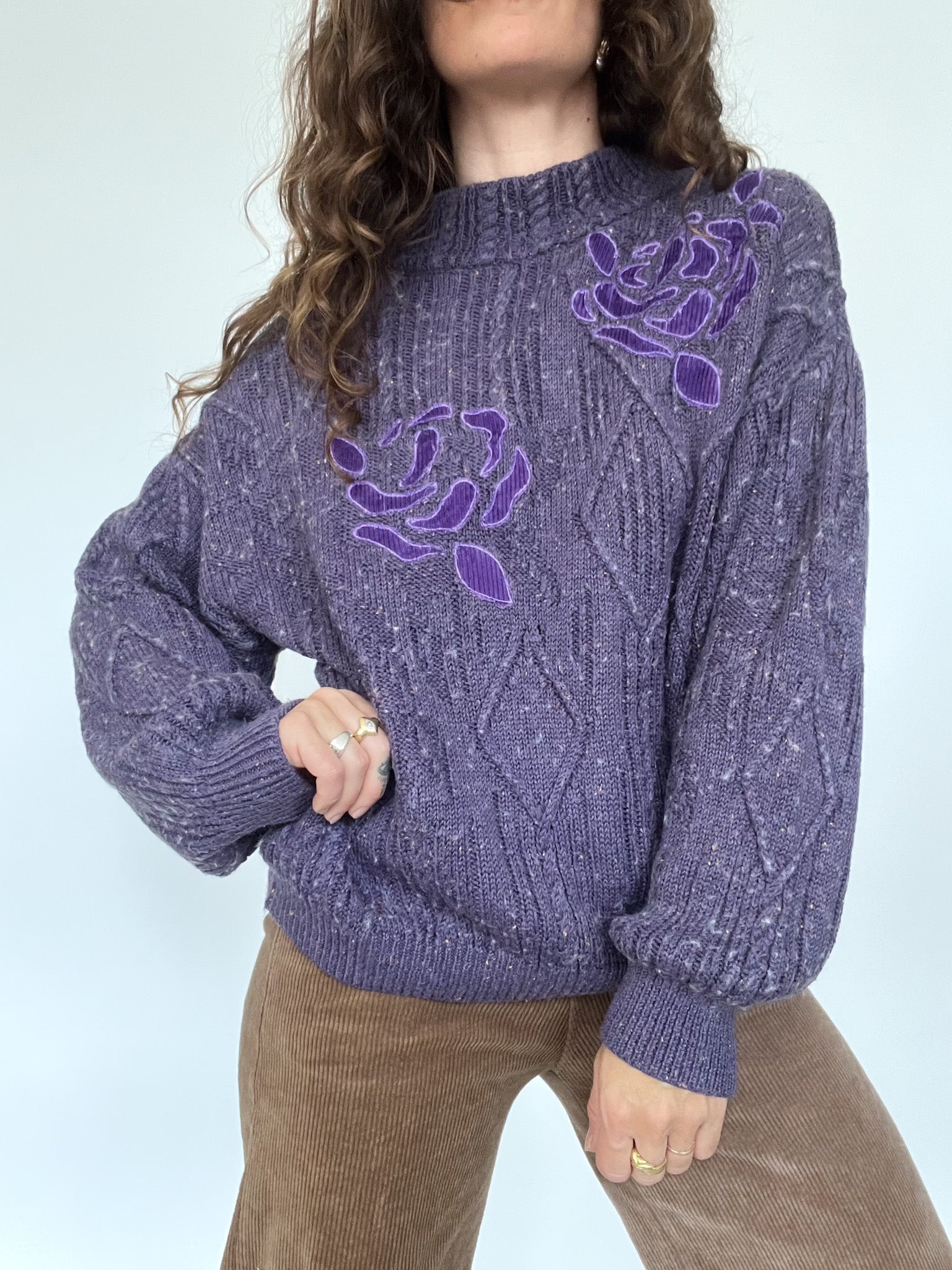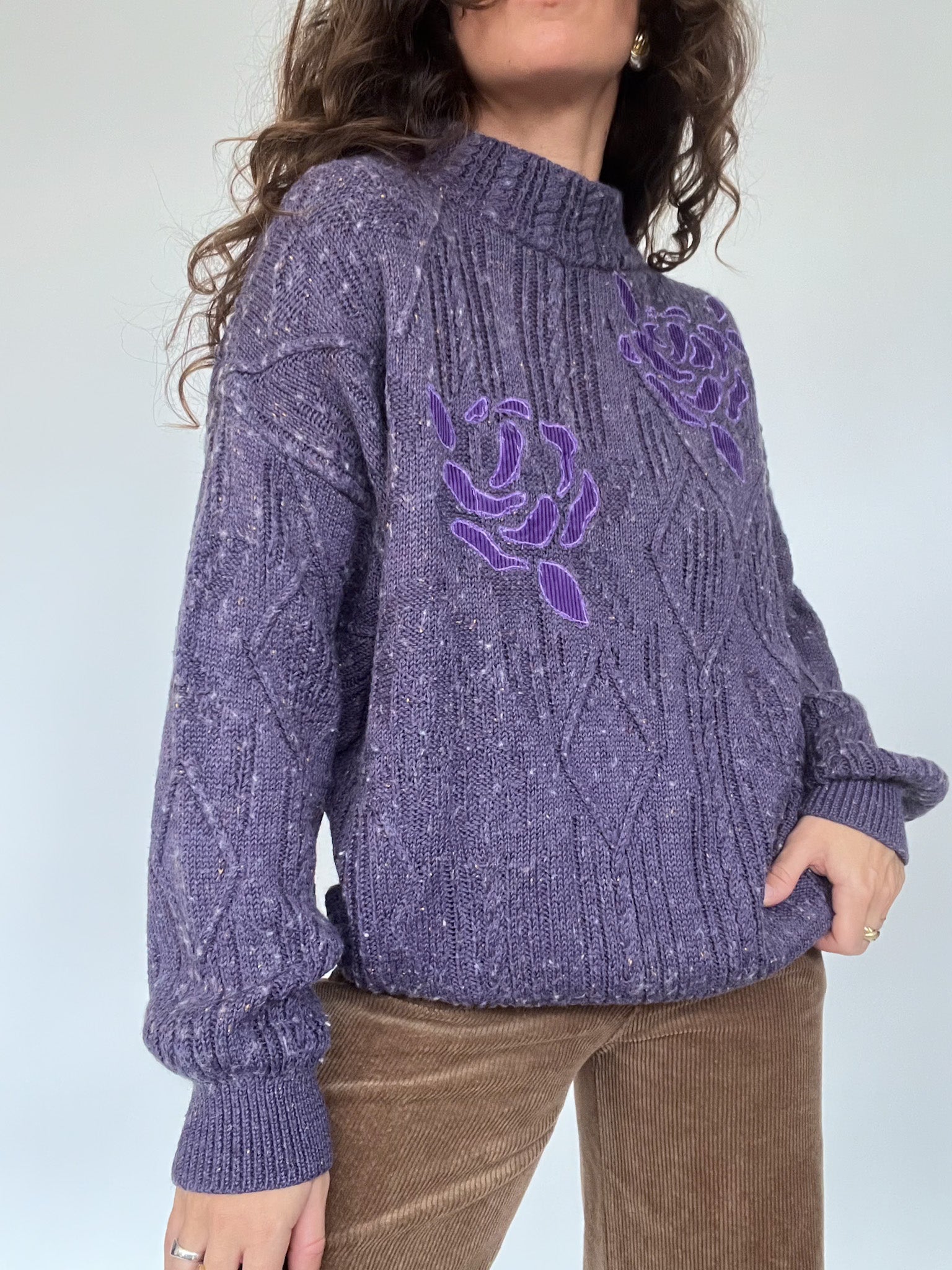 Vintage 80’s Purple Cable Knit Sweater with Floral Detail