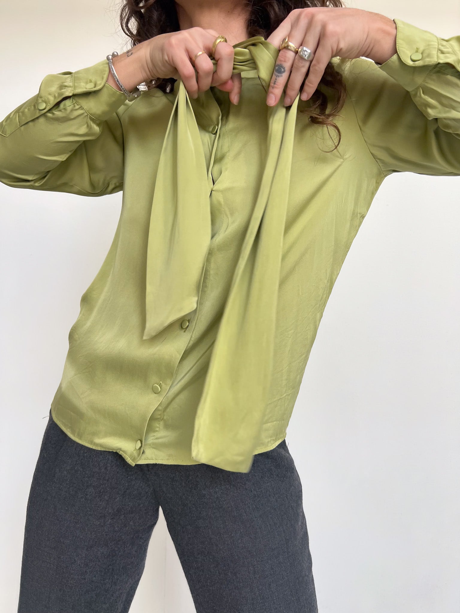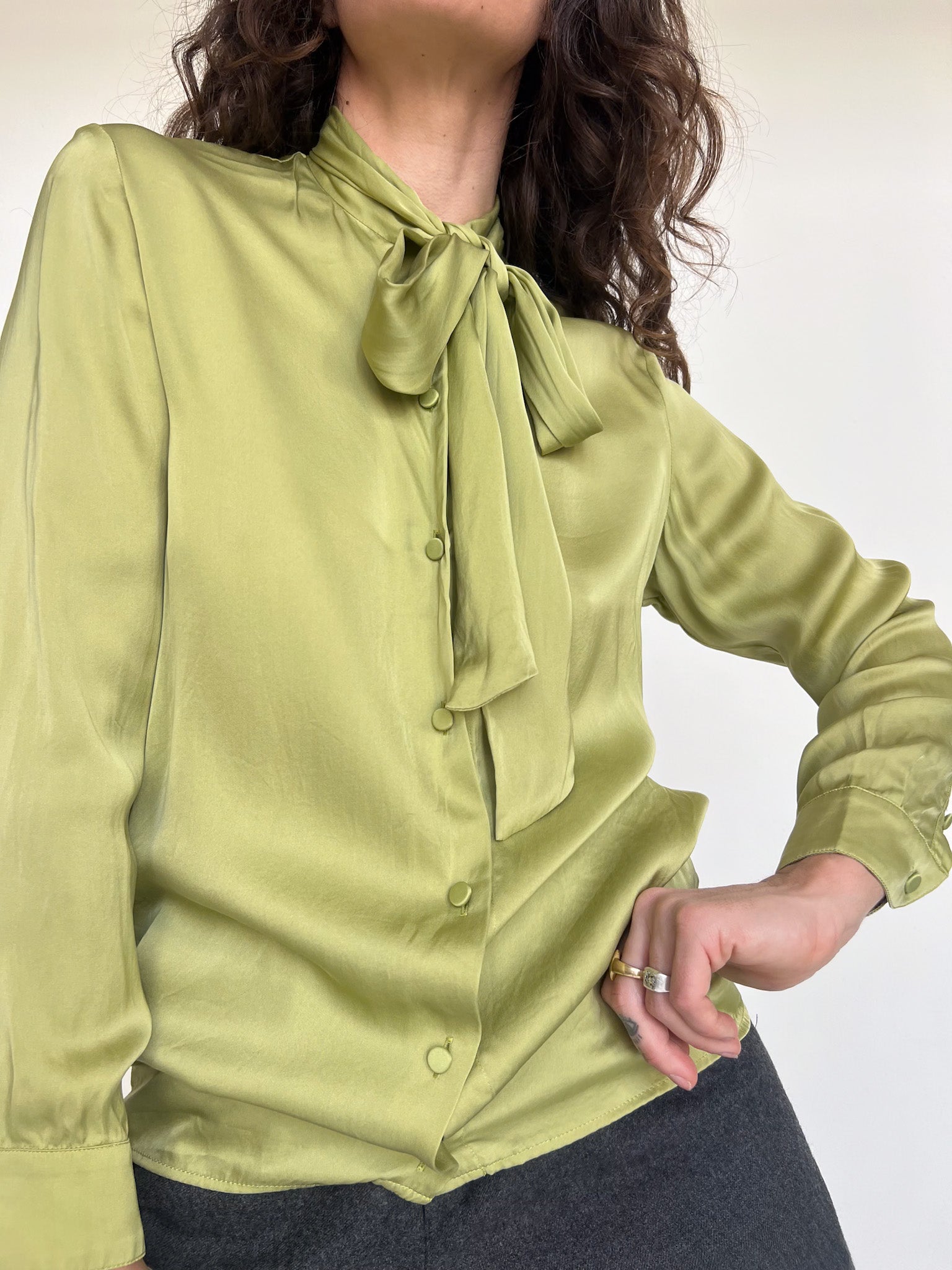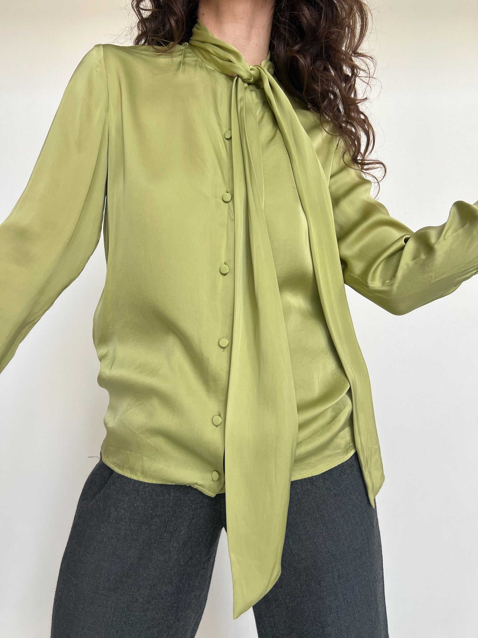 Vintage 90’s Emerald Green Pleated Blouse with Bow Tie Collar