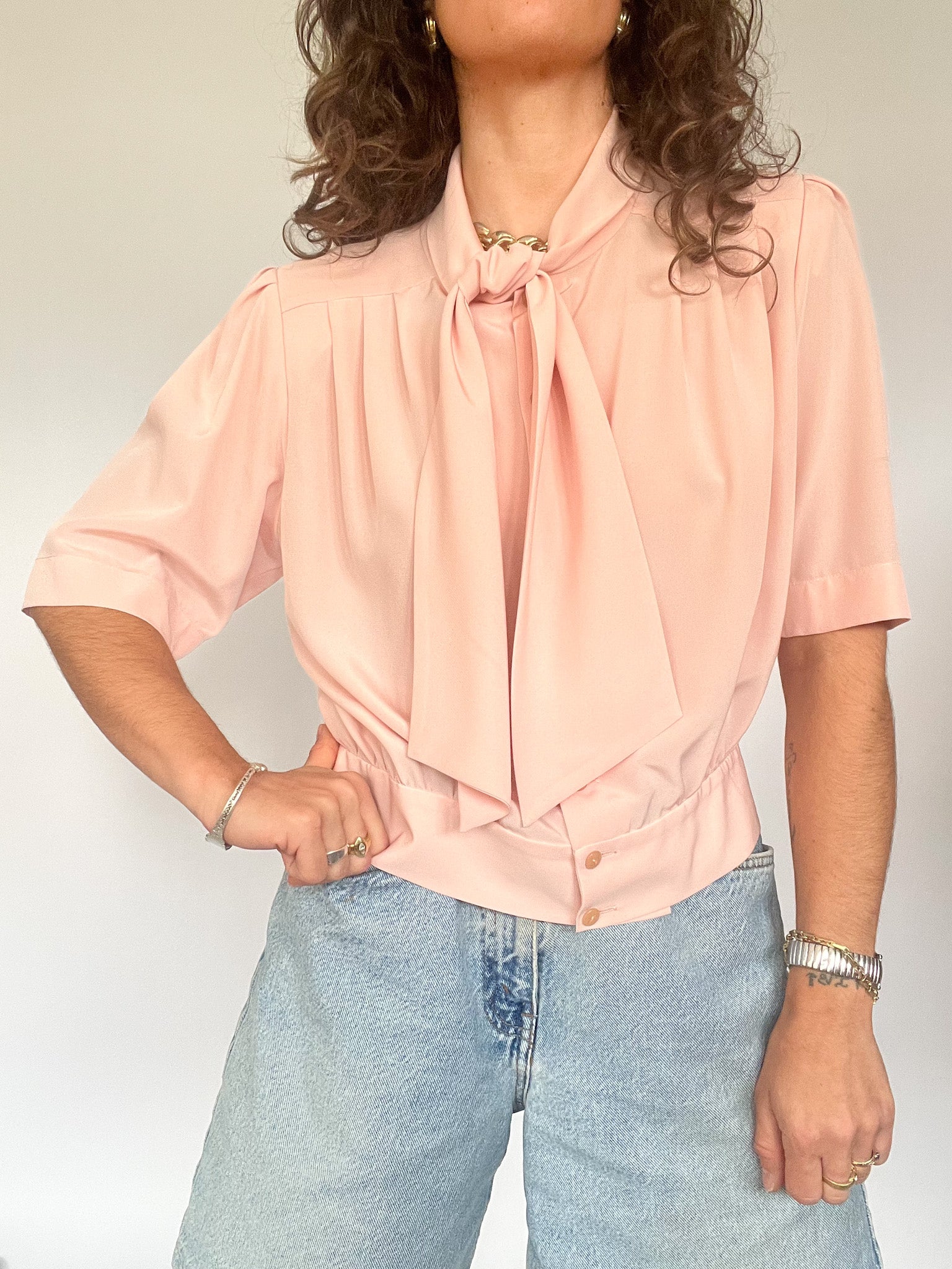 Soft, structured, and unapologetically feminine. This vintage blouse in a luminous pale pink hue features a dramatic tie-neck bow and a sculpted waistband that instantly defines the silhouette. With its short gathered sleeves and slight sheen, it evokes the polished elegance of 80’s power dressing, softened by romantic detailing. Whether worn loose or with the bow tied into a bold statement, it’s a piece that commands quiet attention—empowering, unique, and timeless, just like every woman Skorpiones Vintage dresses.
