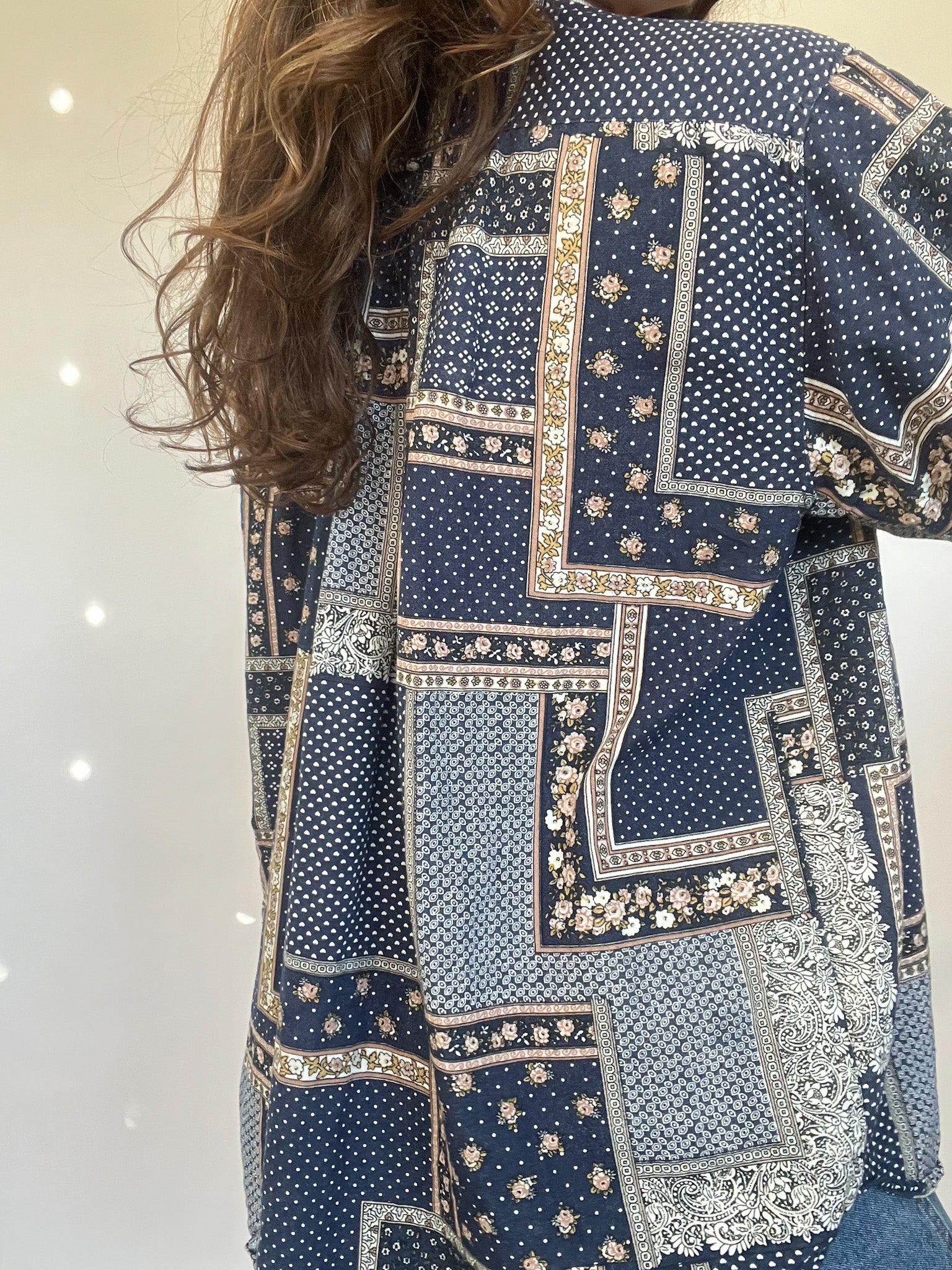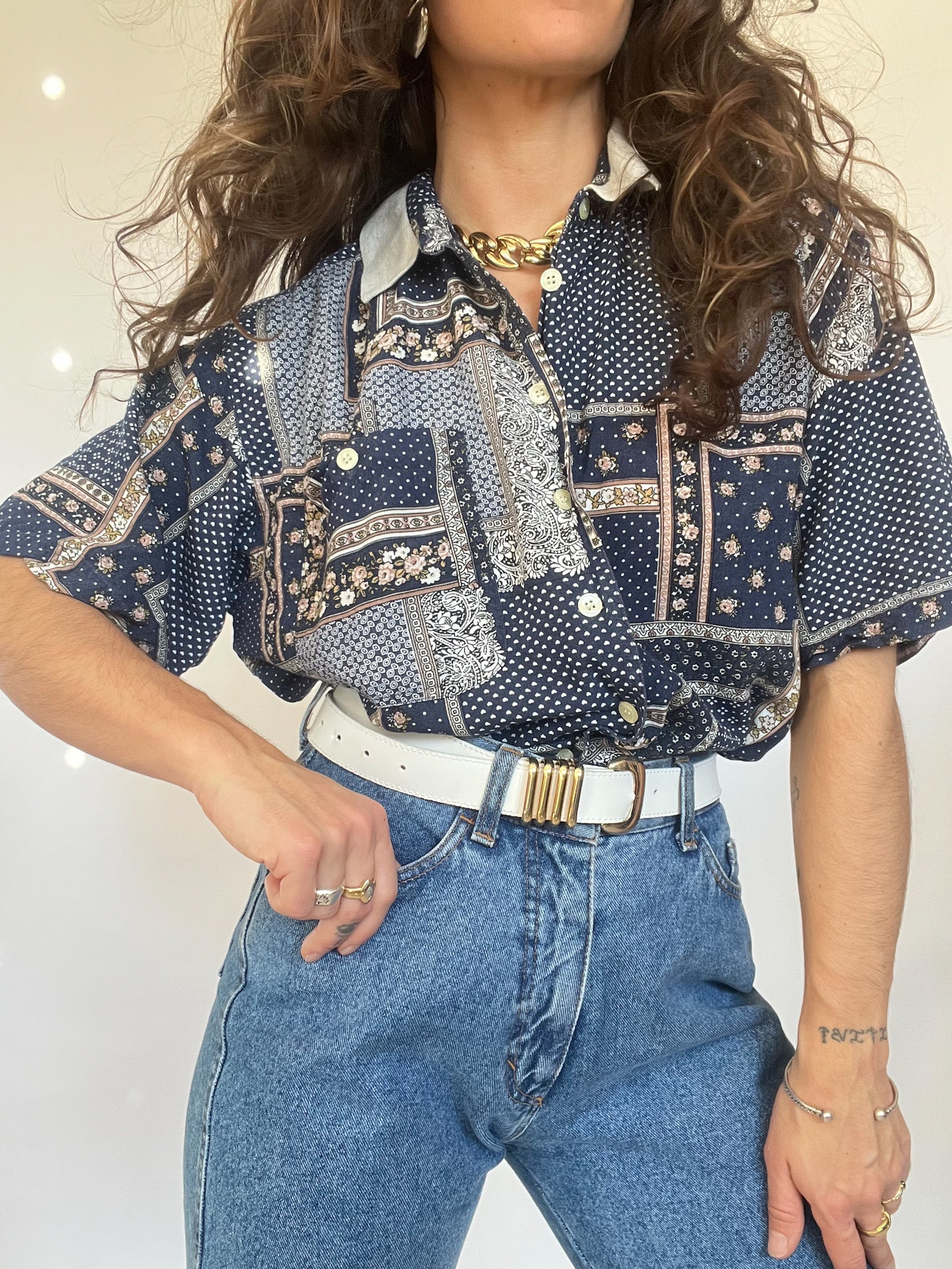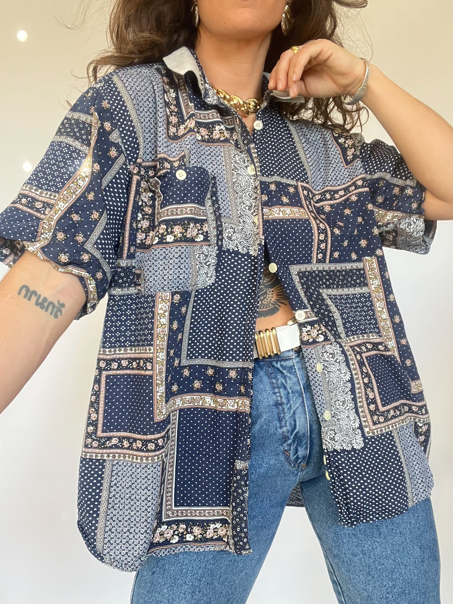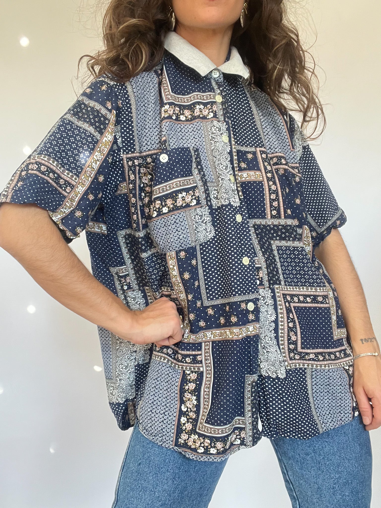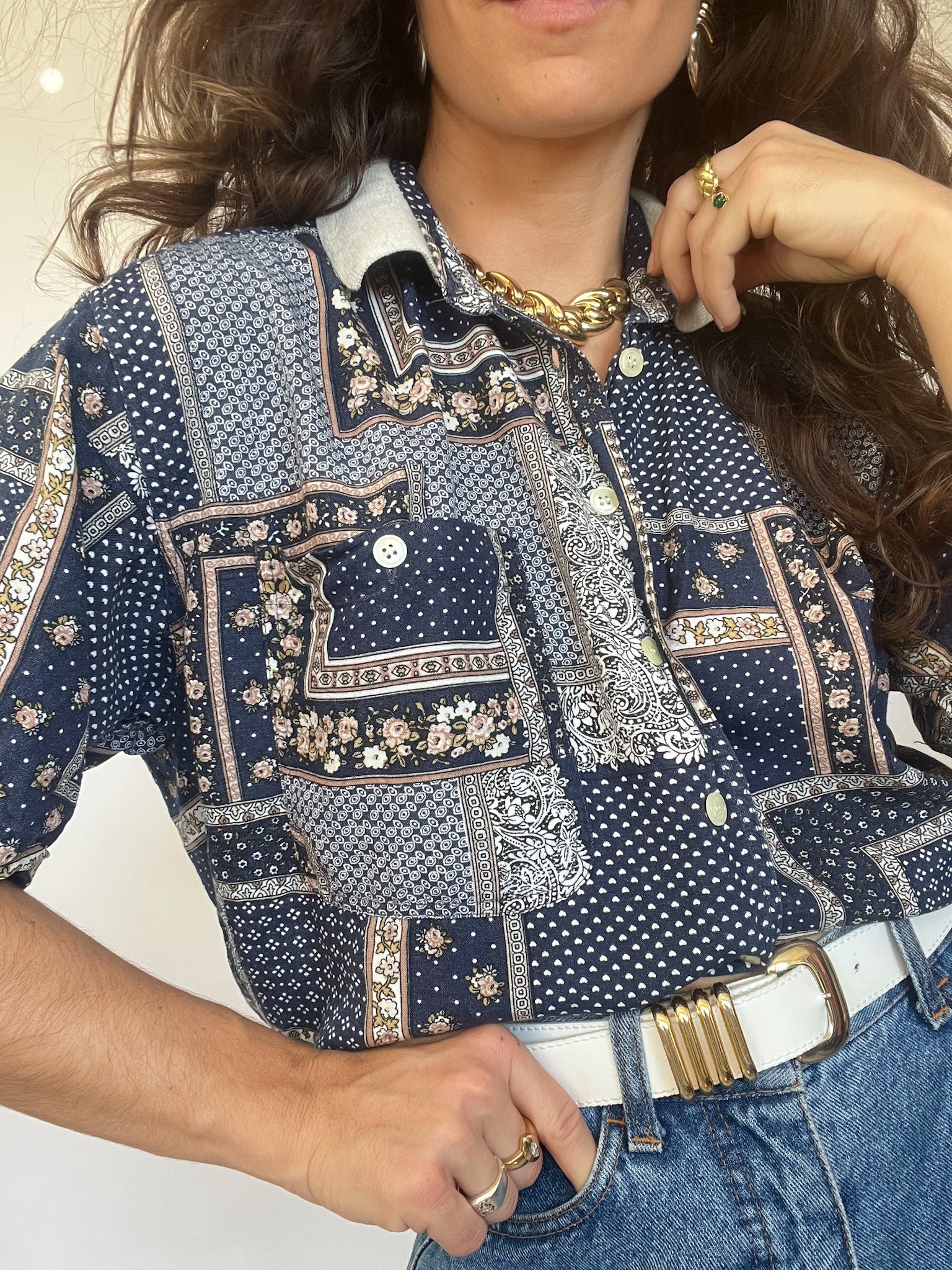 Vintage Navy Patchwork Shirt with Graphic Collar