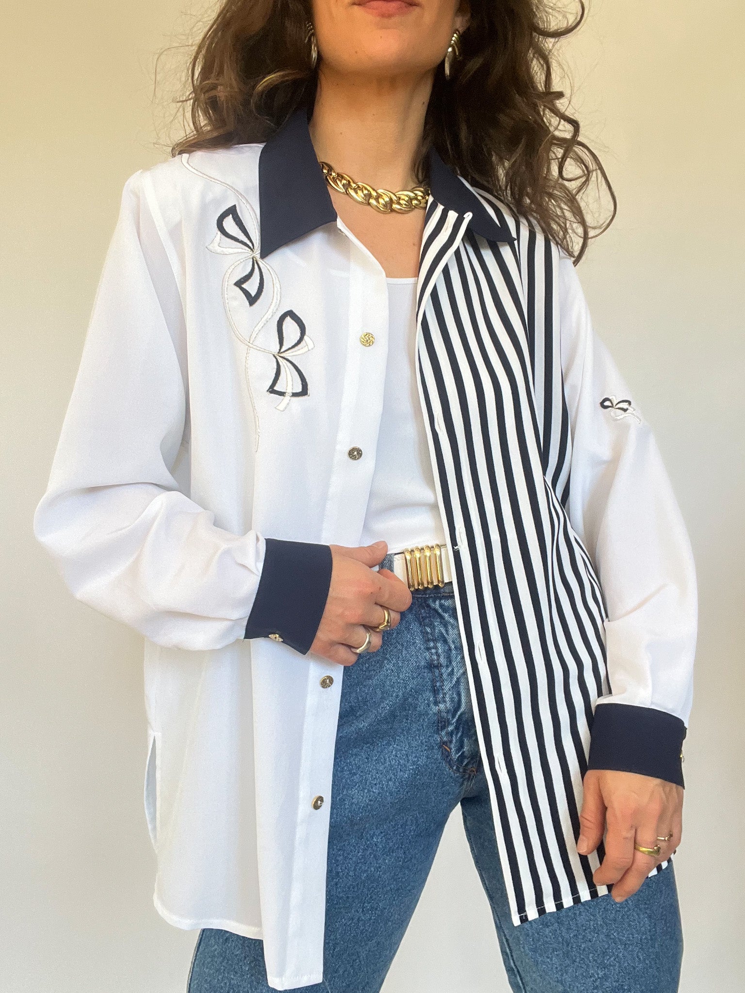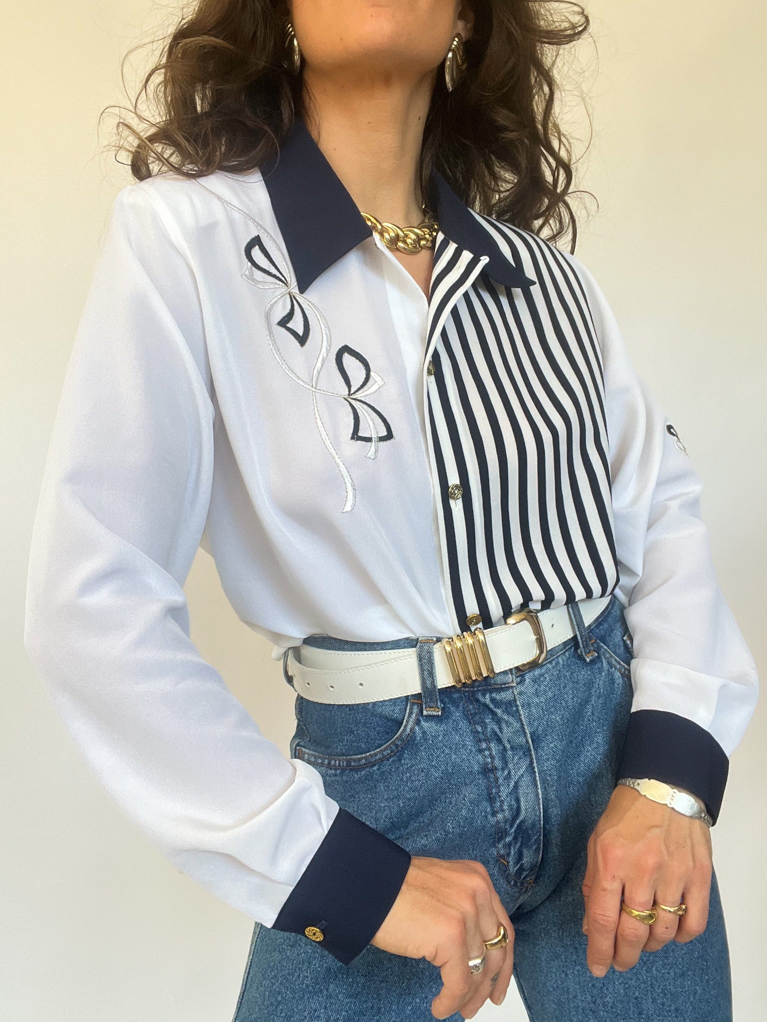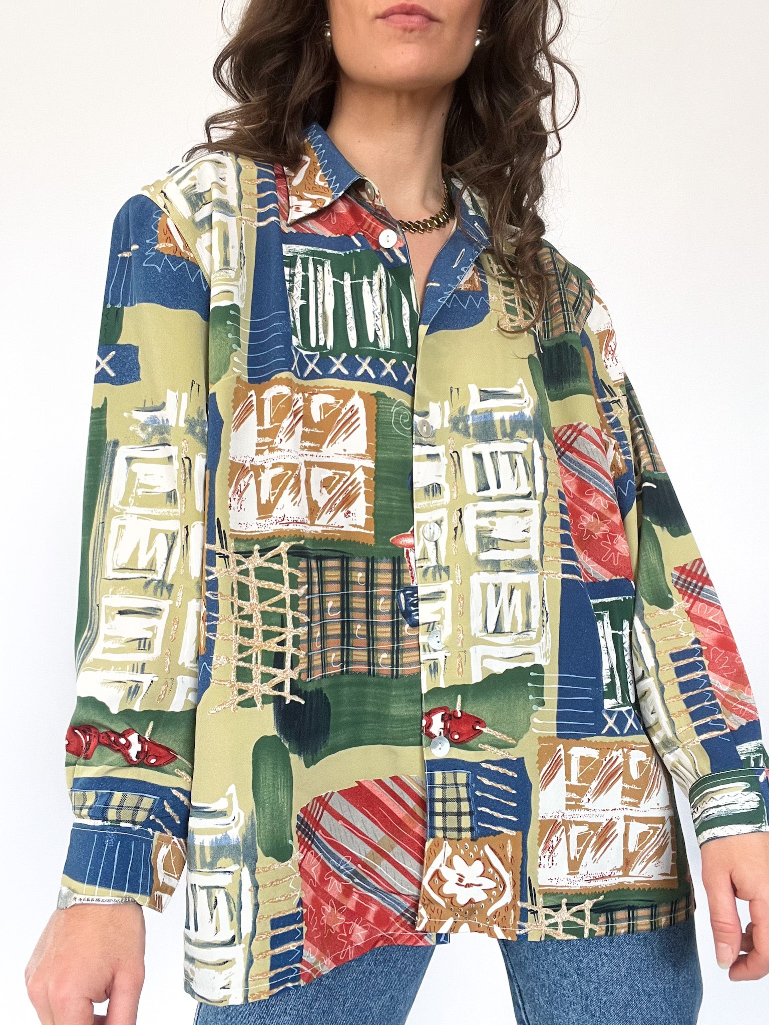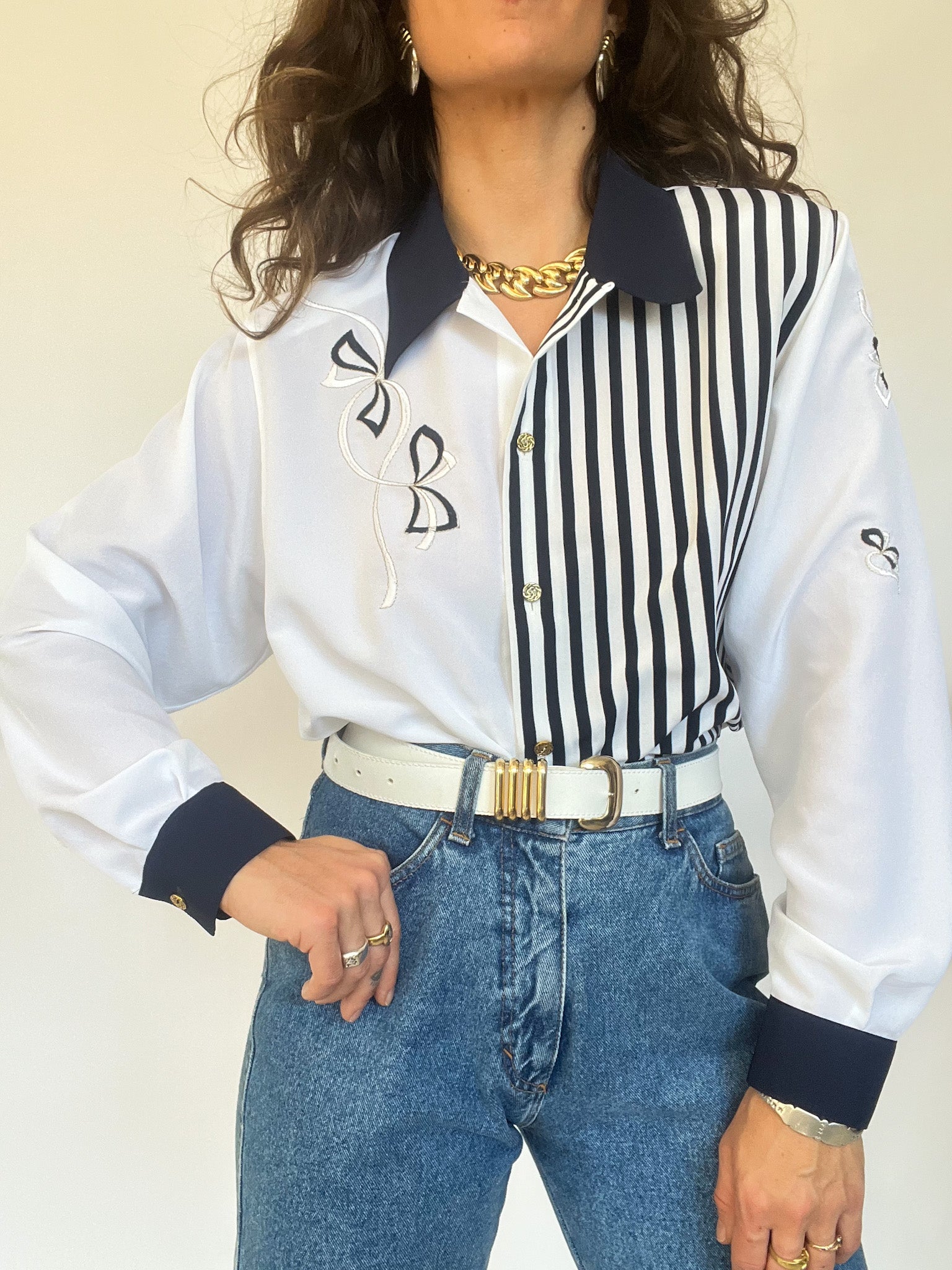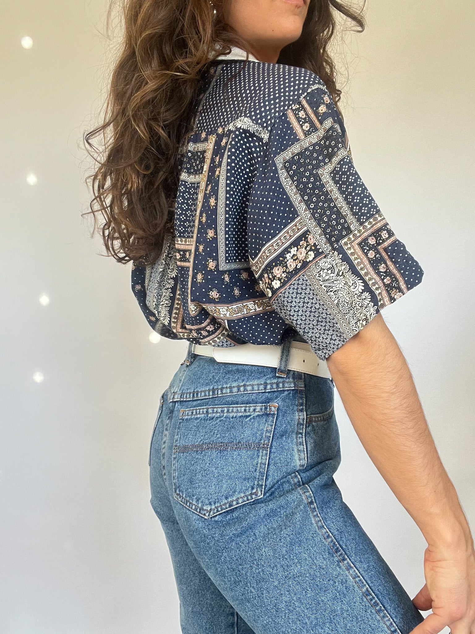 Vintage Navy Patchwork Shirt with Graphic Collar