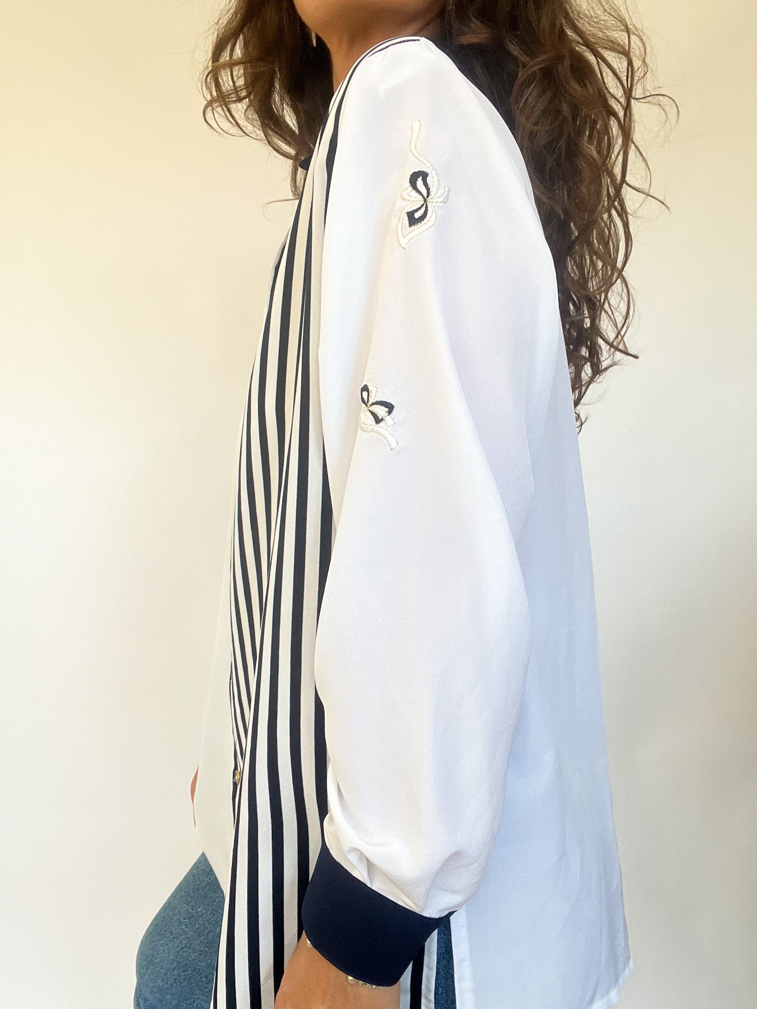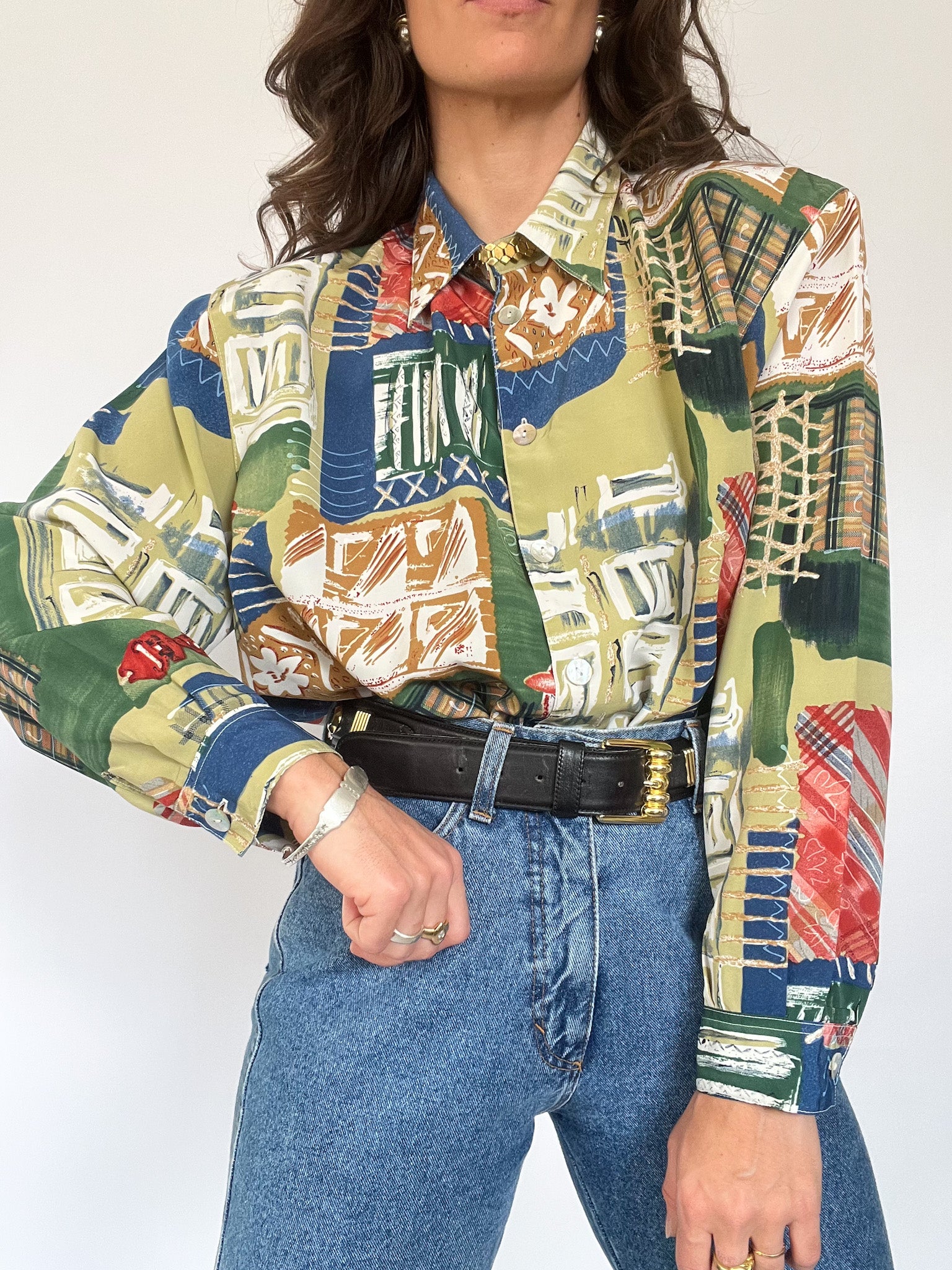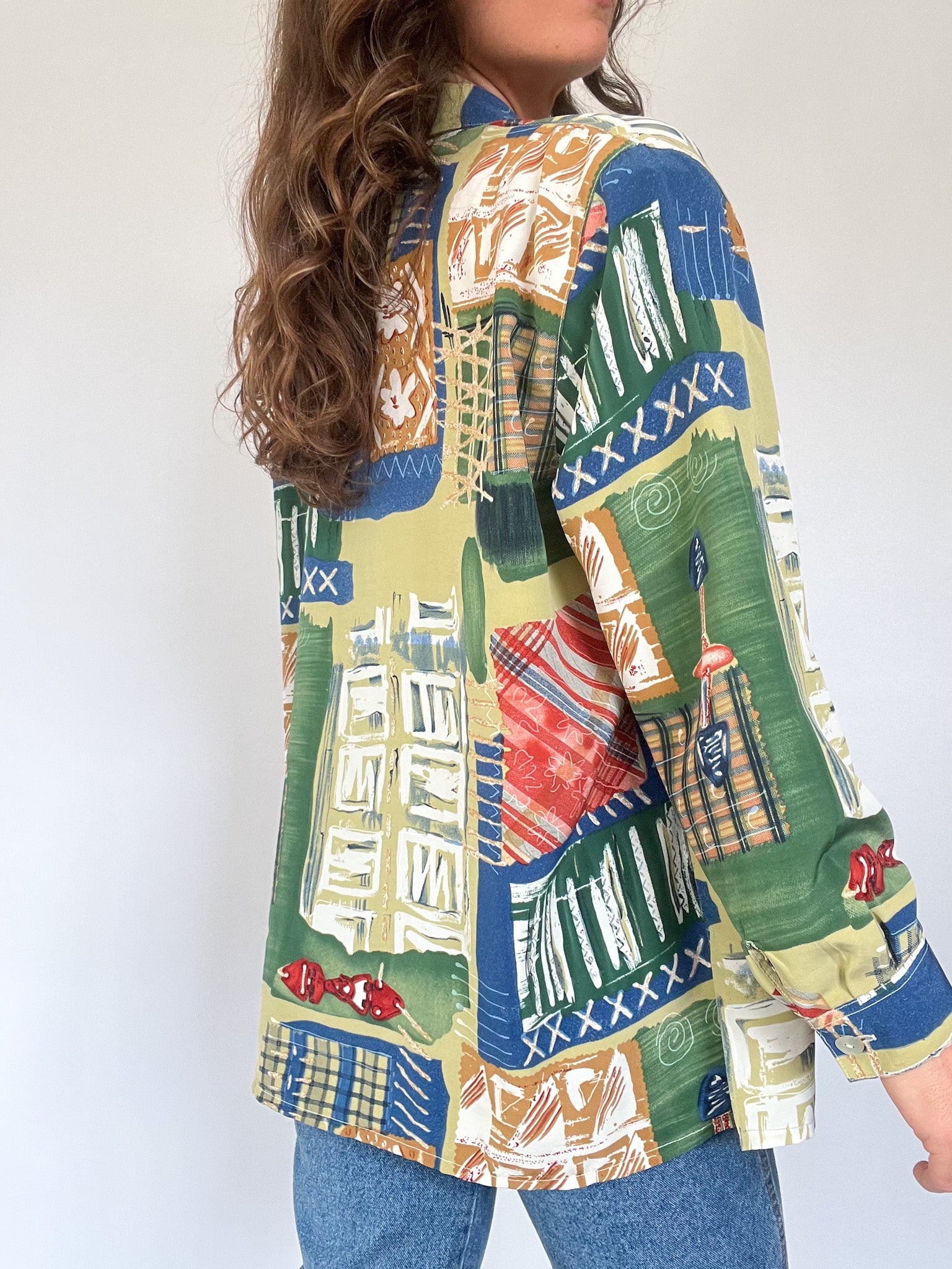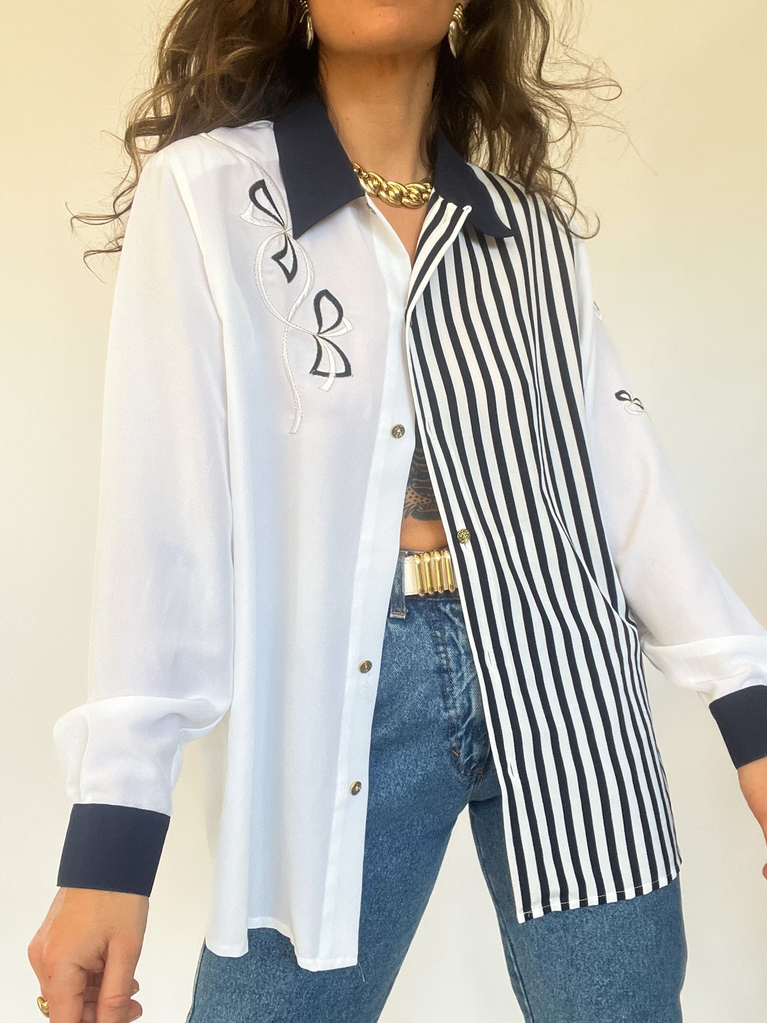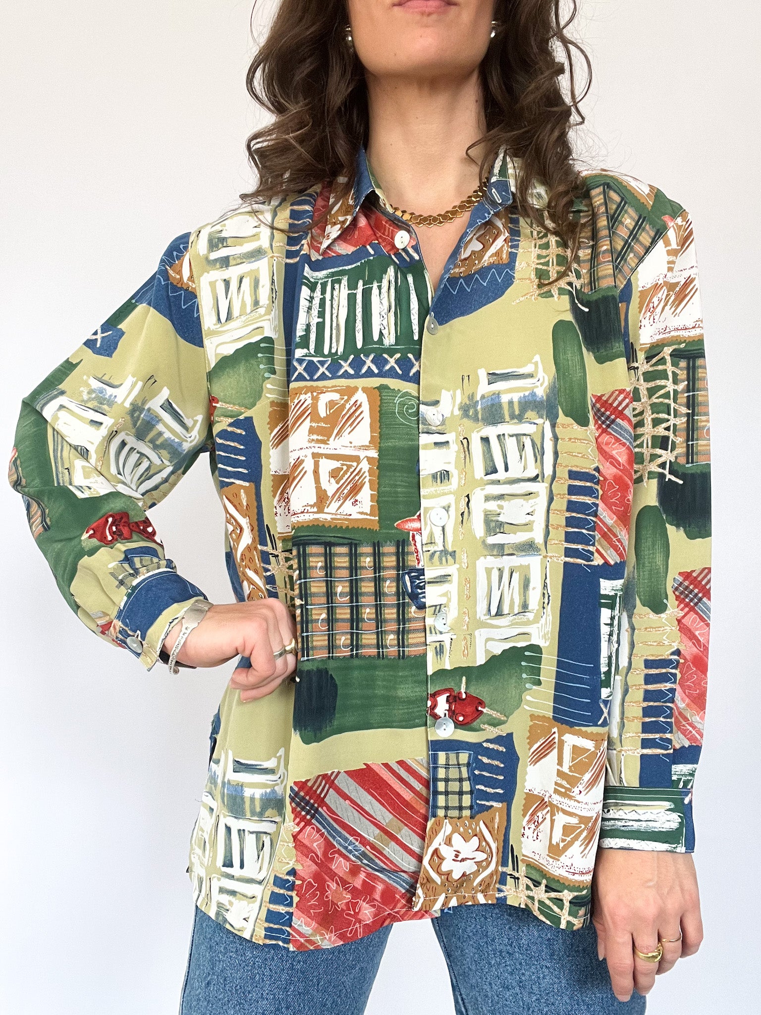 Vintage Navy Patchwork Shirt with Graphic Collar