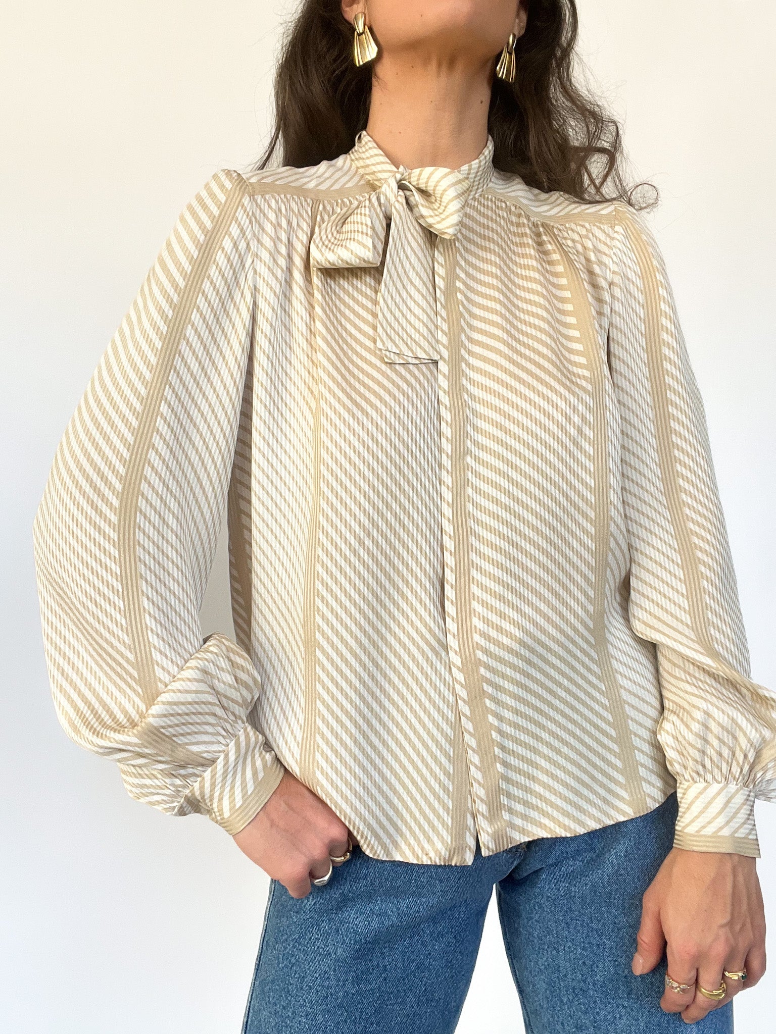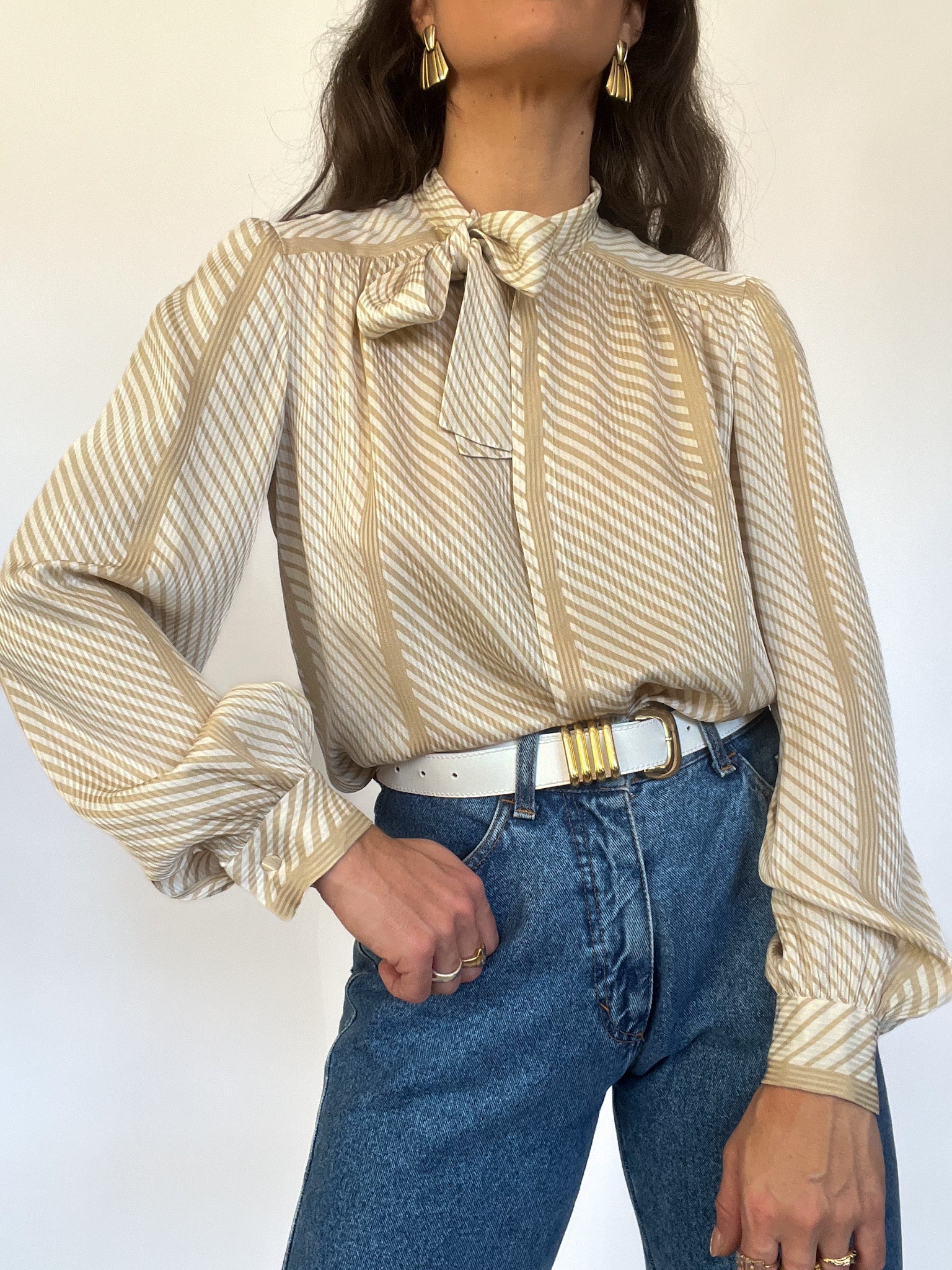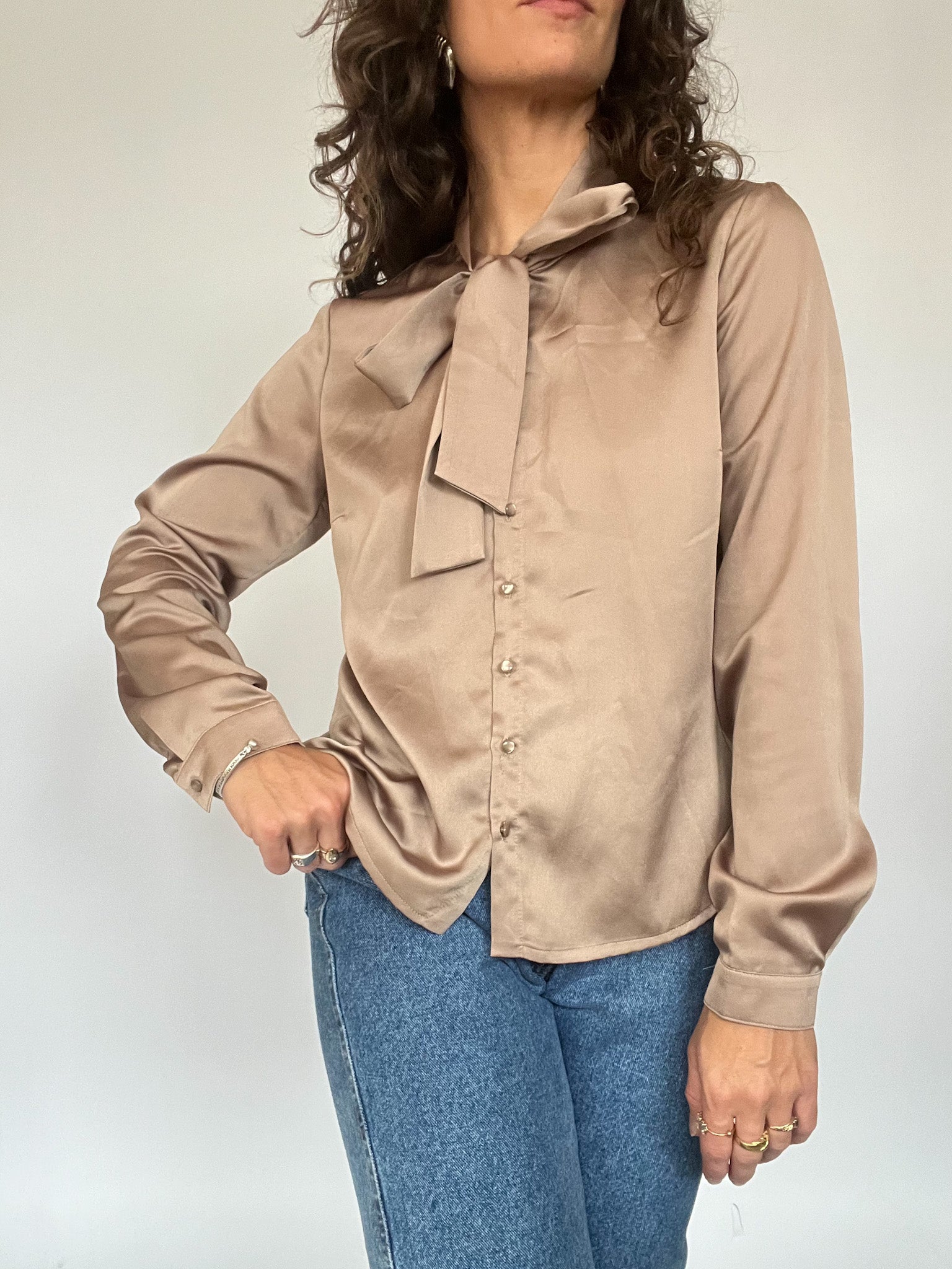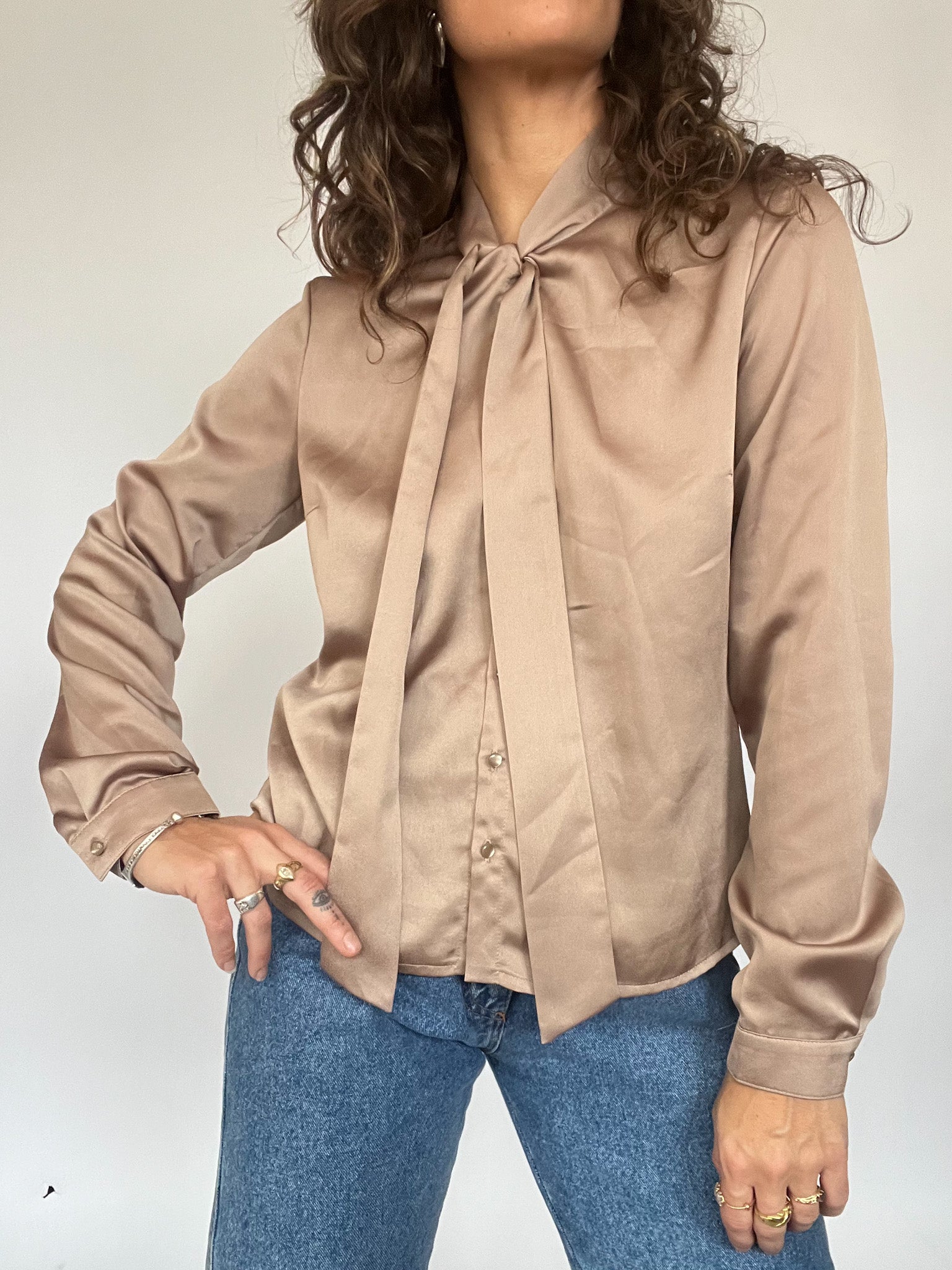 Vintage Taupe Silk Blouse with Bow Tie Detail