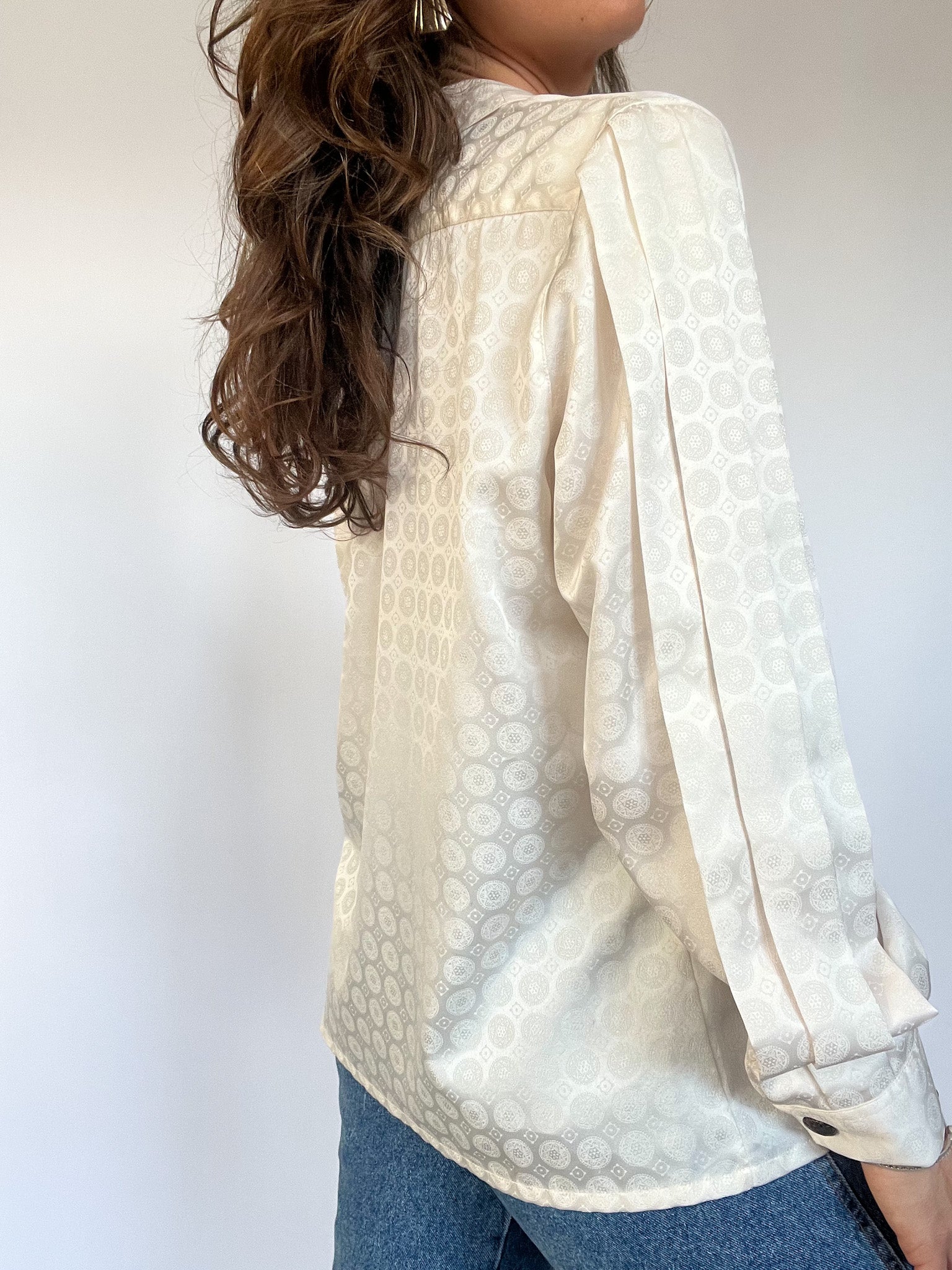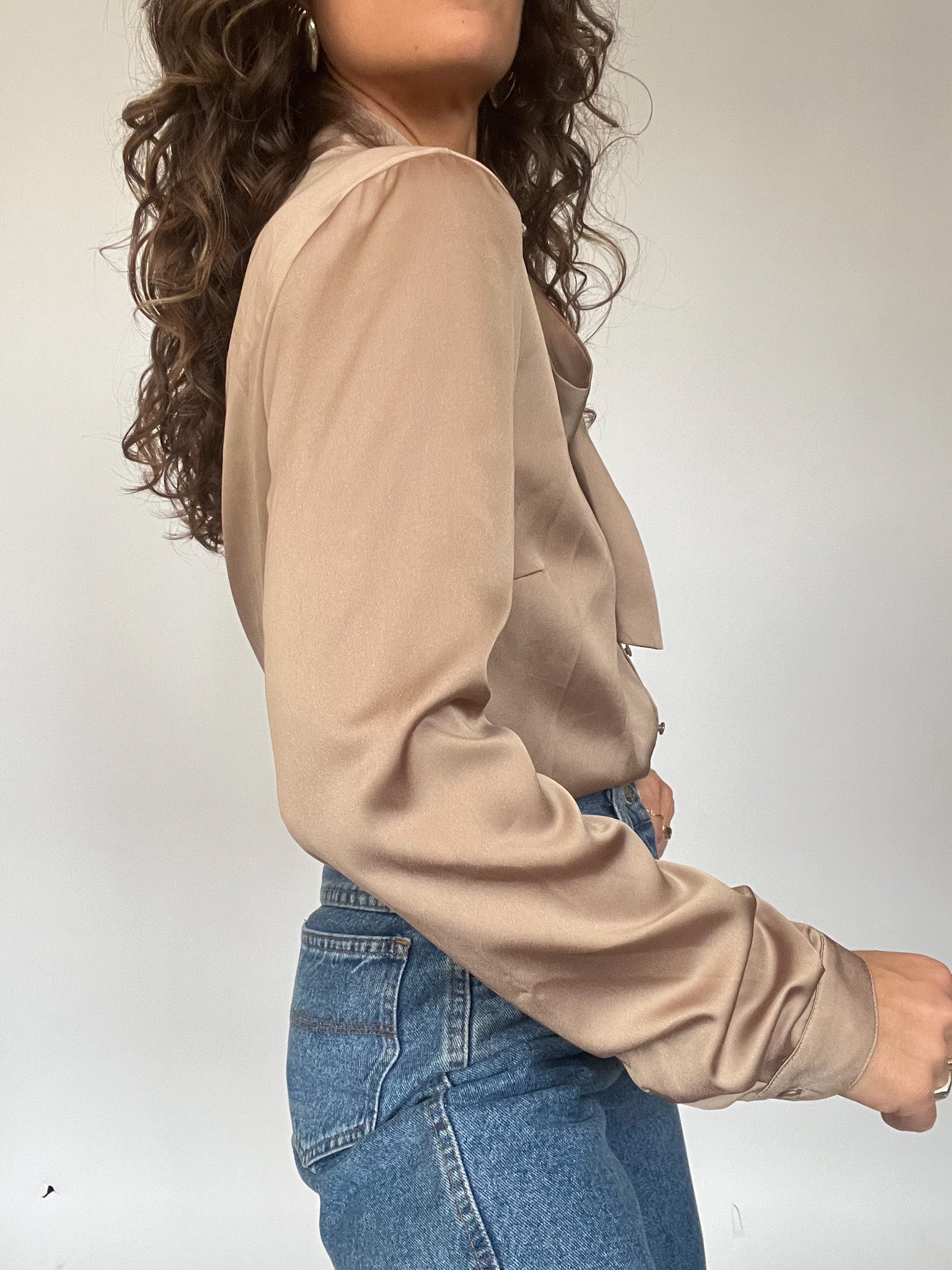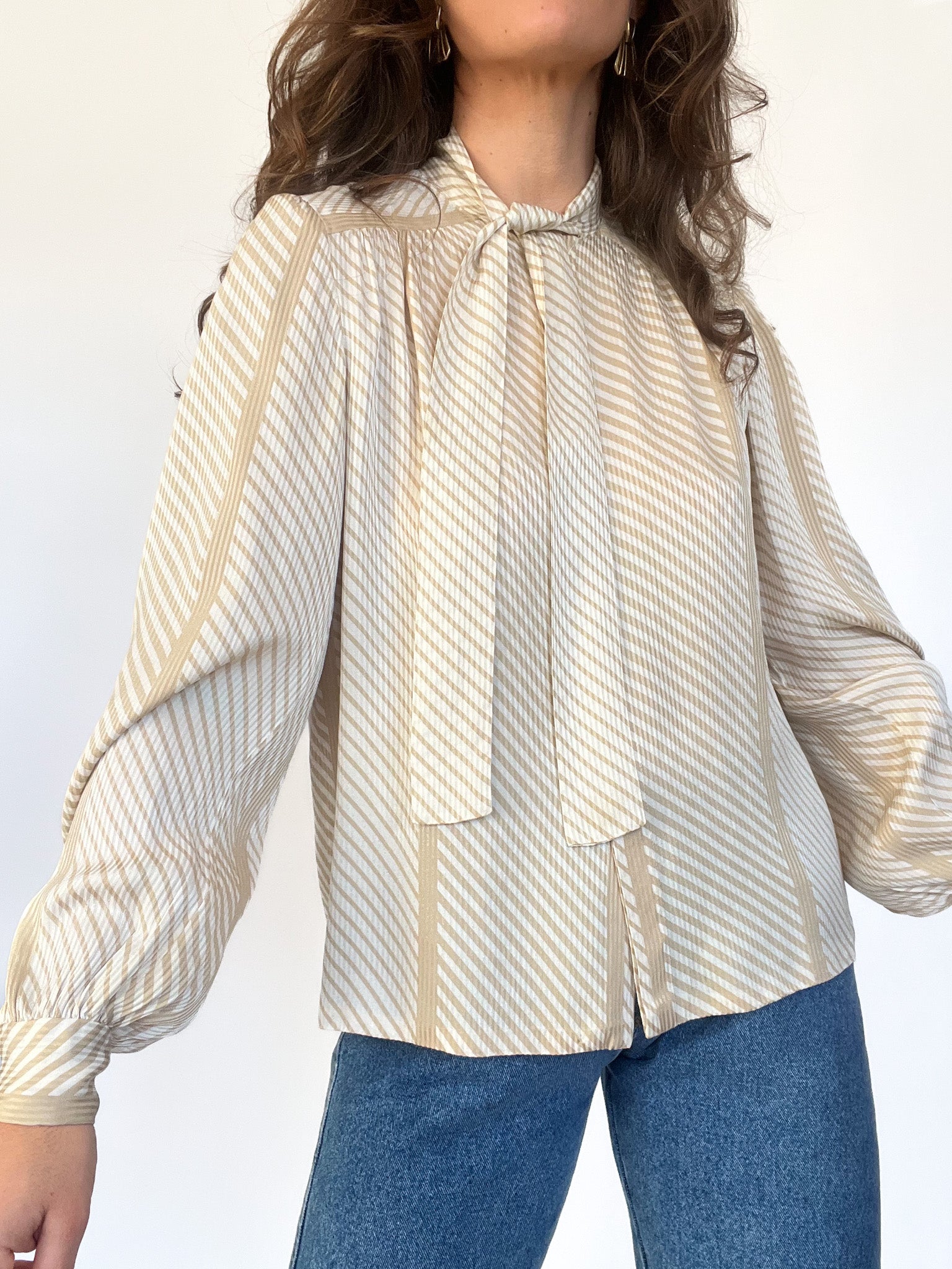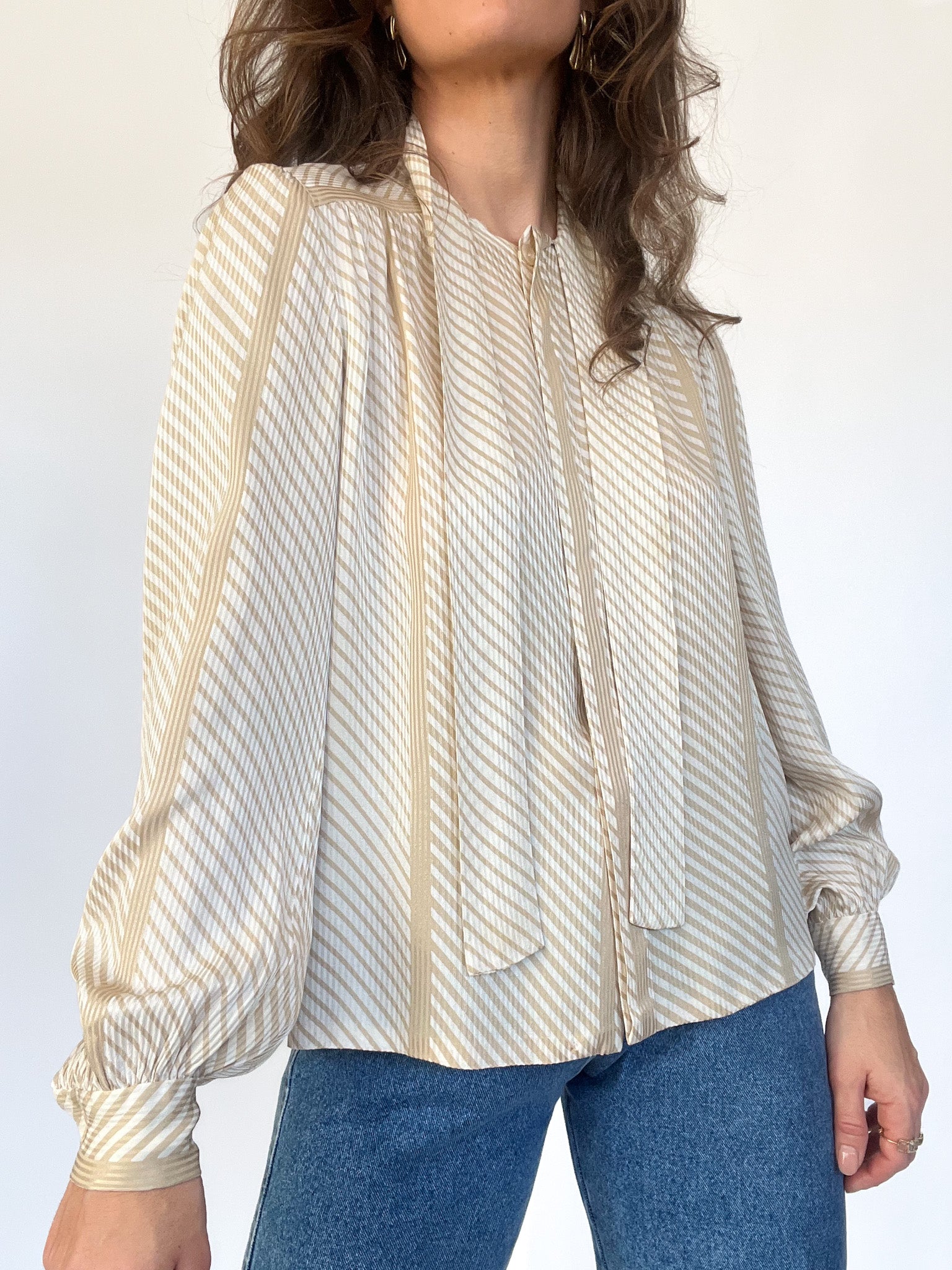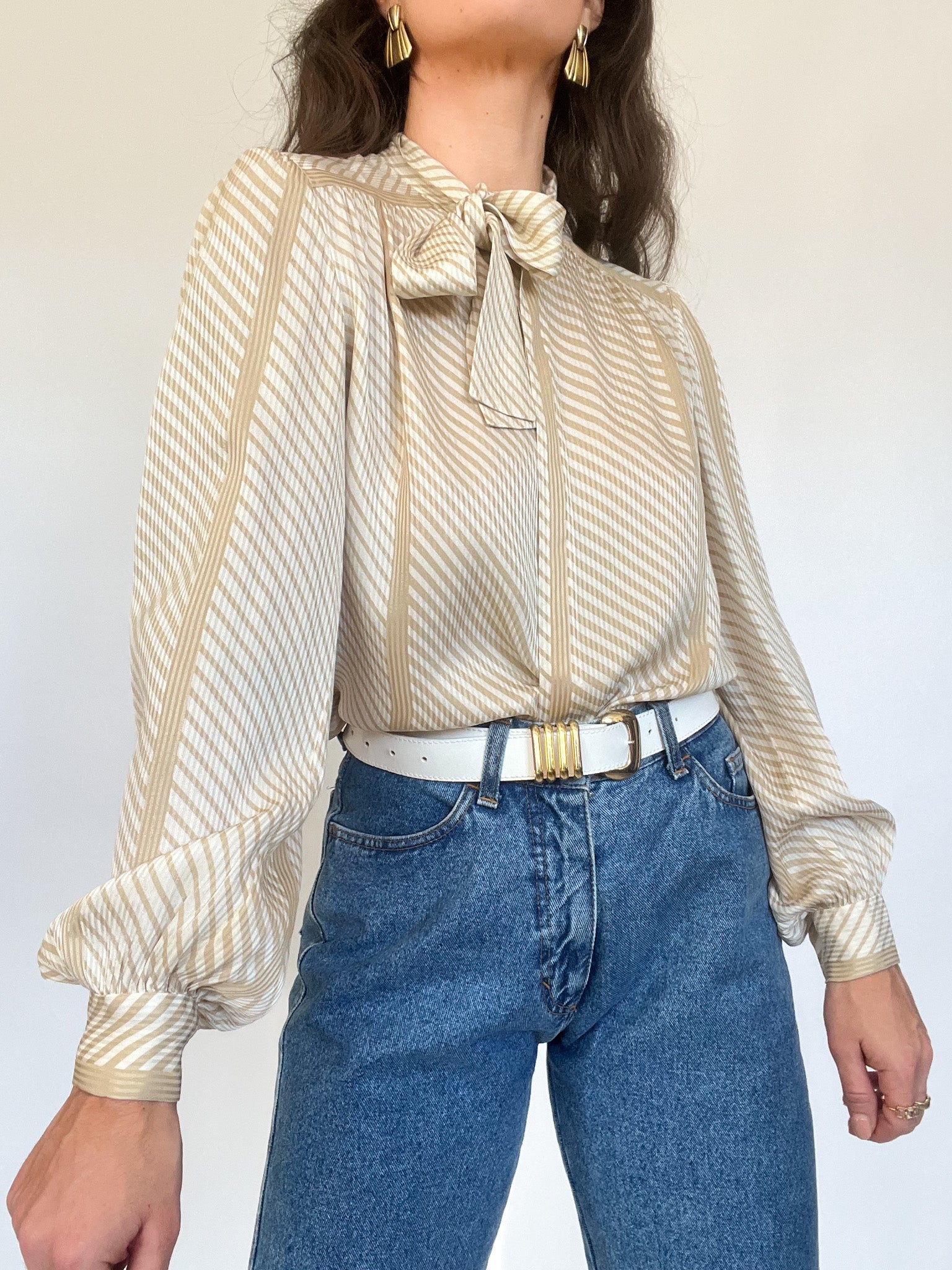 Vintage Taupe Silk Blouse with Bow Tie Detail