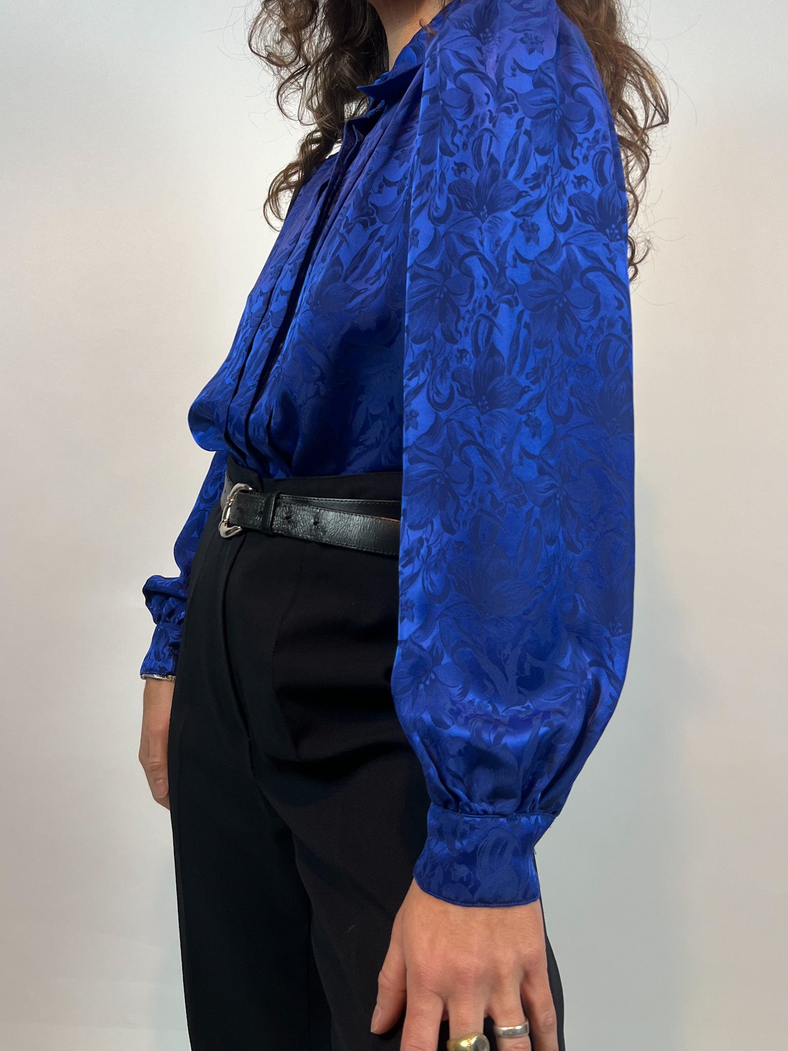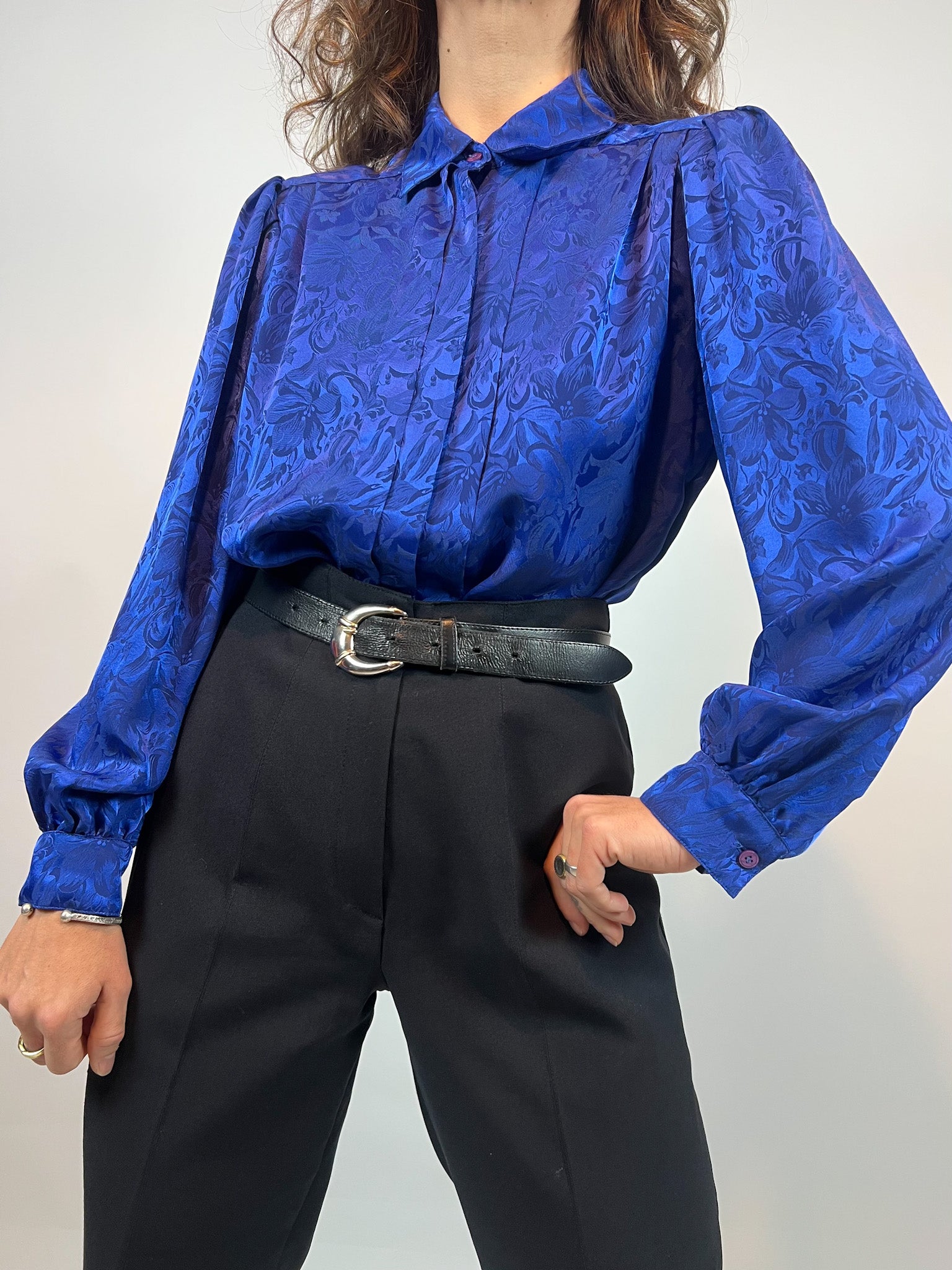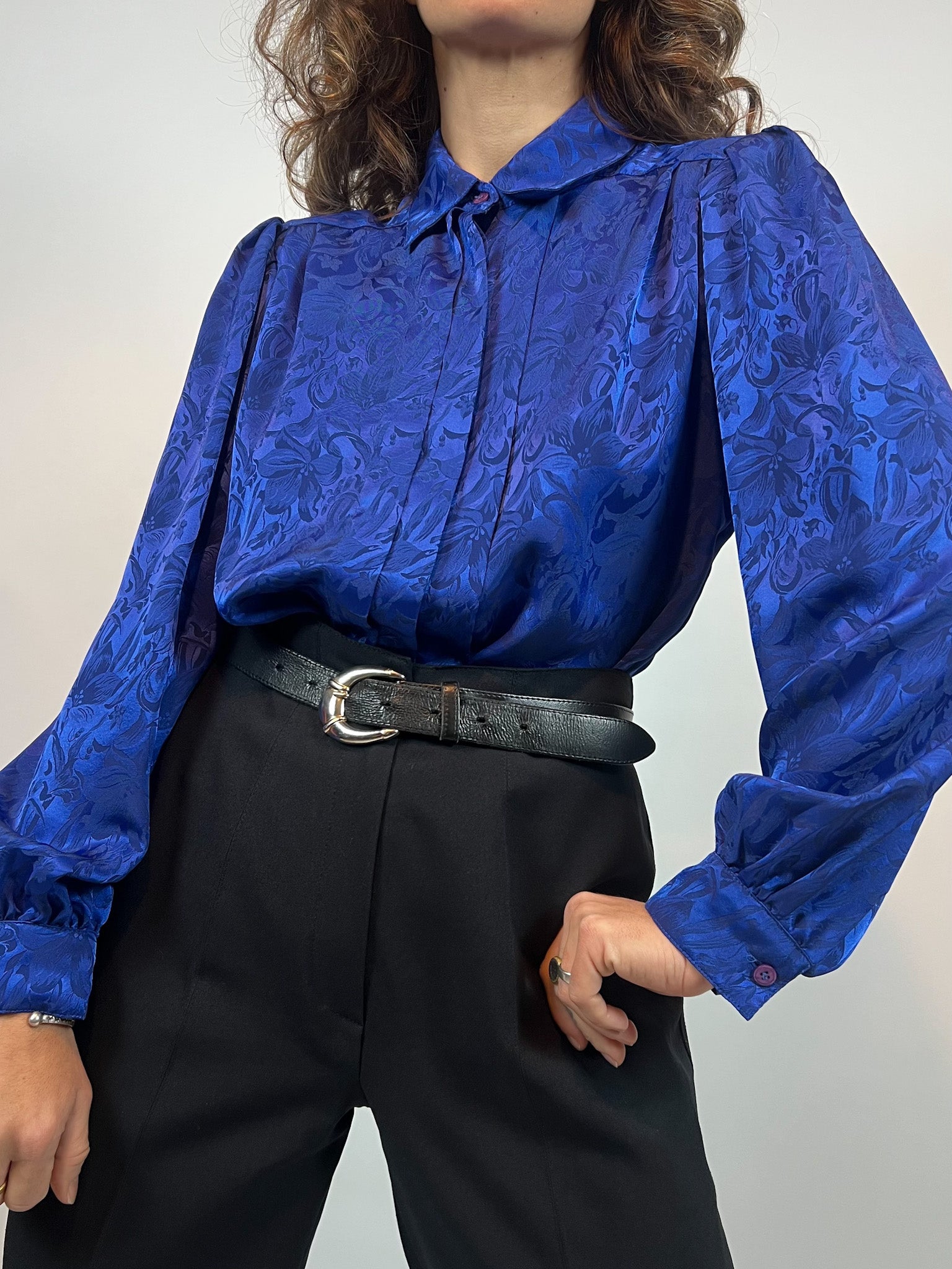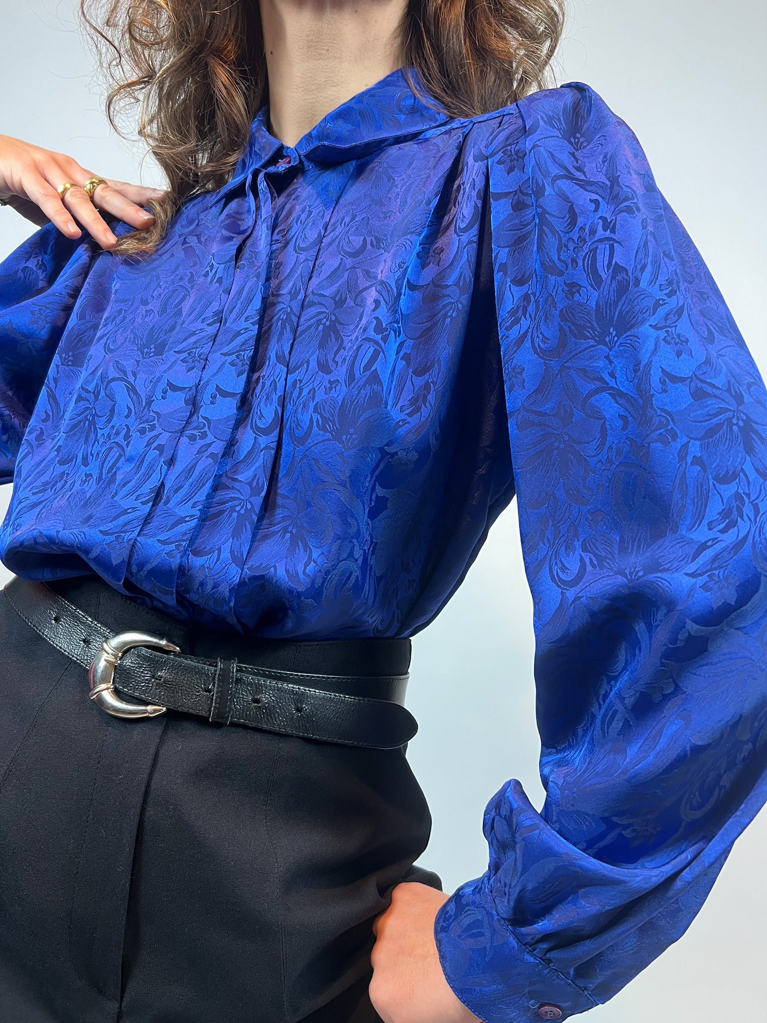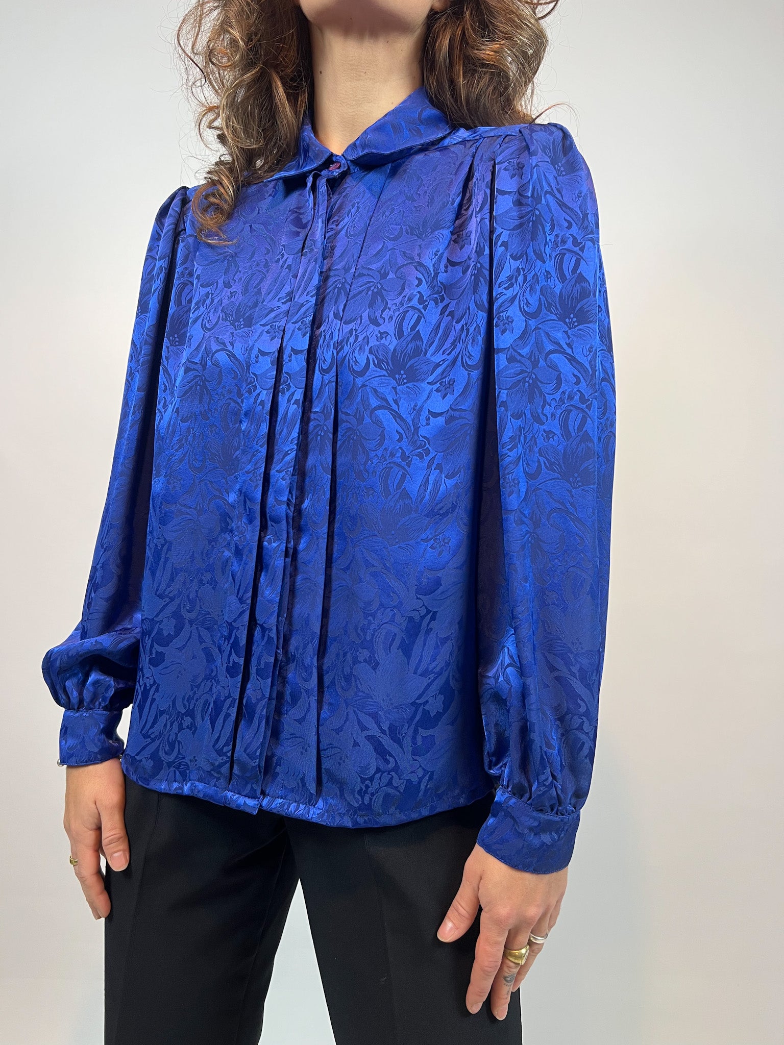 Vintage Royal Blue Satin Shirt with Floral Jacquard