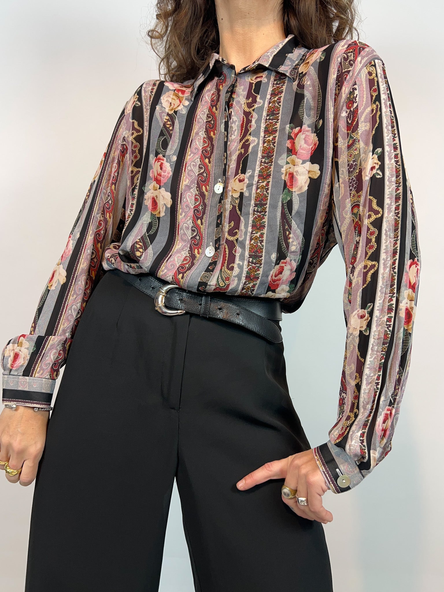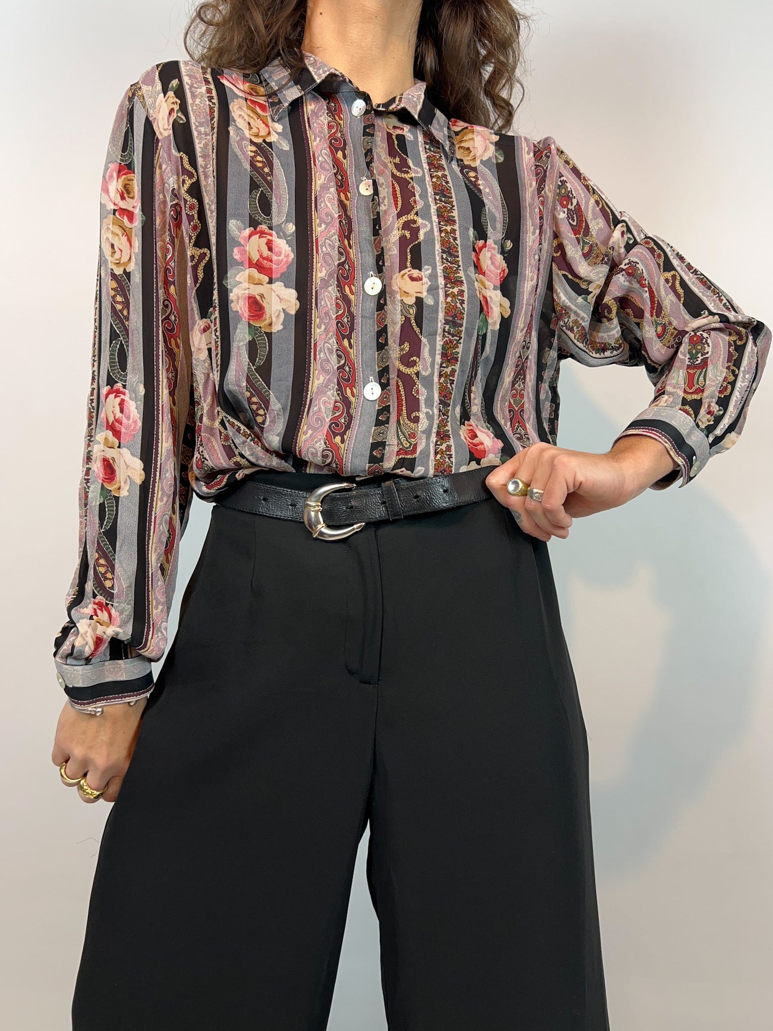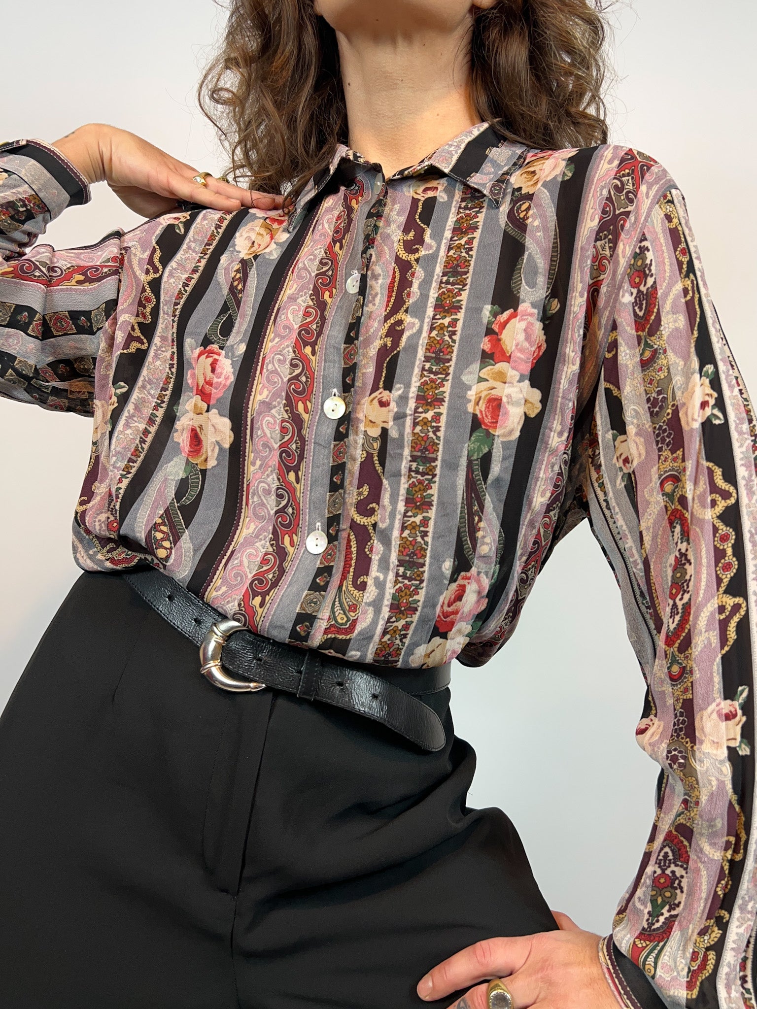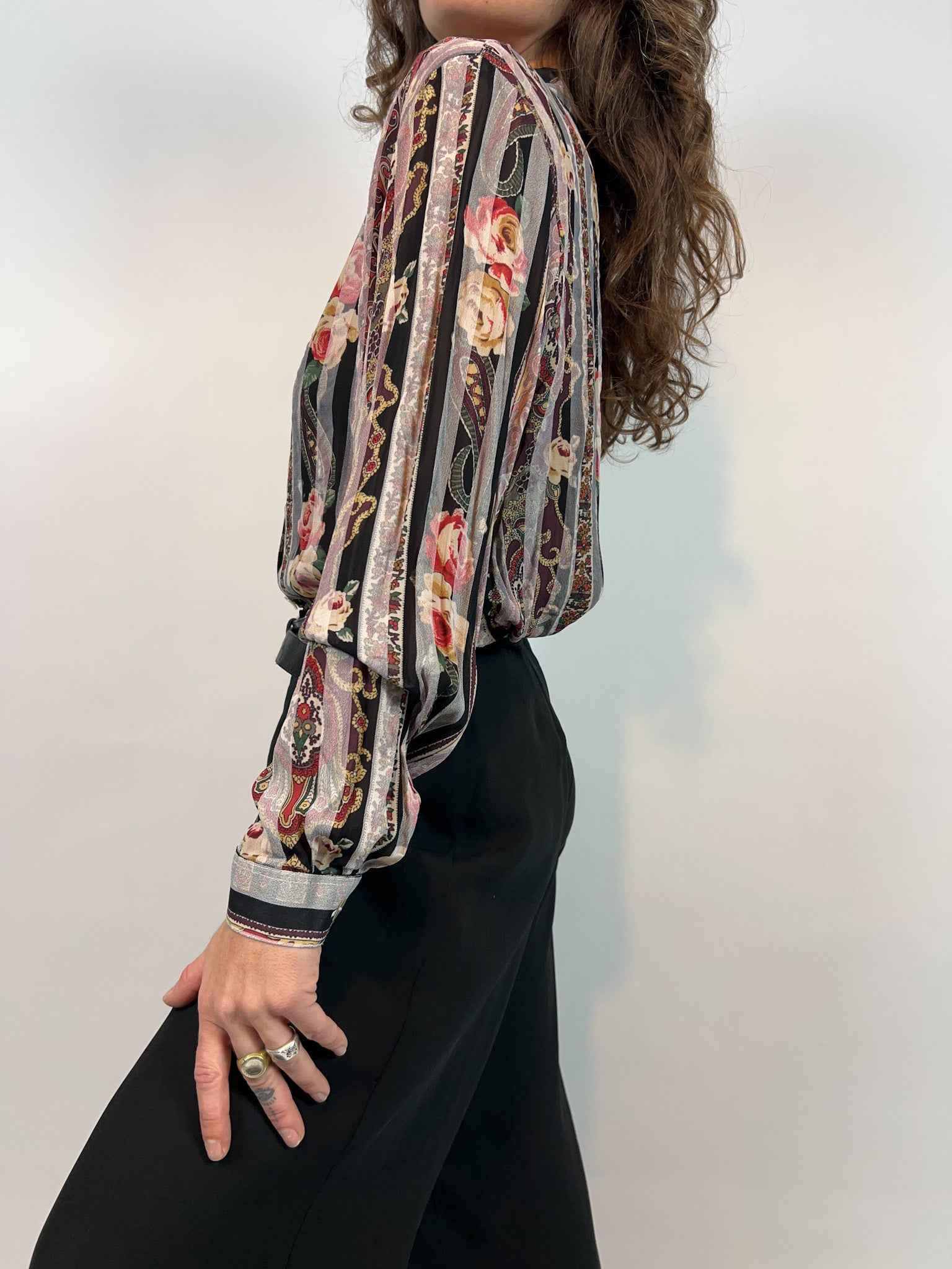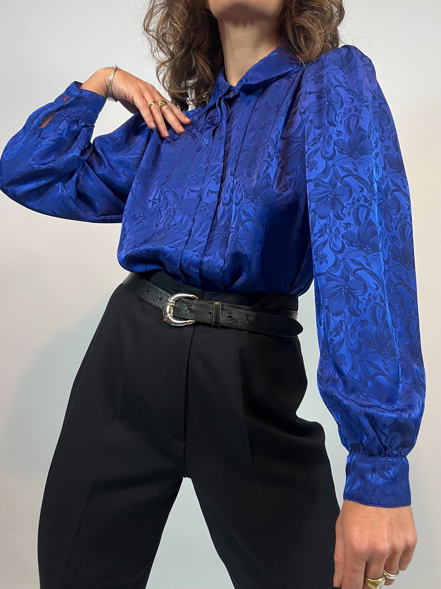 Vintage Royal Blue Satin Shirt with Floral Jacquard