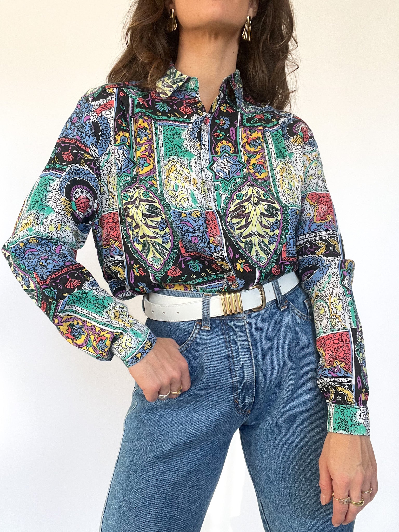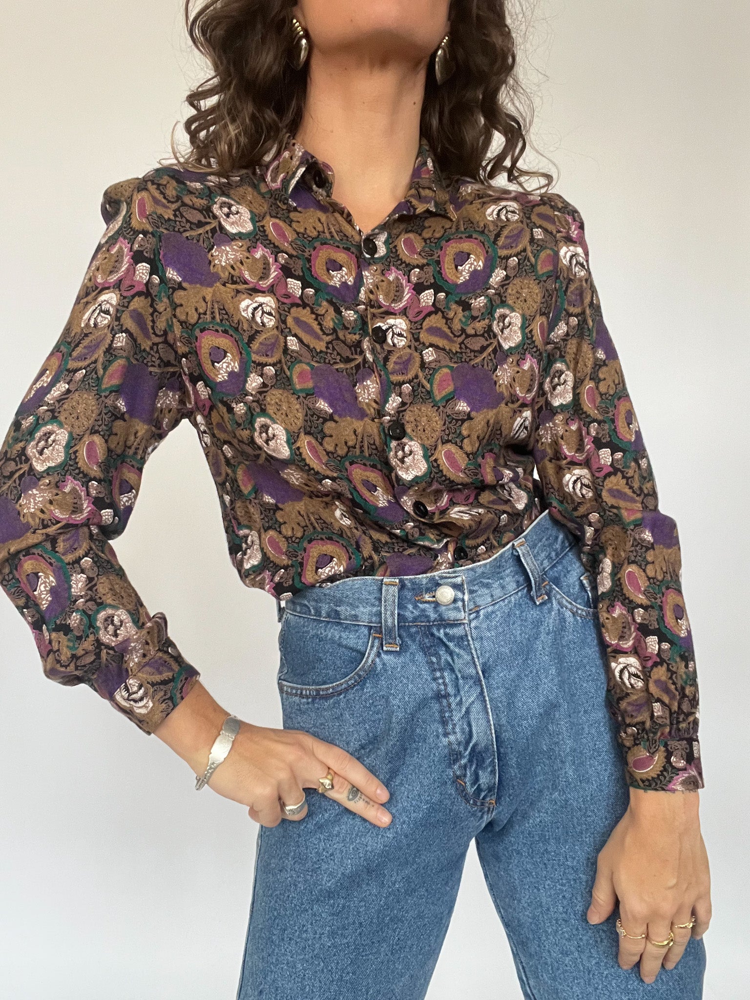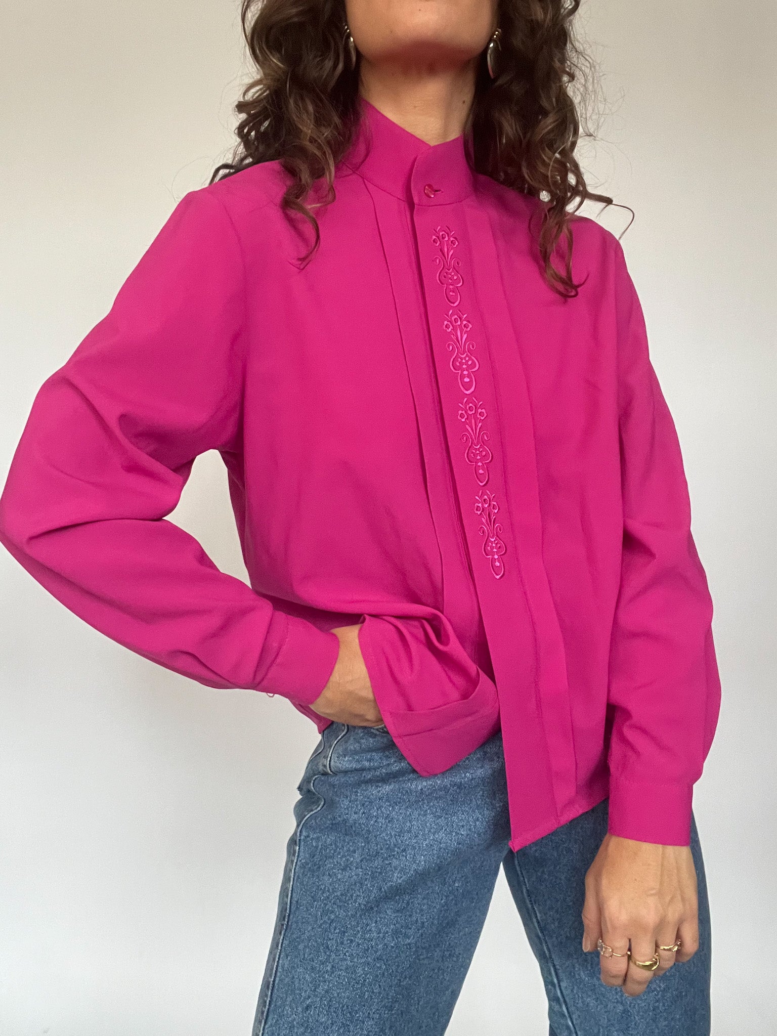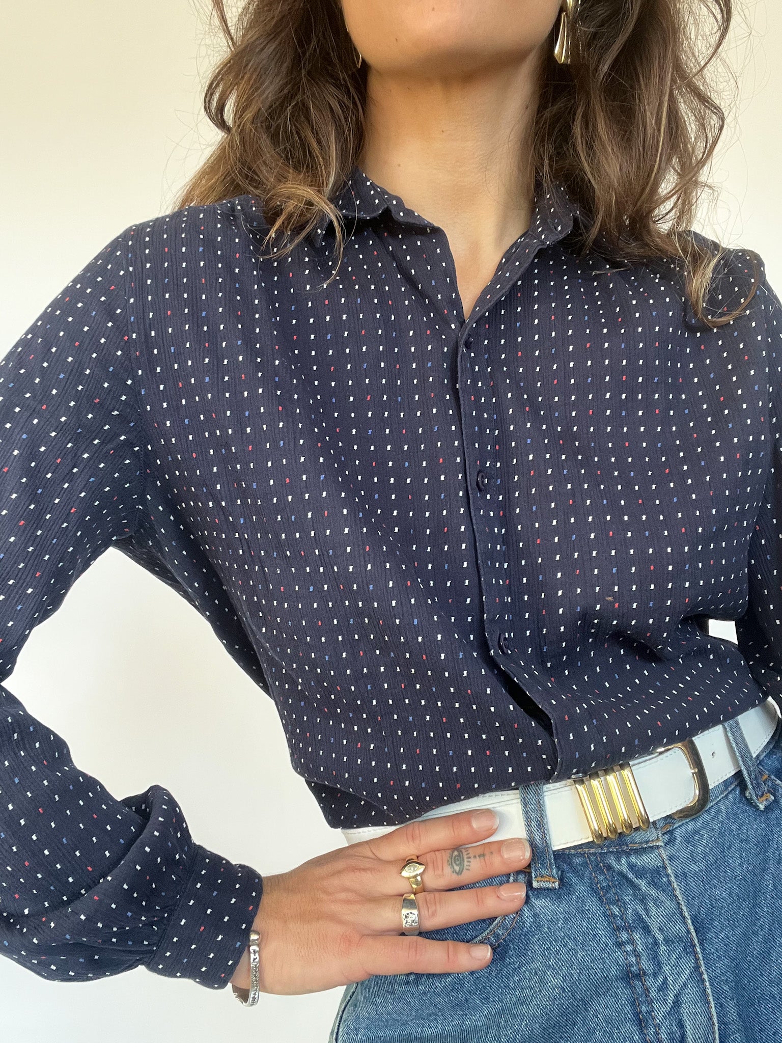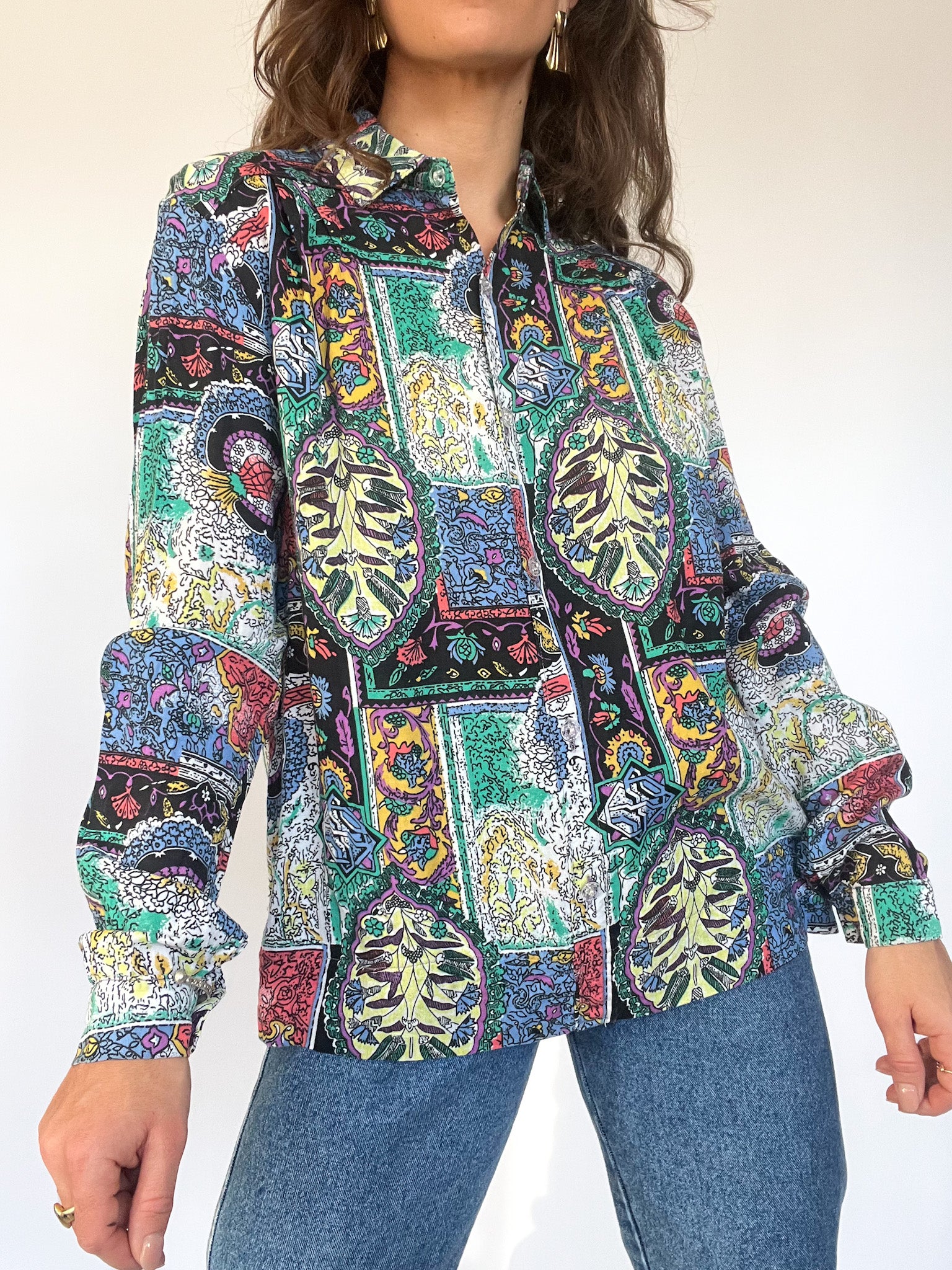 Vintage Royal Blue Satin Shirt with Floral Jacquard
