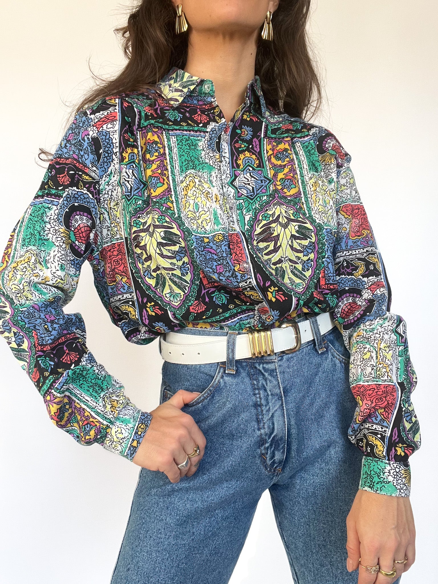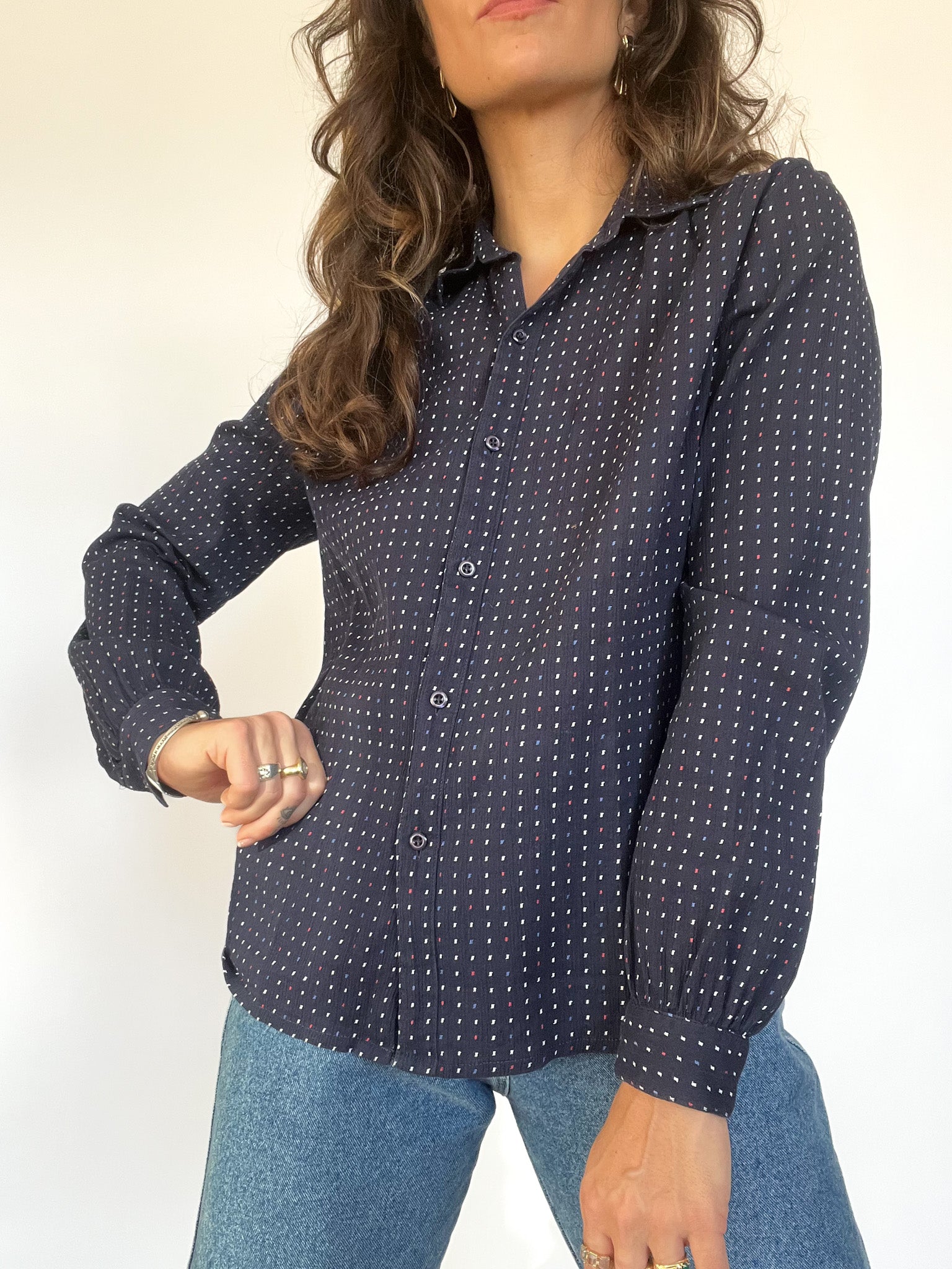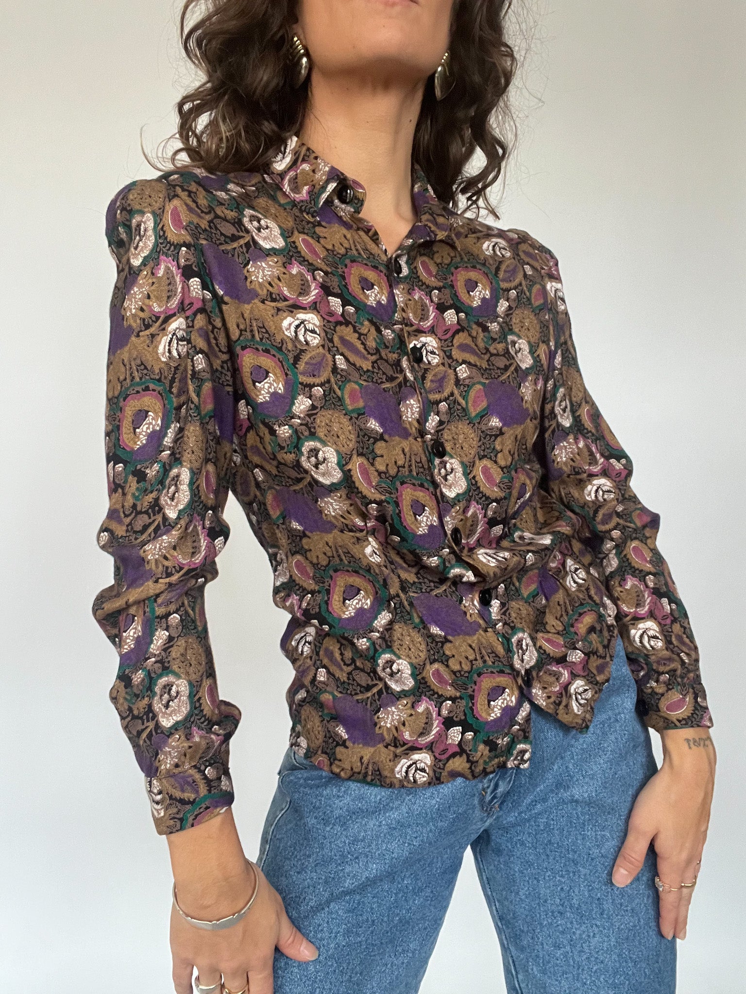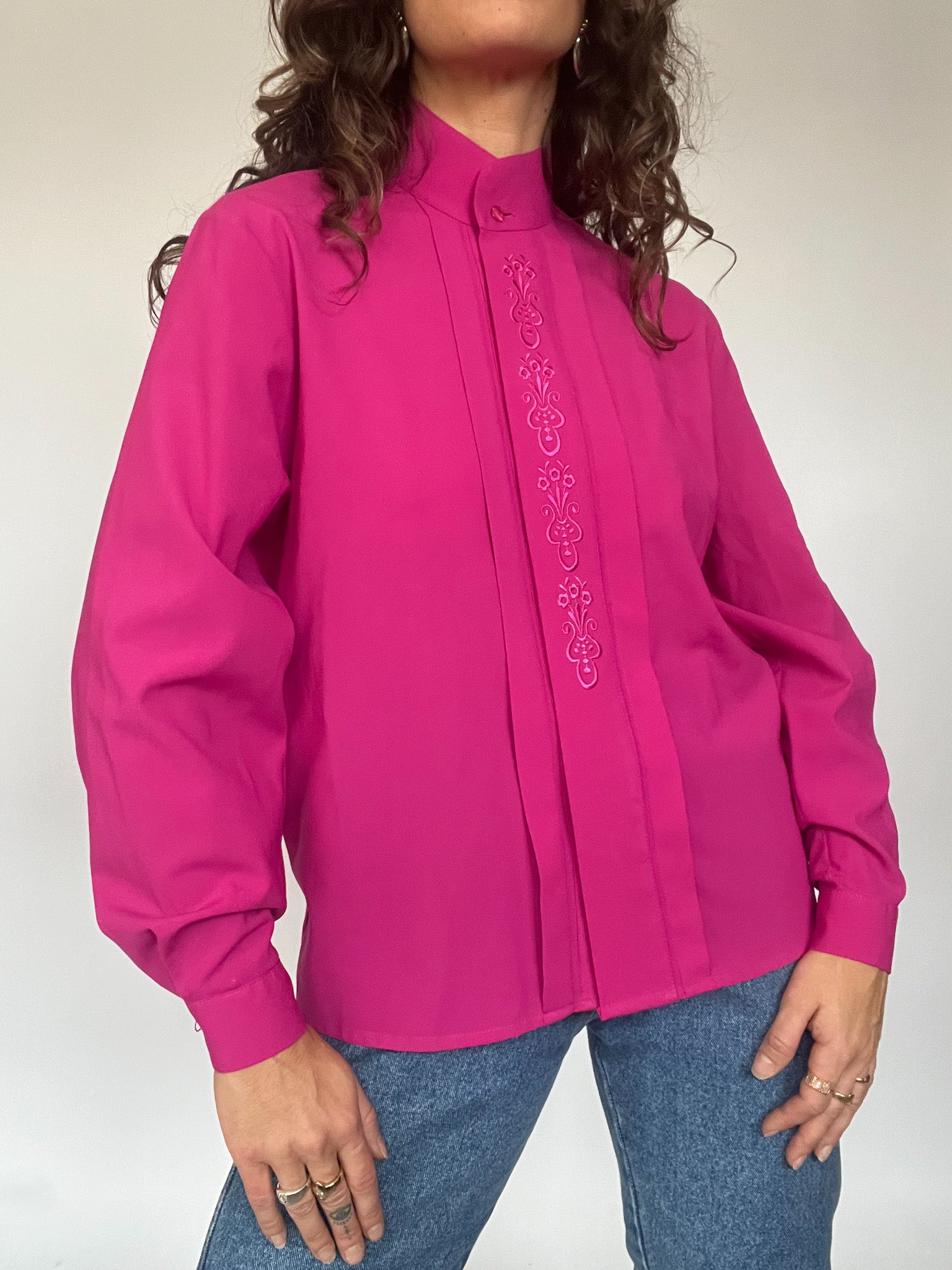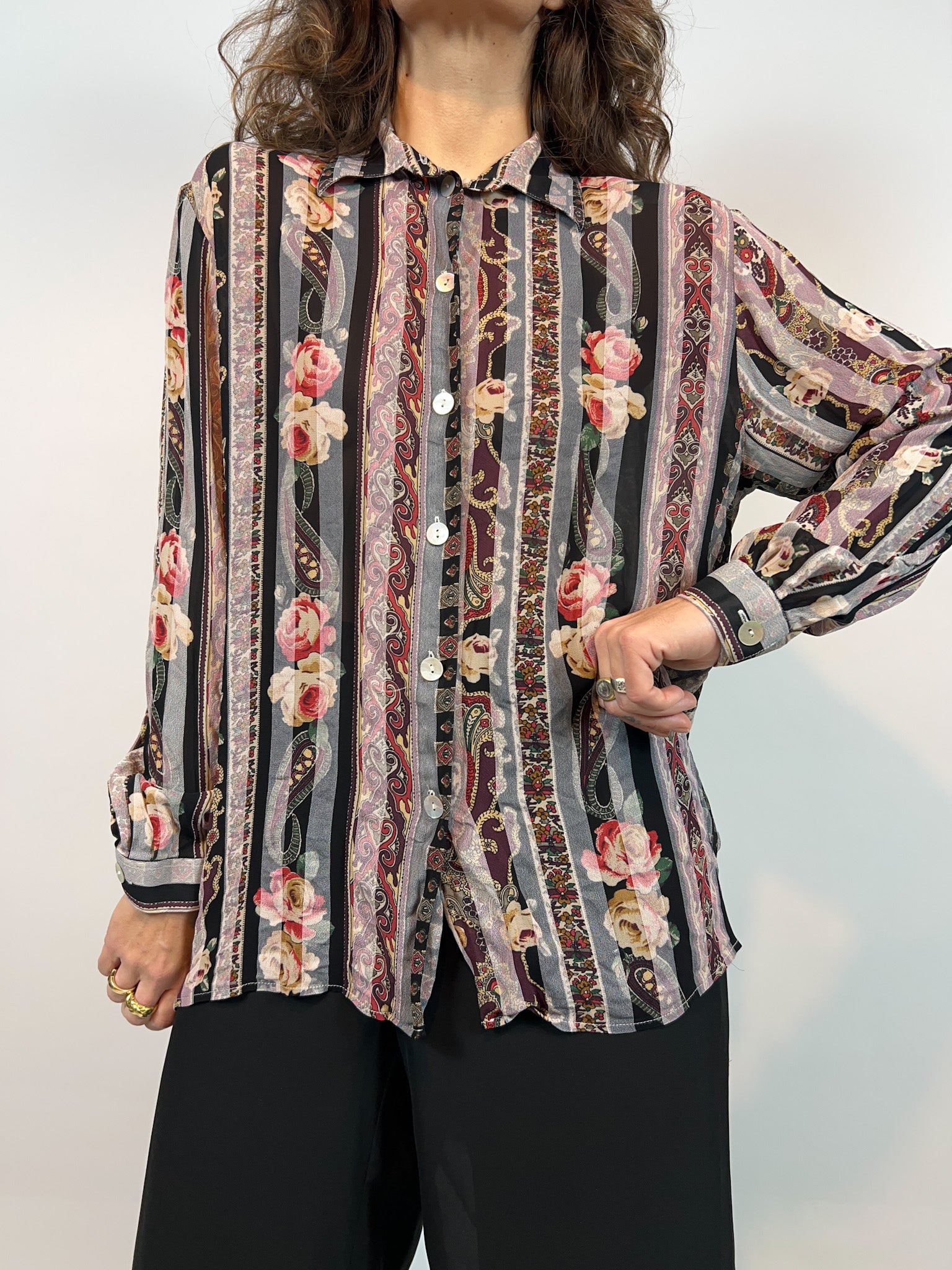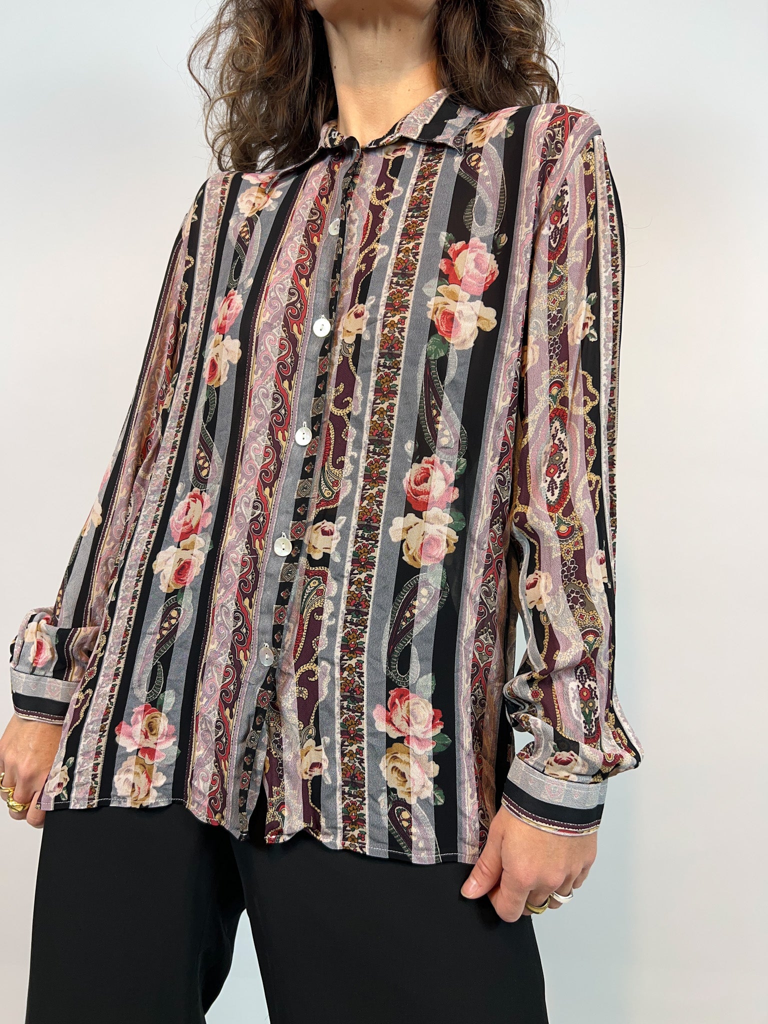Vintage Royal Blue Satin Shirt with Floral Jacquard