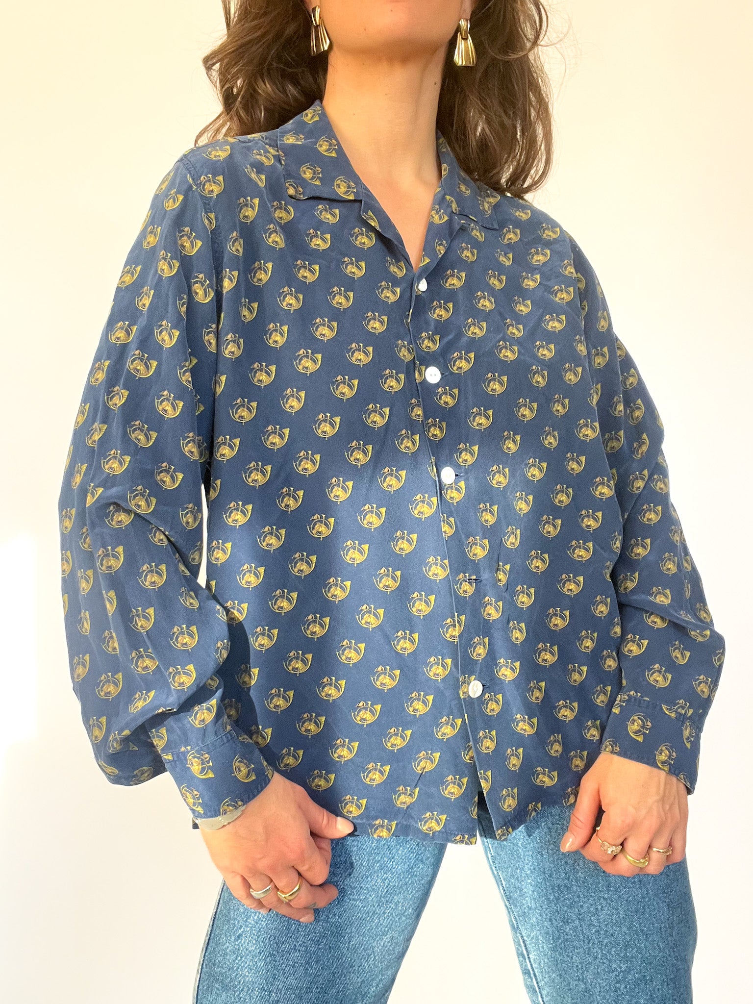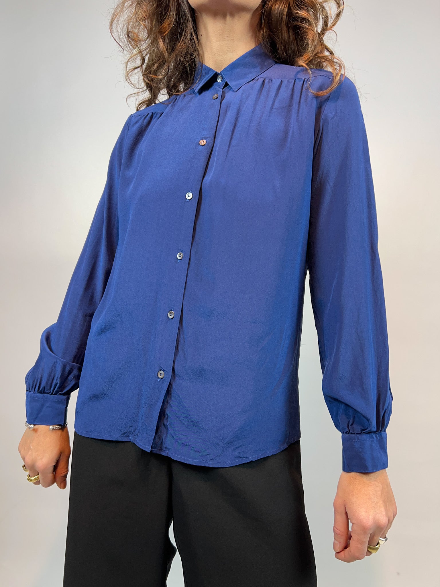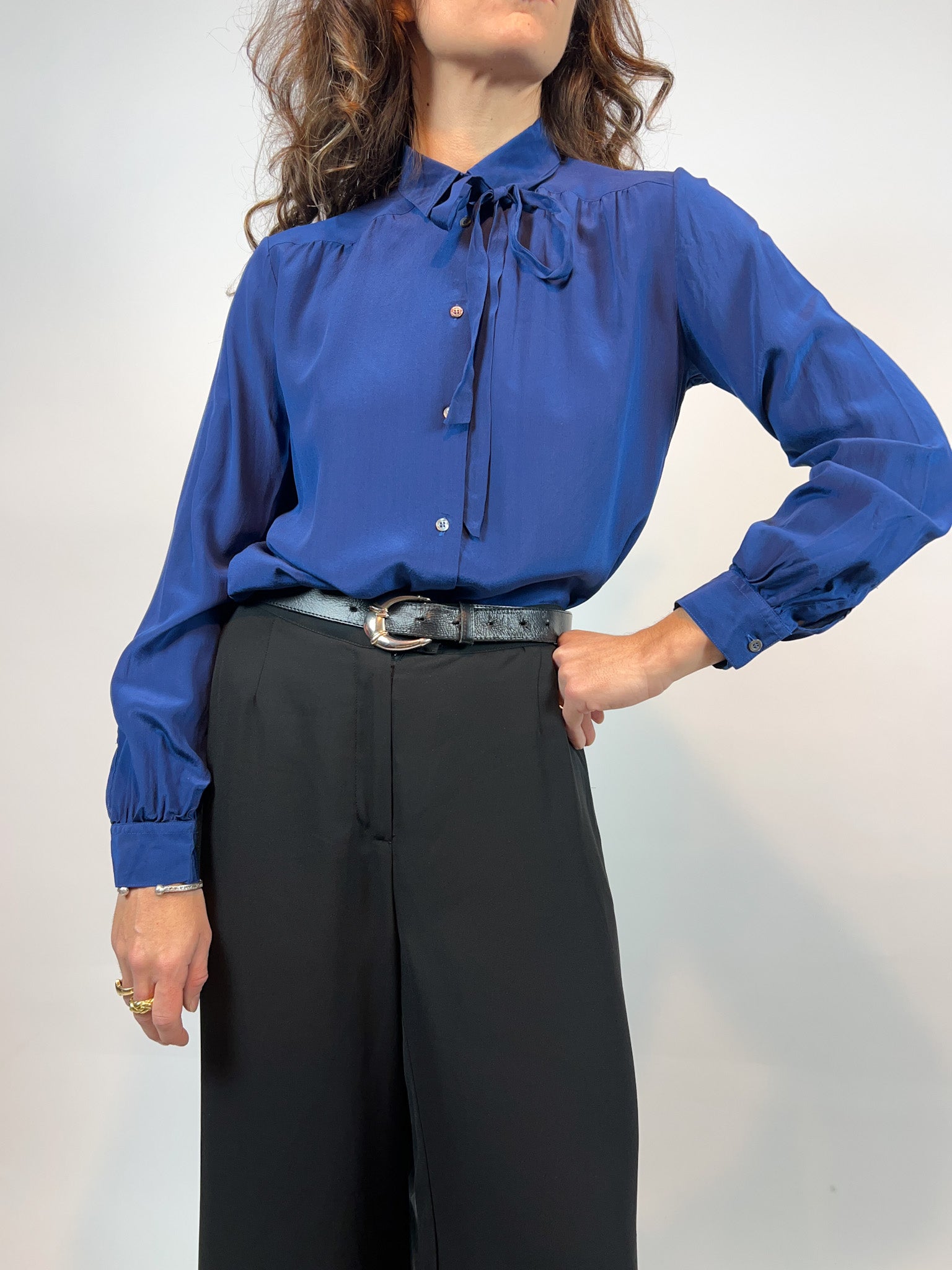 Vintage Royal Blue Silk Blouse with Tie-Neck