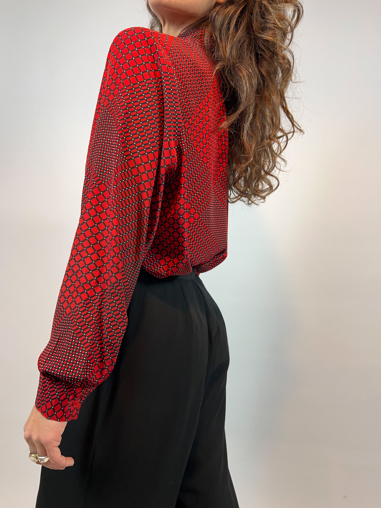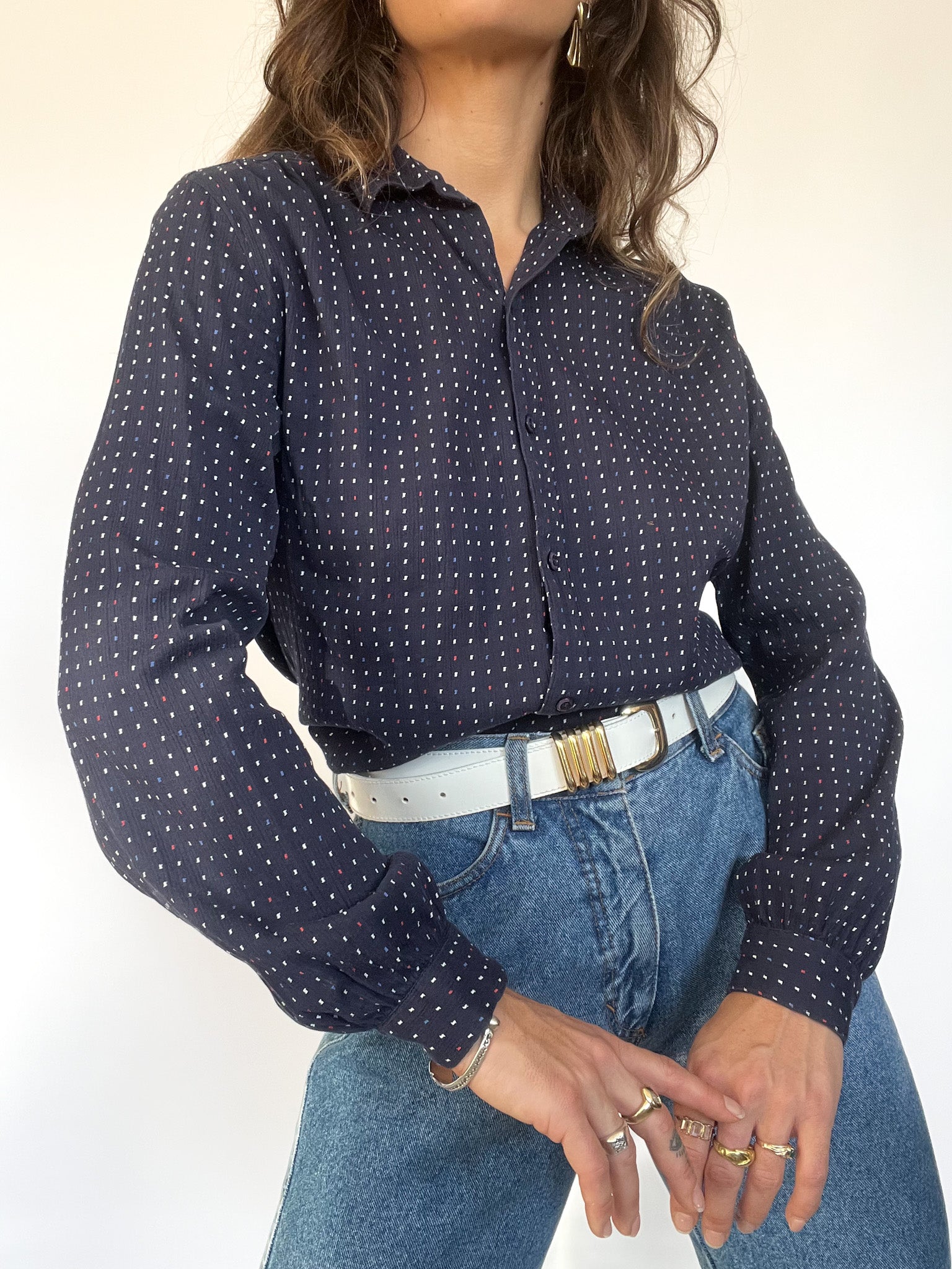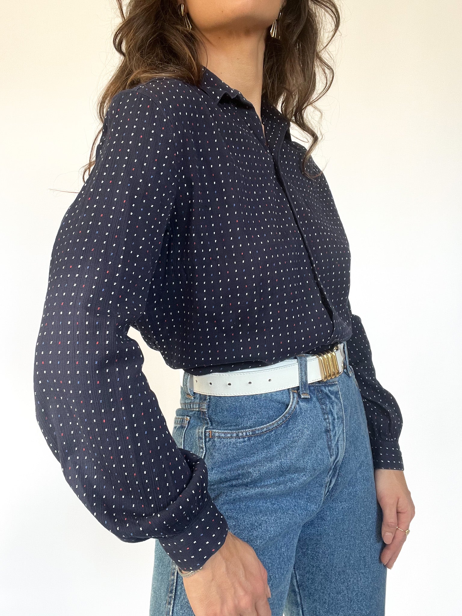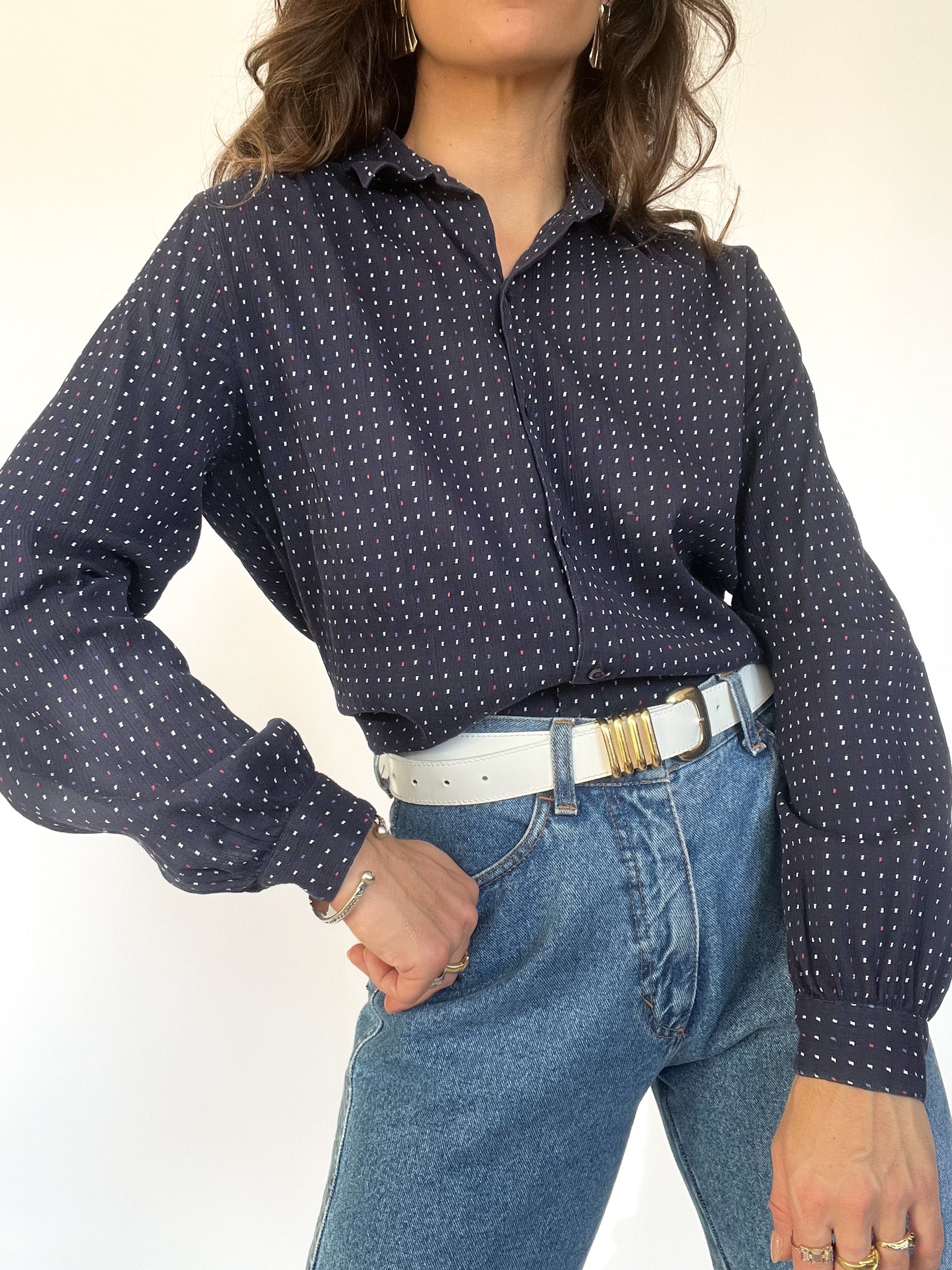 Vintage Royal Blue Silk Blouse with Tie-Neck
