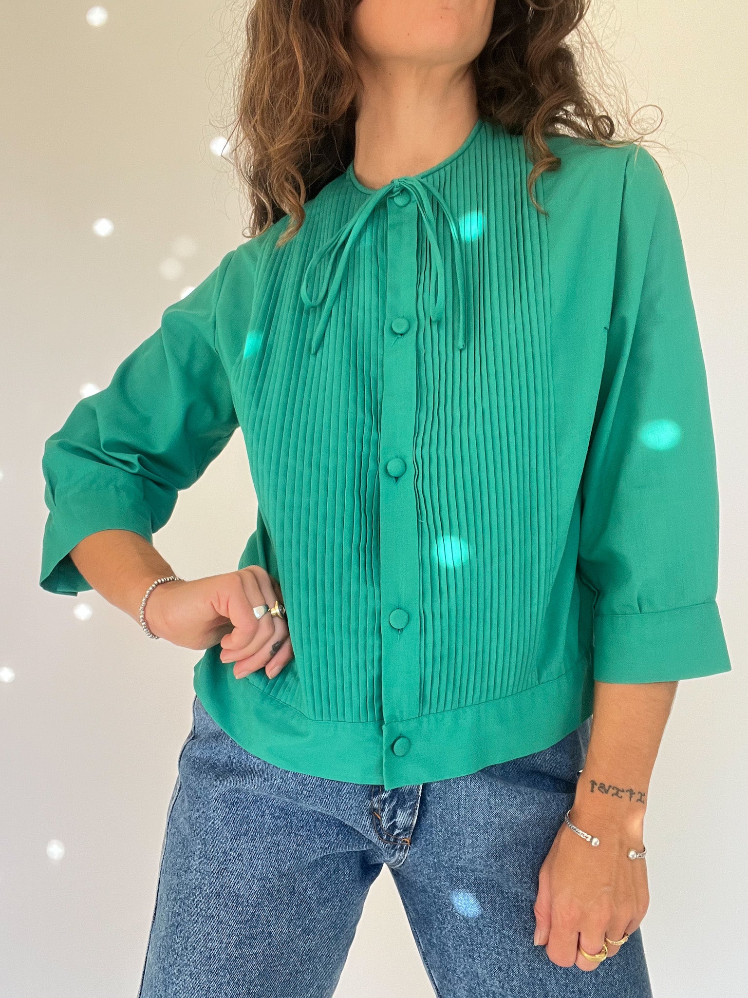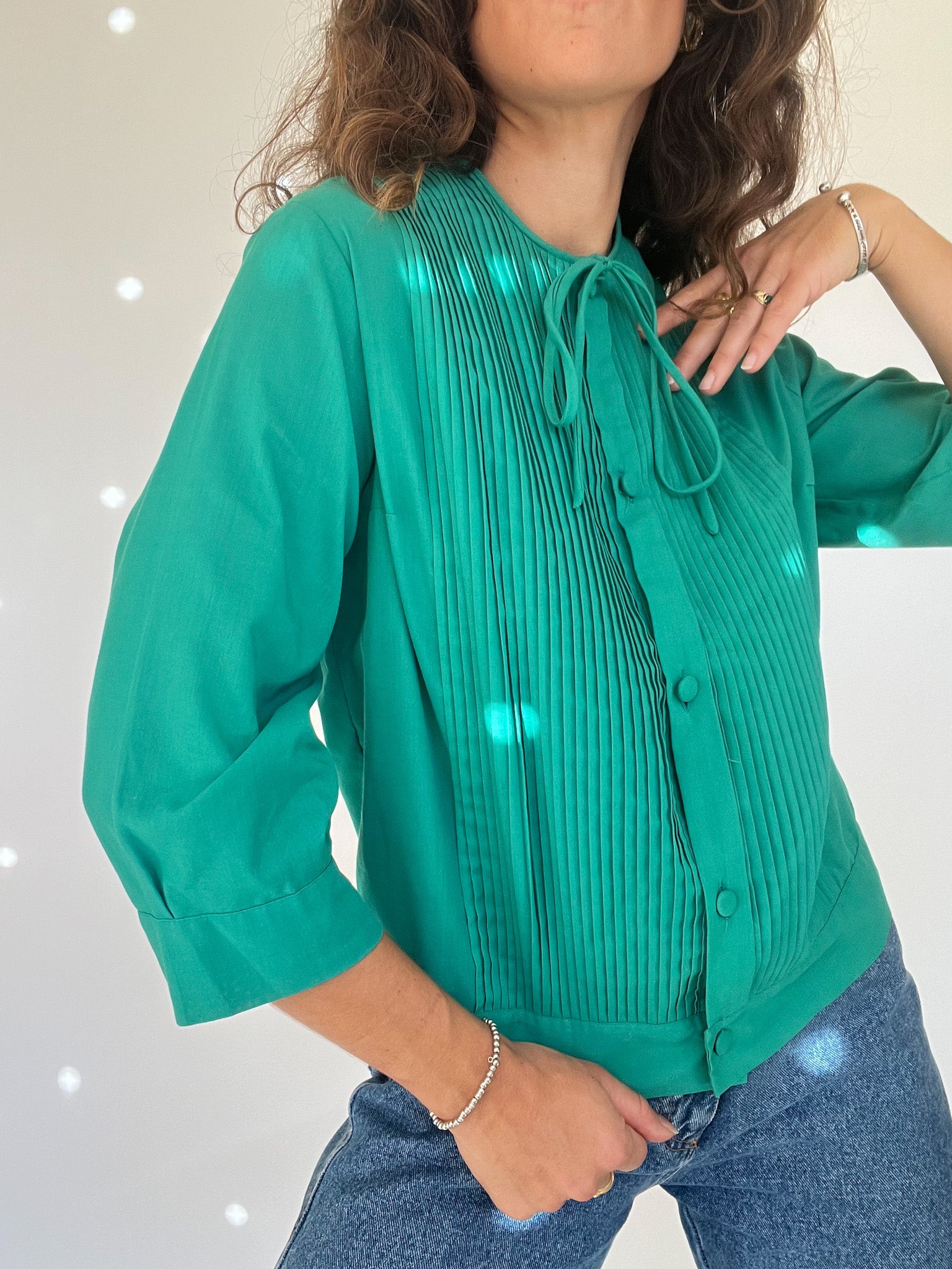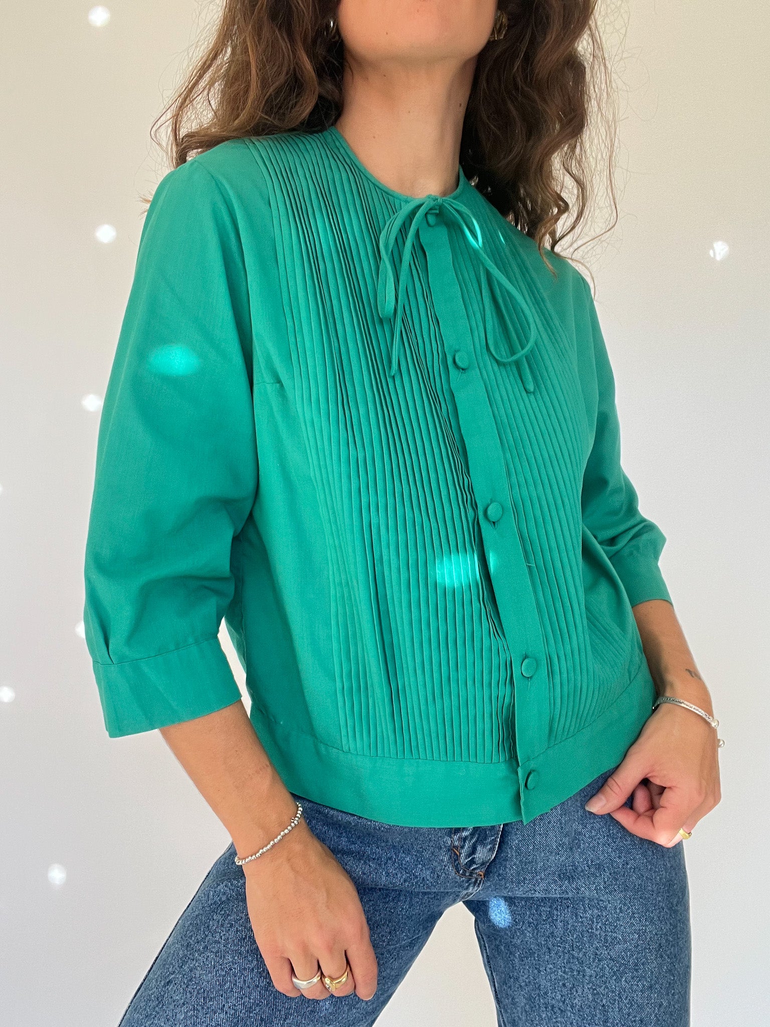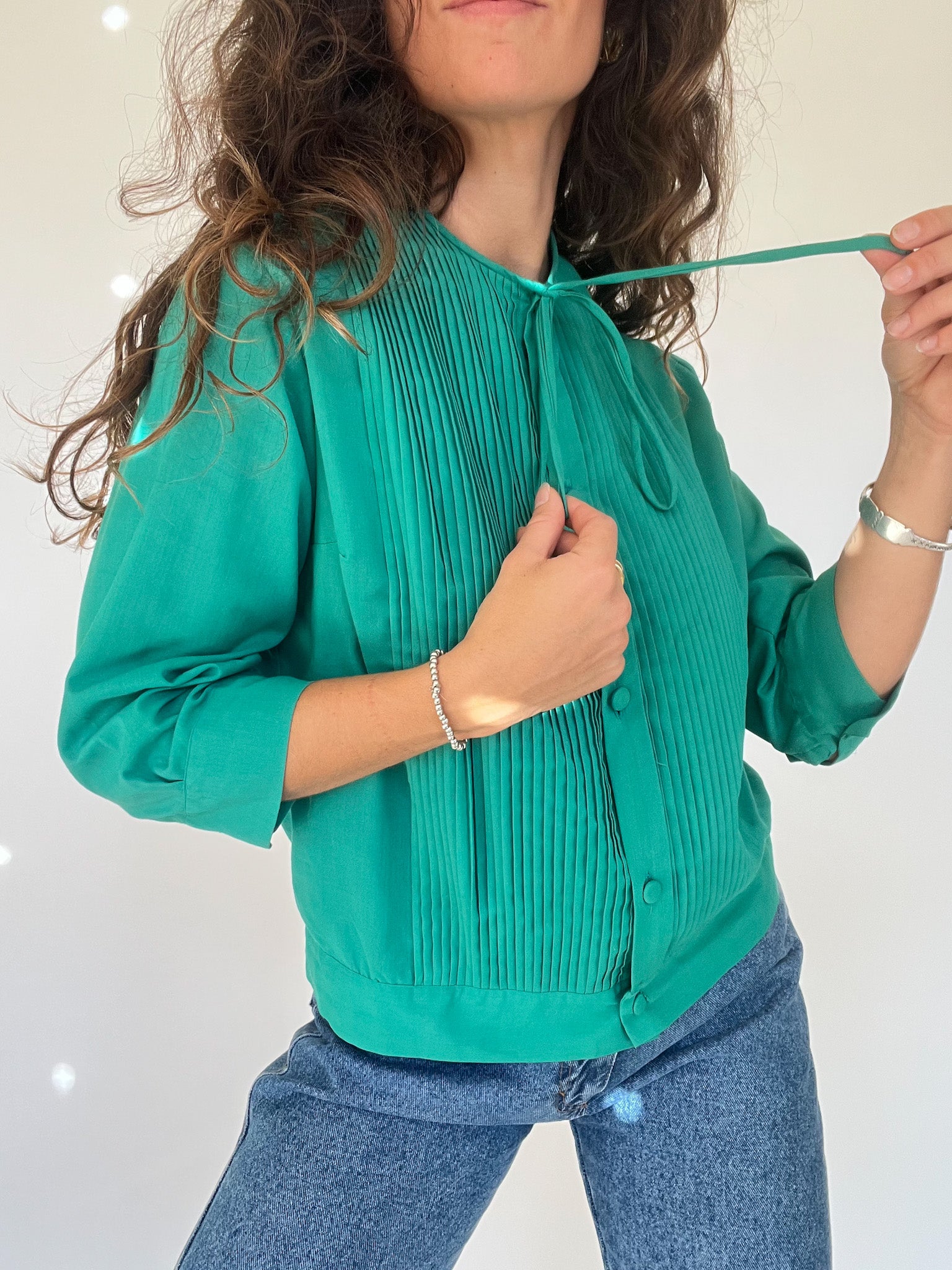 Vintage 90’s Emerald Green Pleated Blouse with Bow Tie Collar