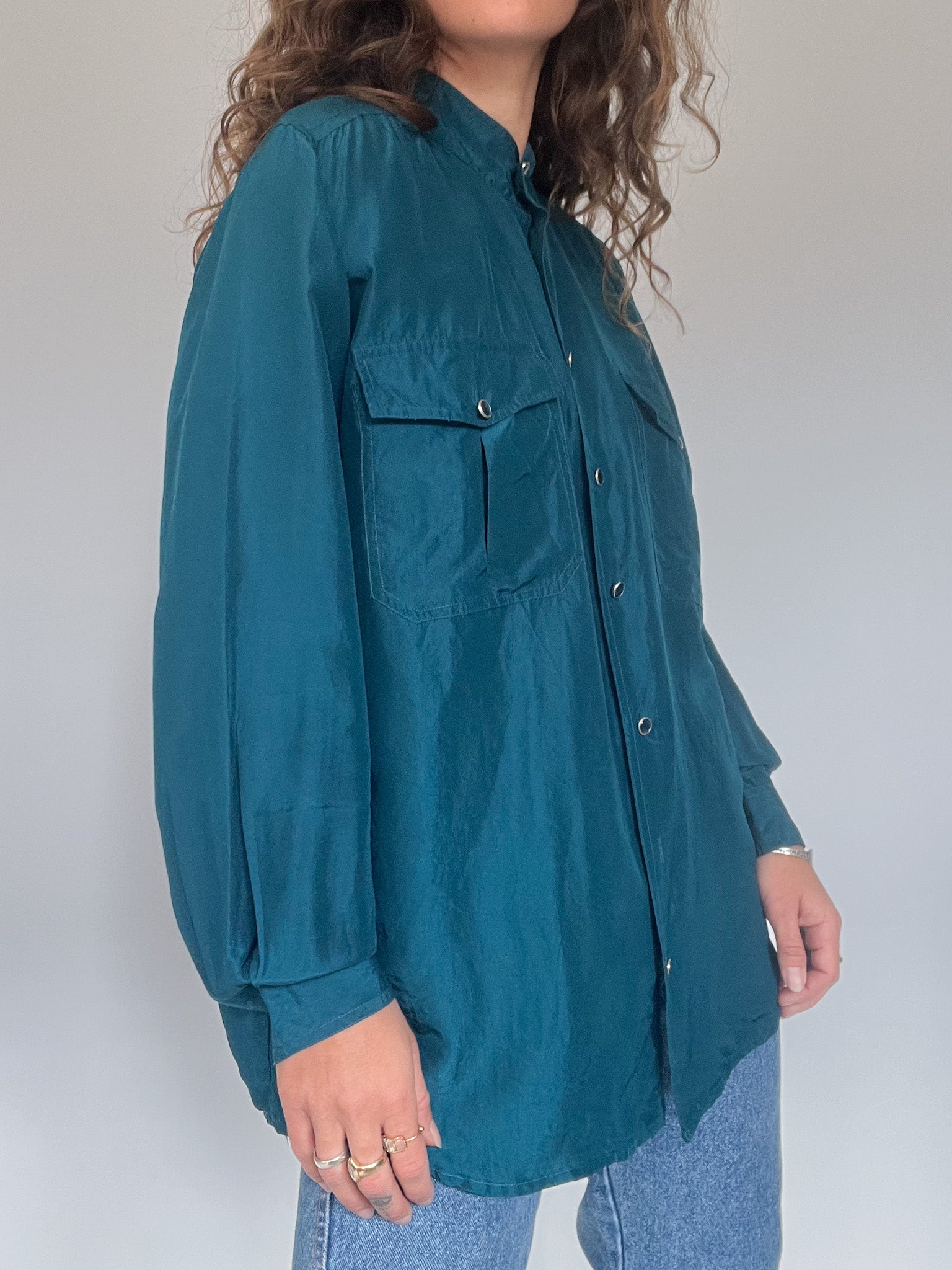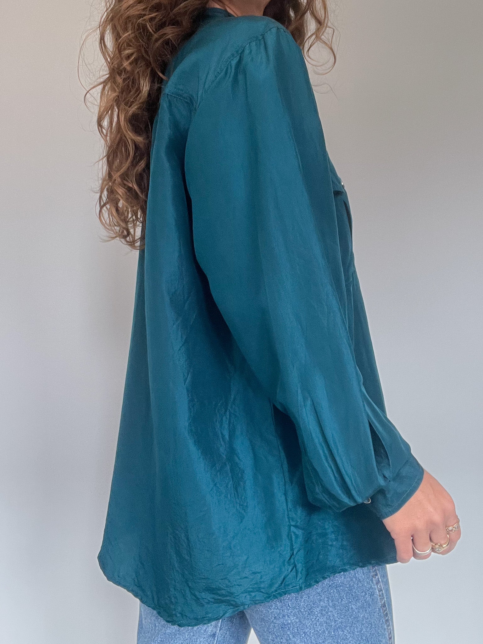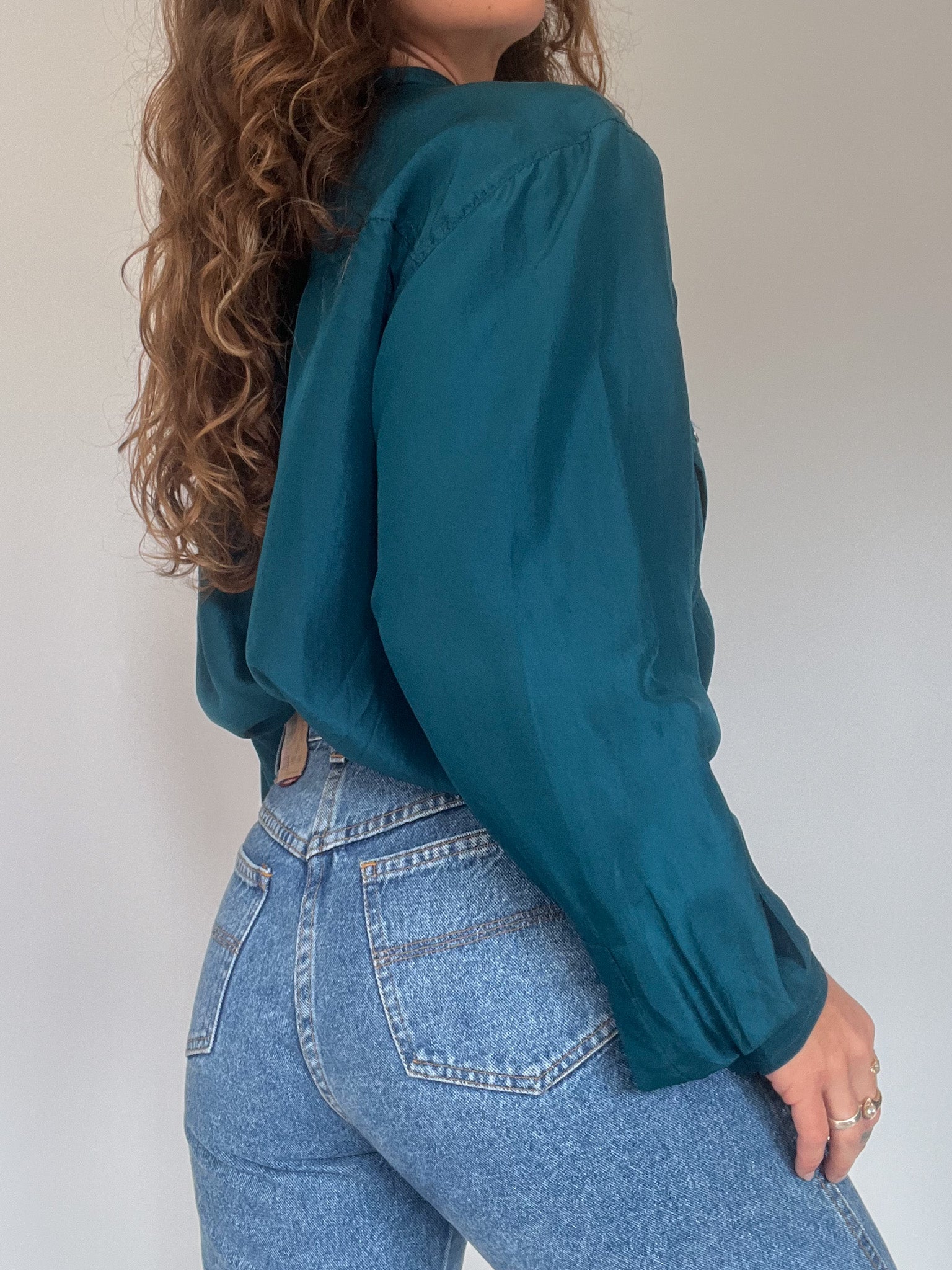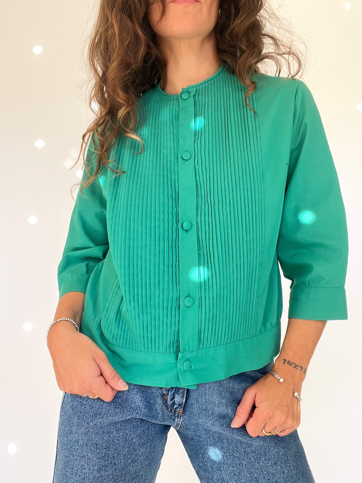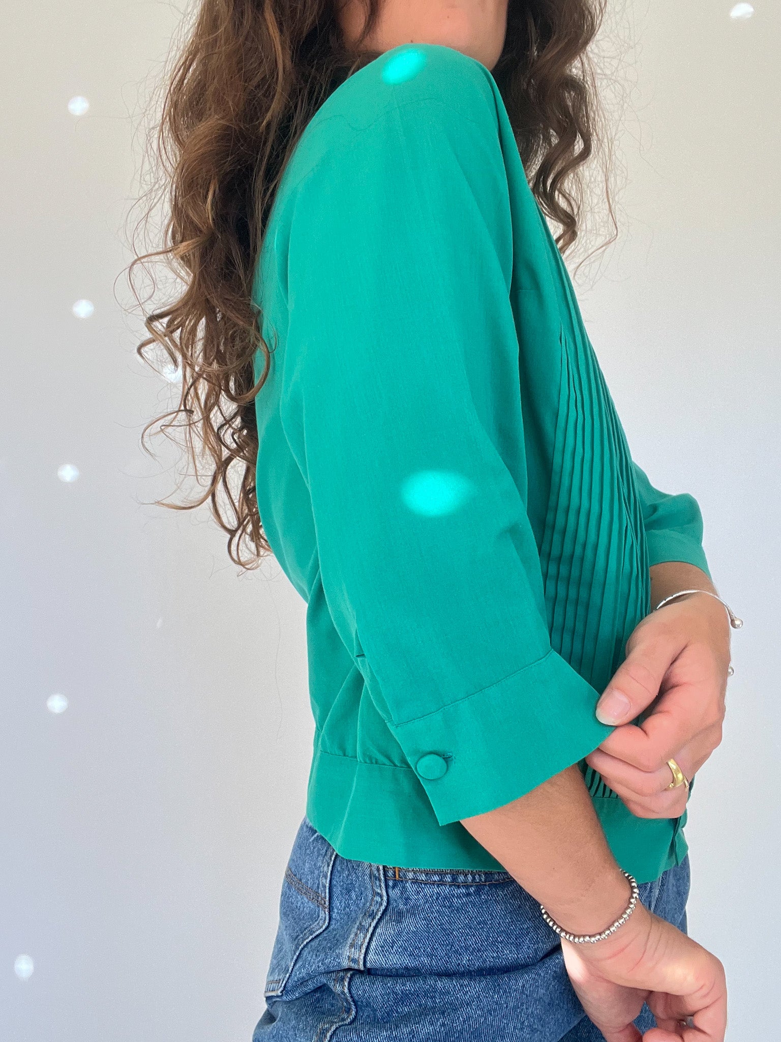 Vintage 90’s Emerald Green Pleated Blouse with Bow Tie Collar