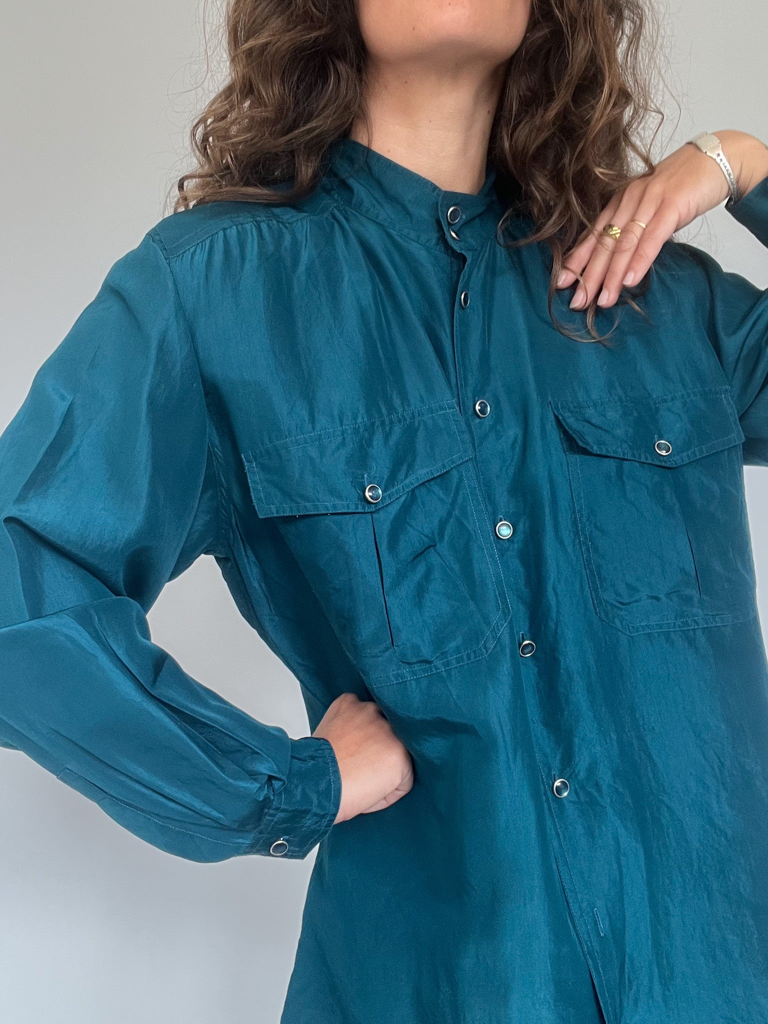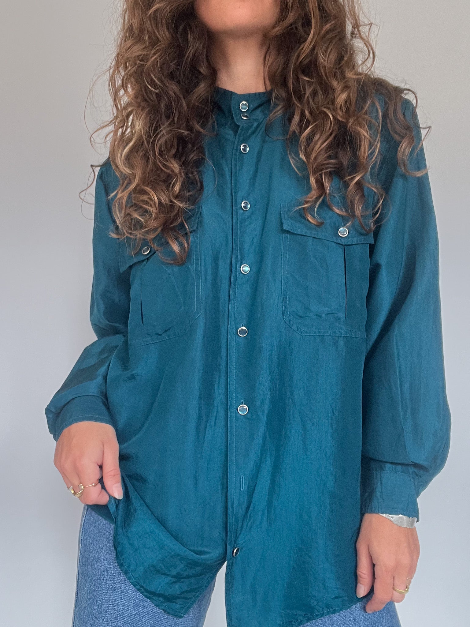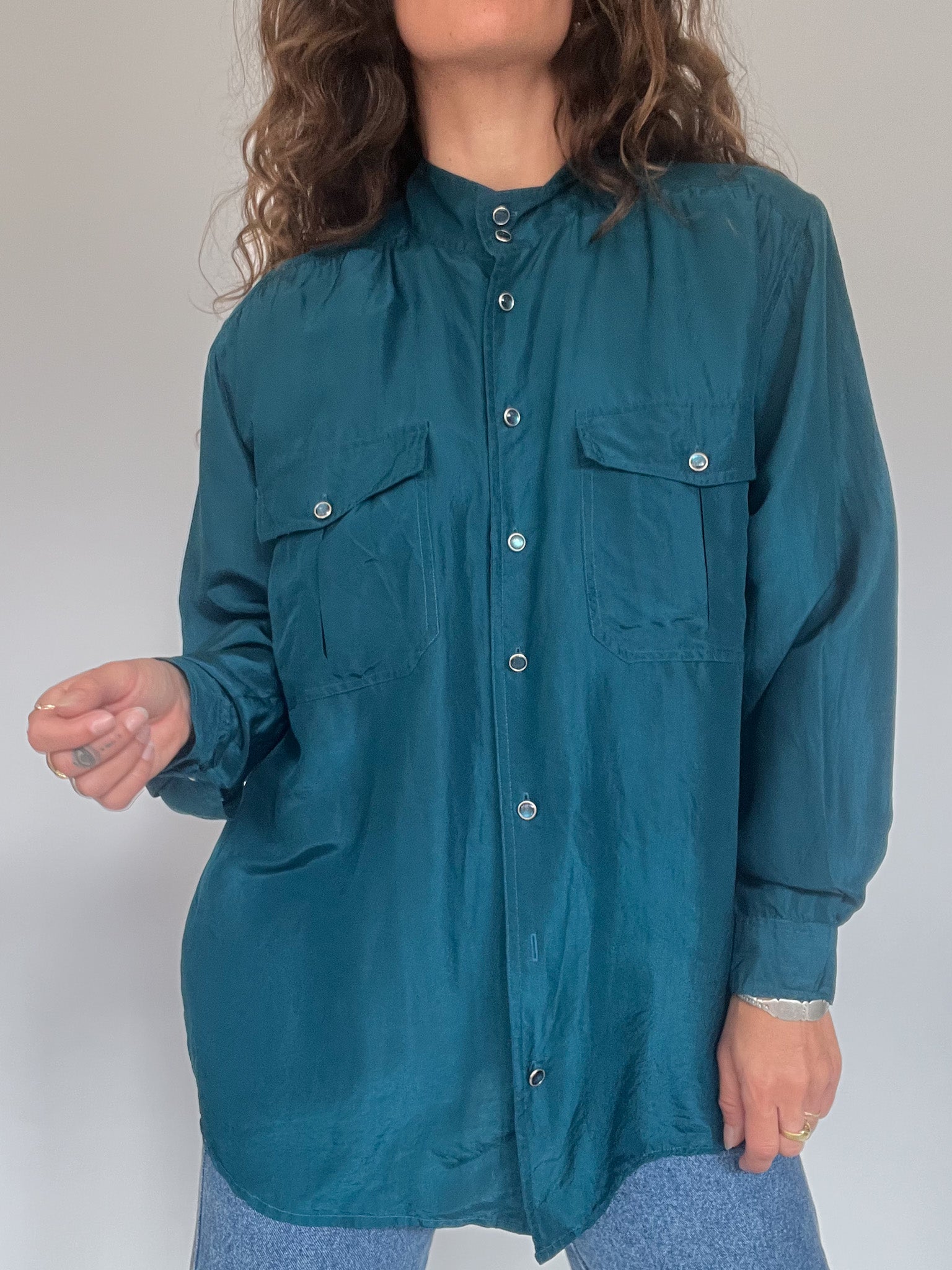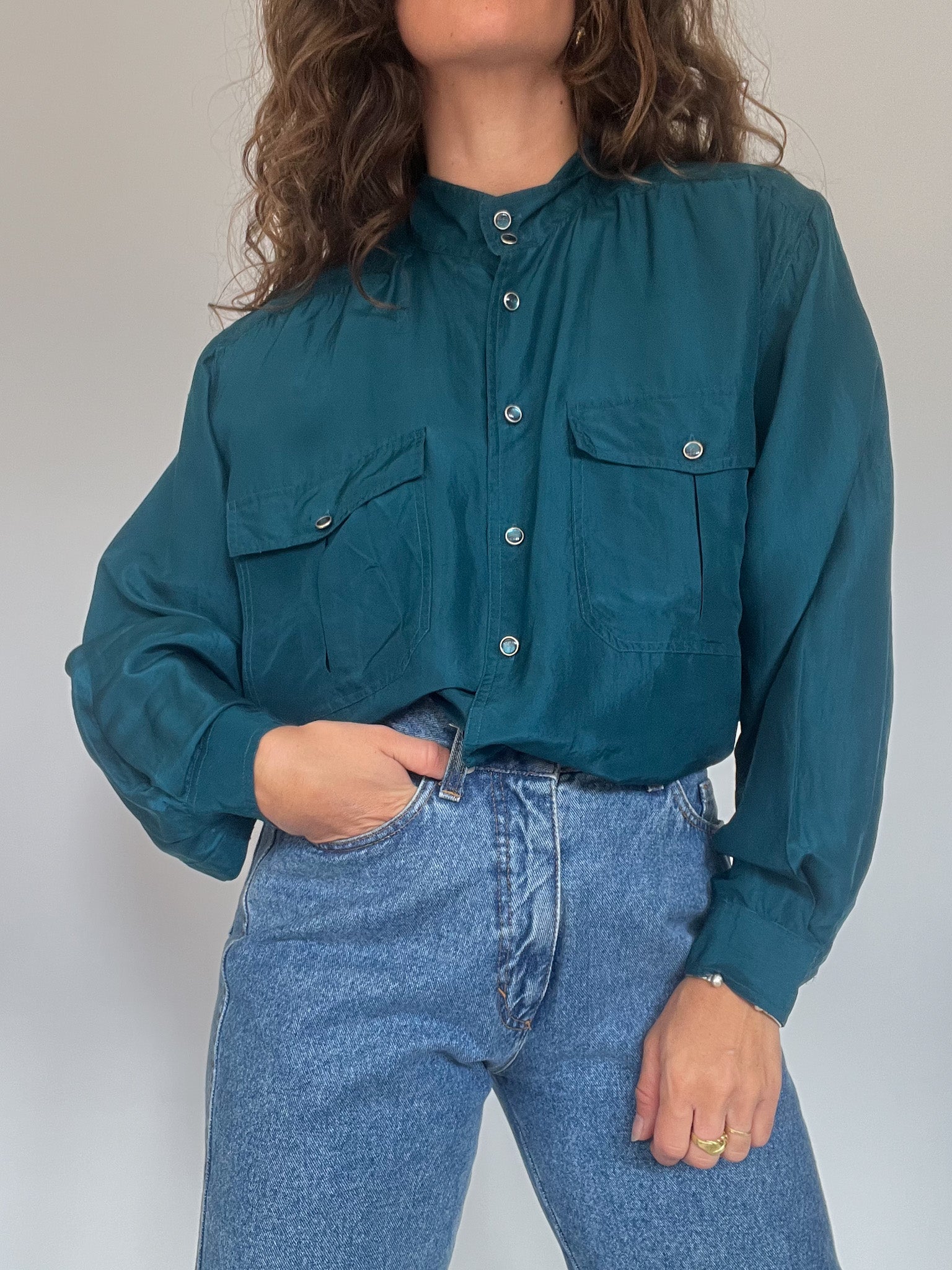 Vintage 90’s Emerald Green Pleated Blouse with Bow Tie Collar