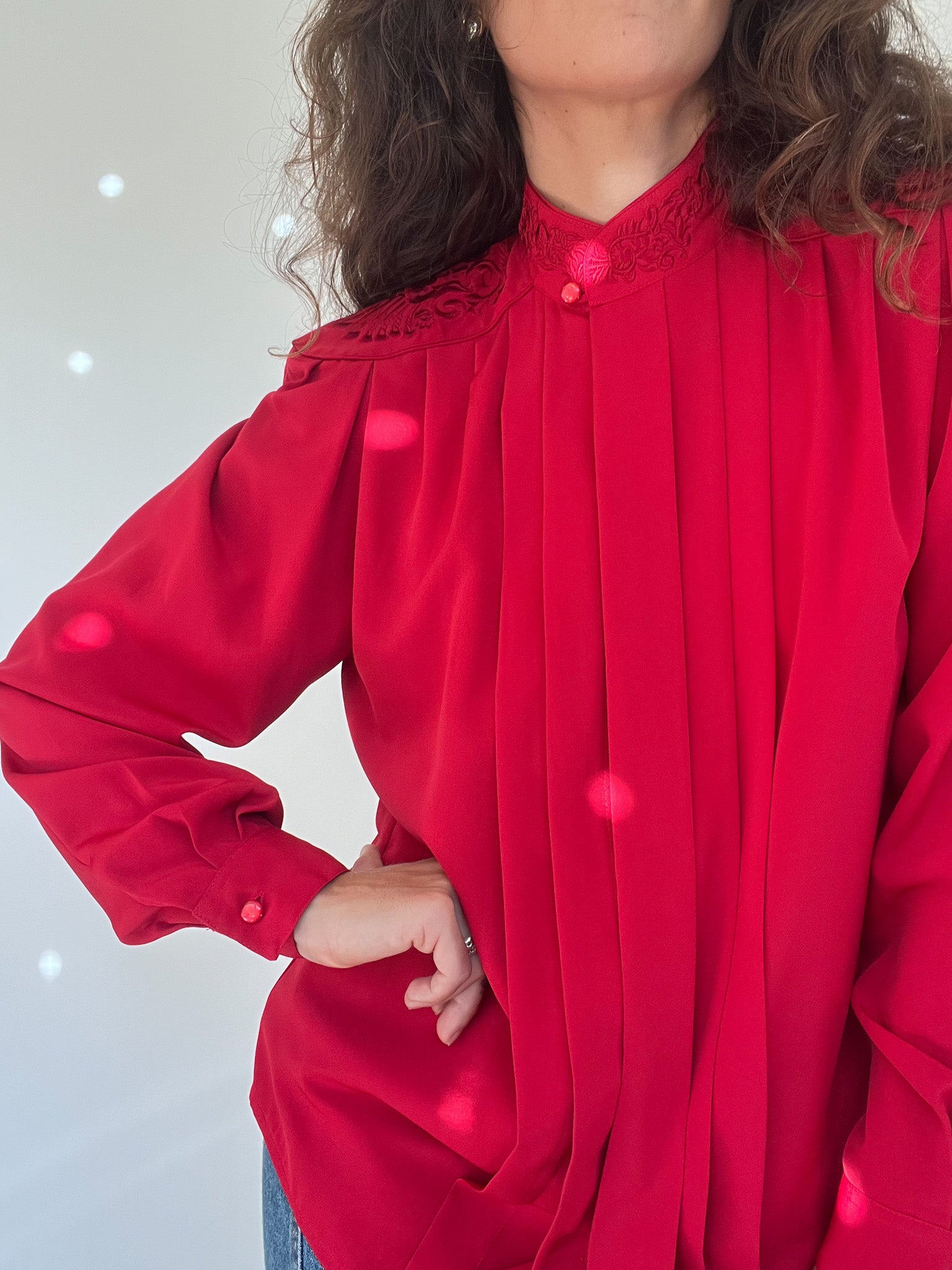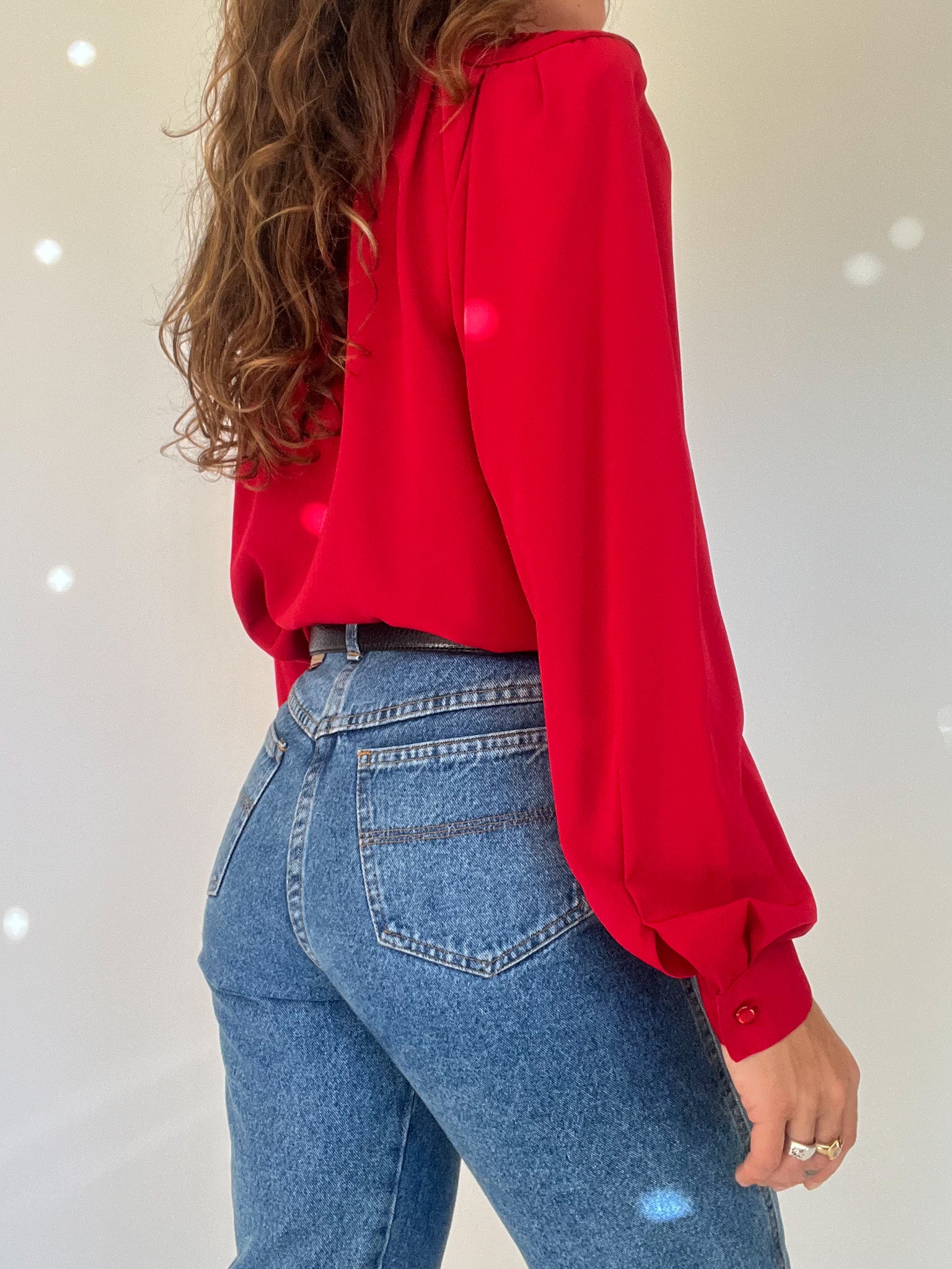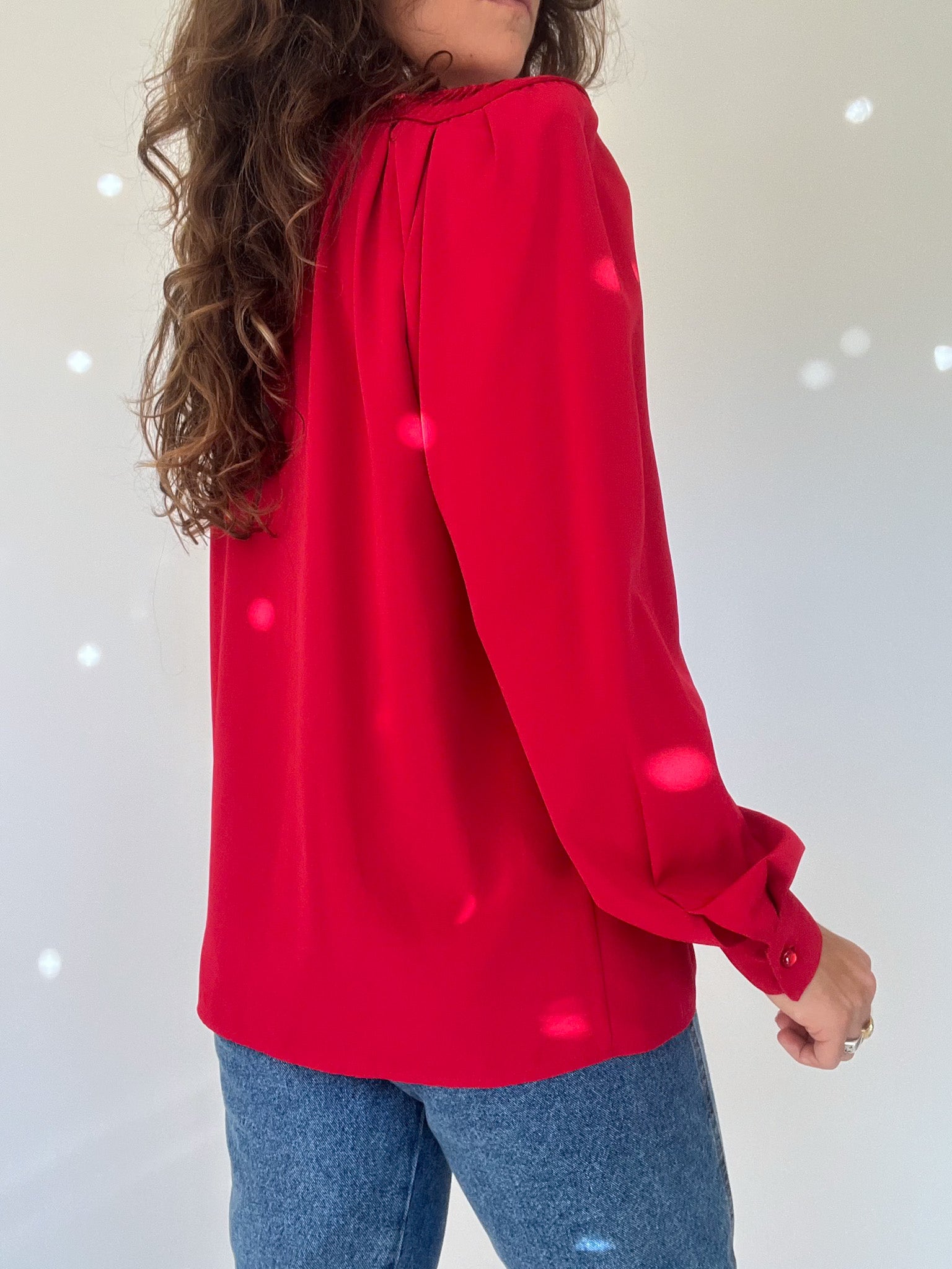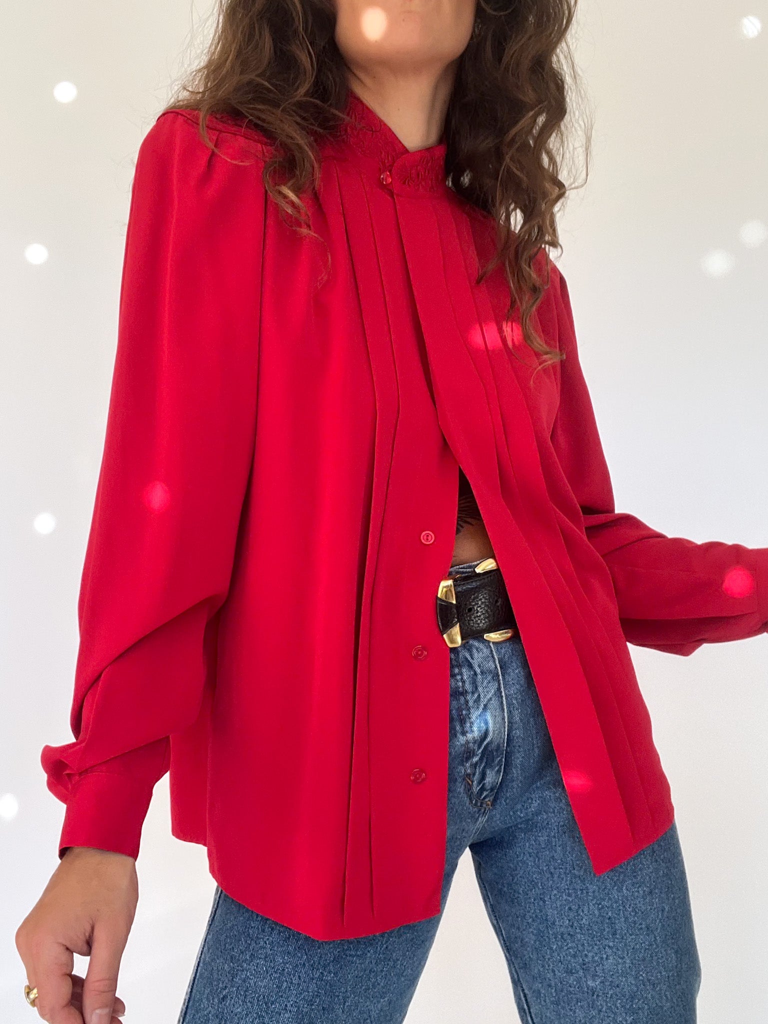 Vintage 90’s Red Silk Blouse with Gold Button Detail