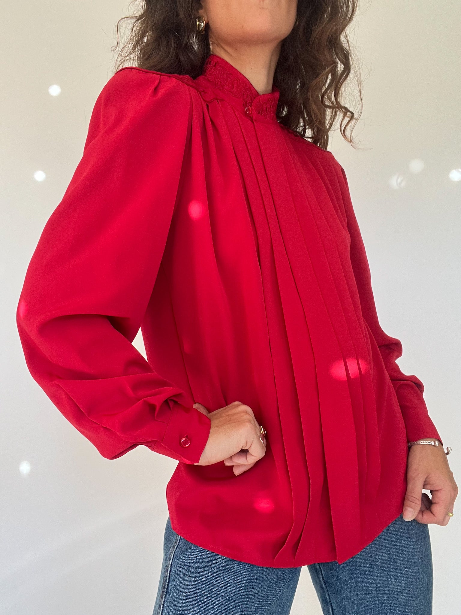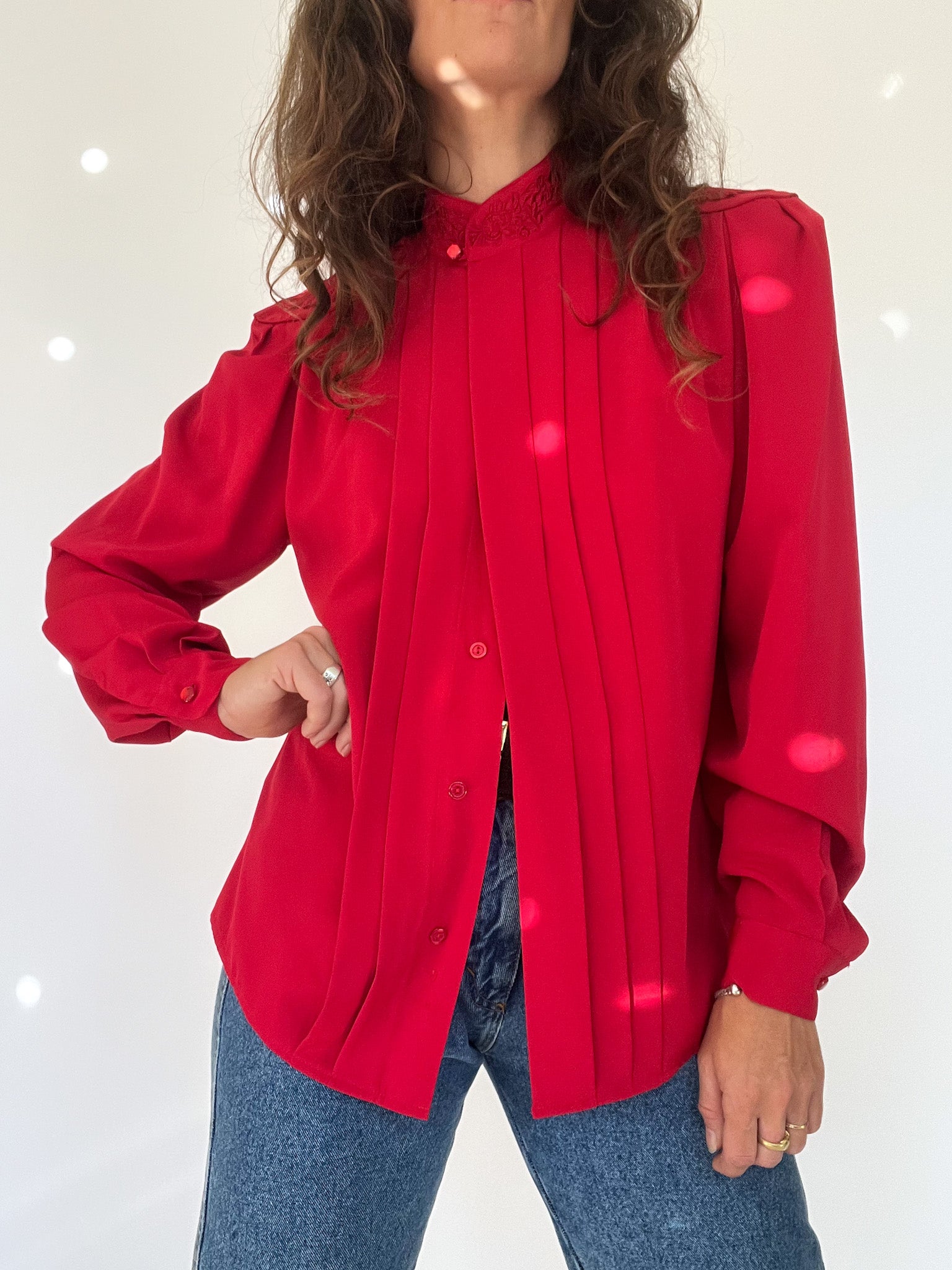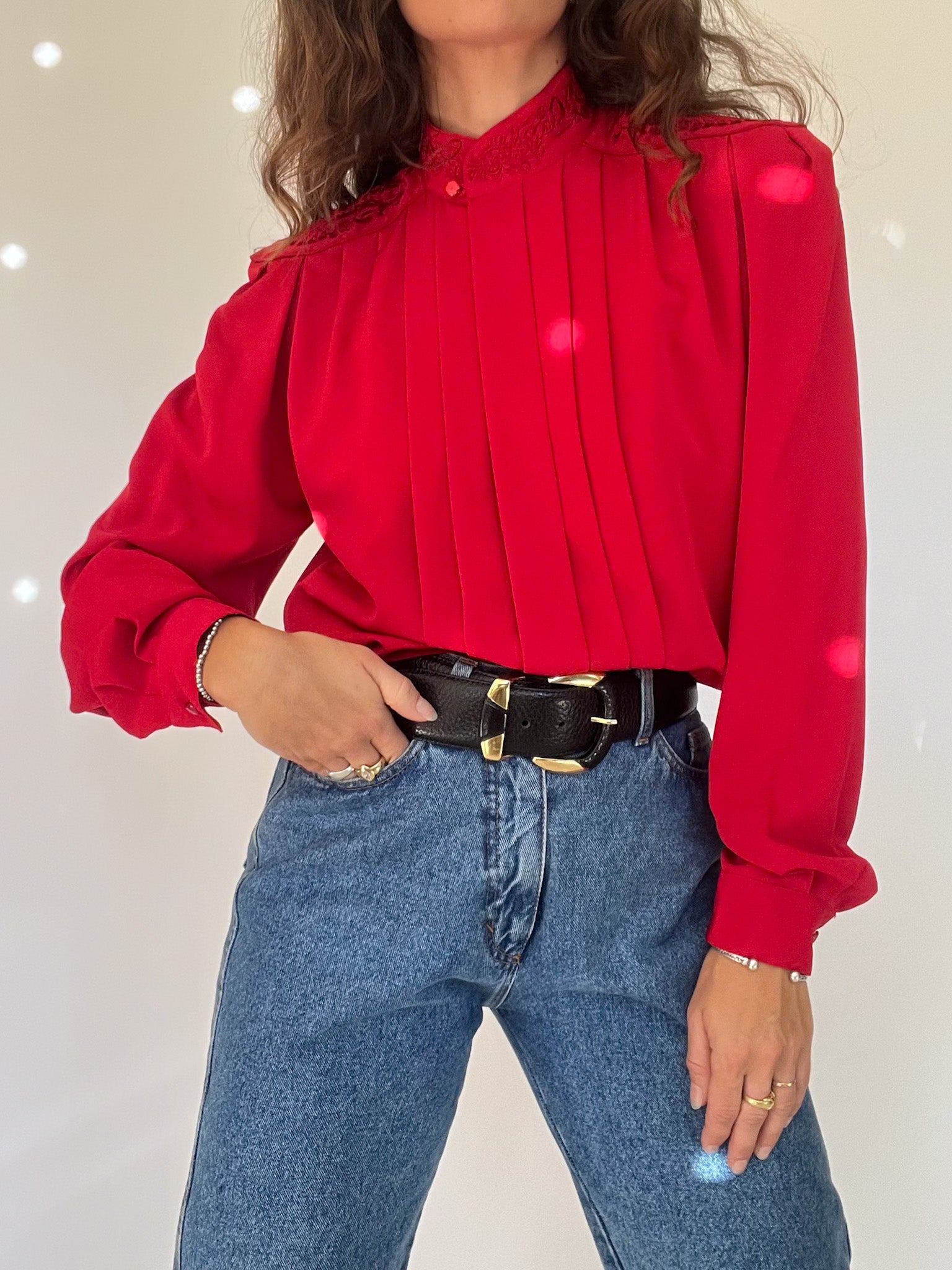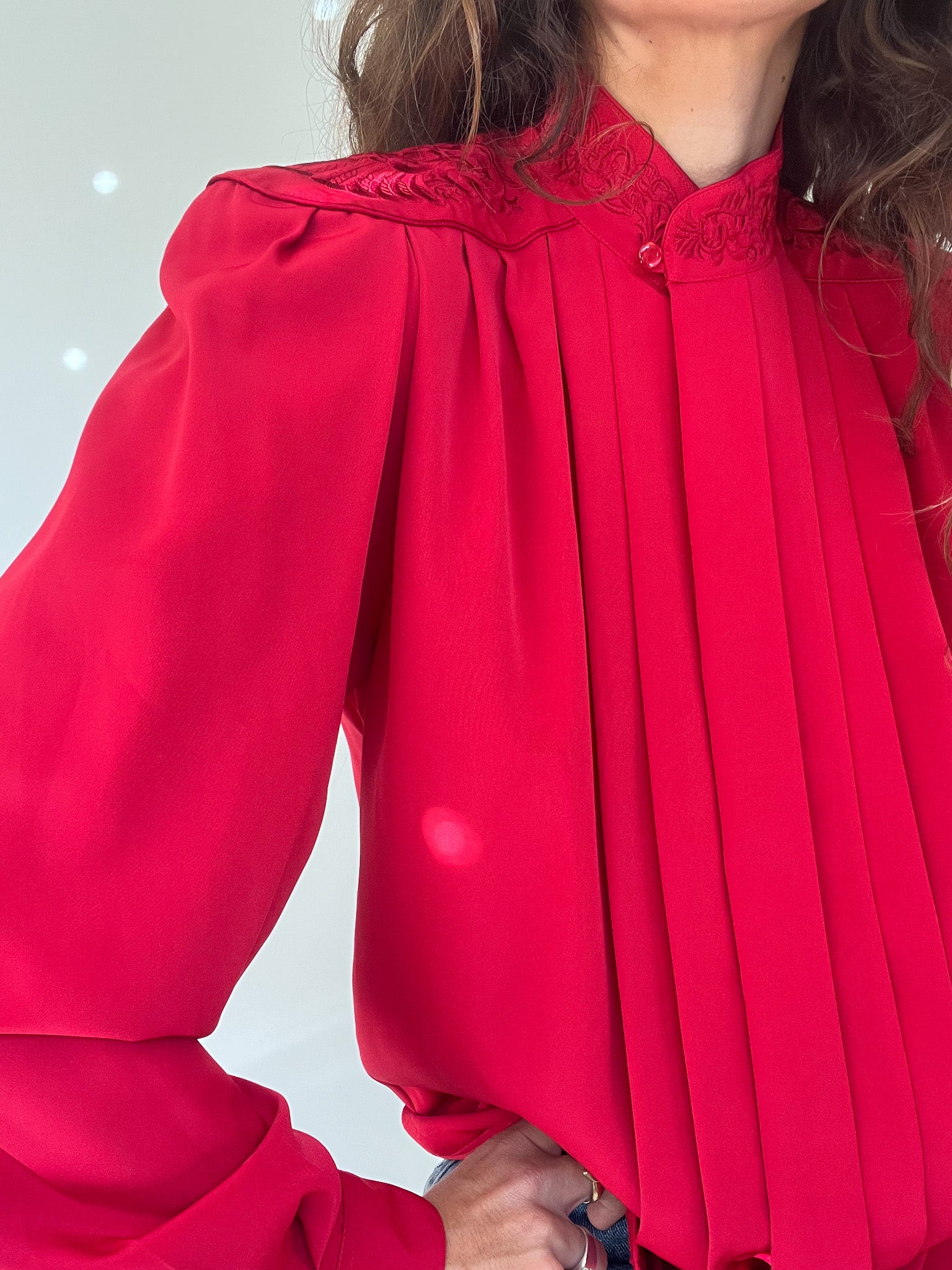 Vintage 90’s Red Silk Blouse with Gold Button Detail