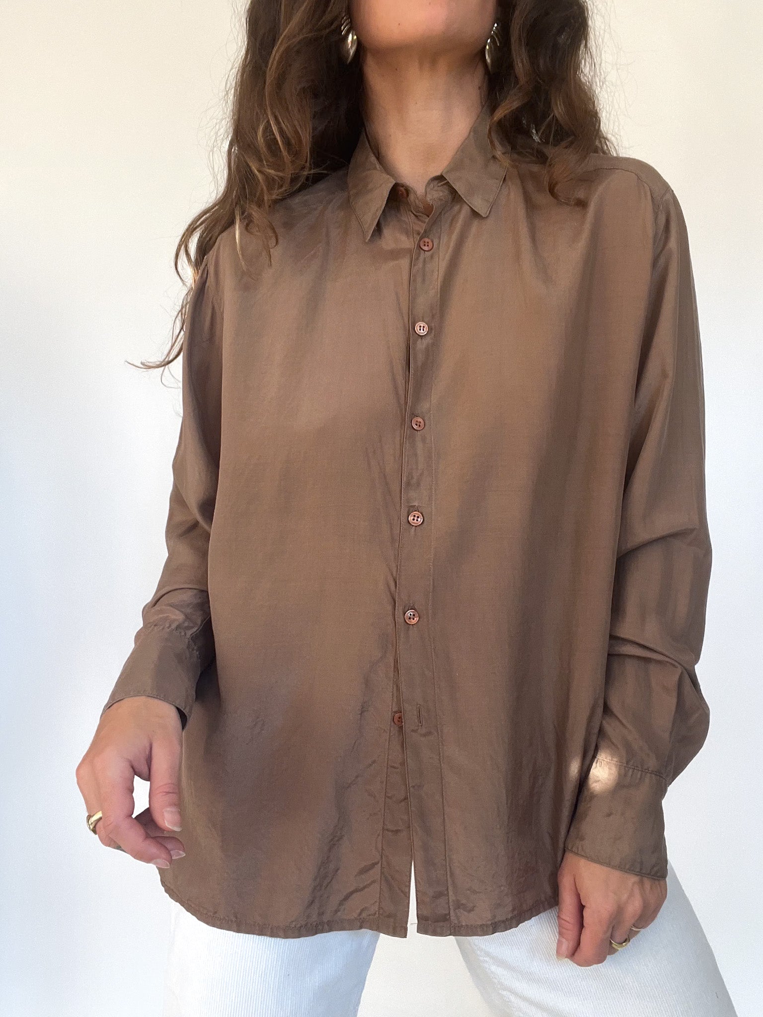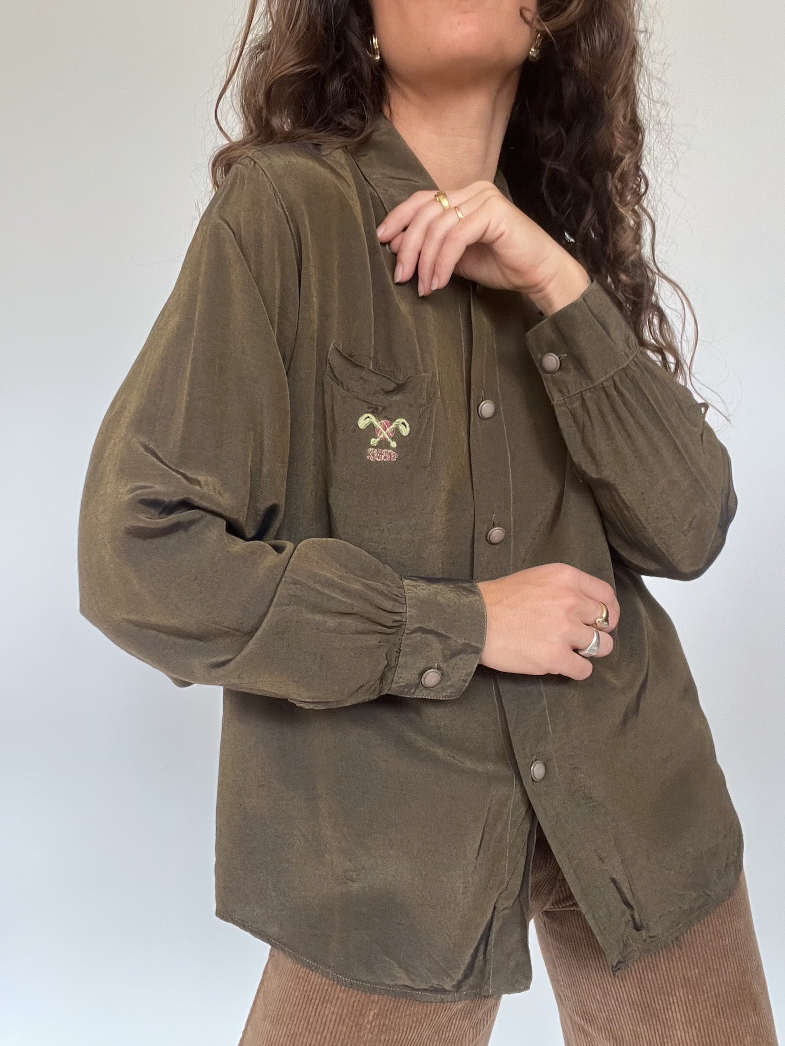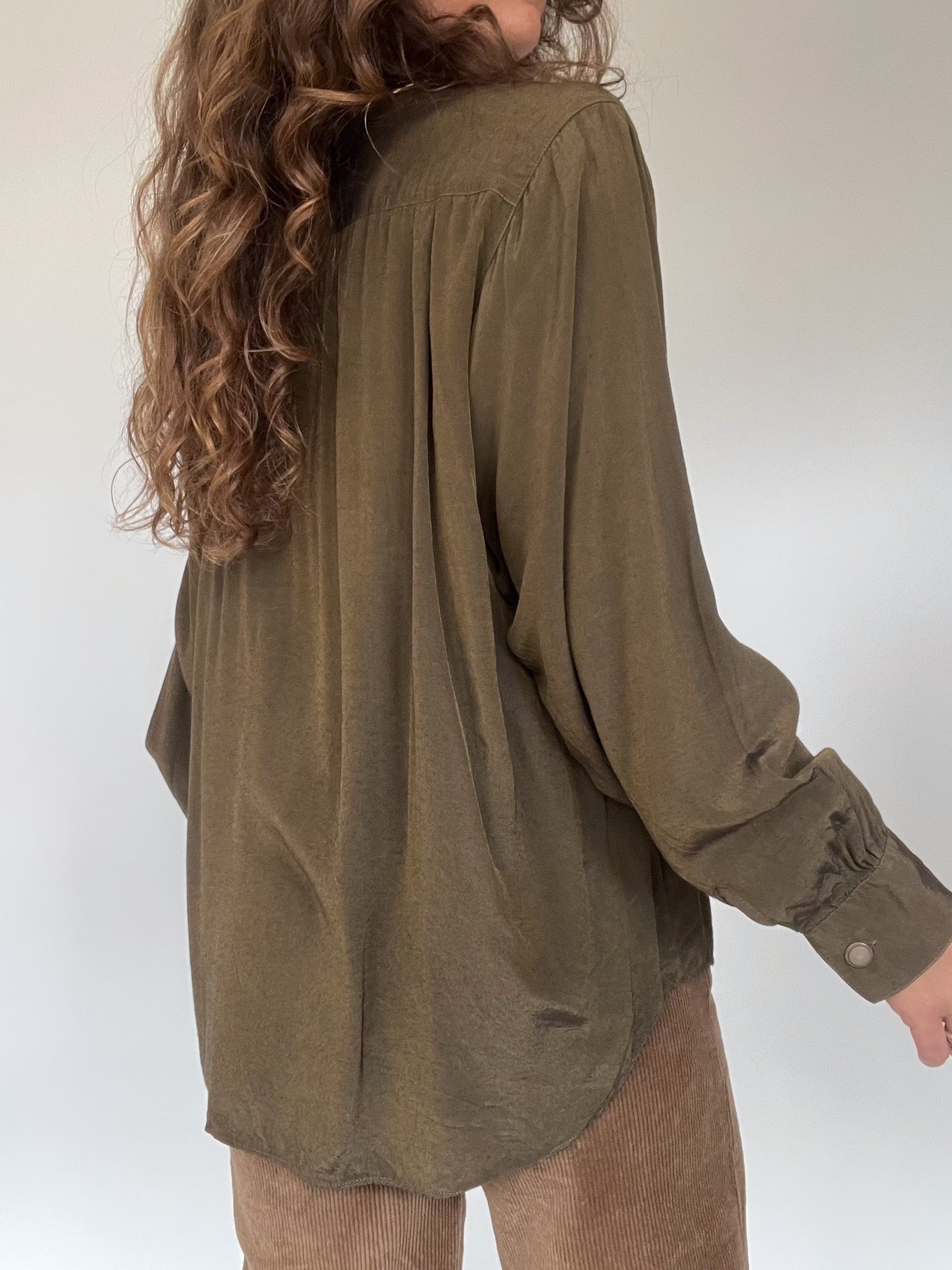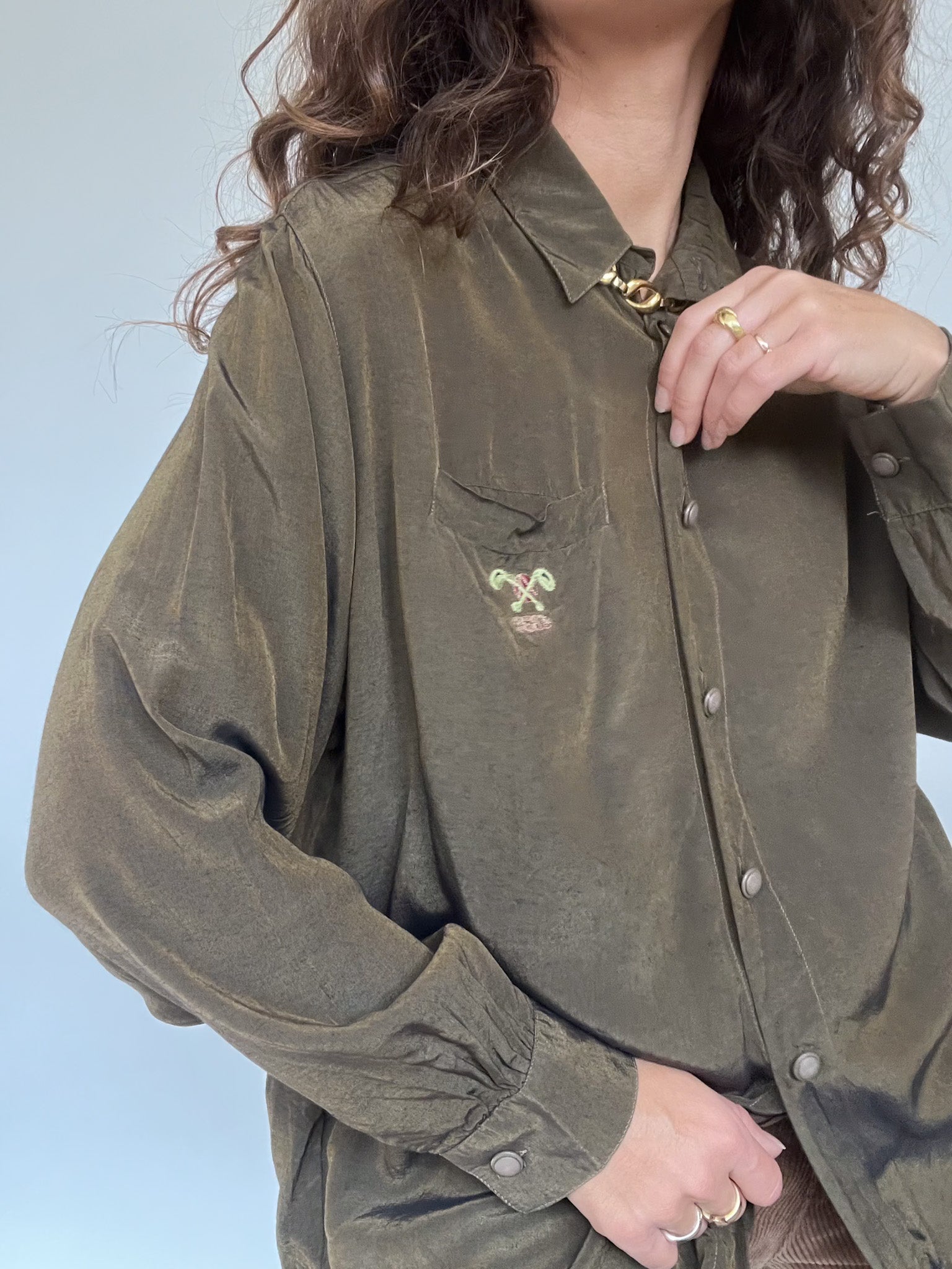 Vintage 80’s Khaki Satin Button-Up Shirt